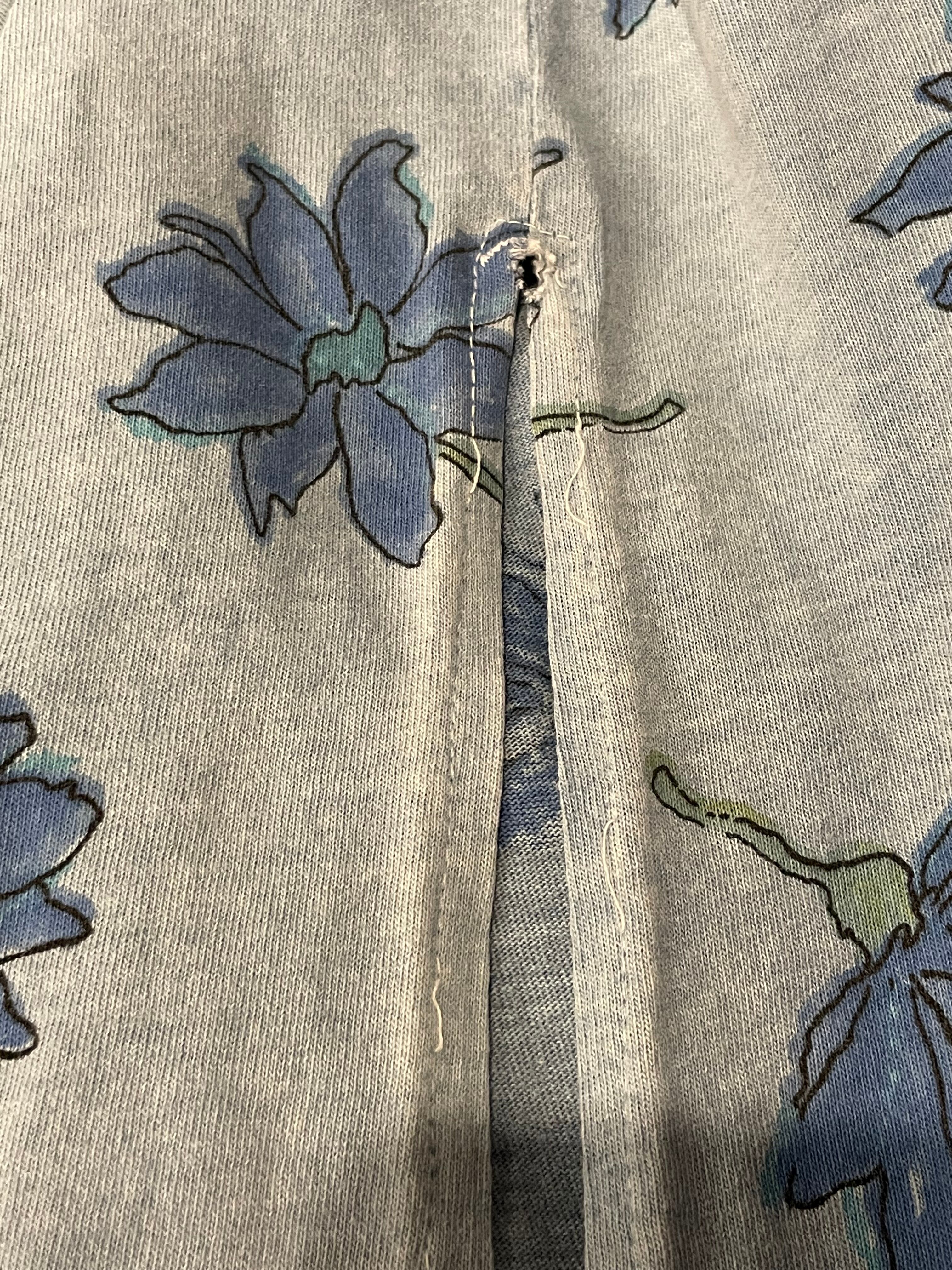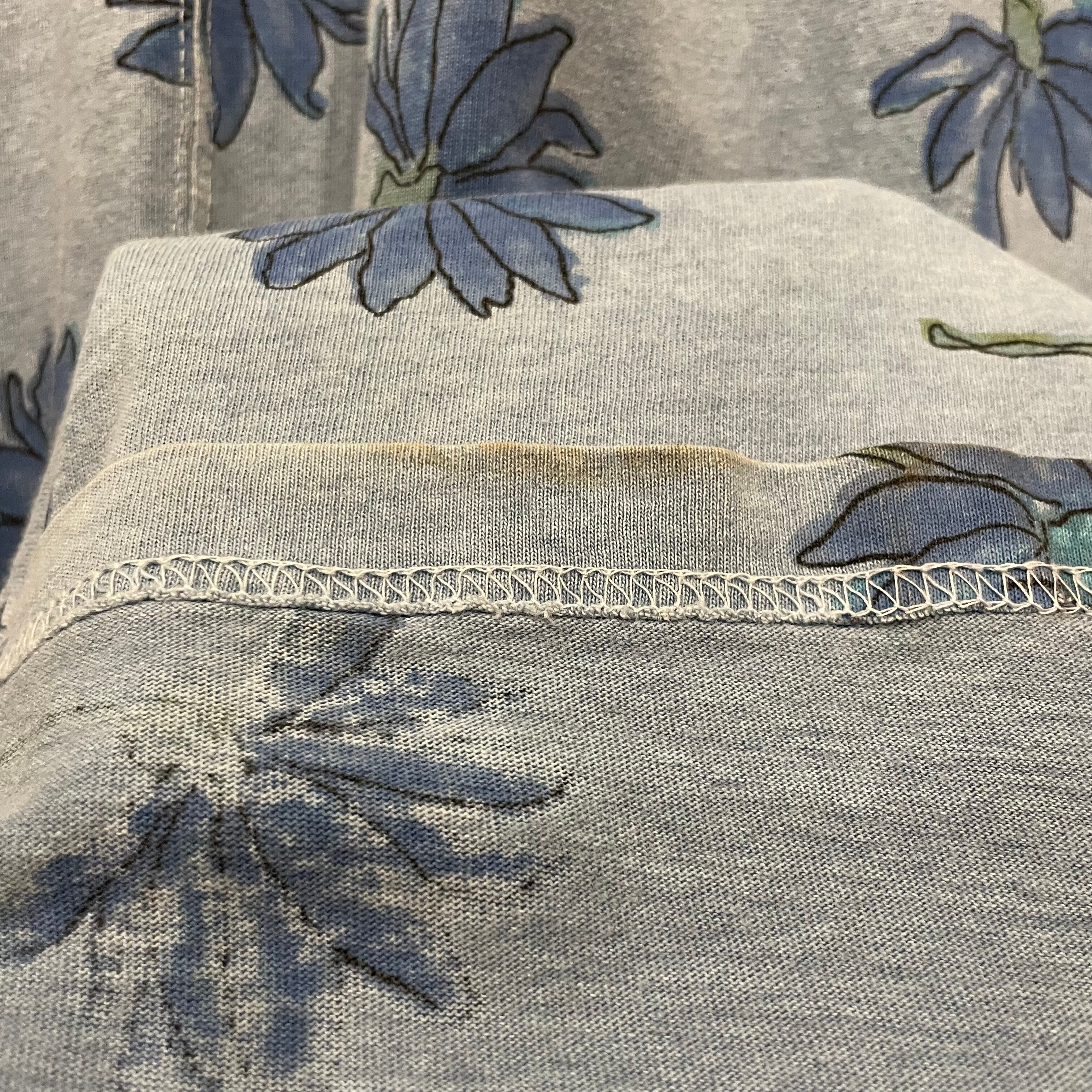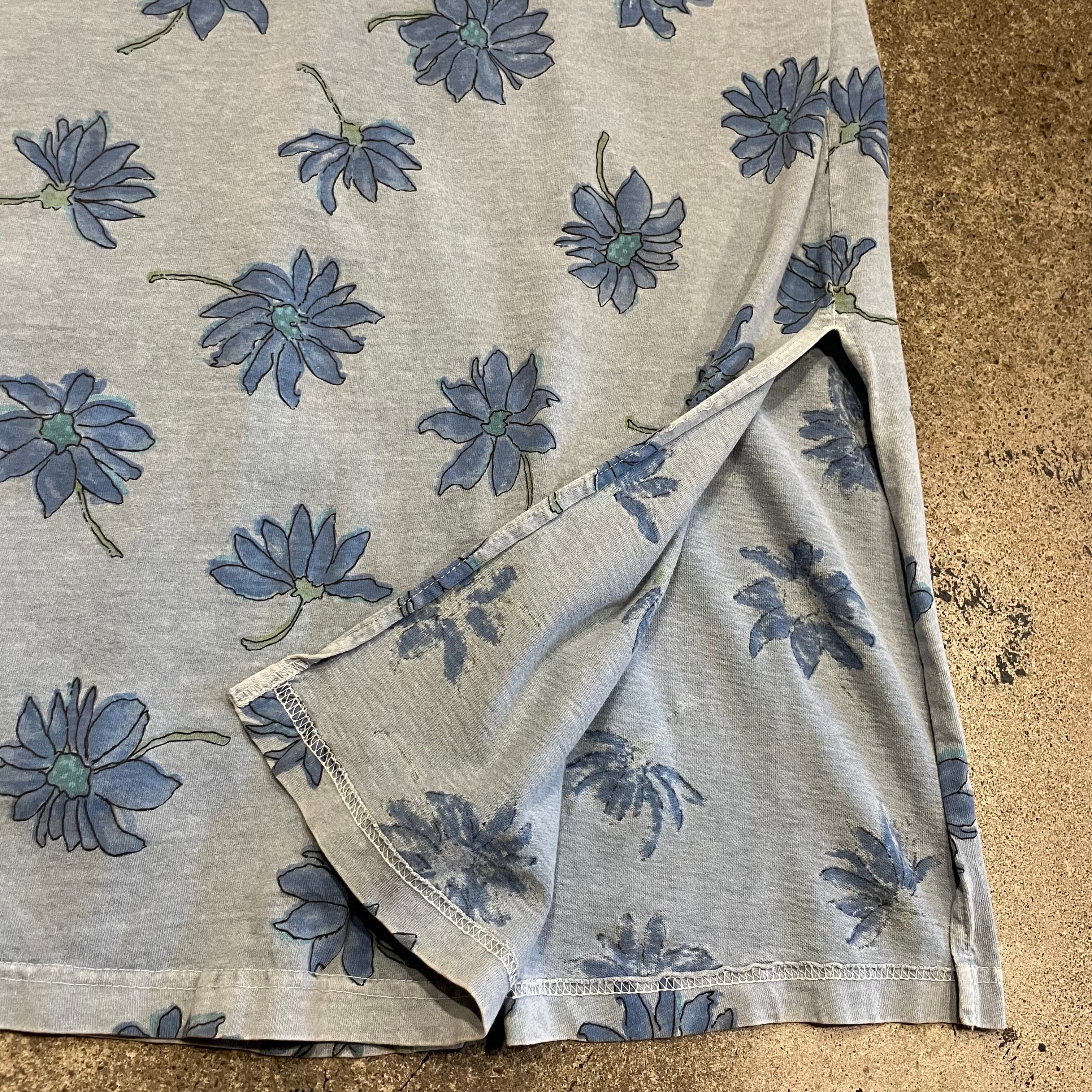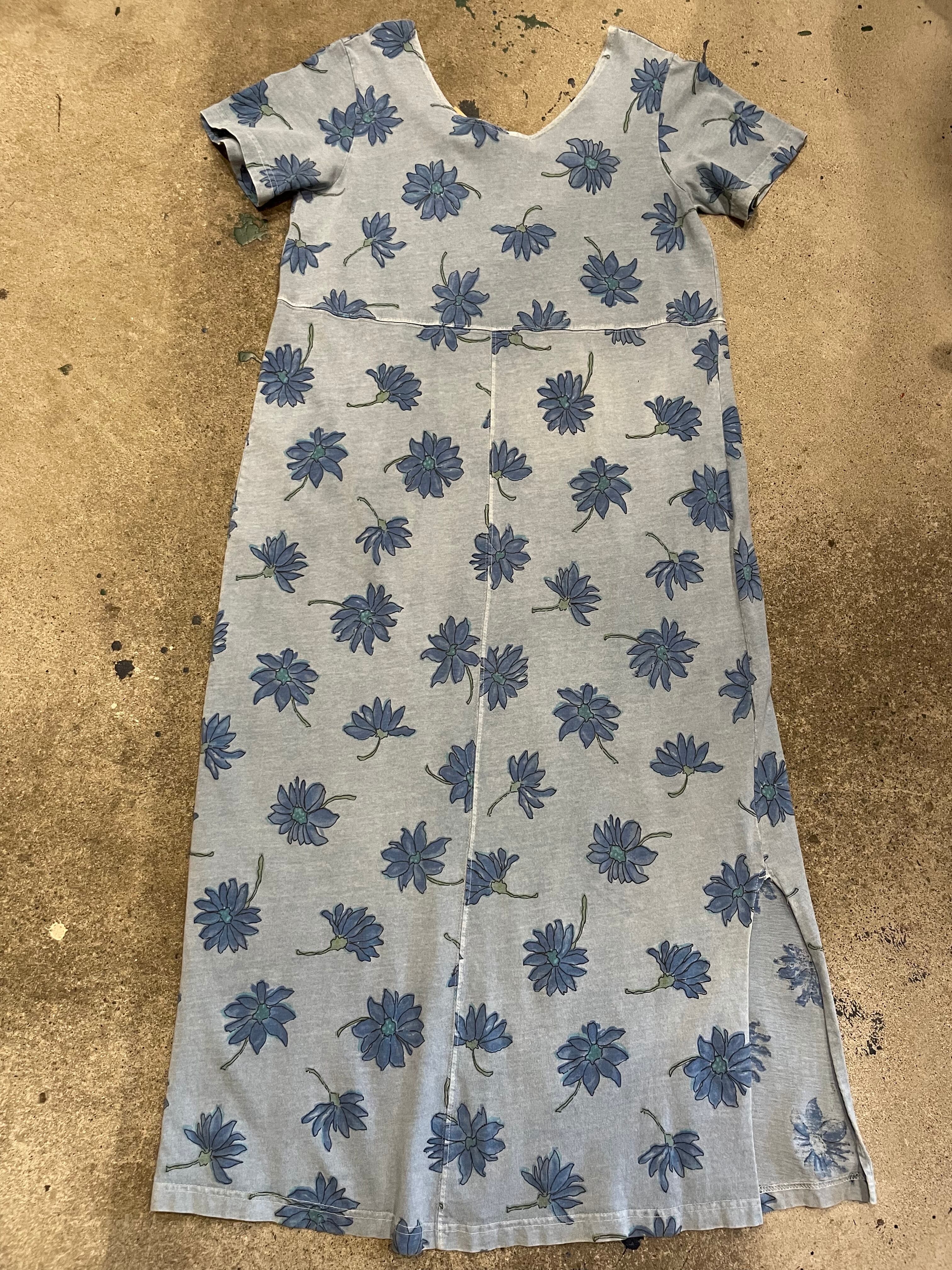 青地にに青い花の模様がかわいいワンピースです。襟ぐりが広めに開いていて、身幅もゆったり、コットンの優しい肌触りと、スリットもポケットもあり、どこまでも楽ちんでかわいい一枚です。