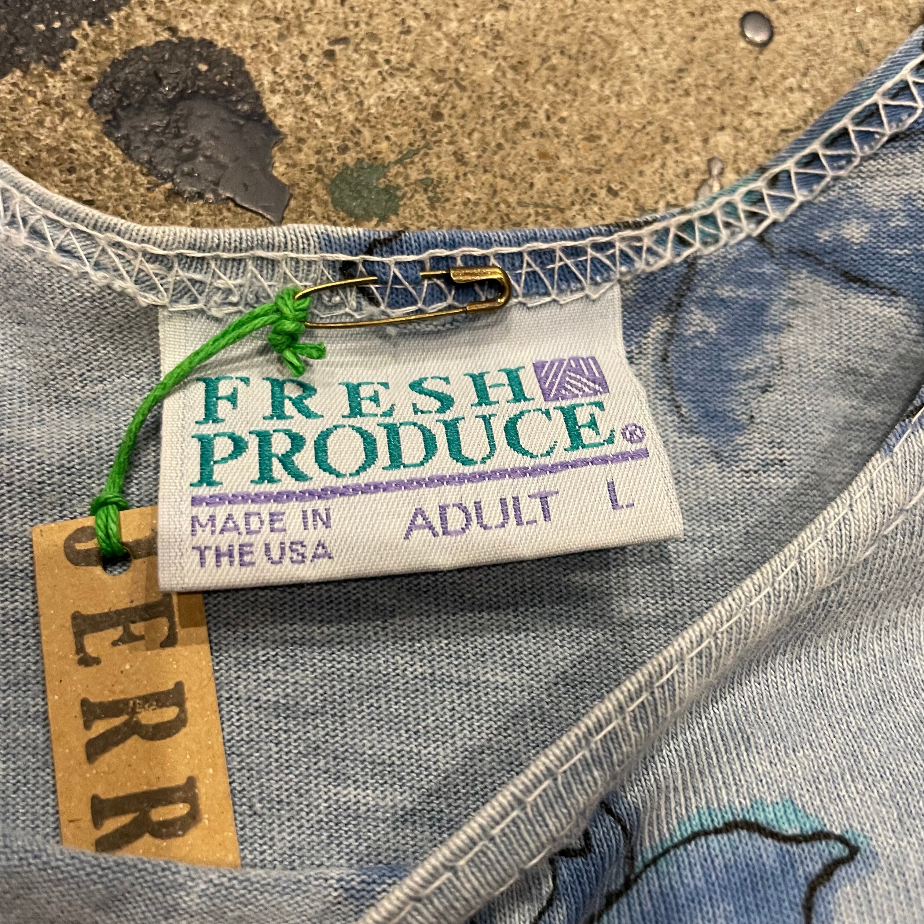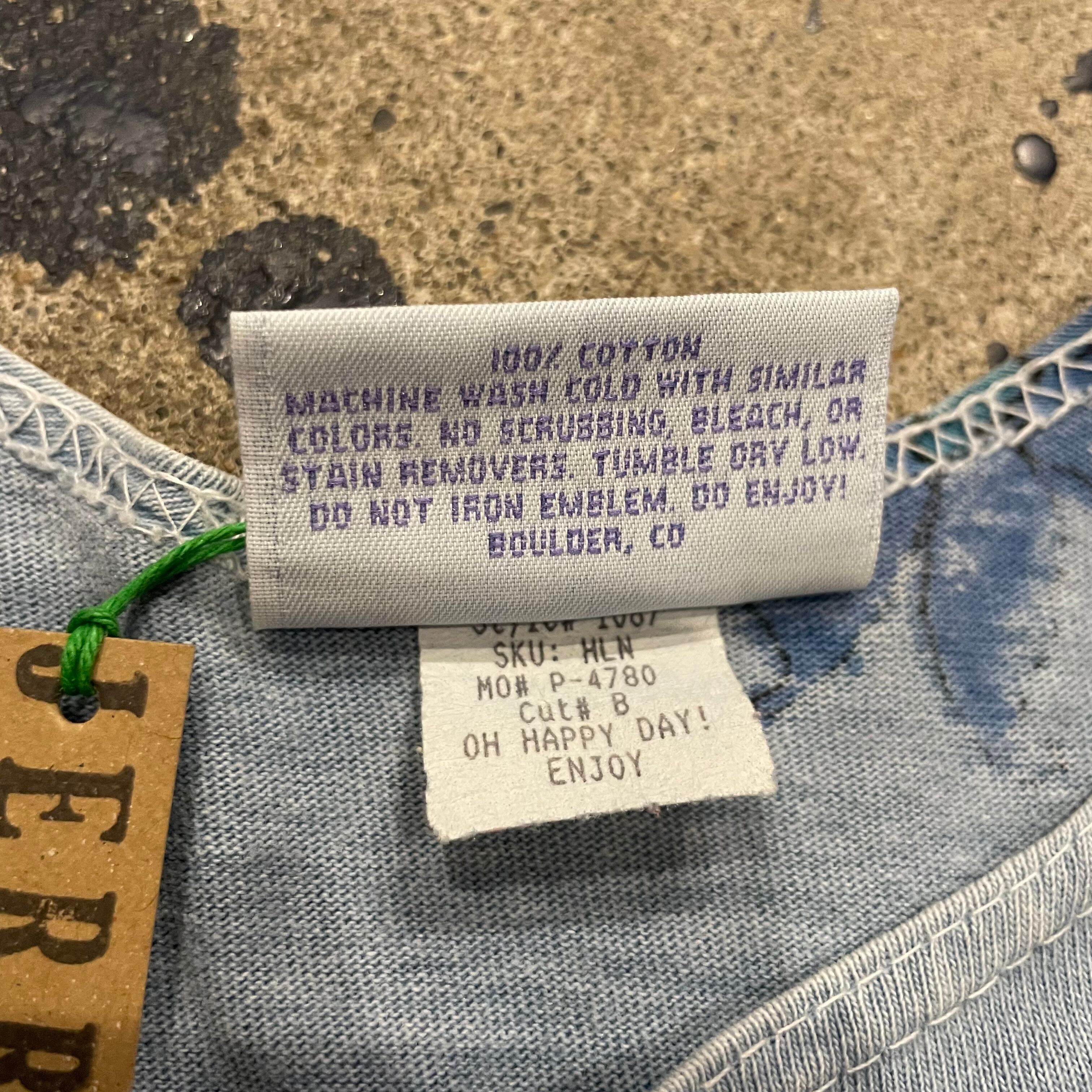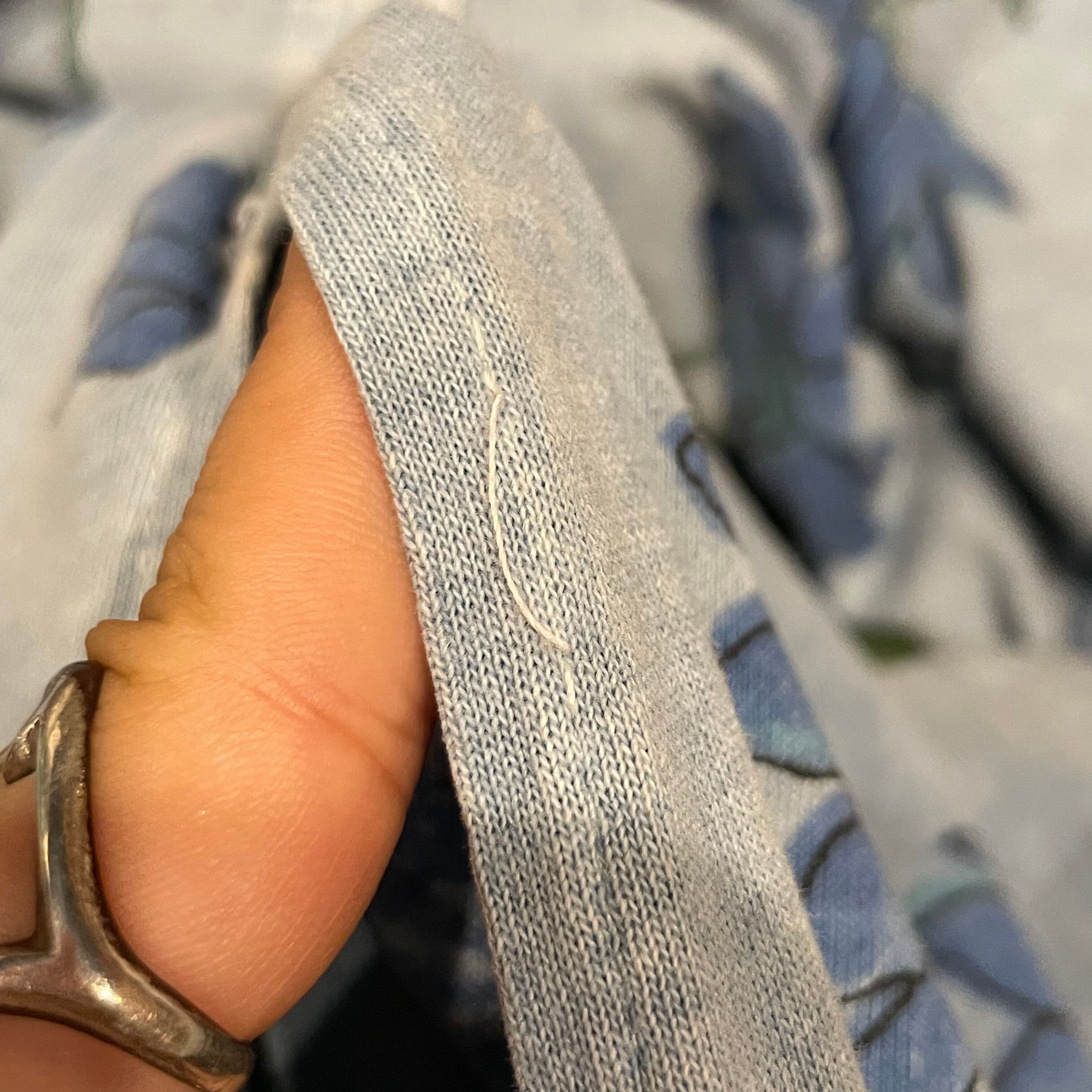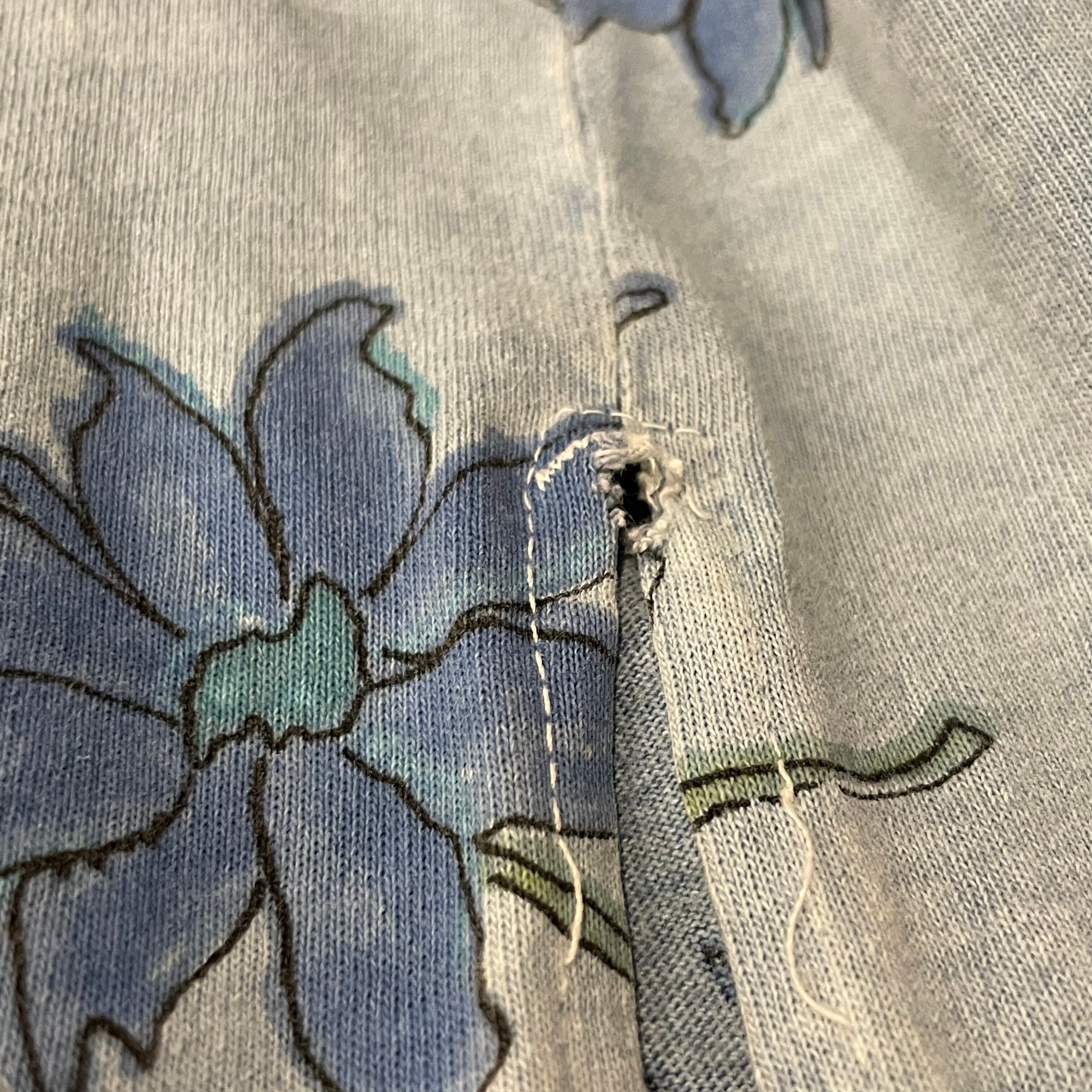青地にに青い花の模様がかわいいワンピースです。襟ぐりが広めに開いていて、身幅もゆったり、コットンの優しい肌触りと、スリットもポケットもあり、どこまでも楽ちんでかわいい一枚です。