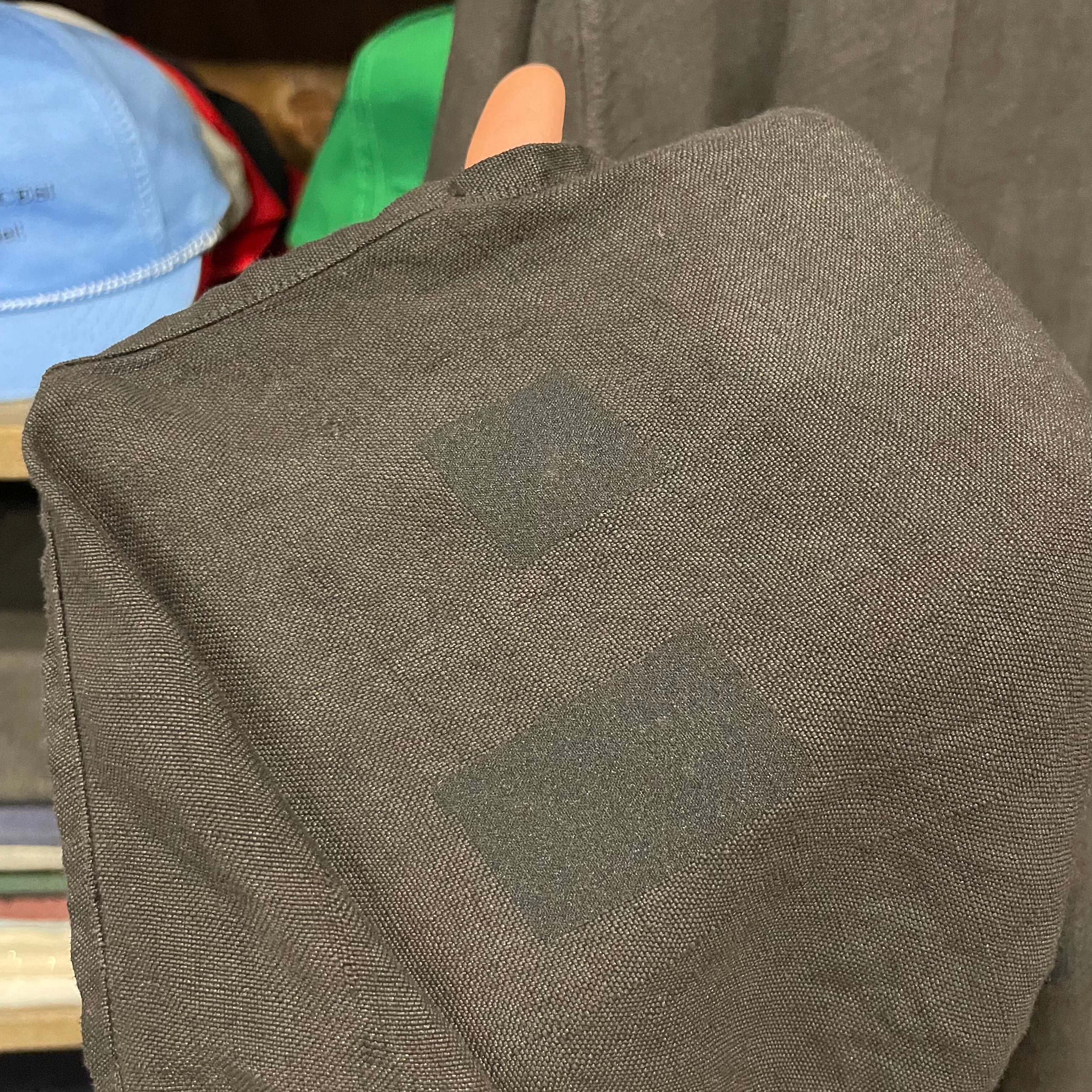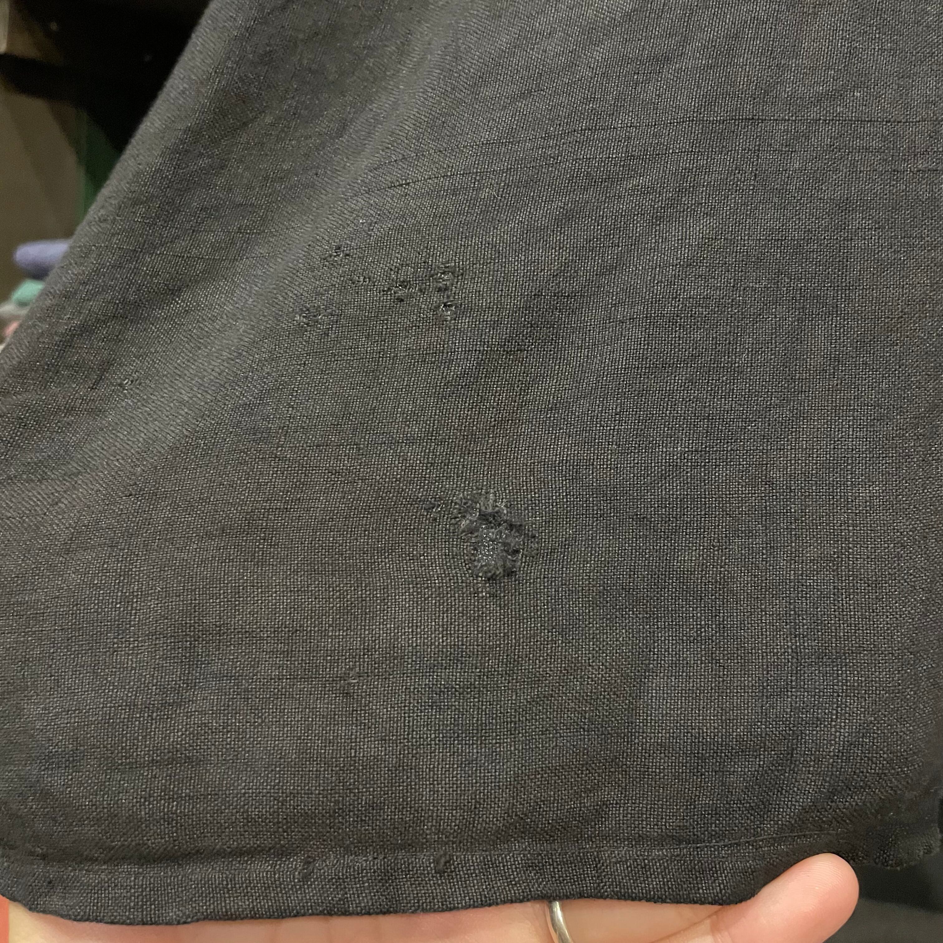 襟ぐりのダメージ、後ろ裾にキズや接着芯を貼ったリペア多数ございます。