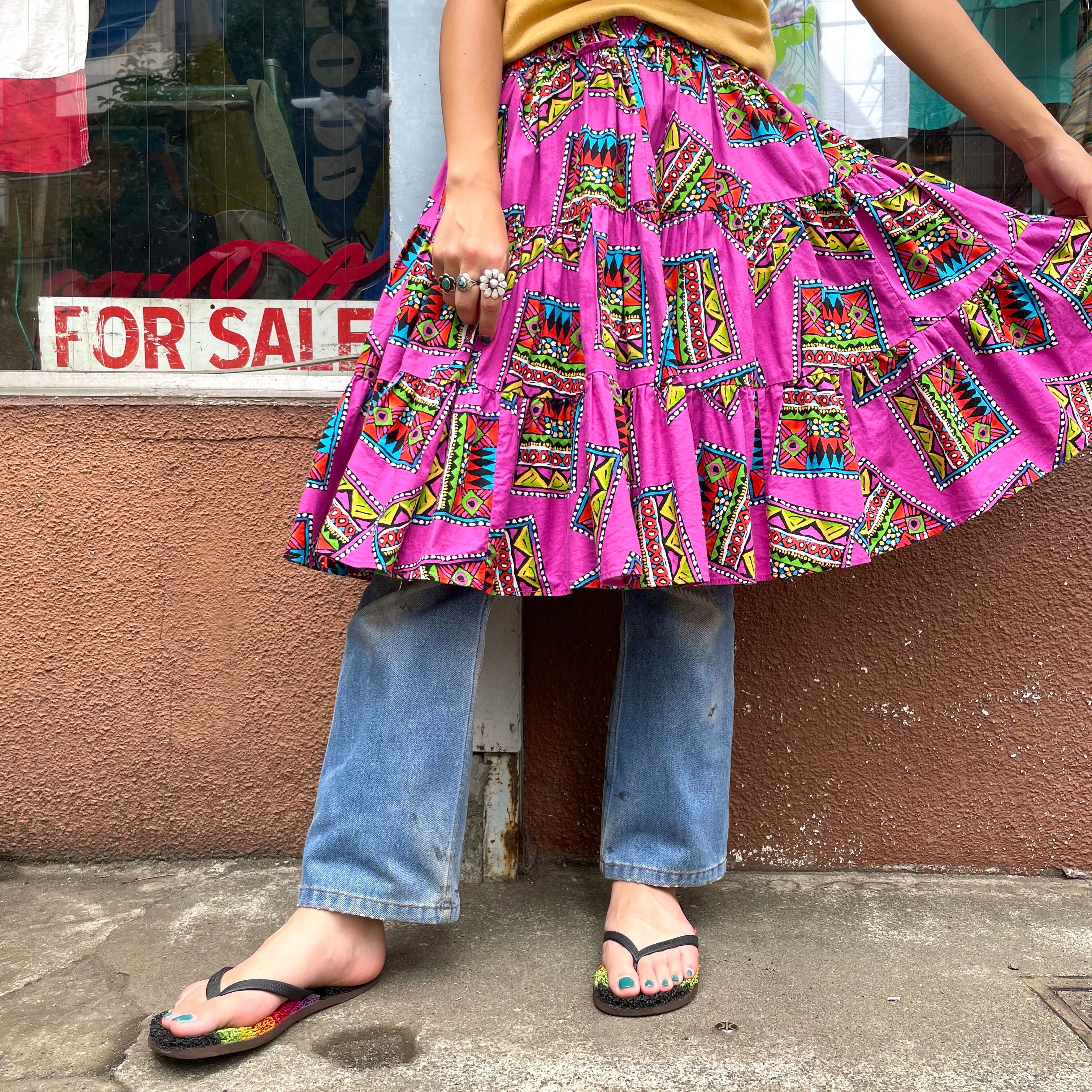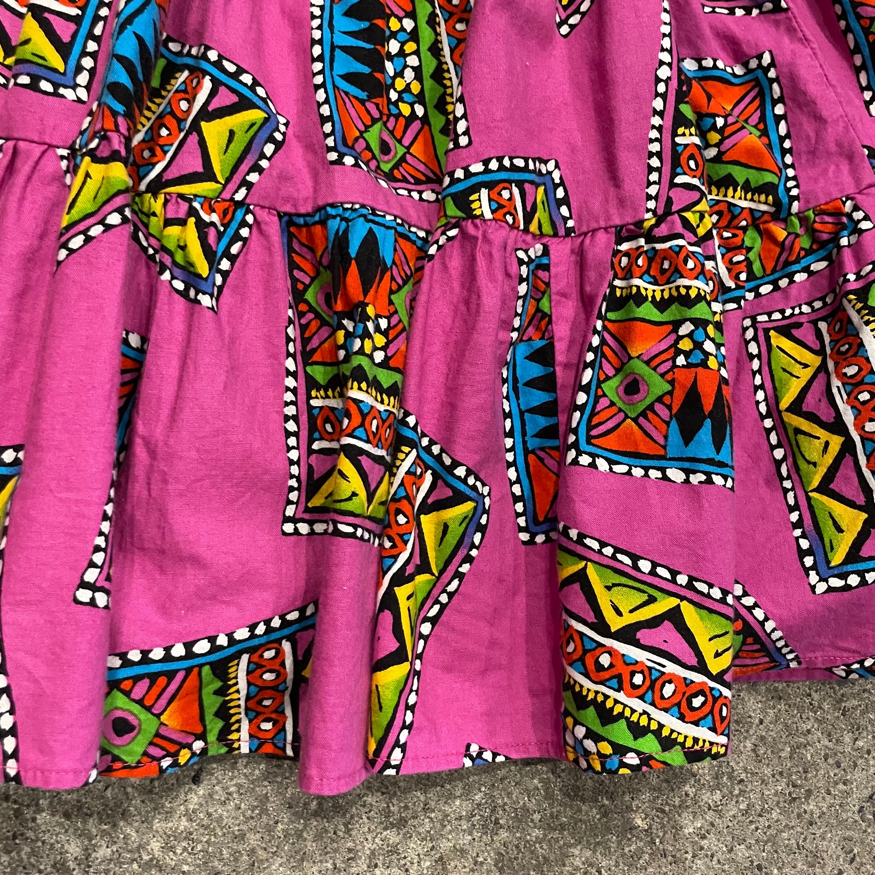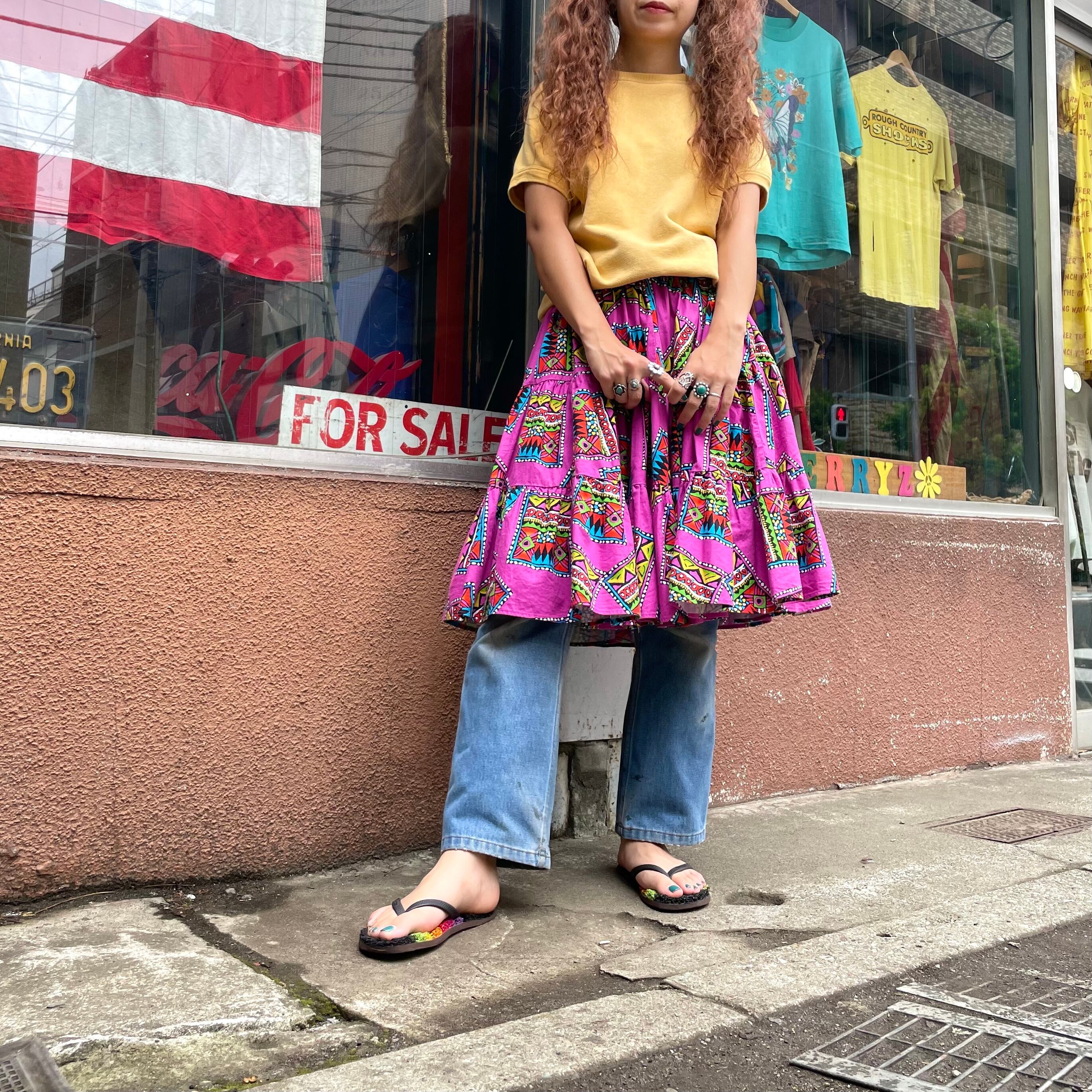 とてもかわいい色味のピンク地に、カラフルな不思議な柄が映えているスカートです。