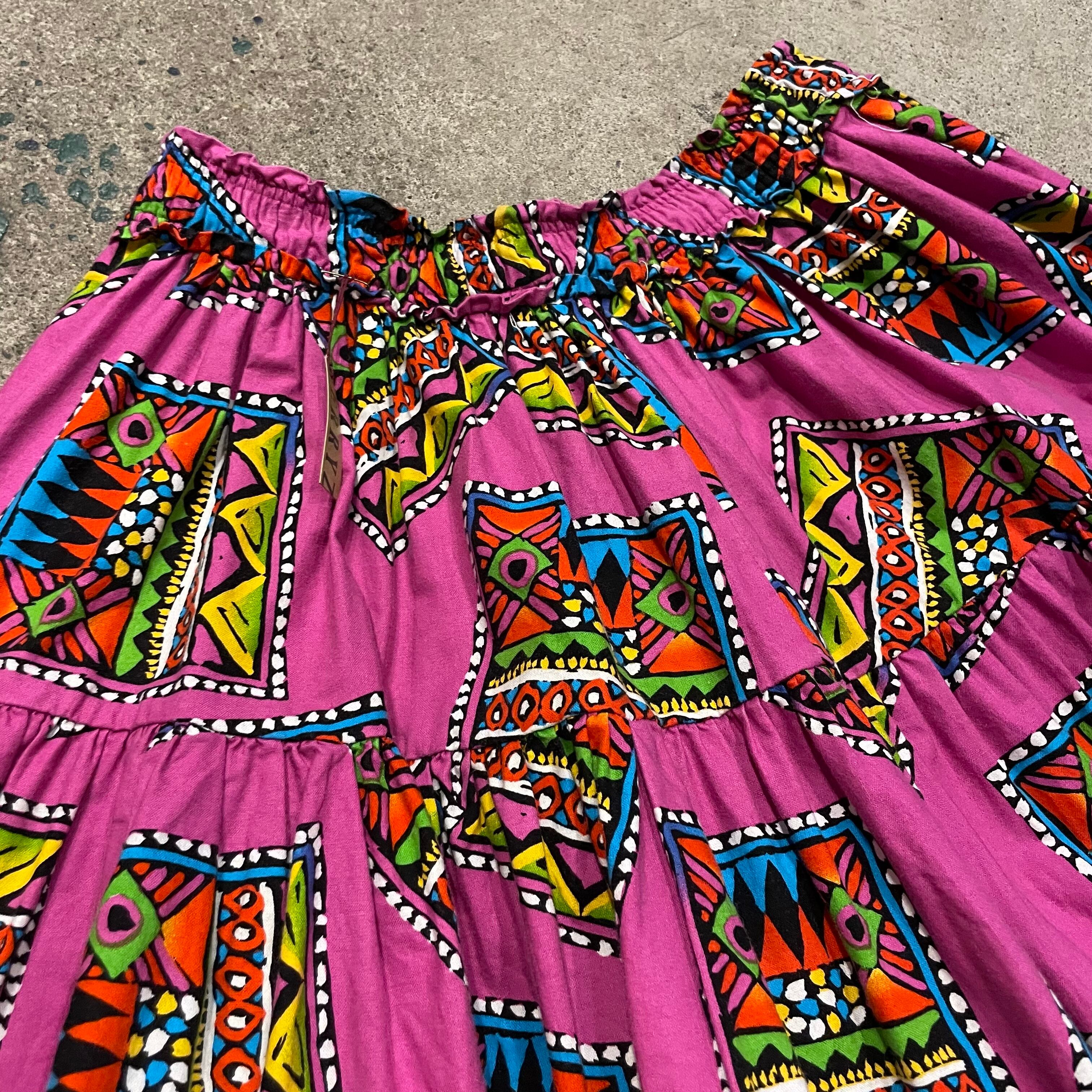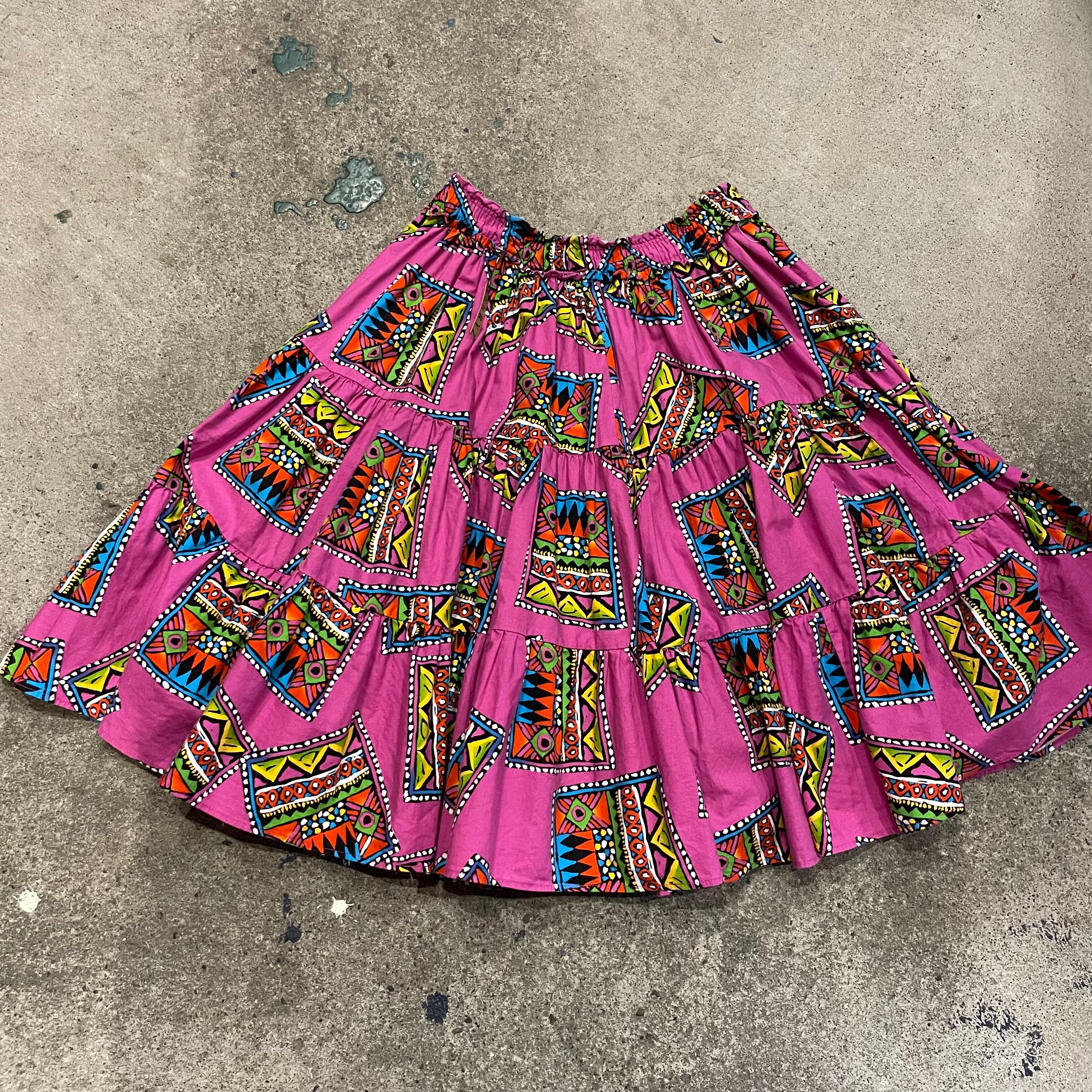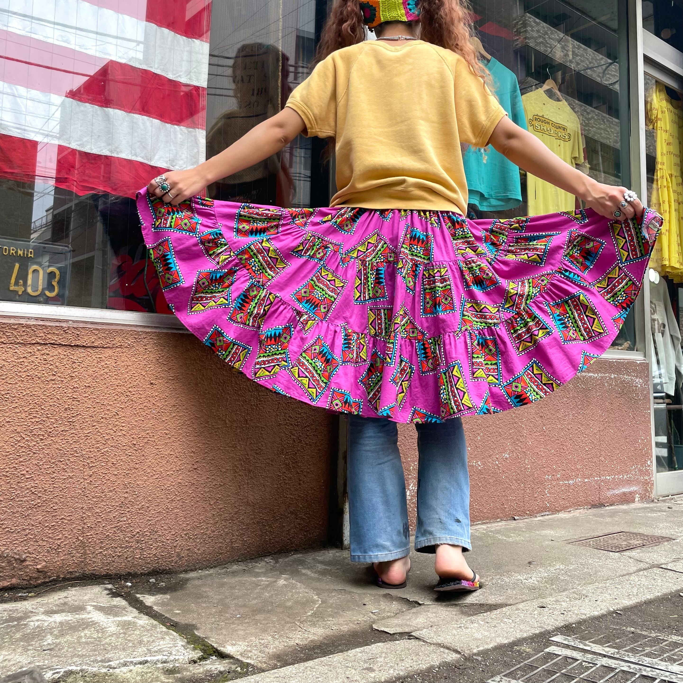 とてもかわいい色味のピンク地に、カラフルな不思議な柄が映えているスカートです。