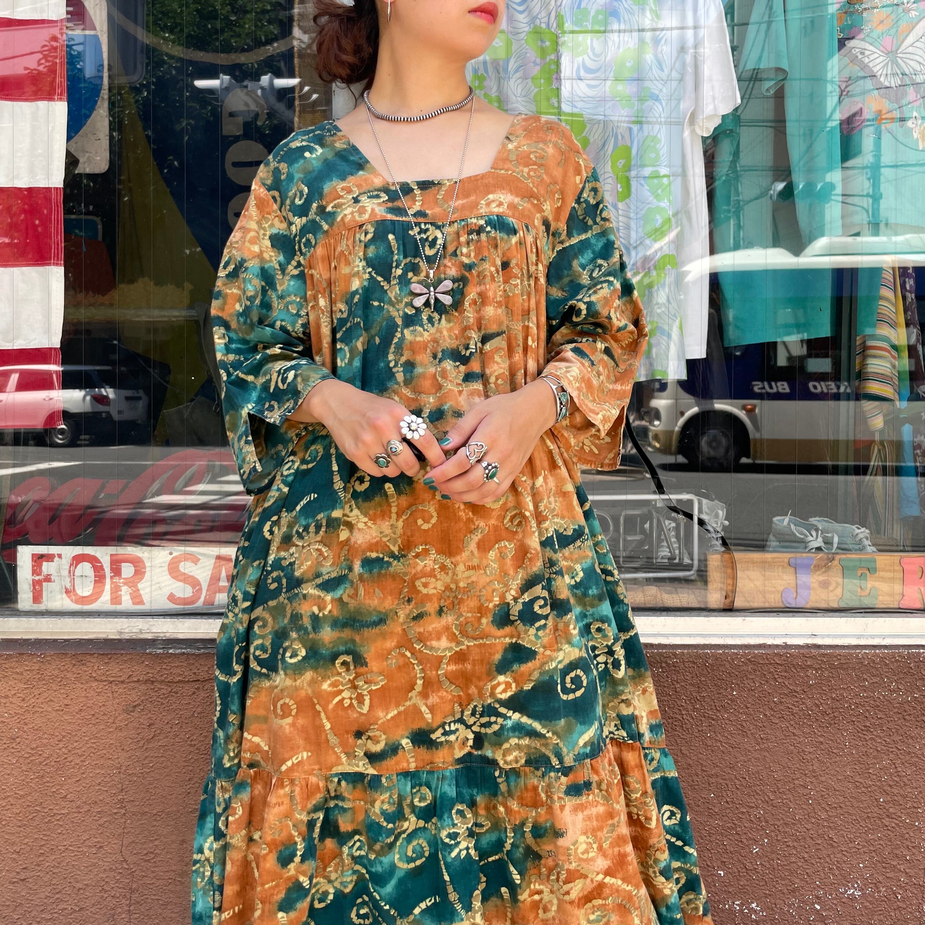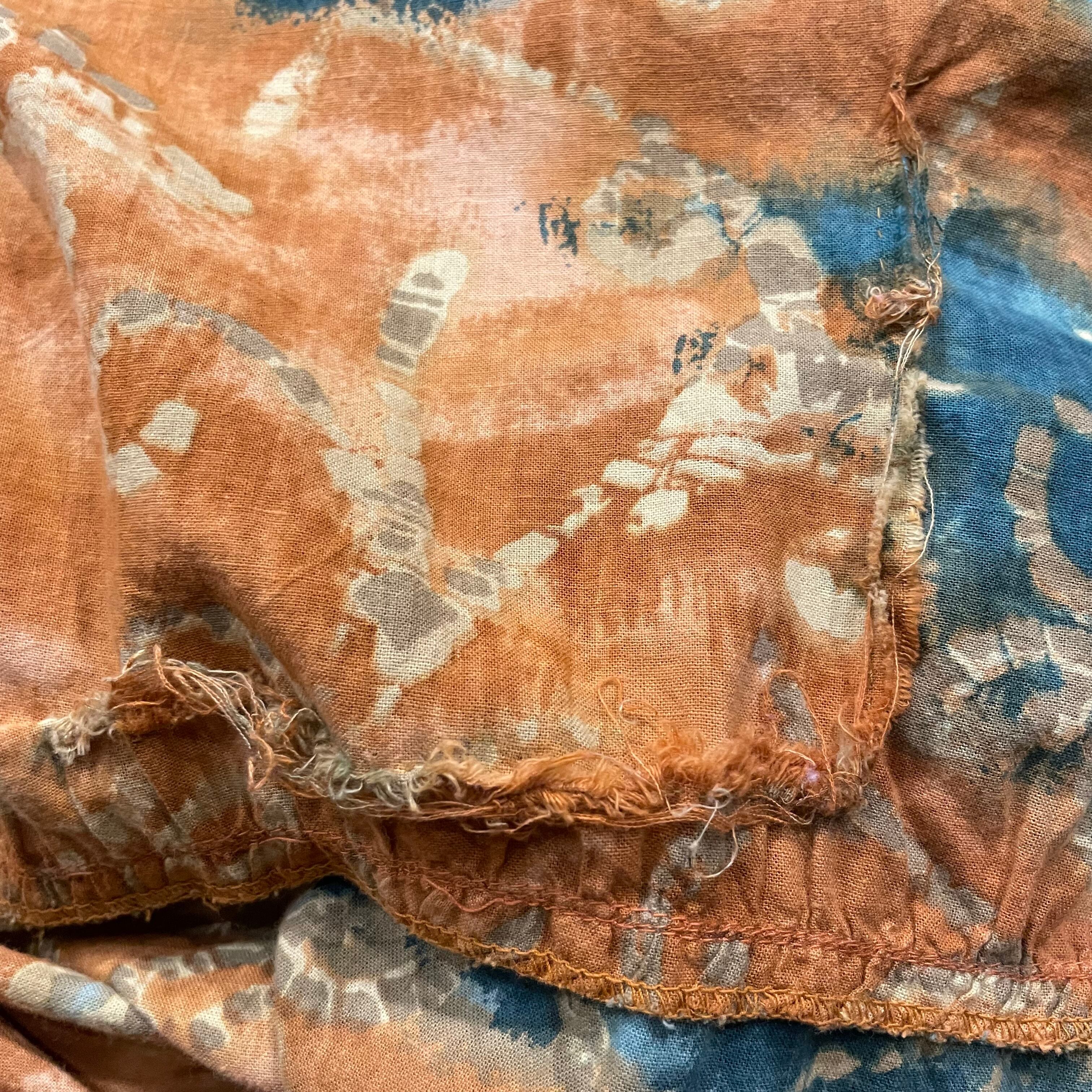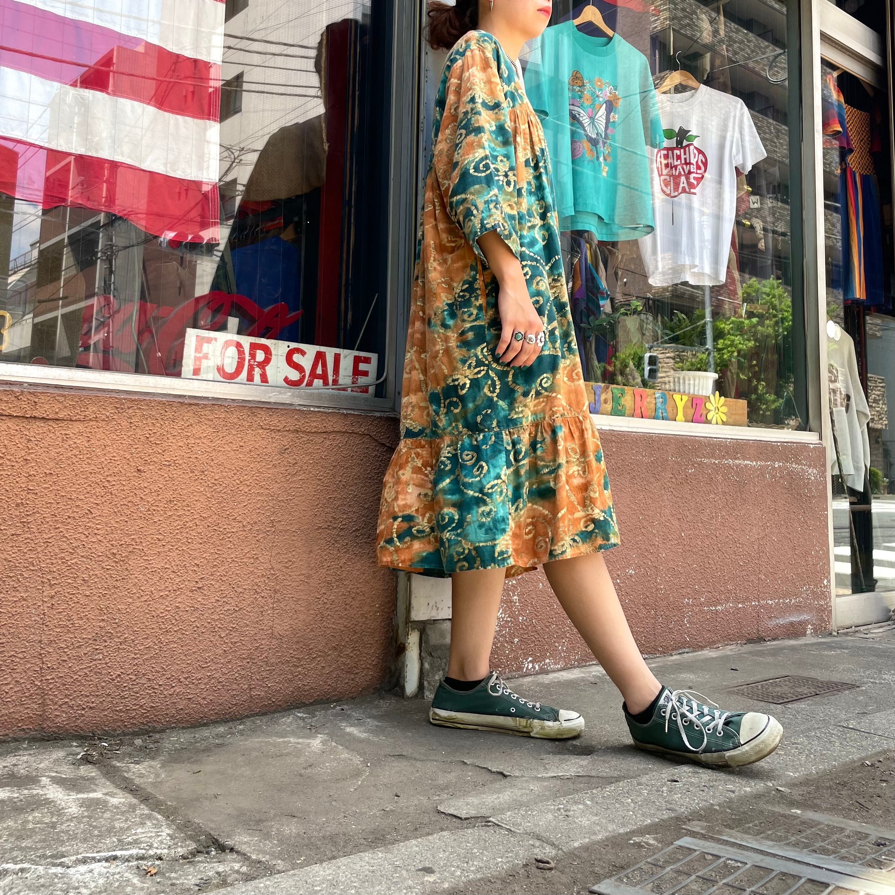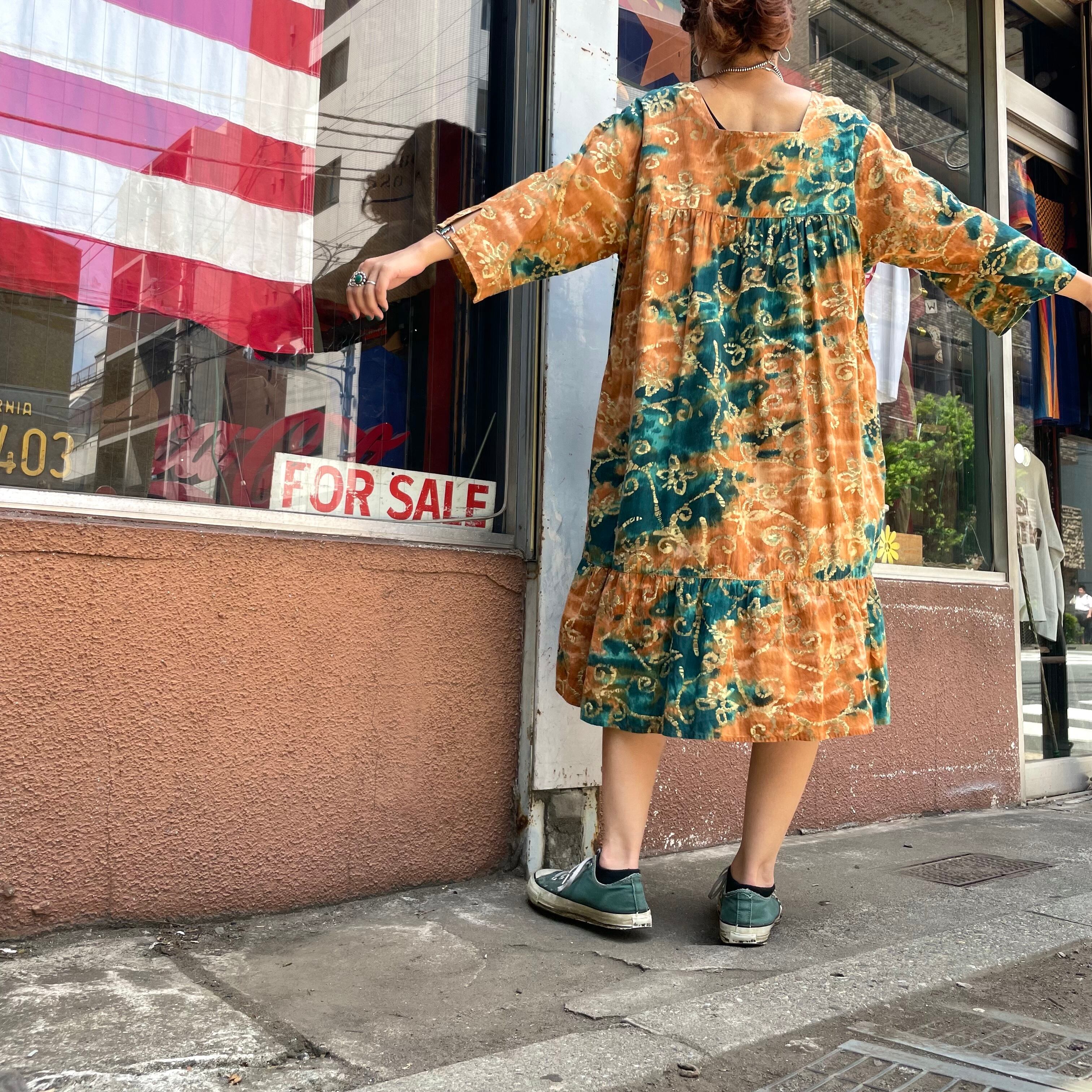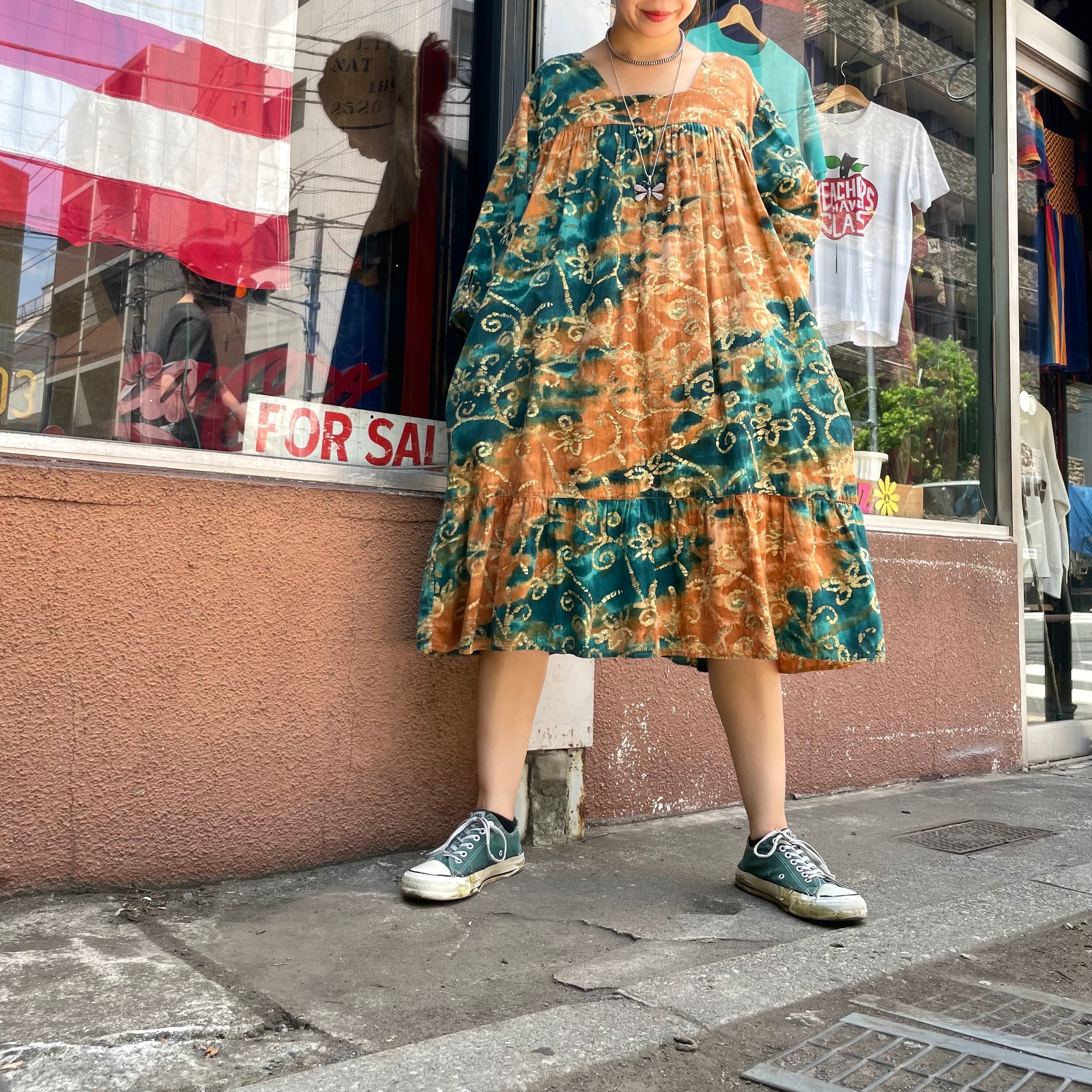 タイダイのようなマダラな模様に植物や蝶々らしきプリントが良い雰囲気です。