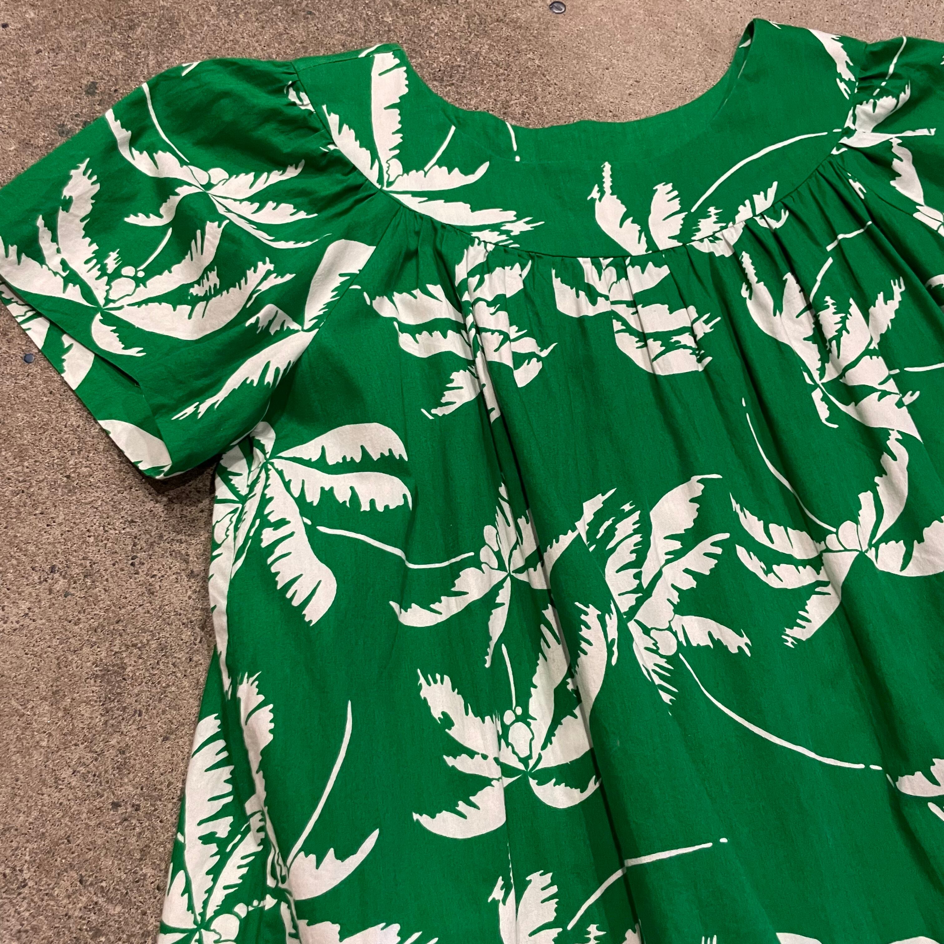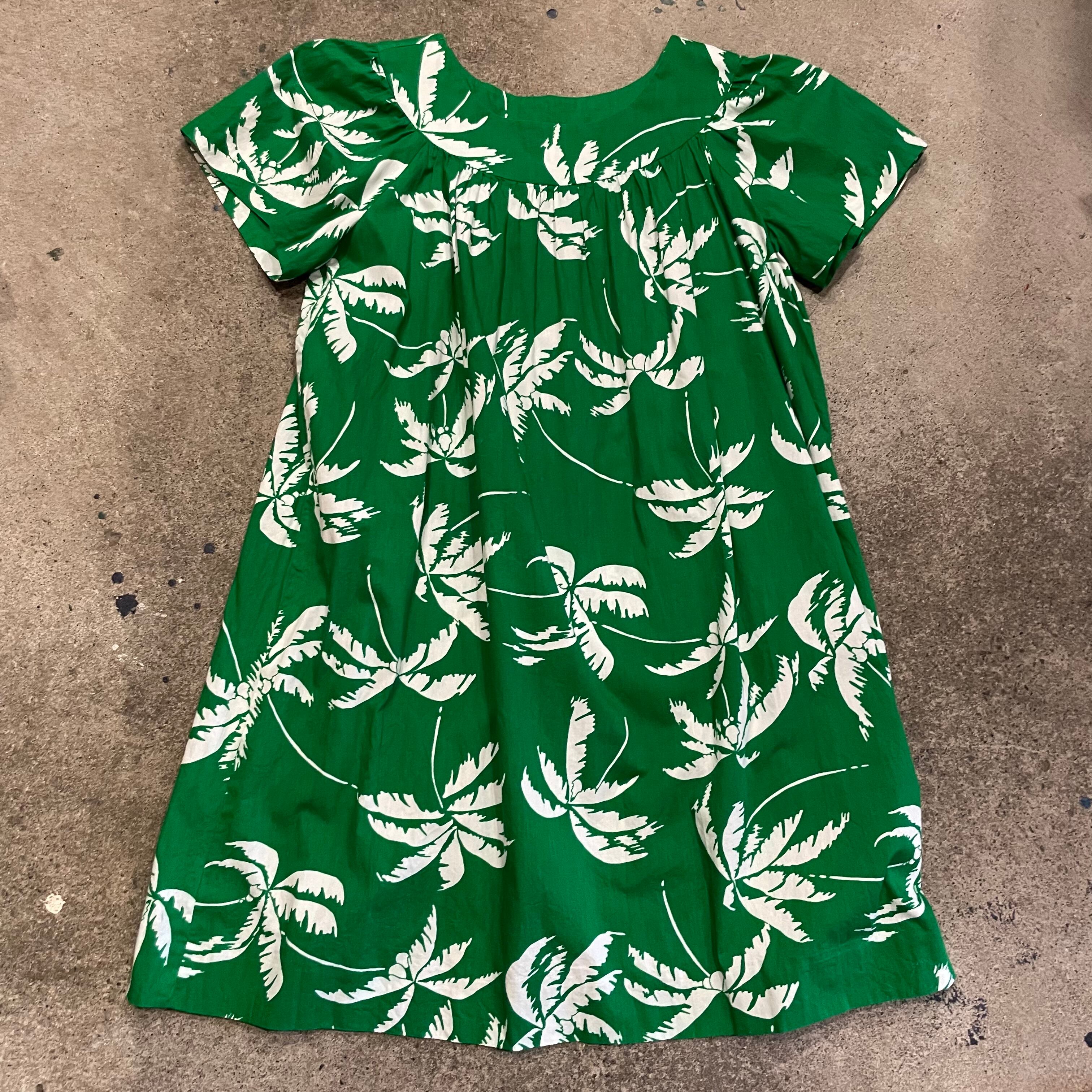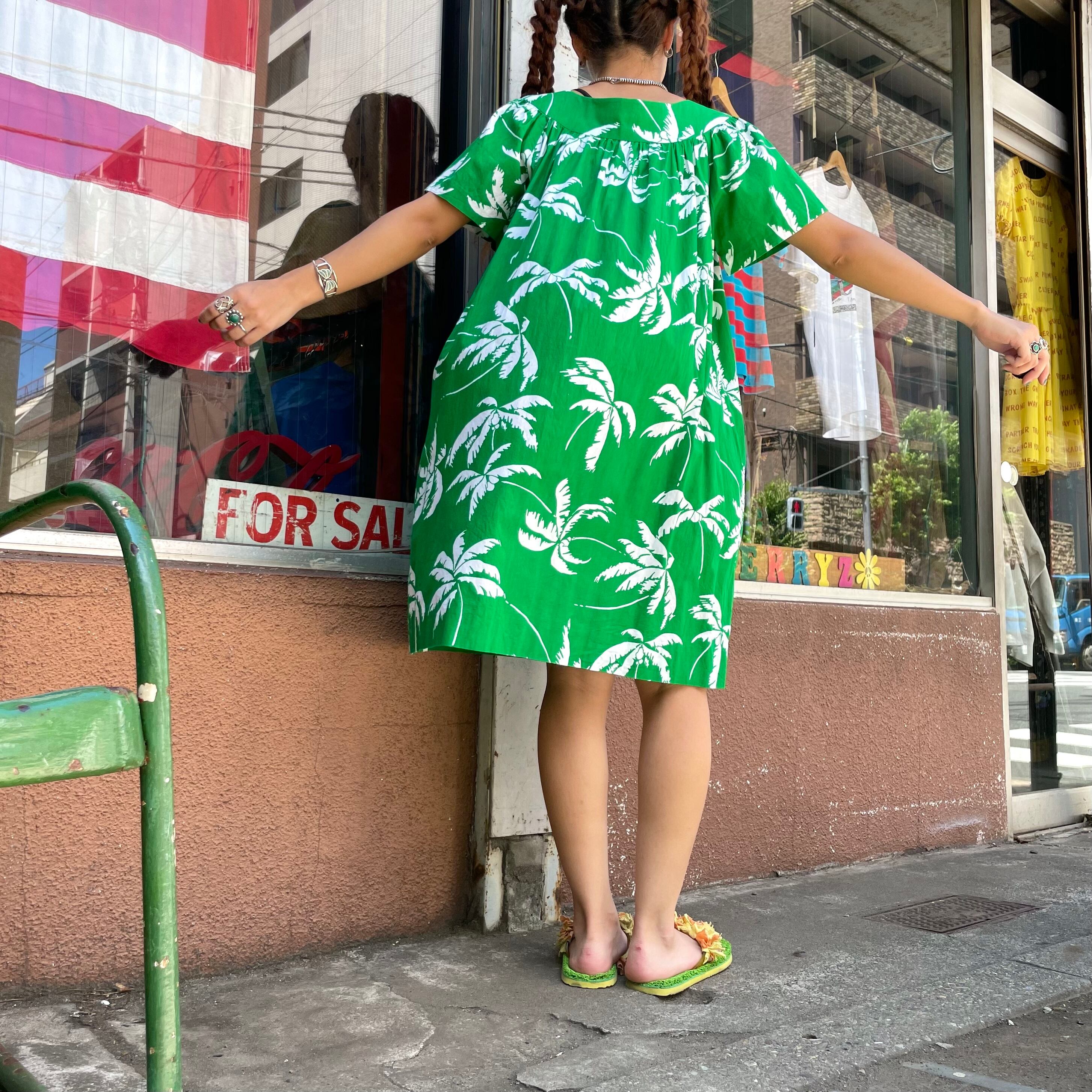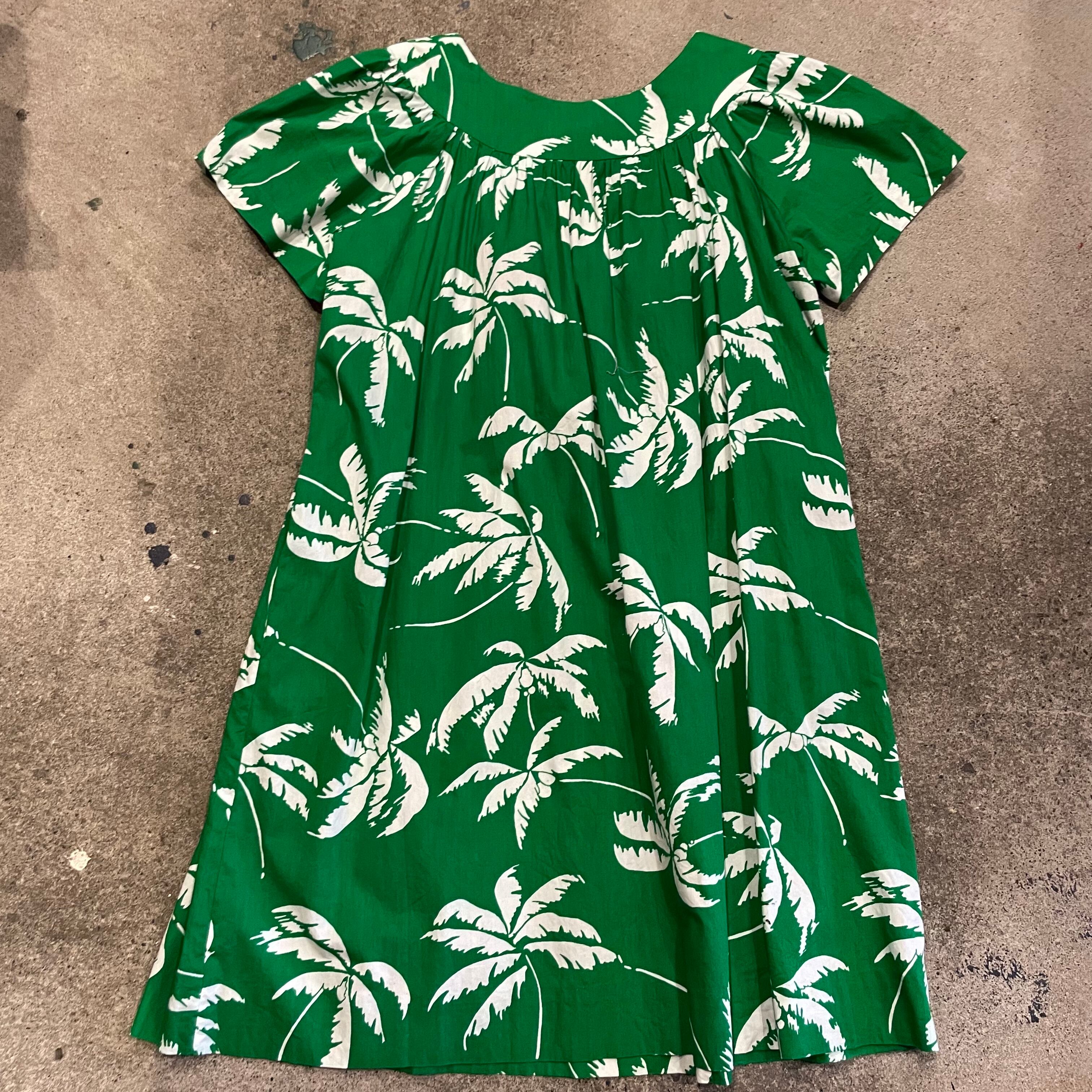 鮮やかな緑地に白いヤシの木柄がとてもかわいいワンピースです。