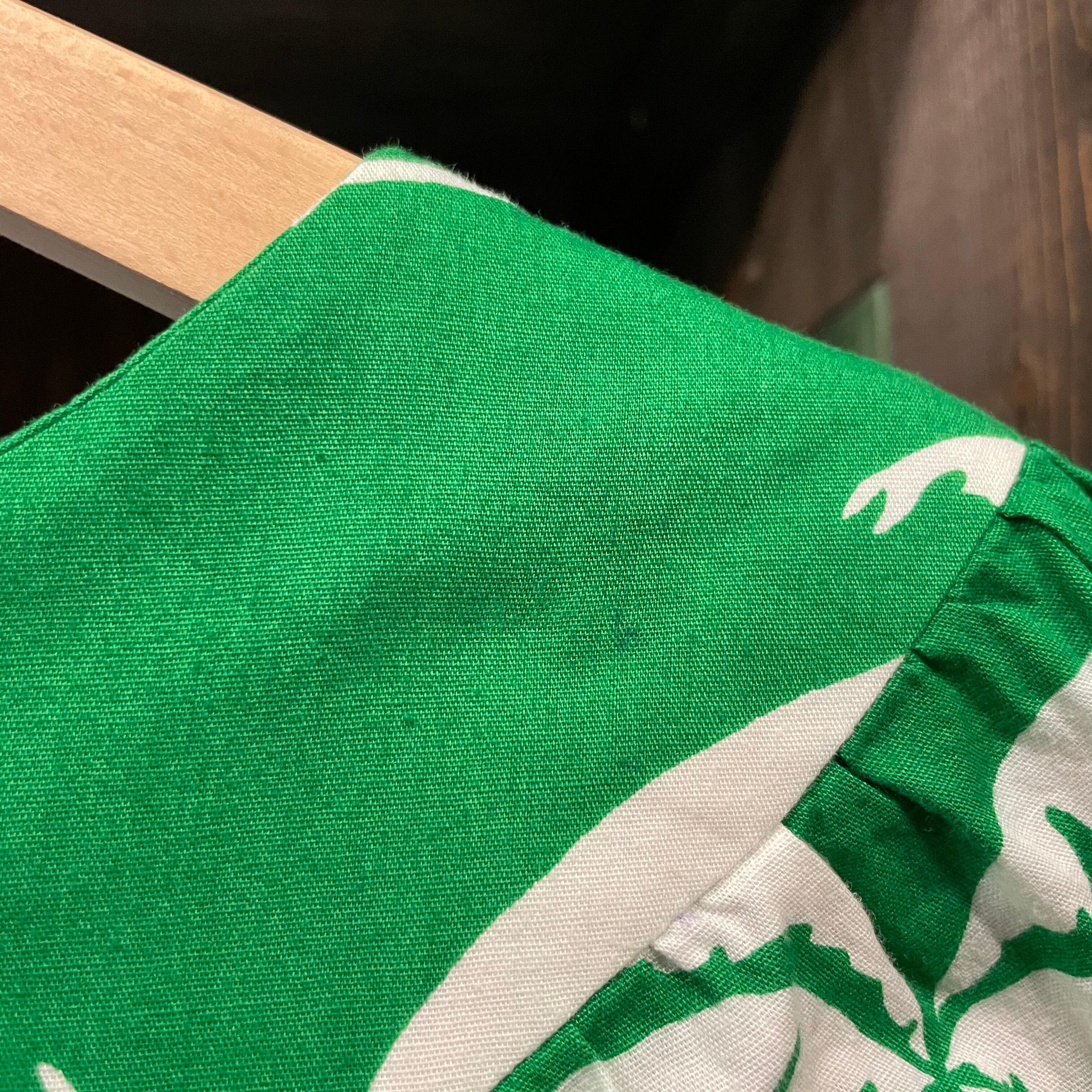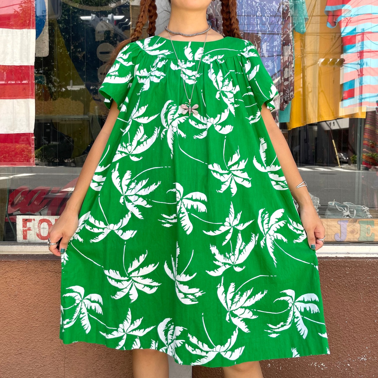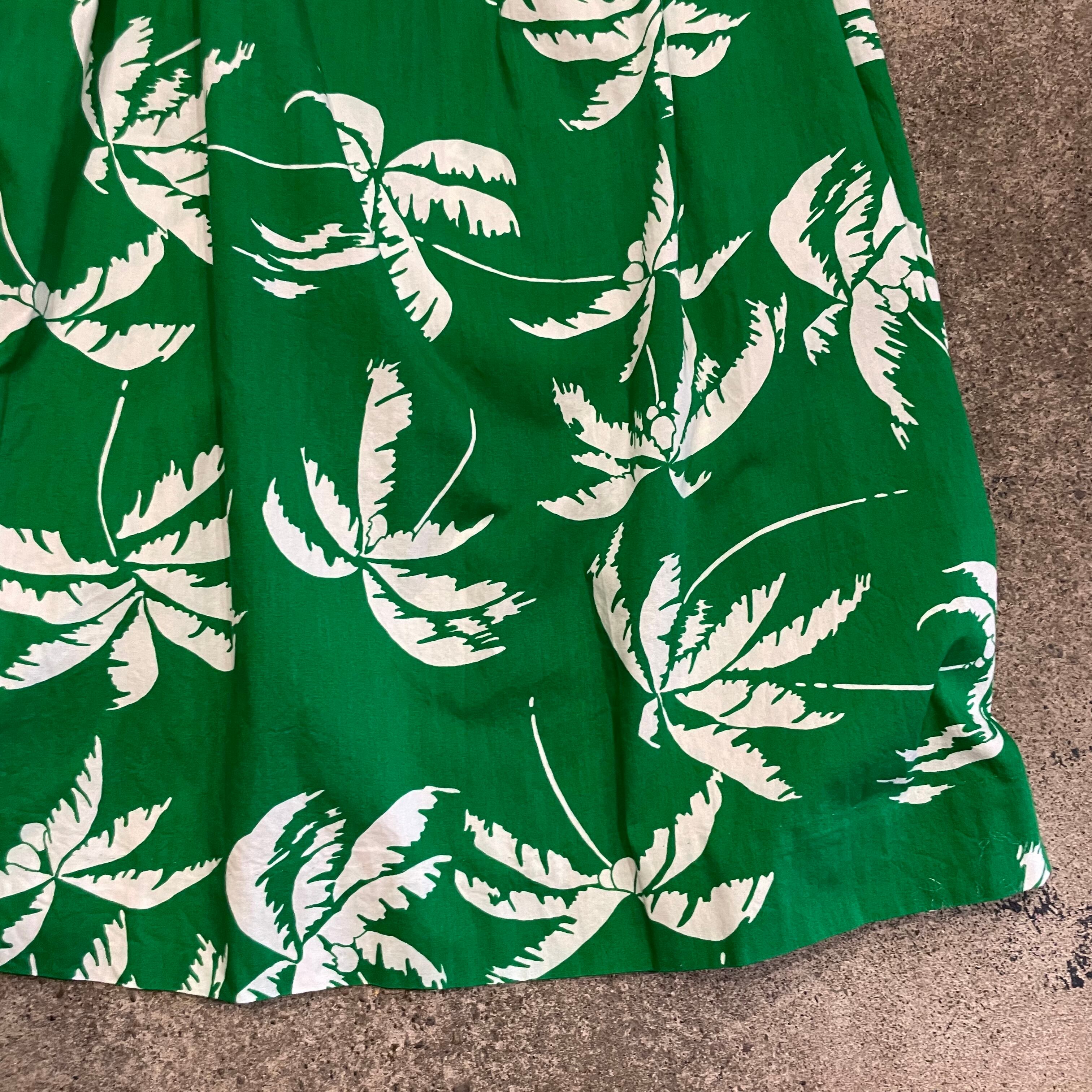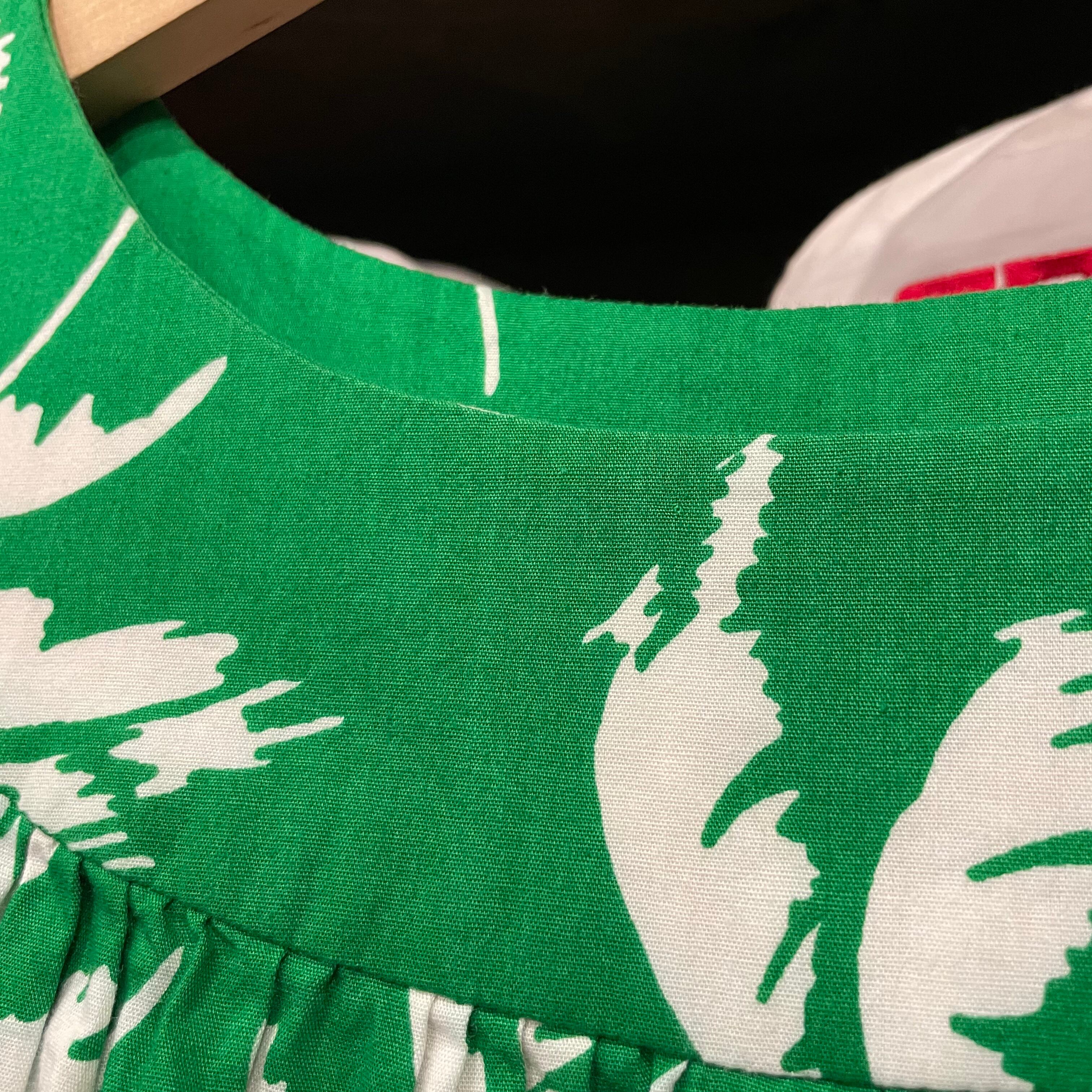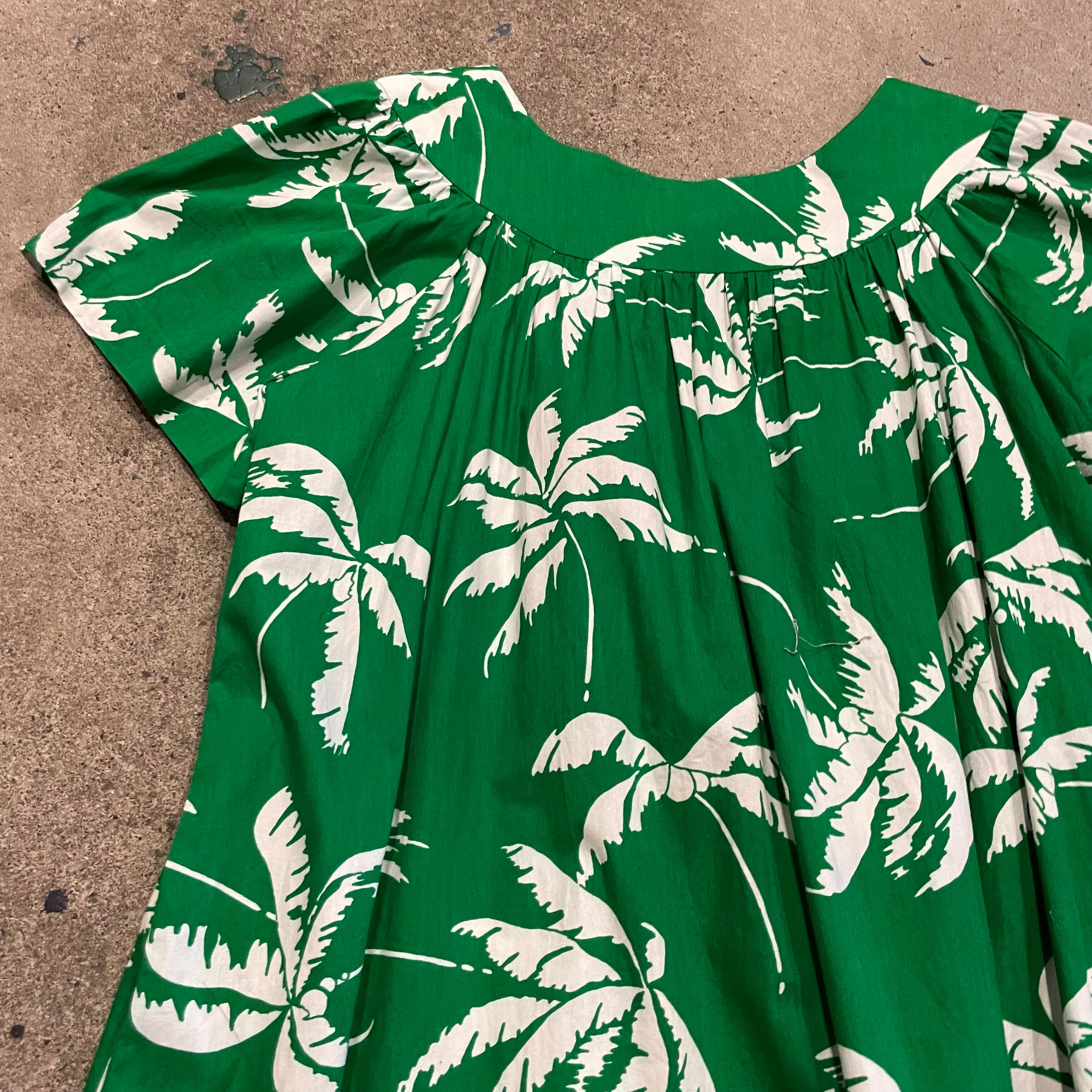 鮮やかな緑地に白いヤシの木柄がとてもかわいいワンピースです。