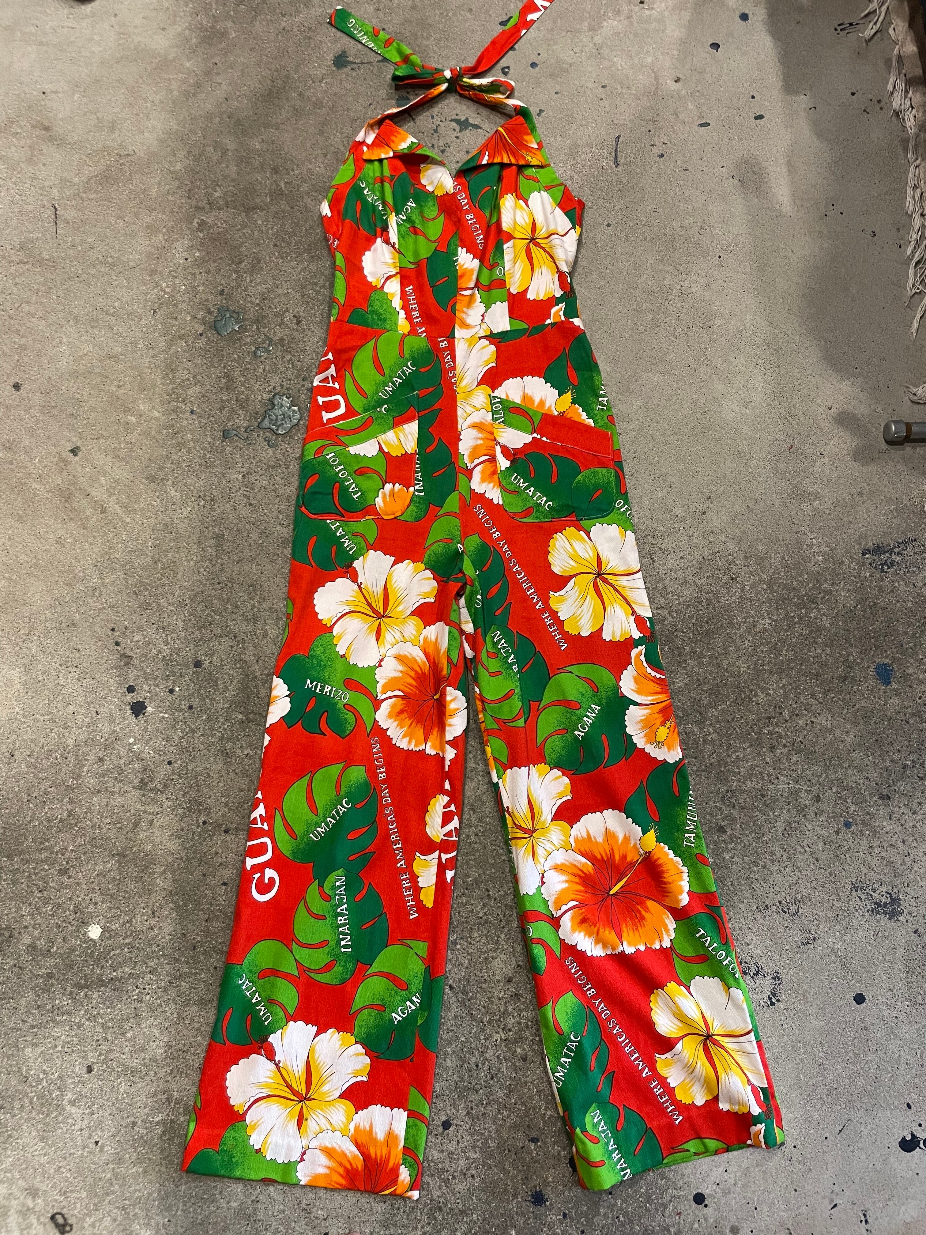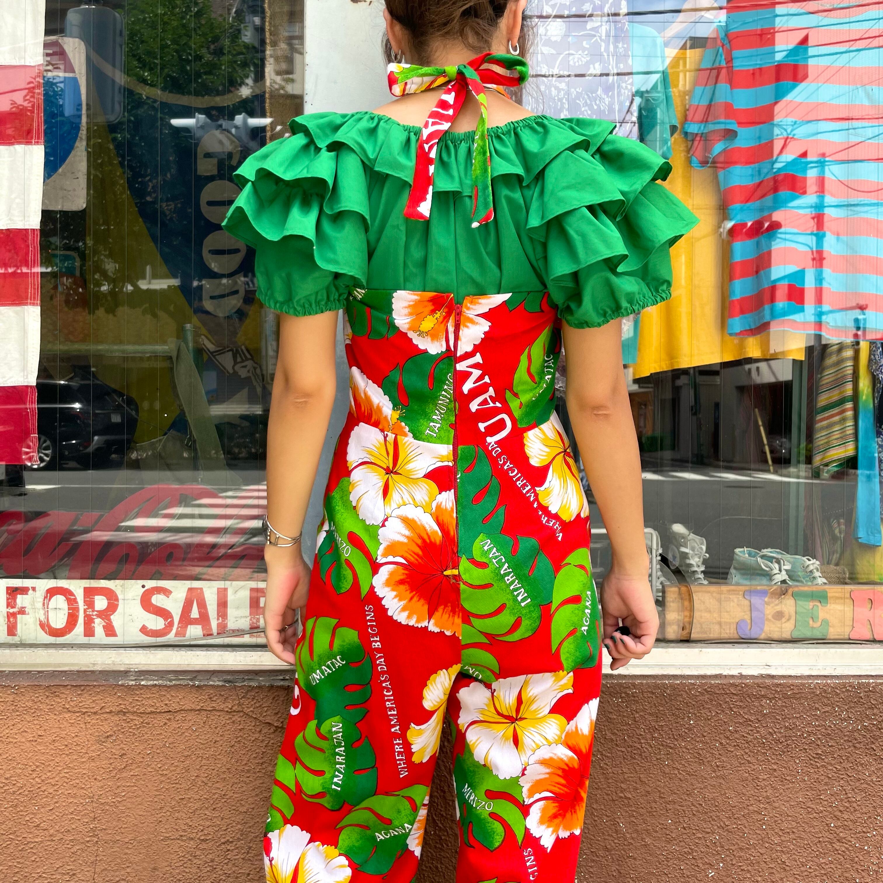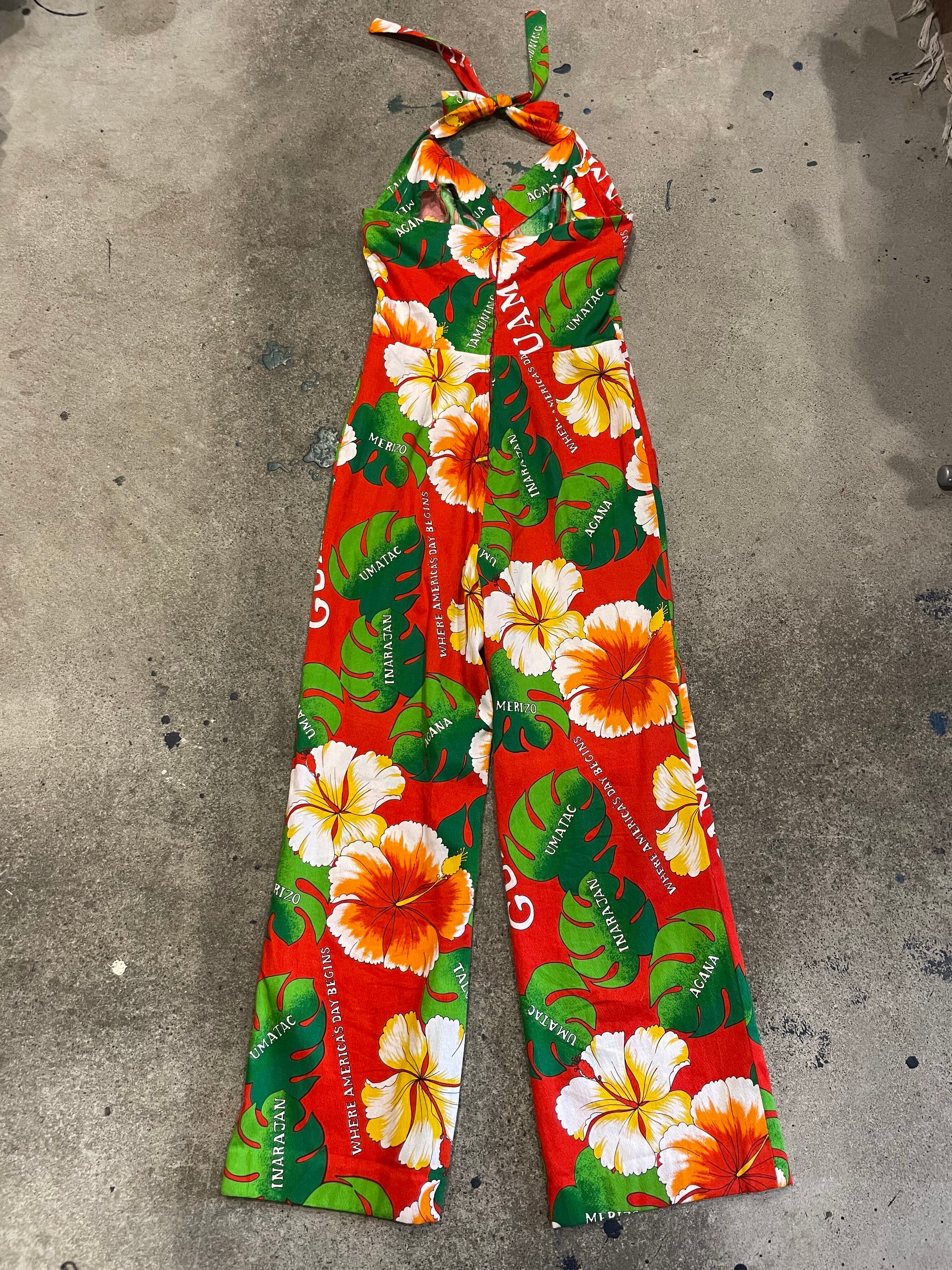 ザ・ハワイ!な雰囲気の大きなハイビスカスとモンステラの柄がかわいいジャンプスーツです。