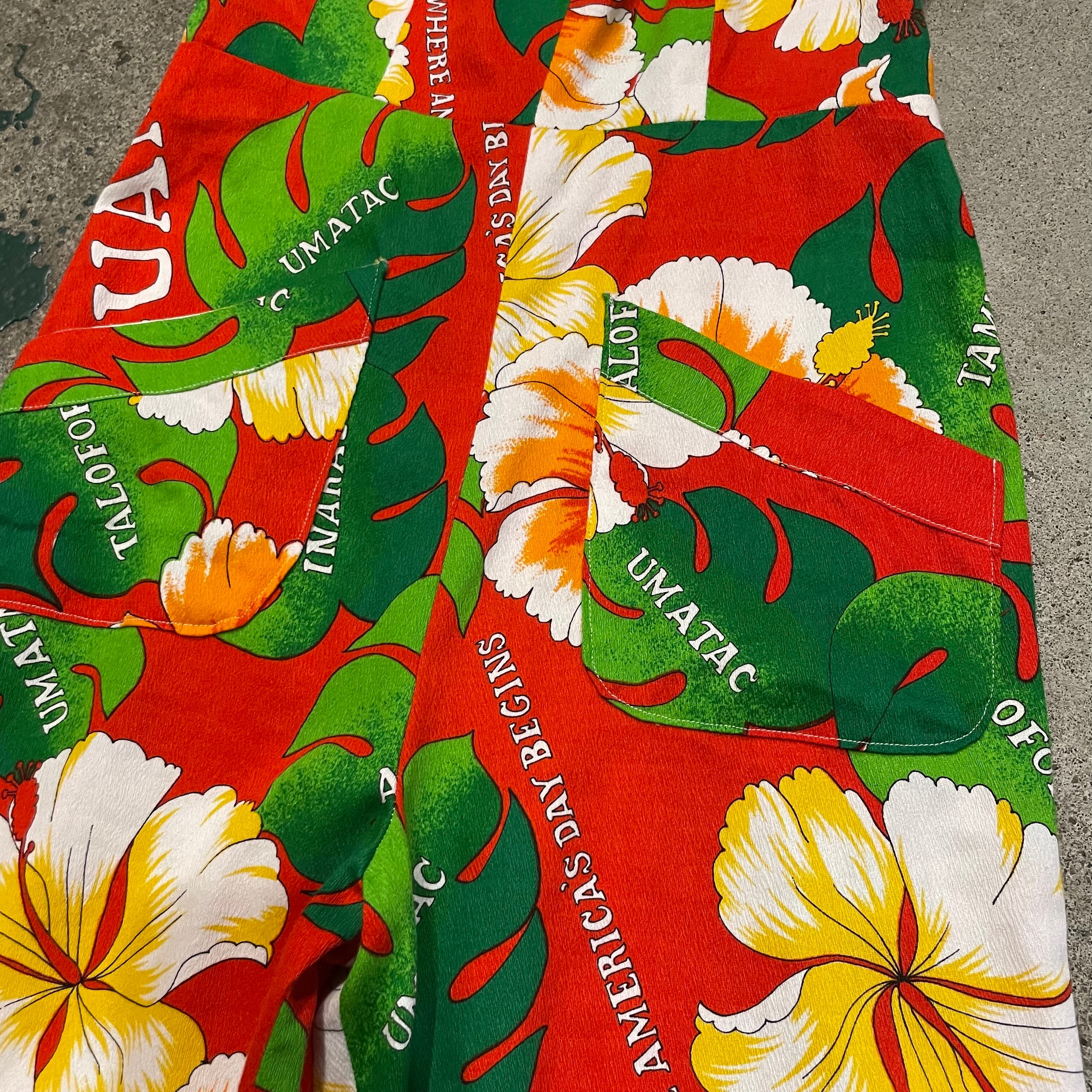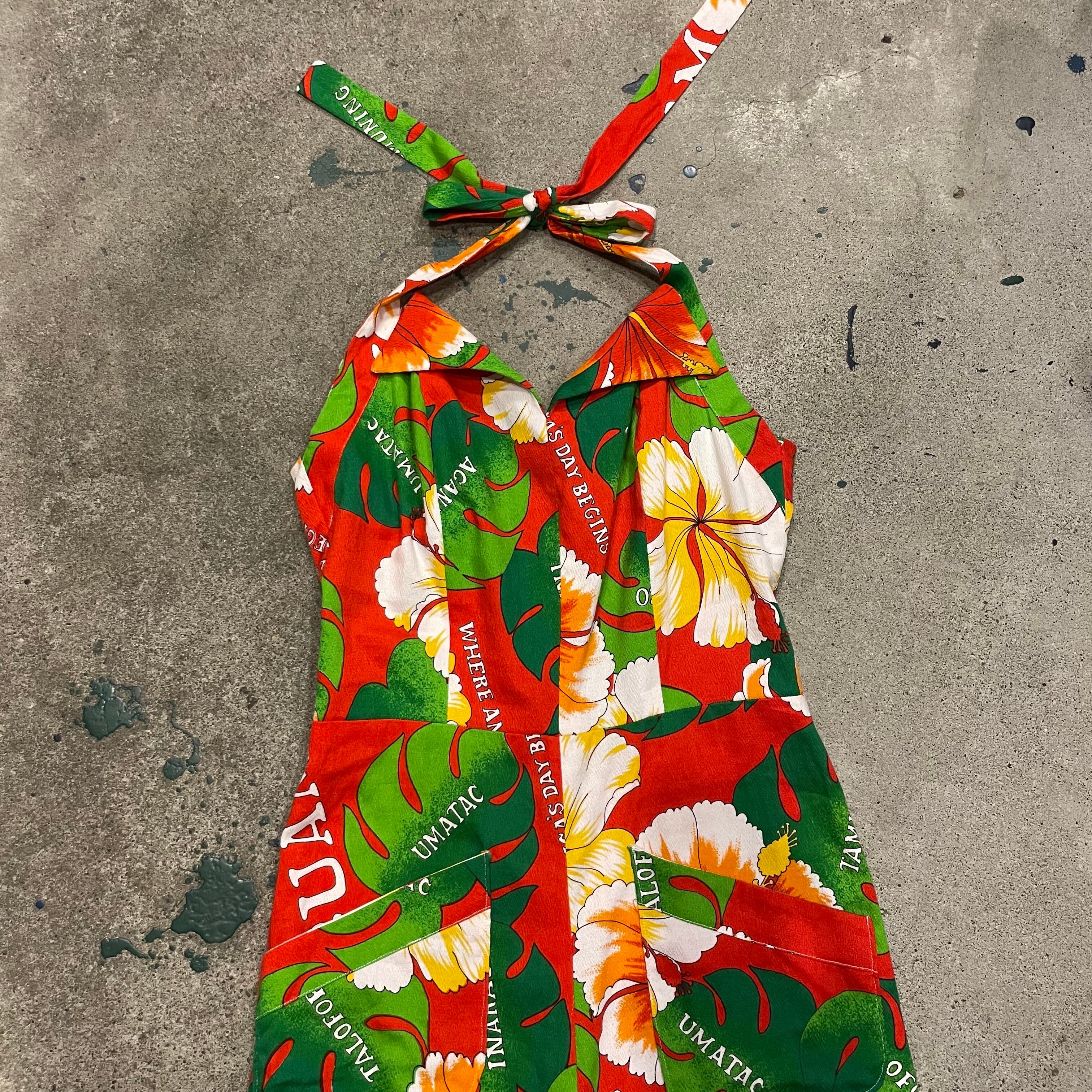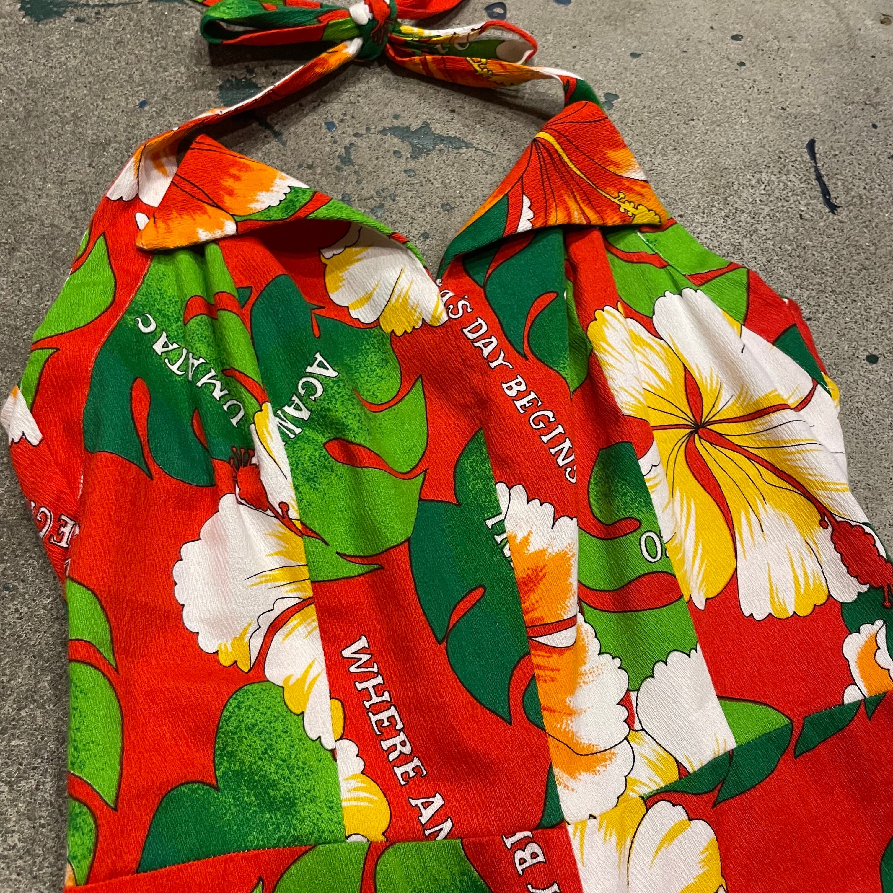 ザ・ハワイ!な雰囲気の大きなハイビスカスとモンステラの柄がかわいいジャンプスーツです。