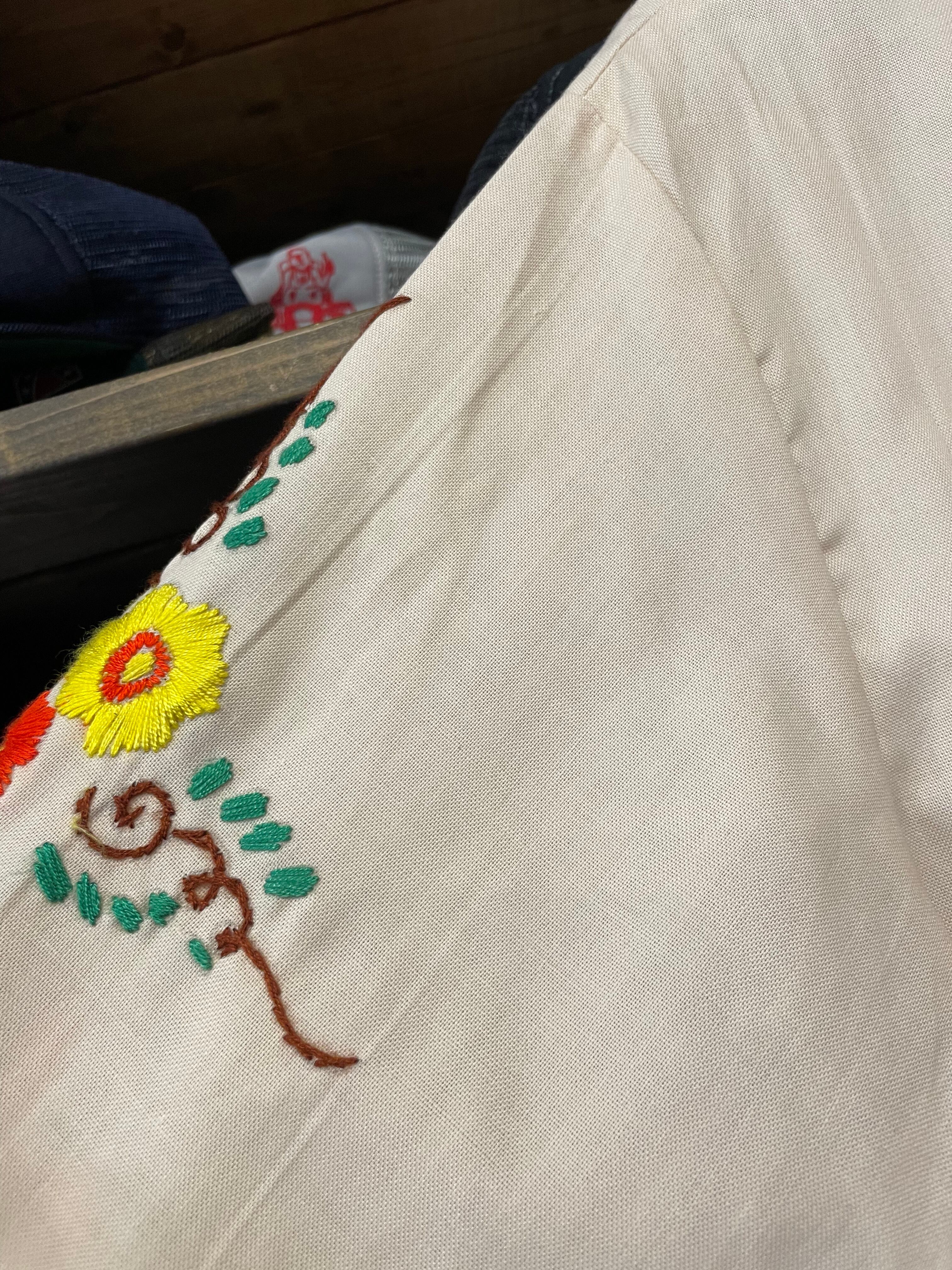 なんといっても袖口と真ん中にバランス良く施された手刺繍がポイントですが、ゆったり大きめなサイズで袖が五分丈くらいになったり緩い雰囲気がかわいいです。