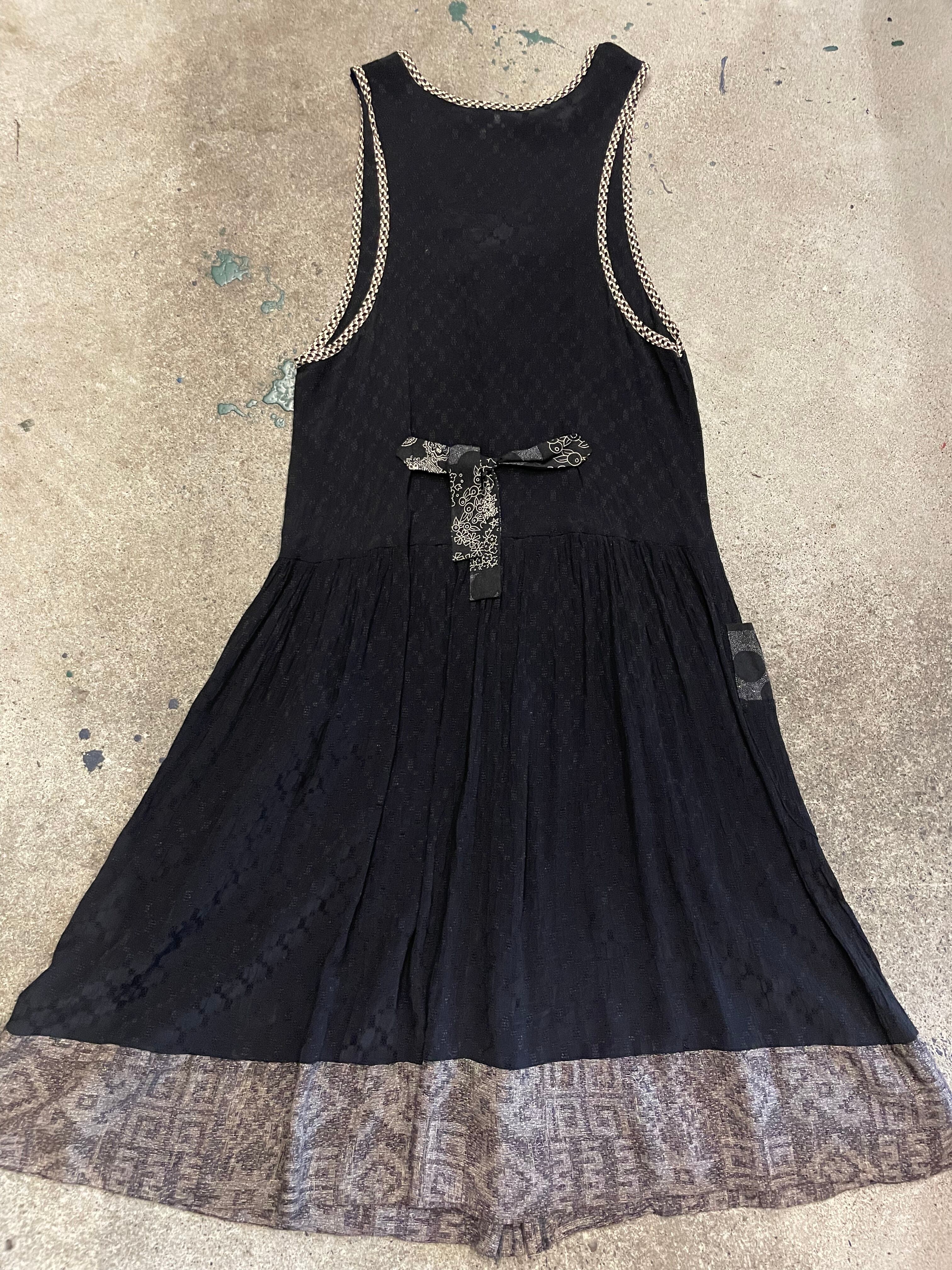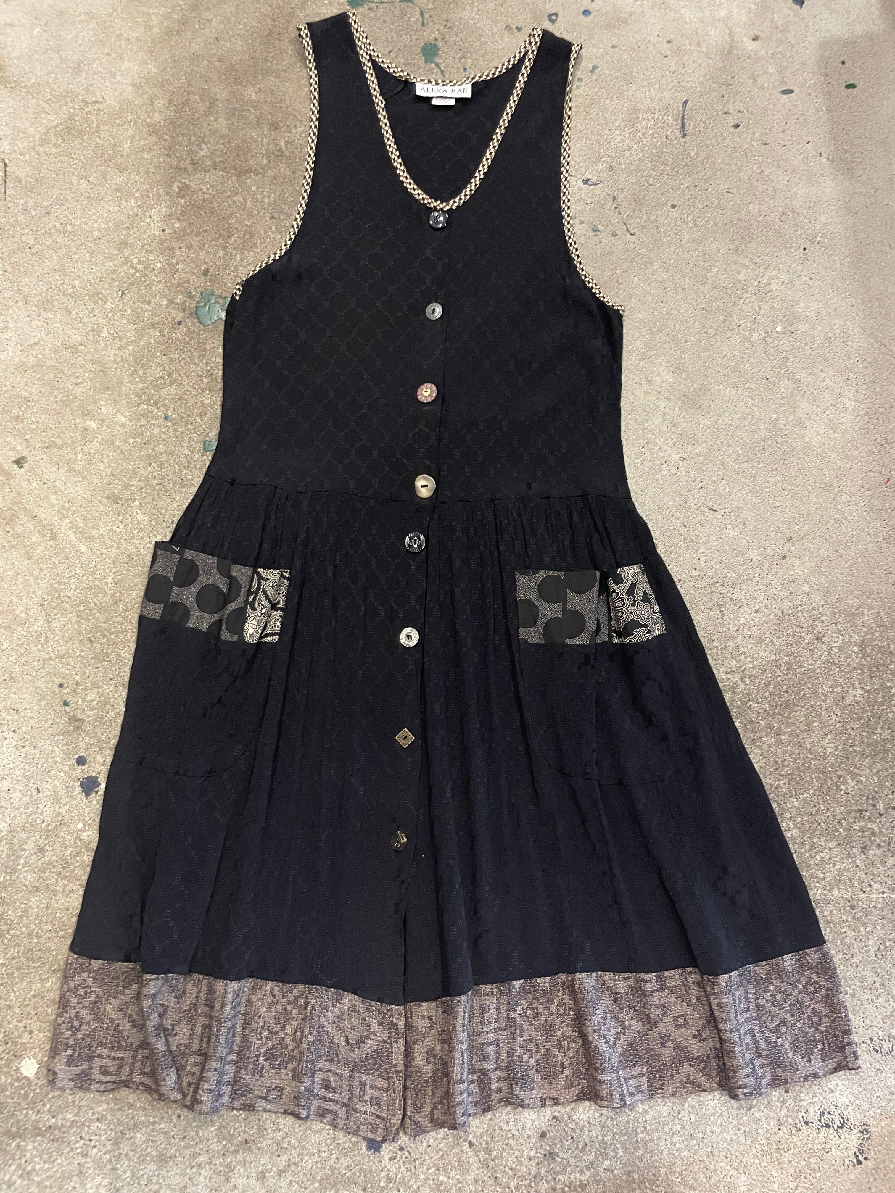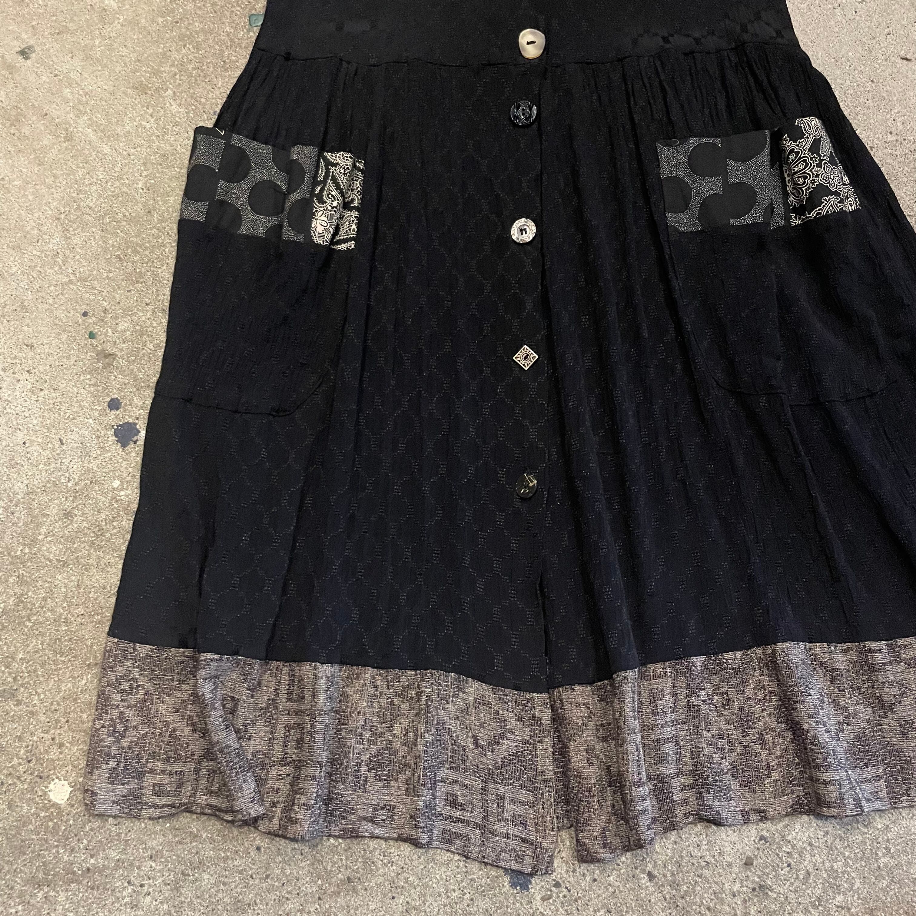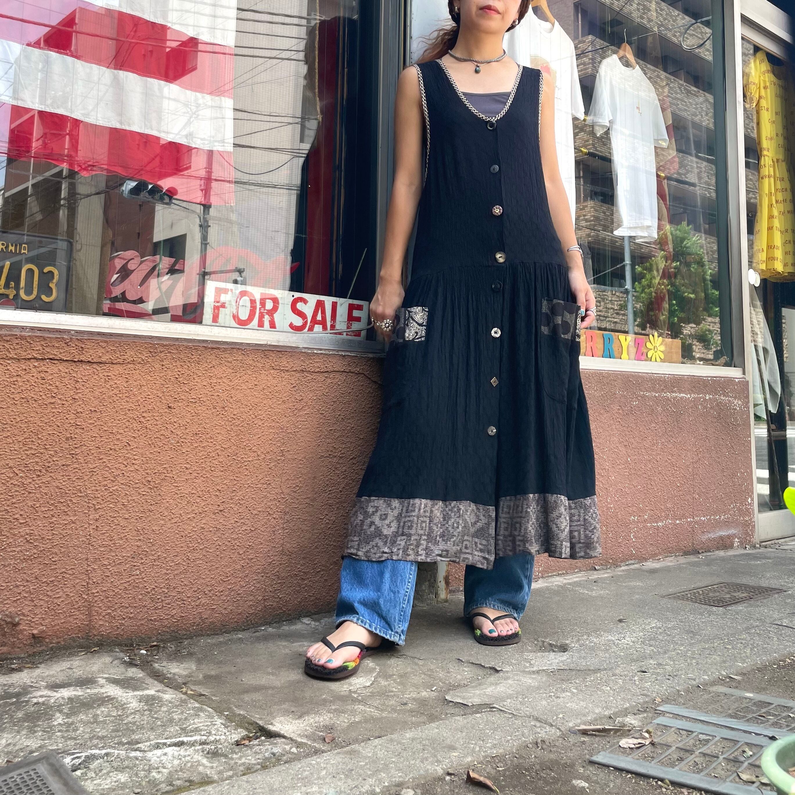 透け感のある模様がかわいいベースの生地にパイピングやポケット、裾などに渋めの柄の切り替えが素敵ですし、フロントのボタンが全部違うものが付いていたり、こっそり遊んでいる感じがかわいいですね。