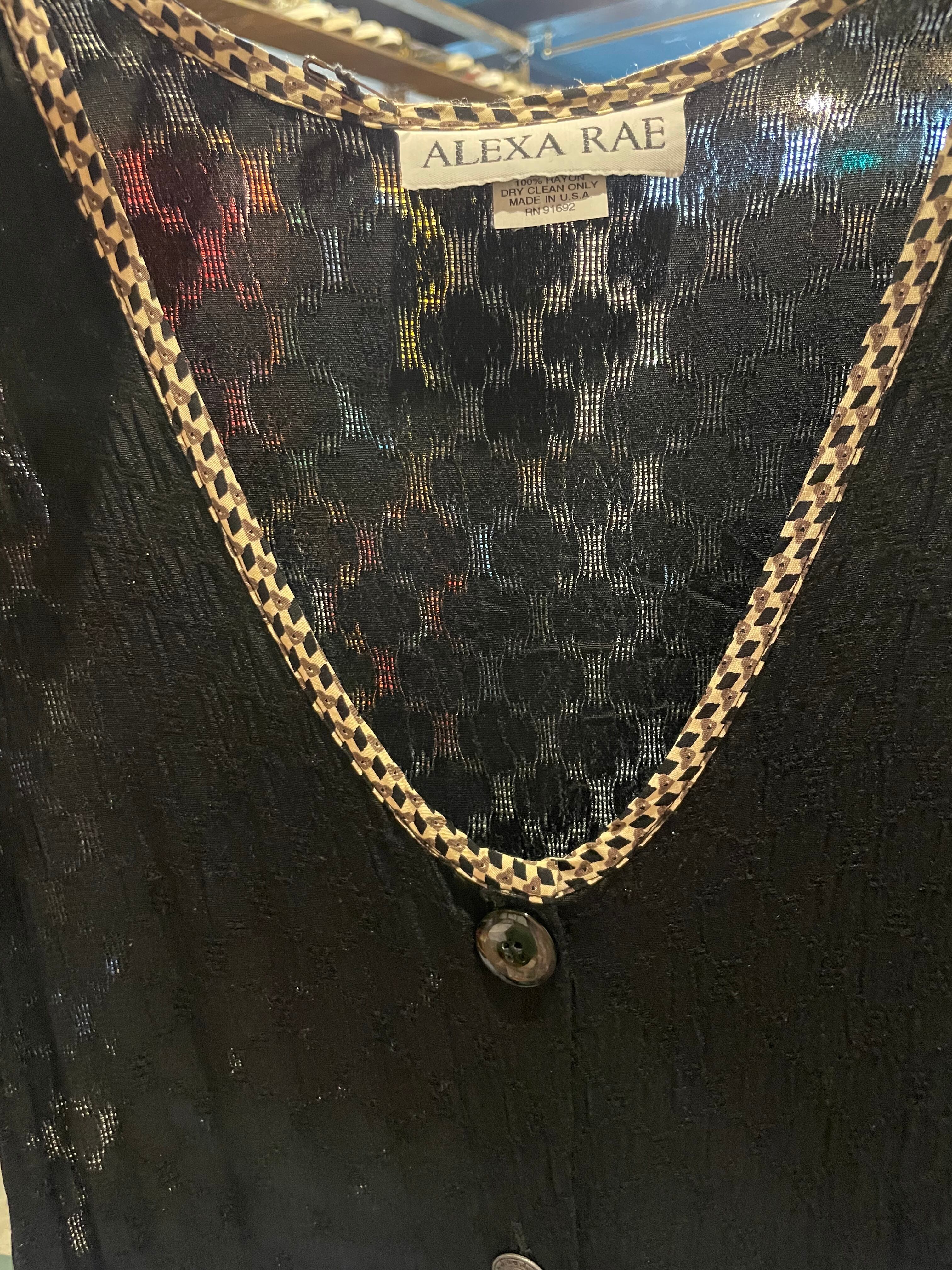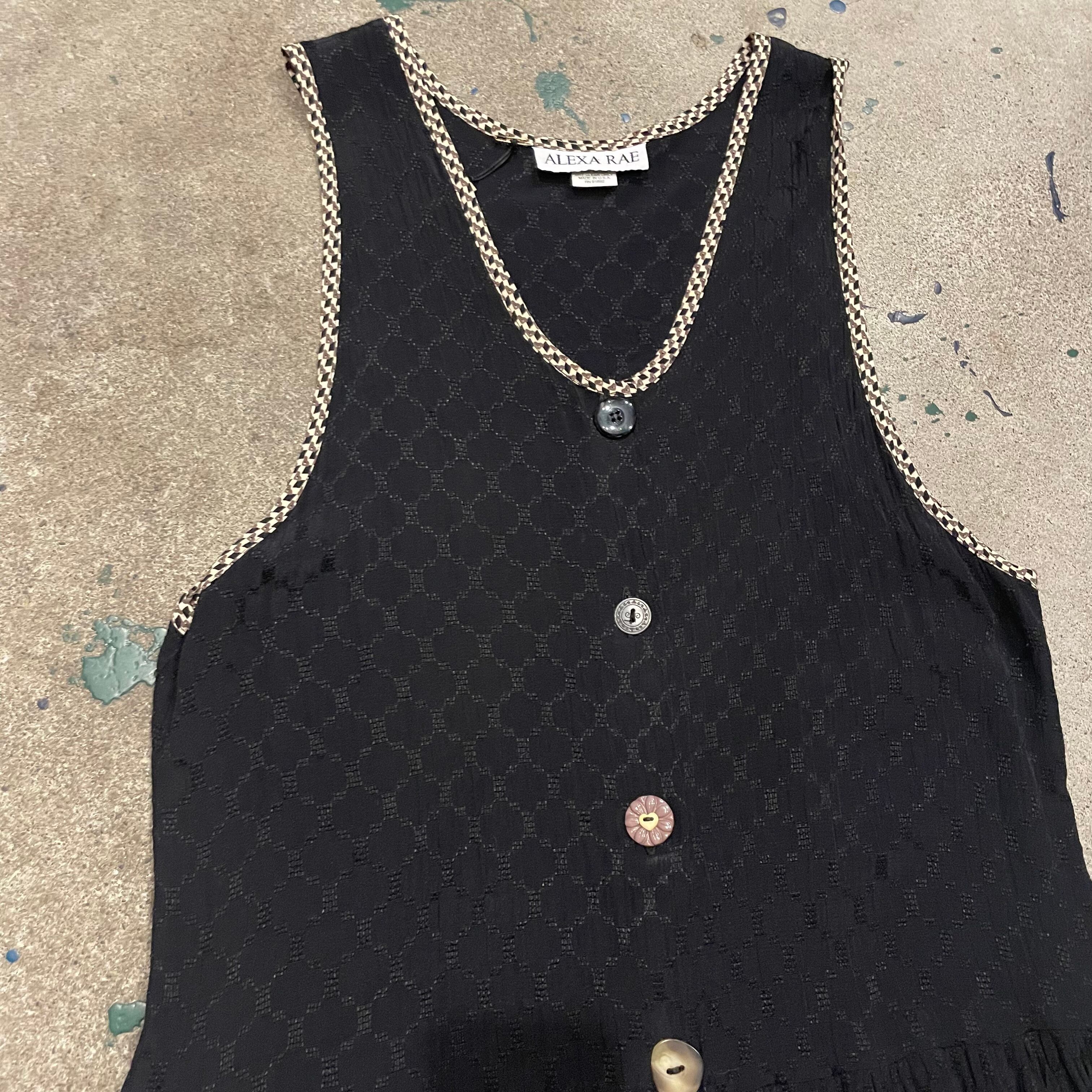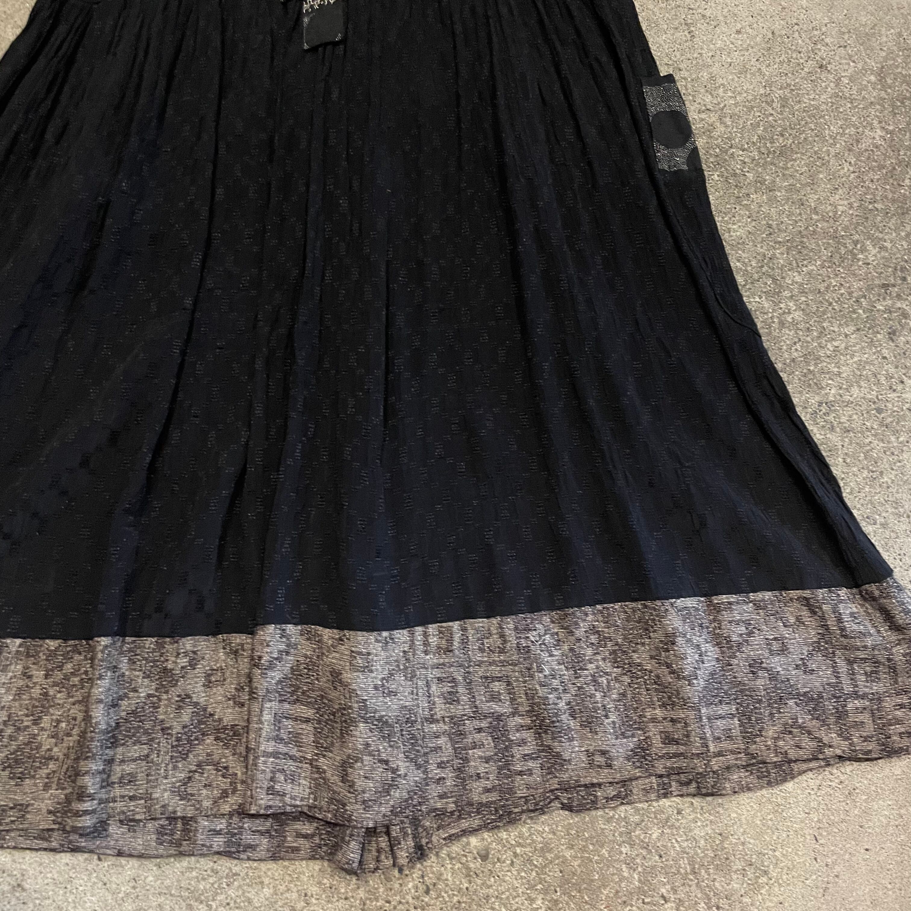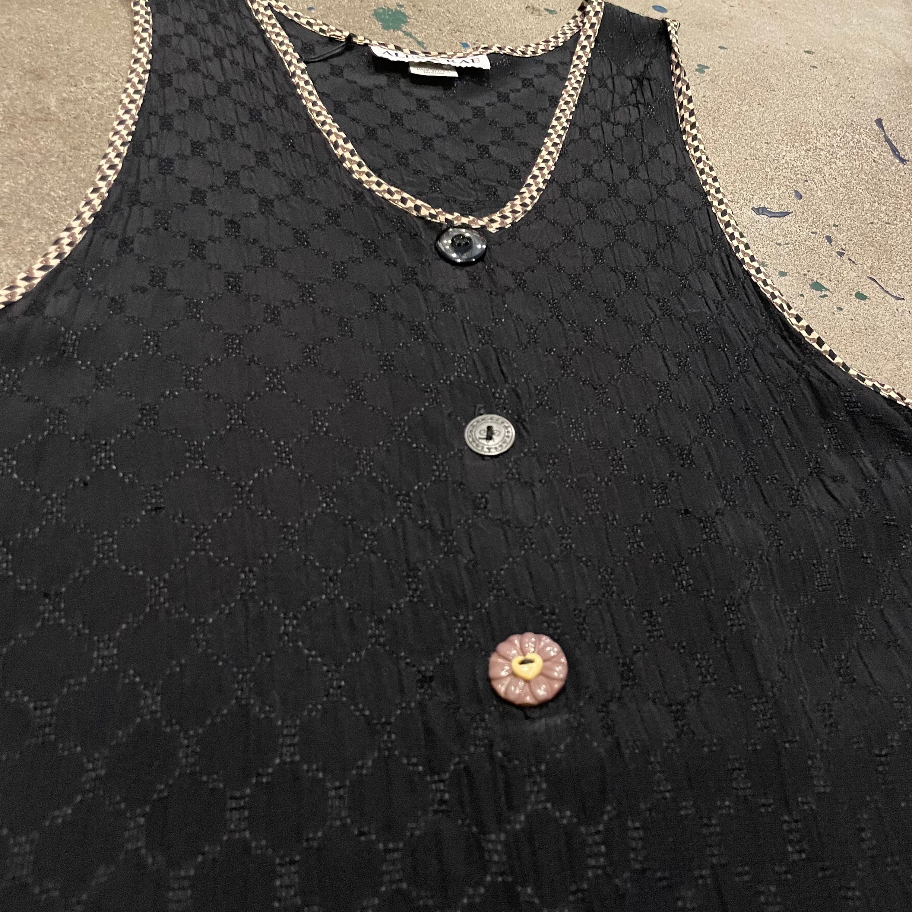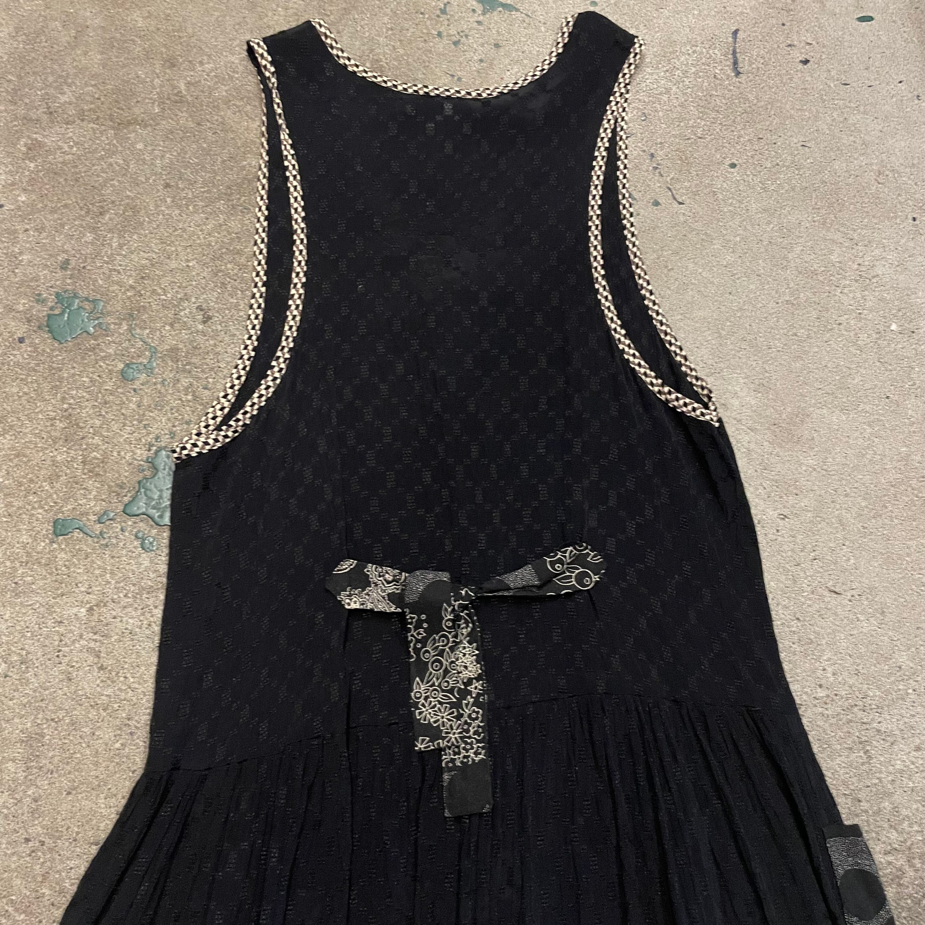 透け感のある模様がかわいいベースの生地にパイピングやポケット、裾などに渋めの柄の切り替えが素敵ですし、フロントのボタンが全部違うものが付いていたり、こっそり遊んでいる感じがかわいいですね。