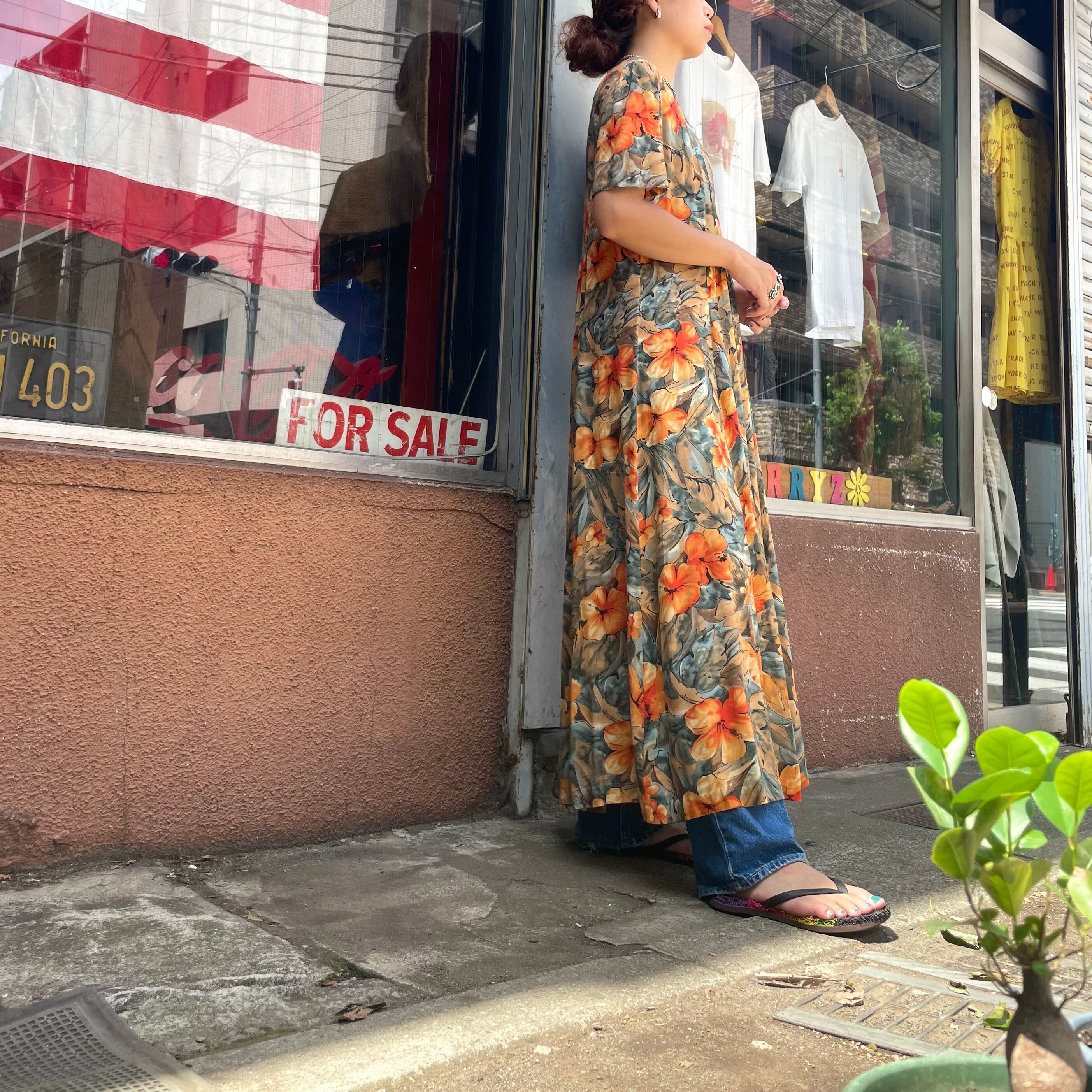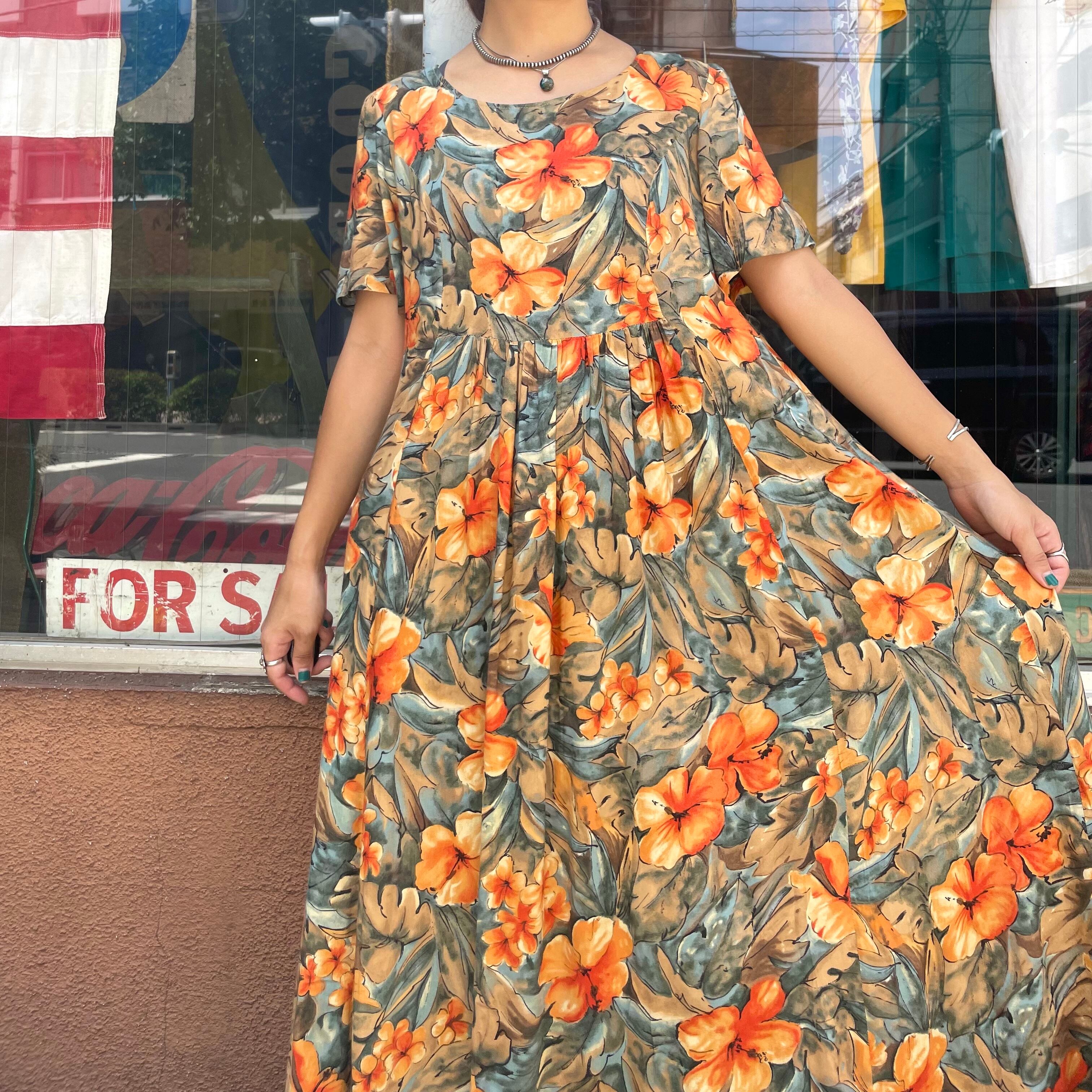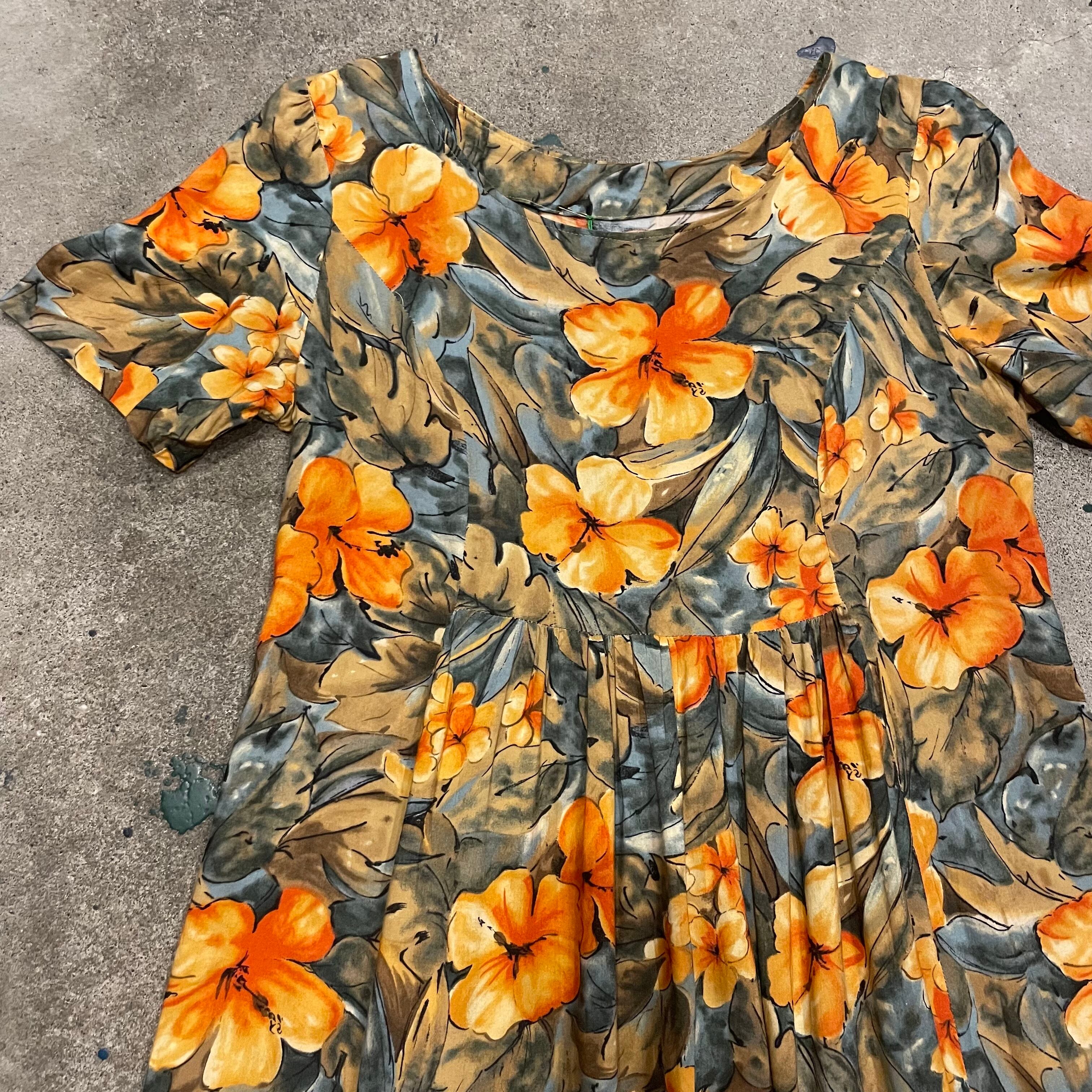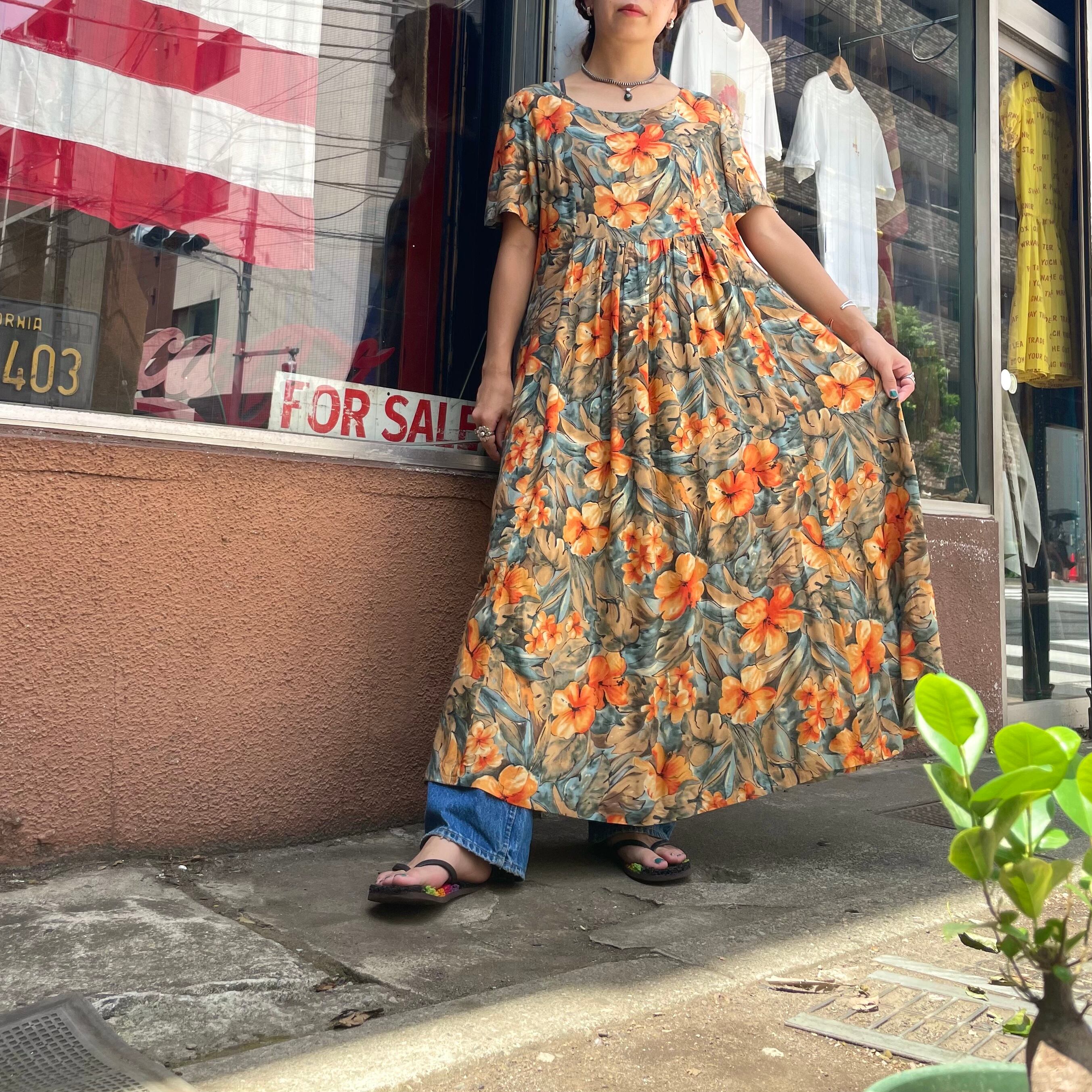 オレンジのハイビスカス?柄がかわいいワンピースです。