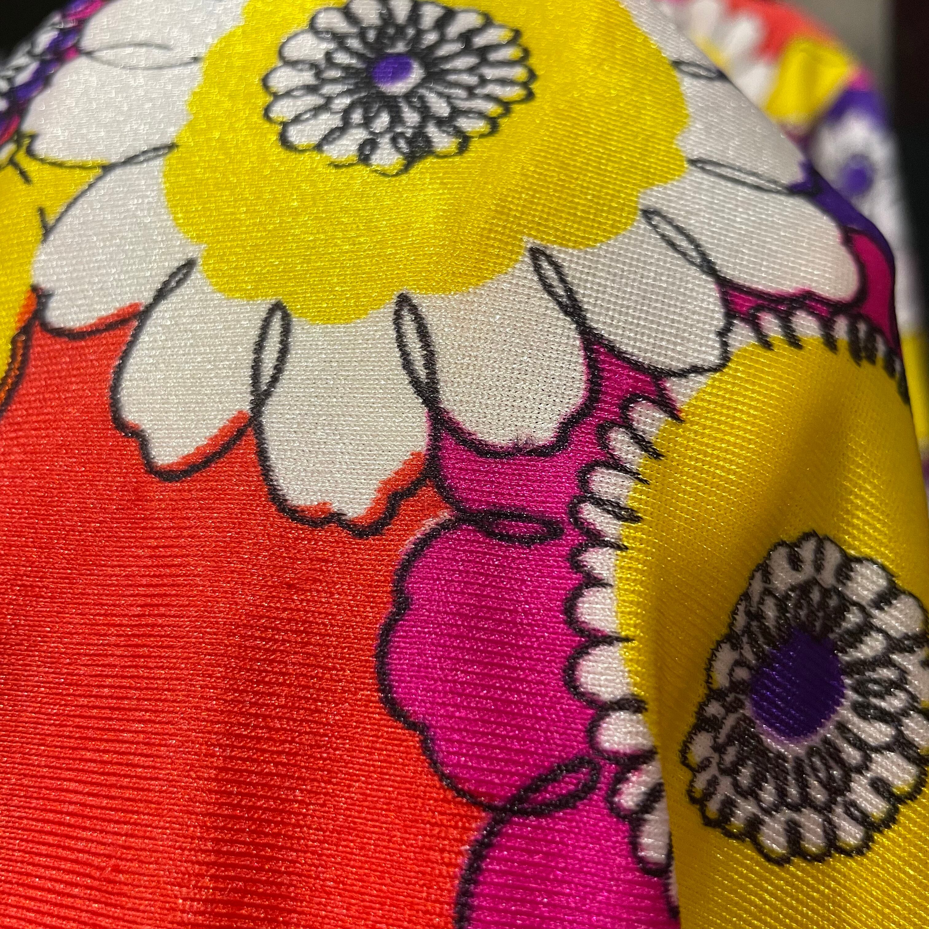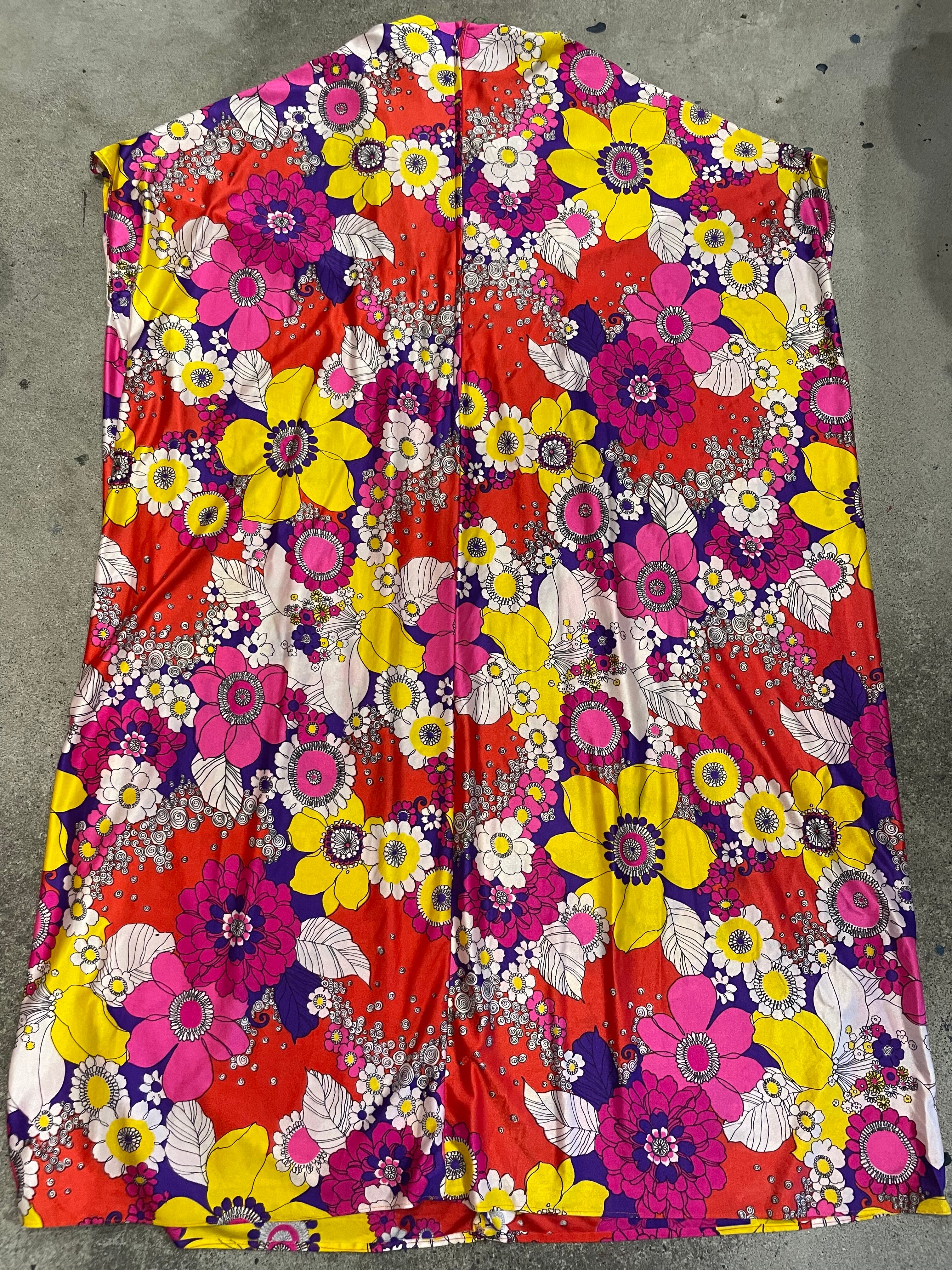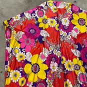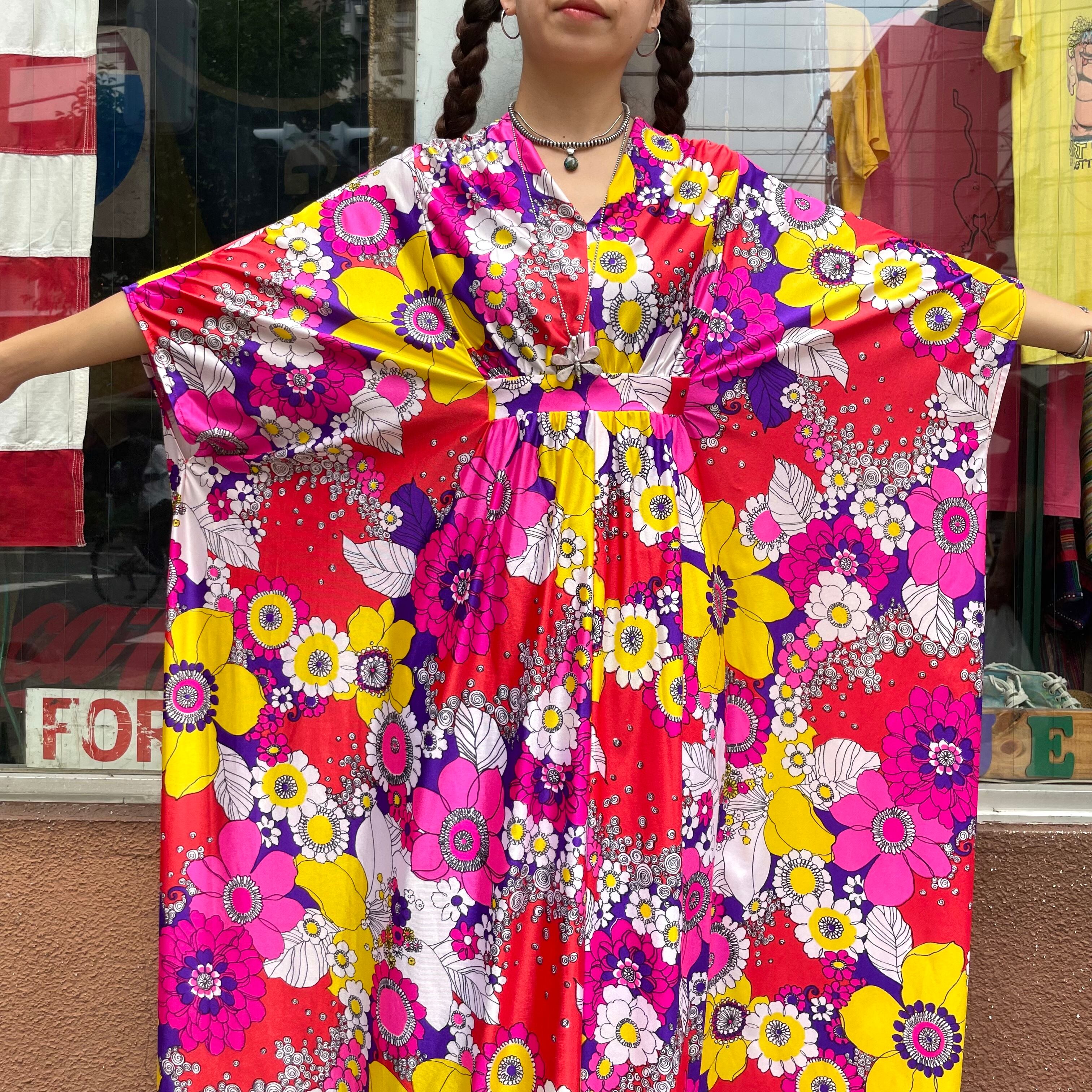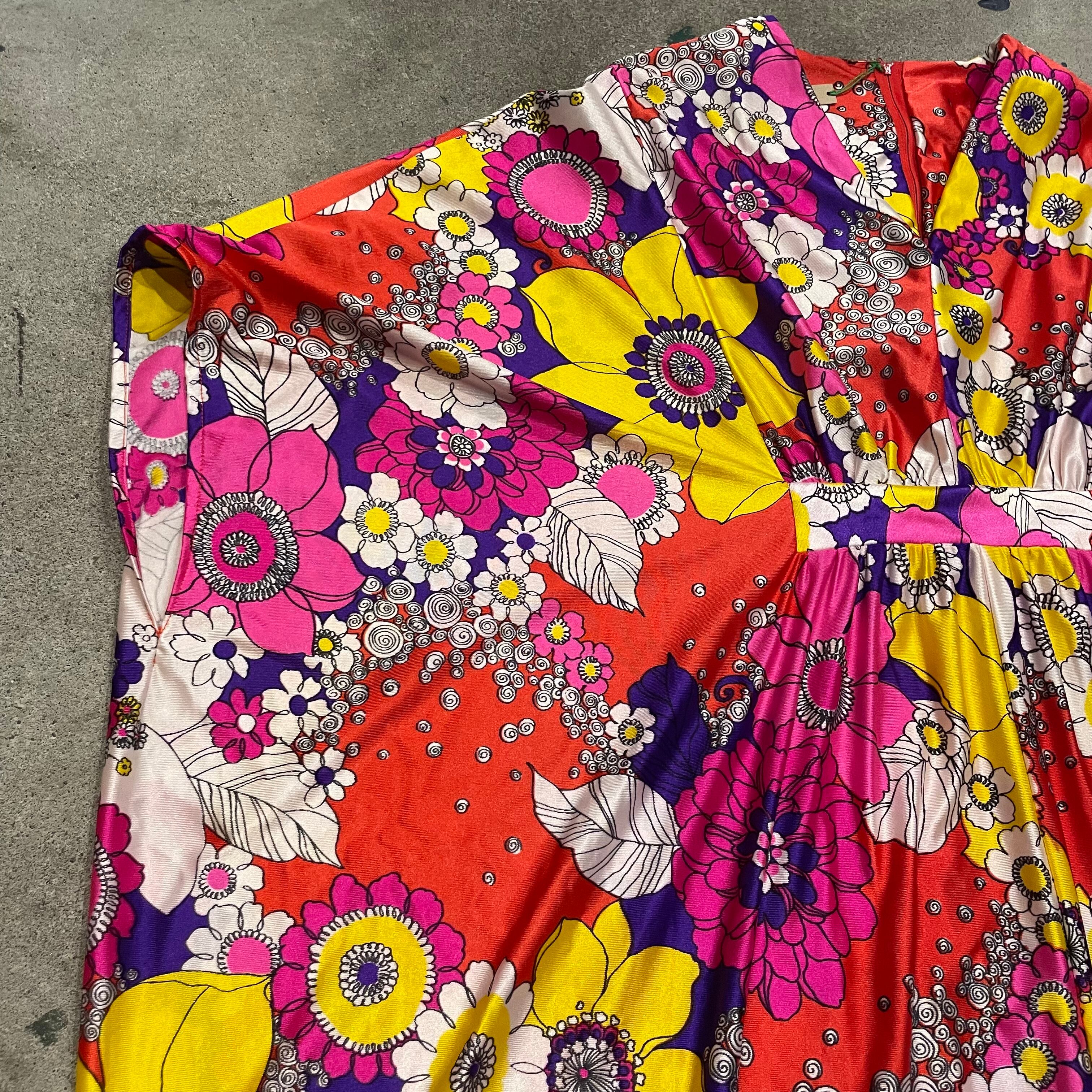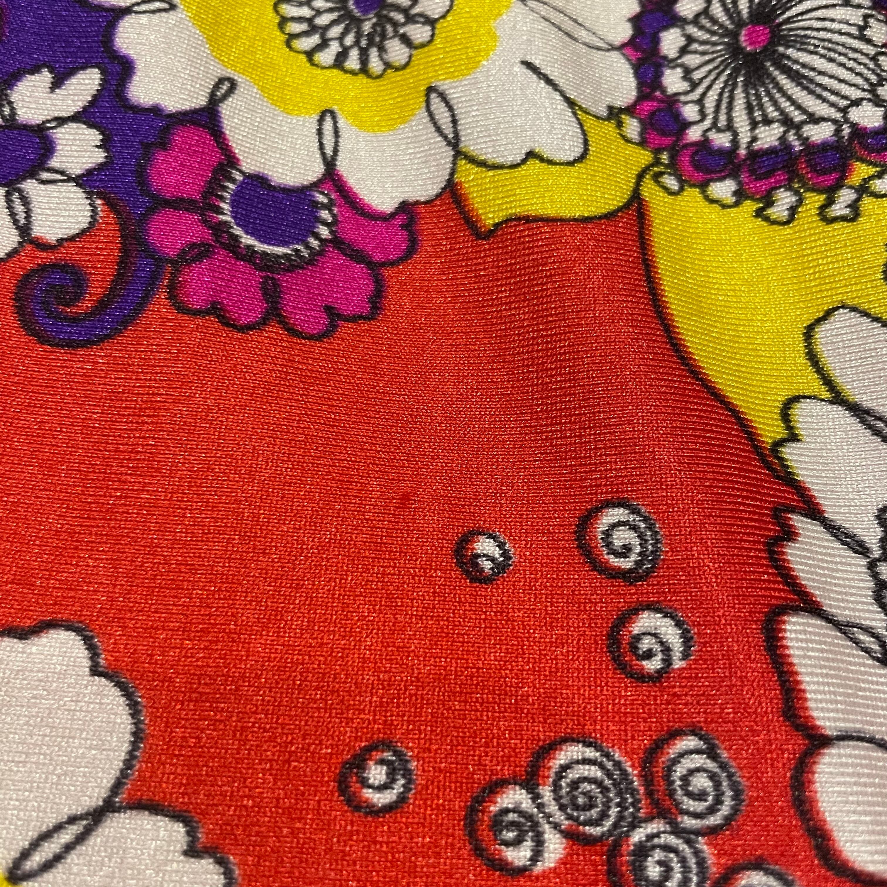 とっても華やかな花柄がかわいいワンピースです。つるんとしたやや光沢のある生地で眩しいほどの華やかさです。