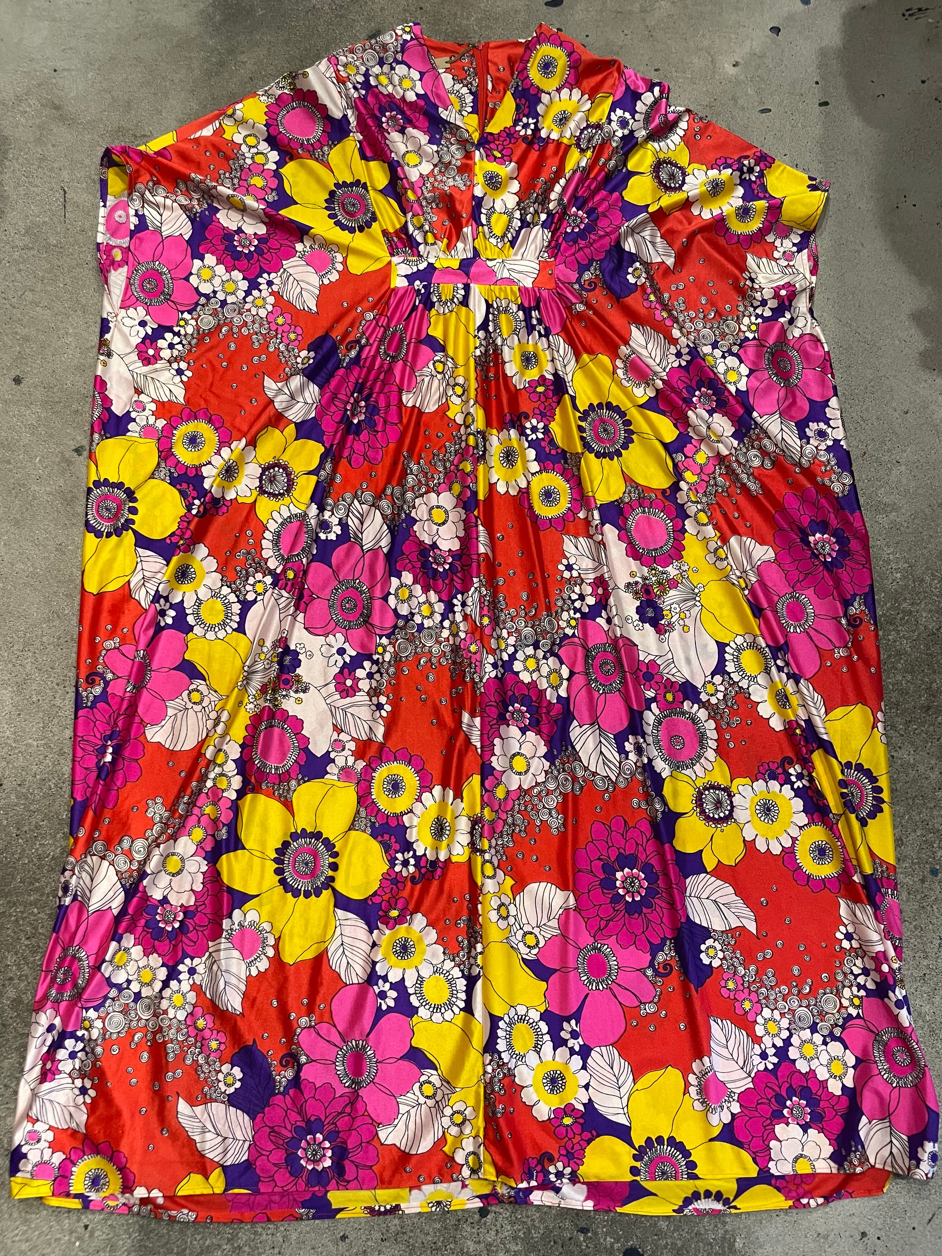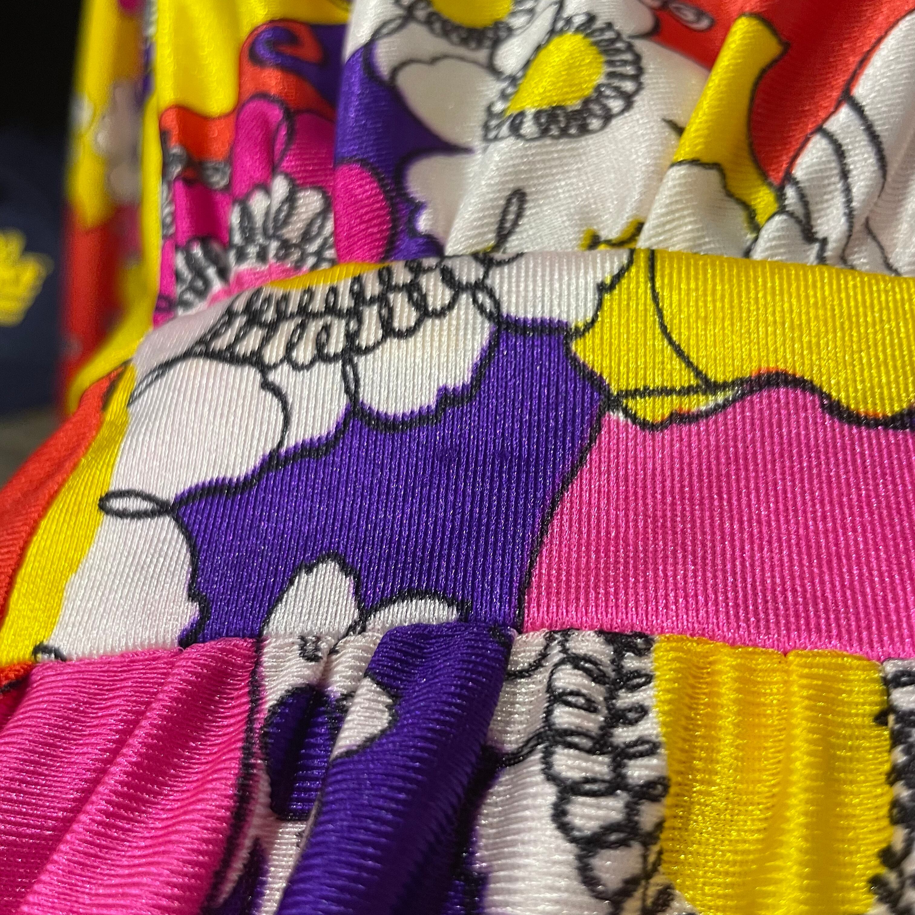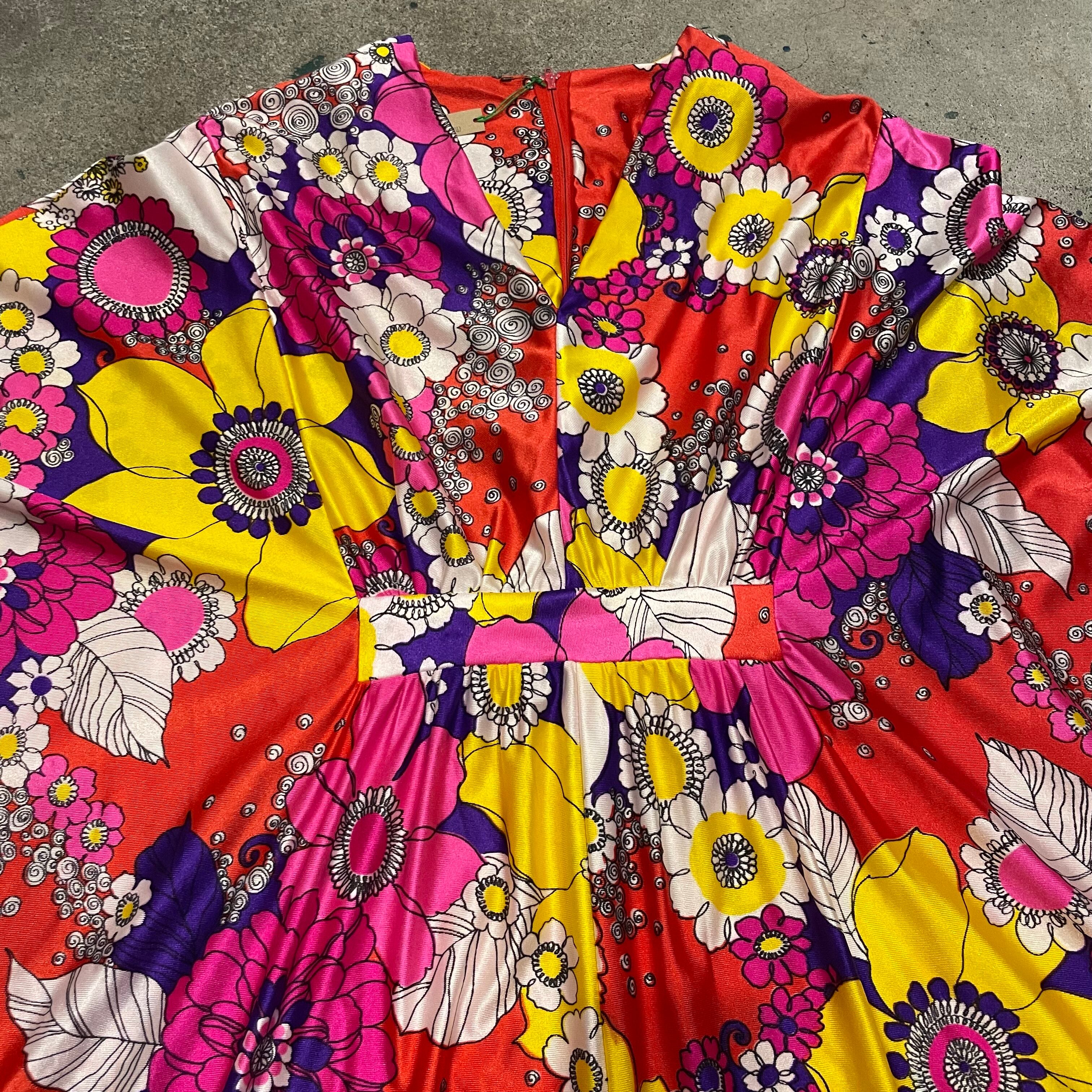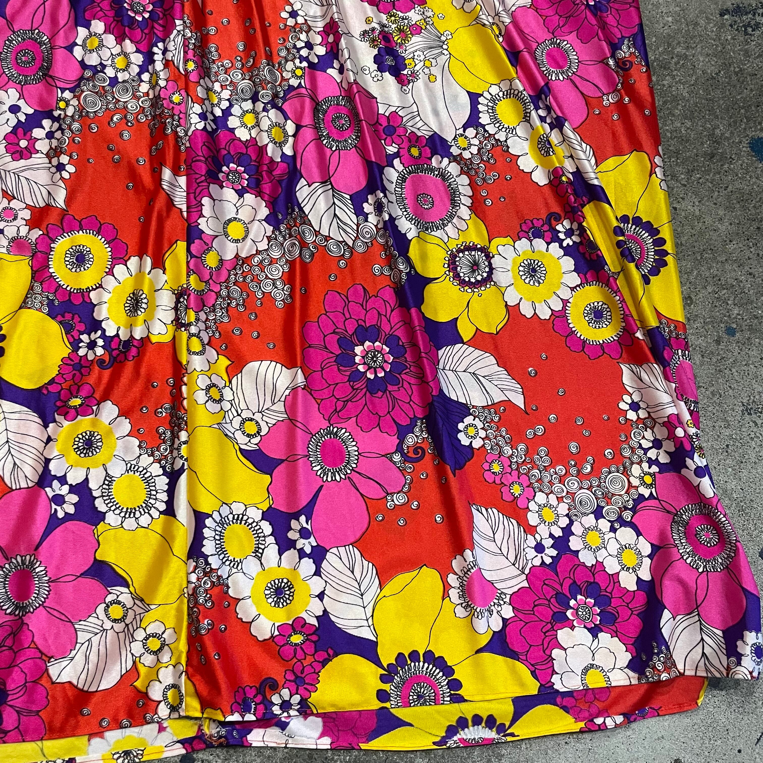 とっても華やかな花柄がかわいいワンピースです。つるんとしたやや光沢のある生地で眩しいほどの華やかさです。