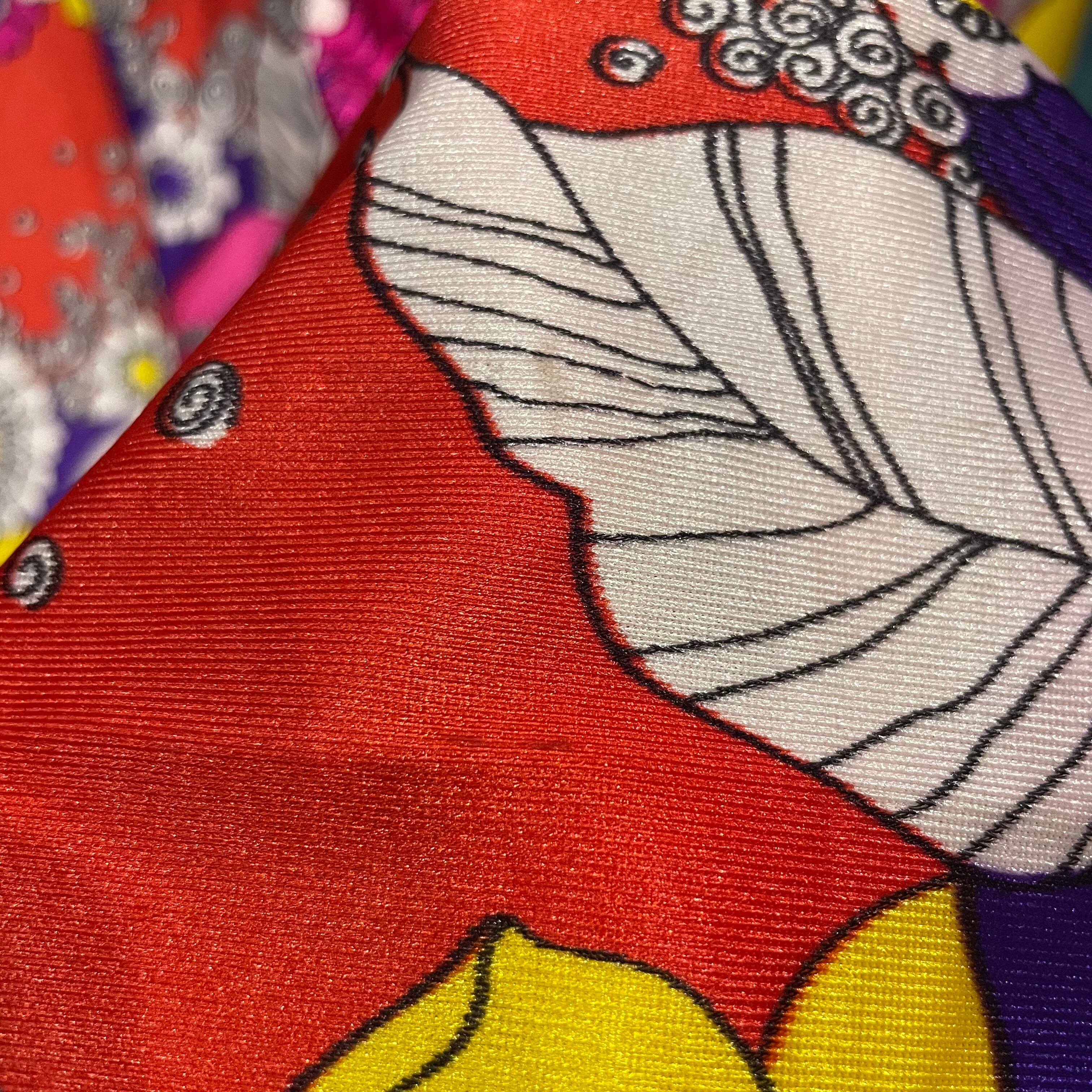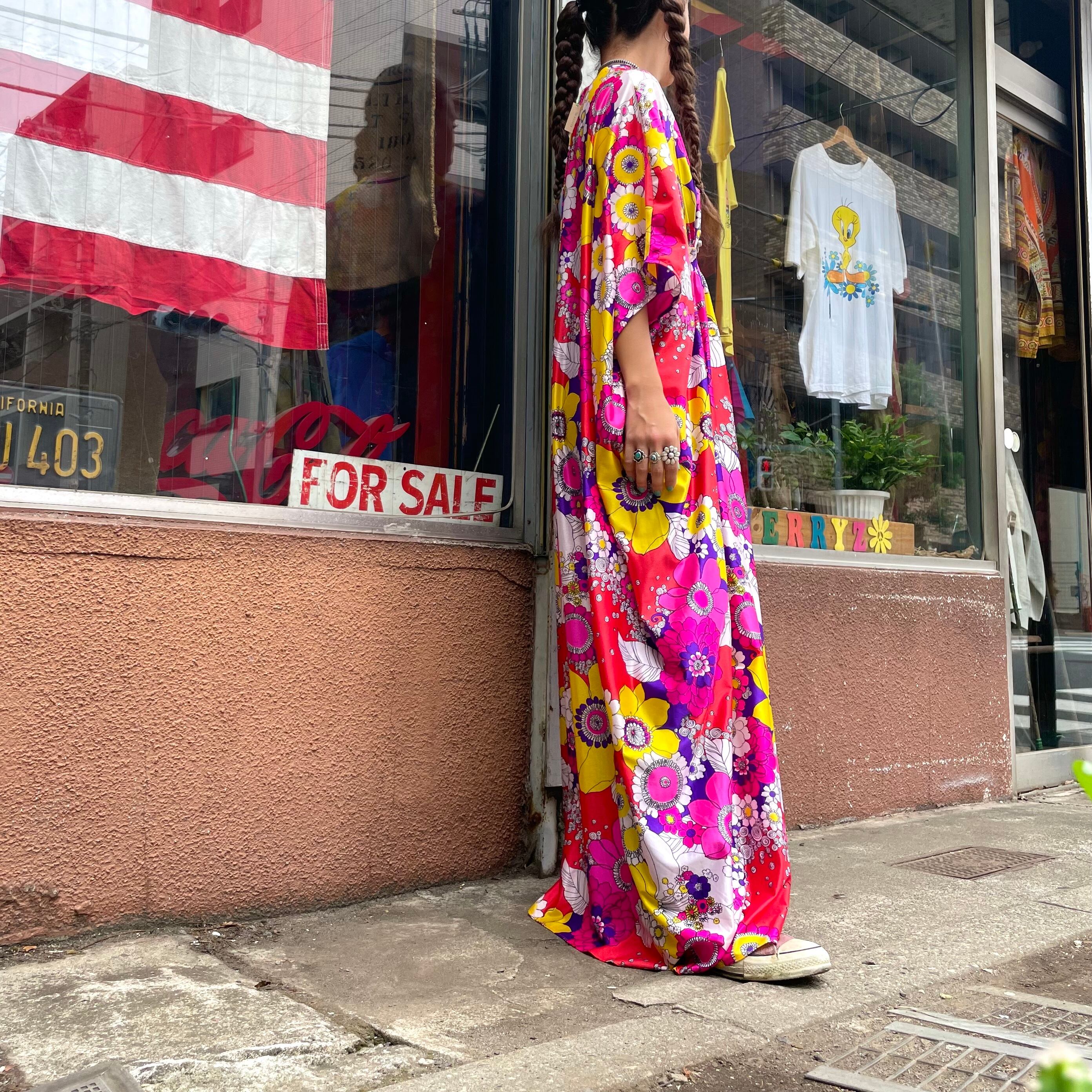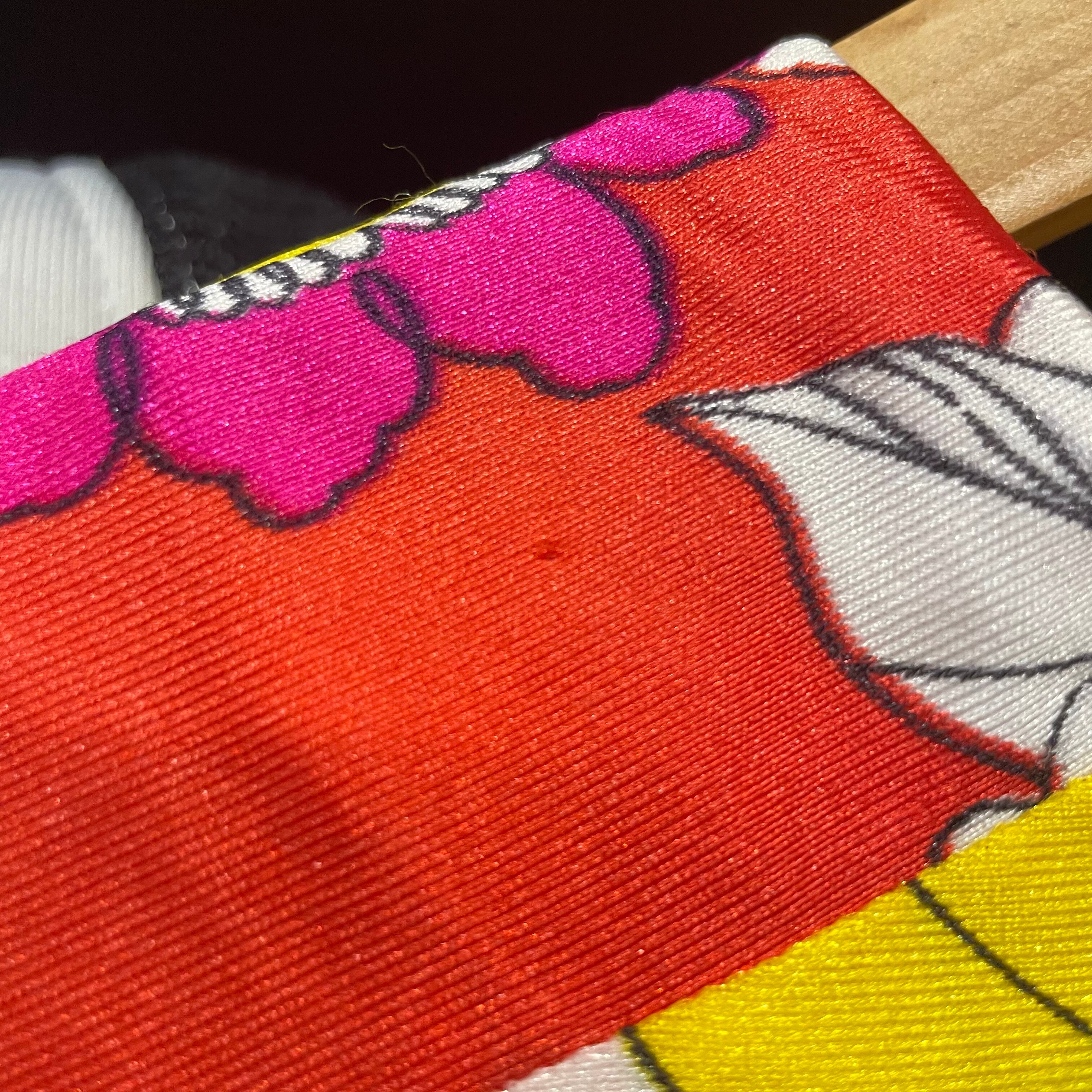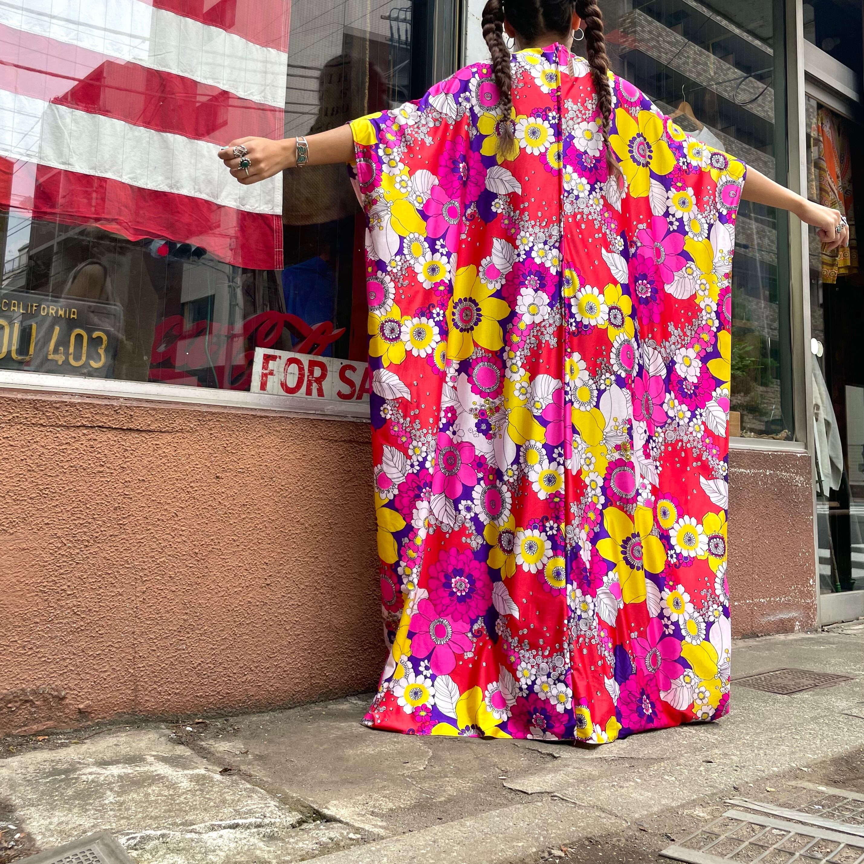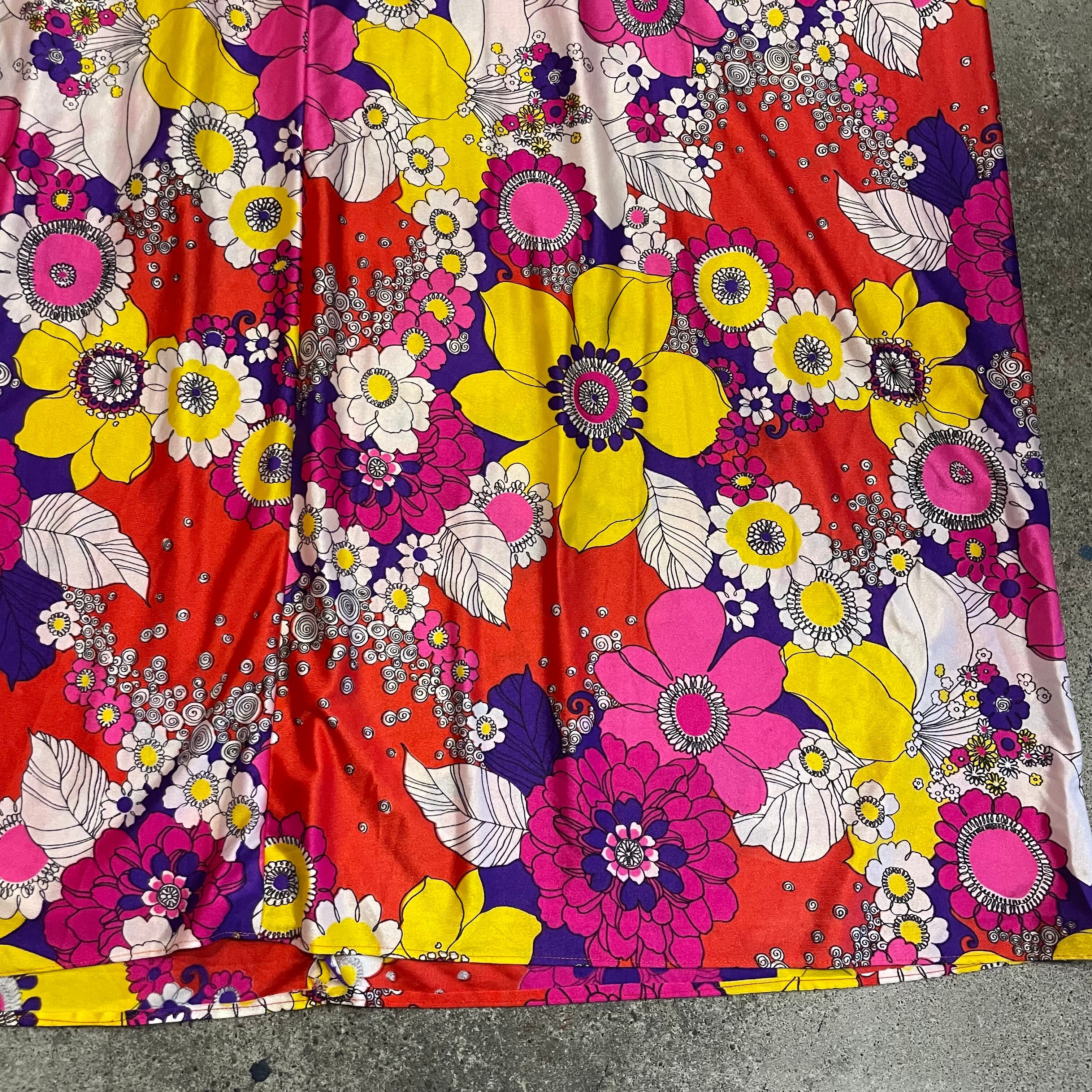 とっても華やかな花柄がかわいいワンピースです。つるんとしたやや光沢のある生地で眩しいほどの華やかさです。
