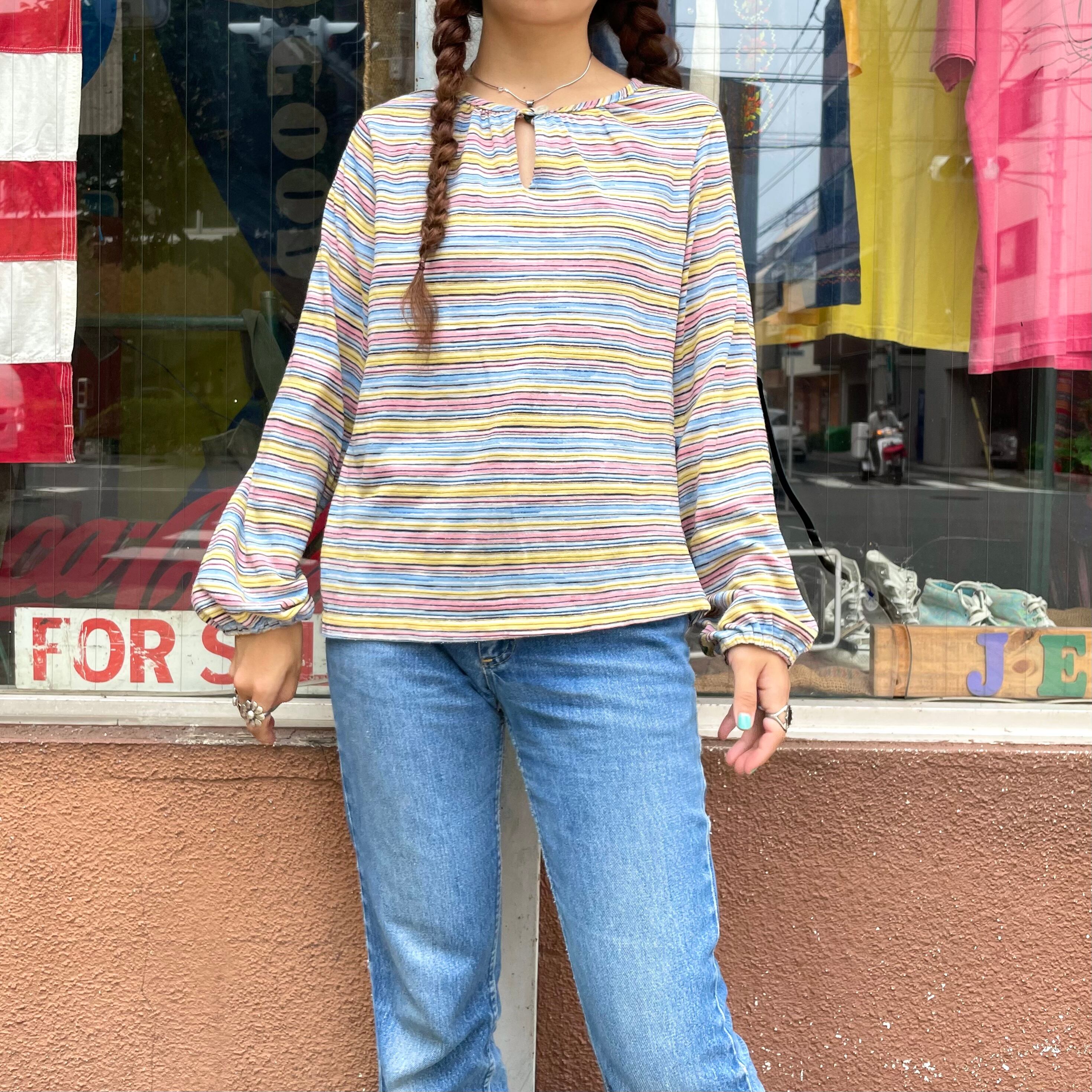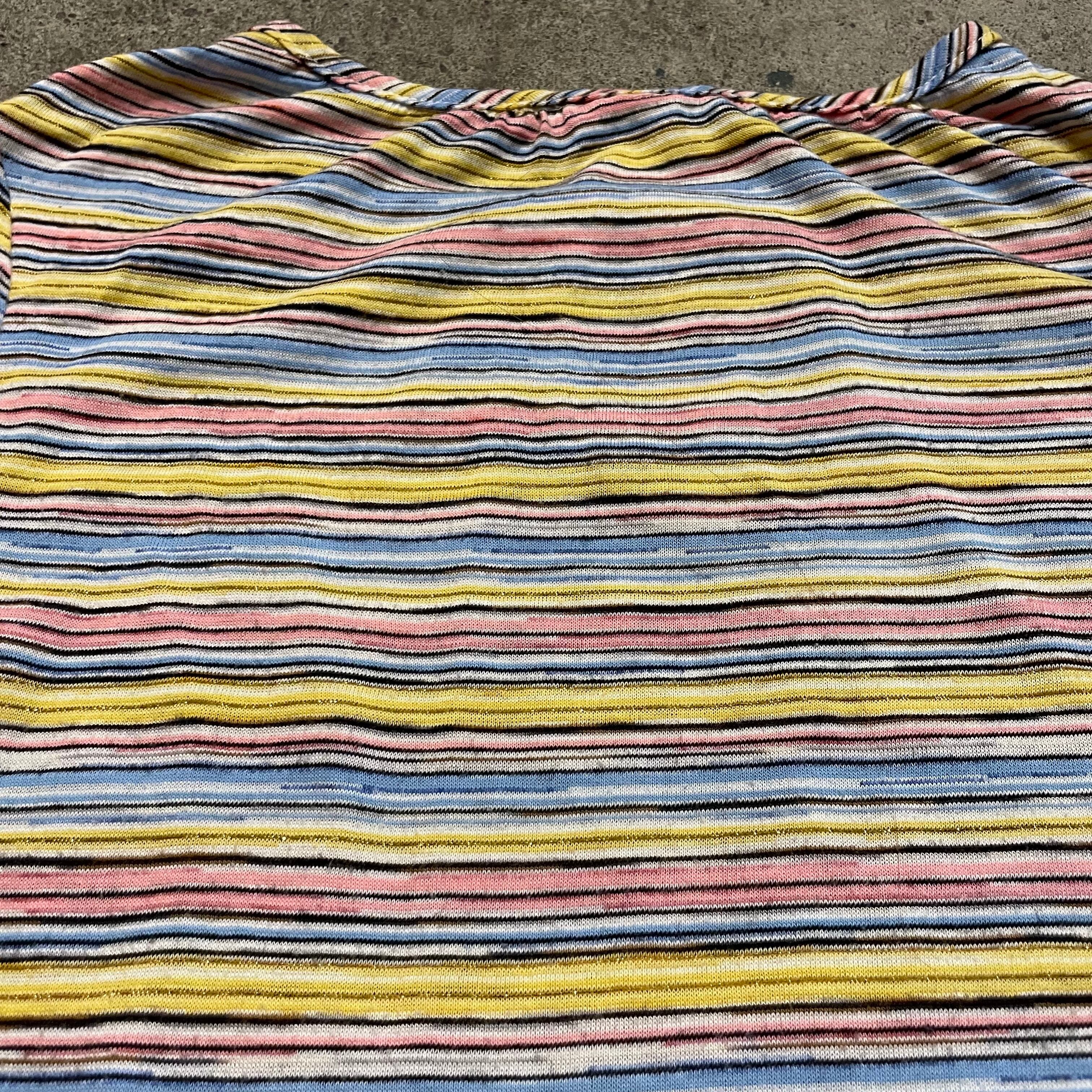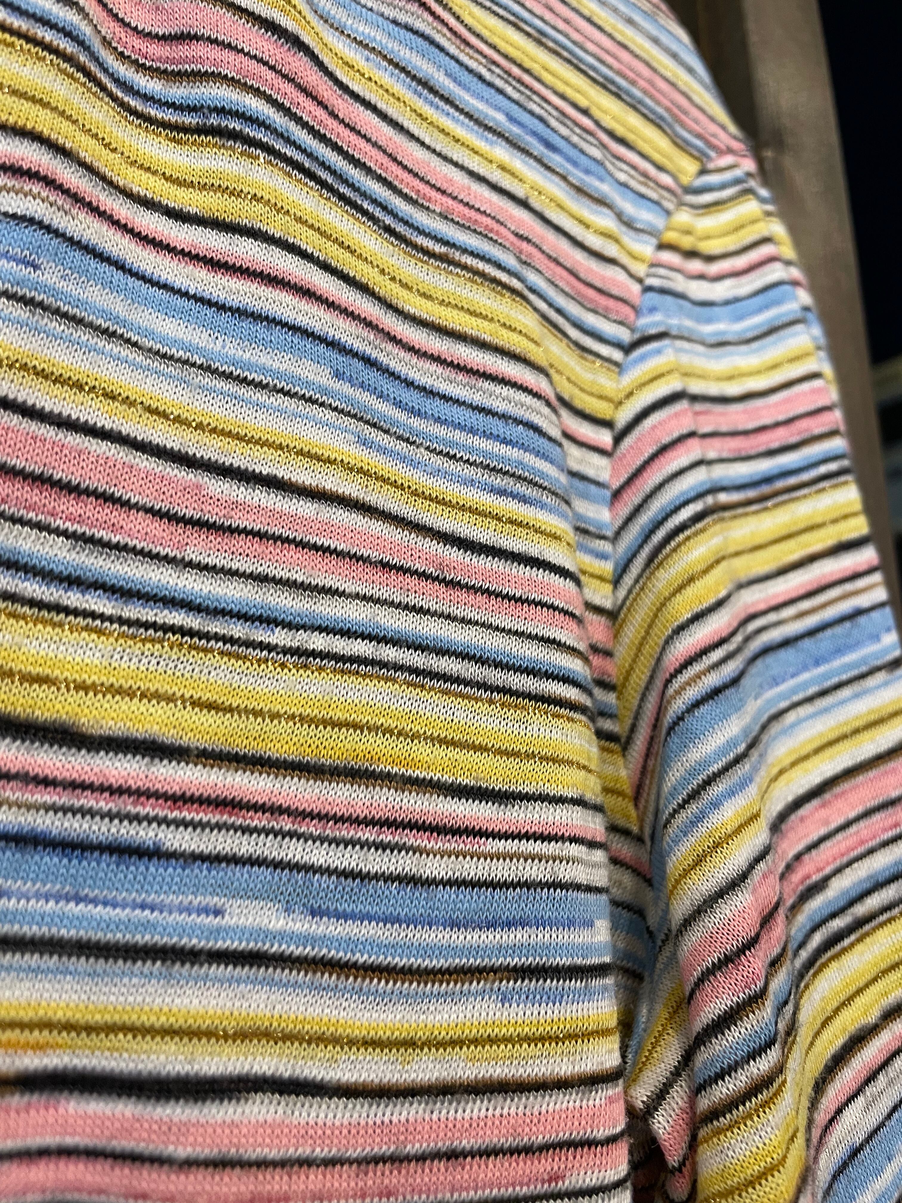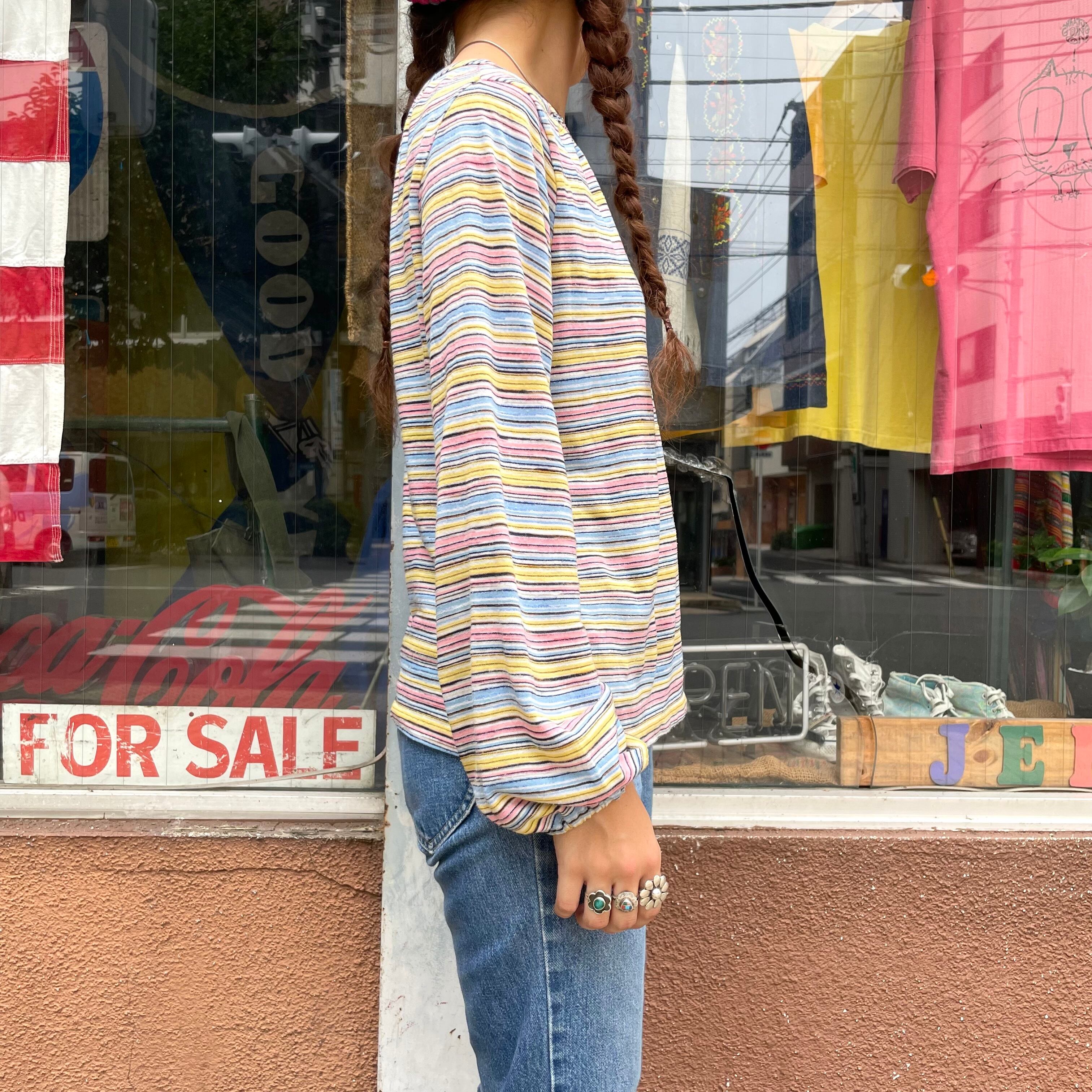 ボーダーとラメ糸がキラッとかわいいトップスです。淡めでポップなカラーリングが良い感じです。