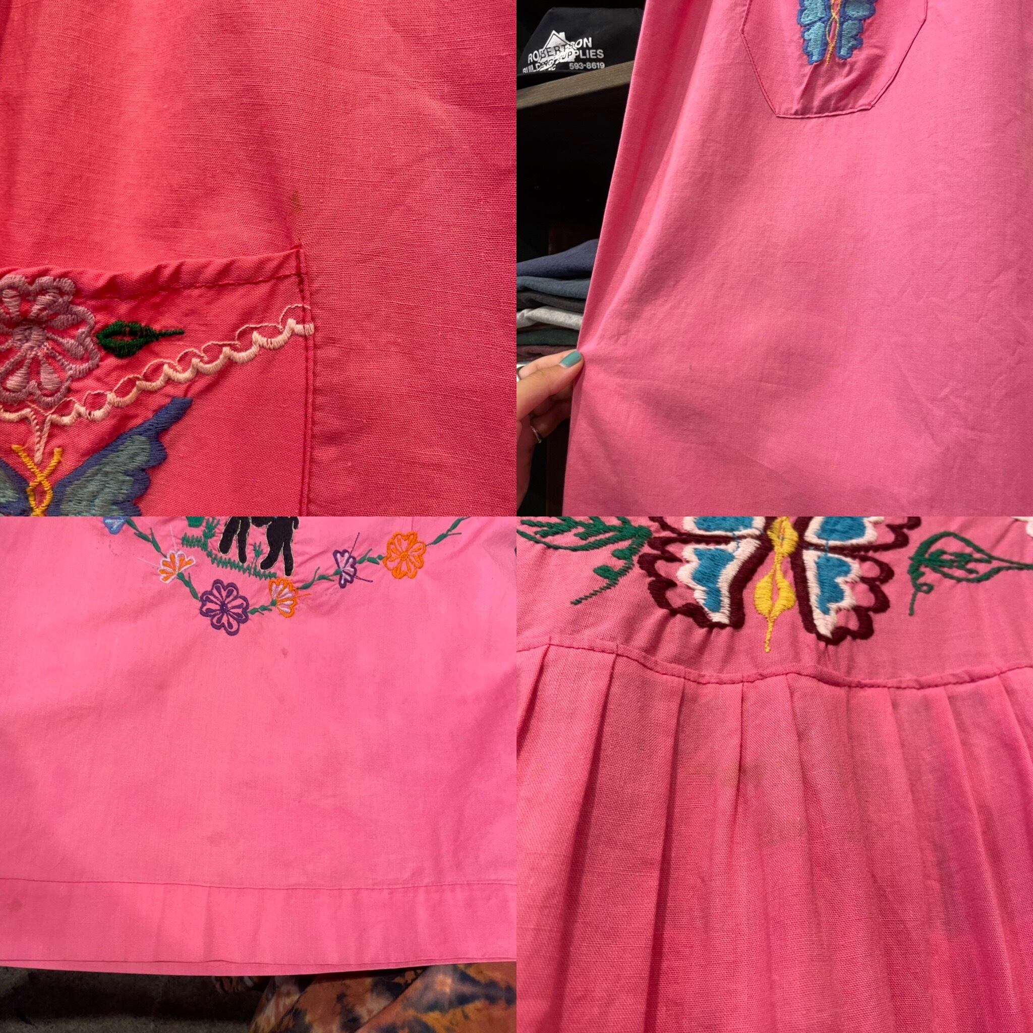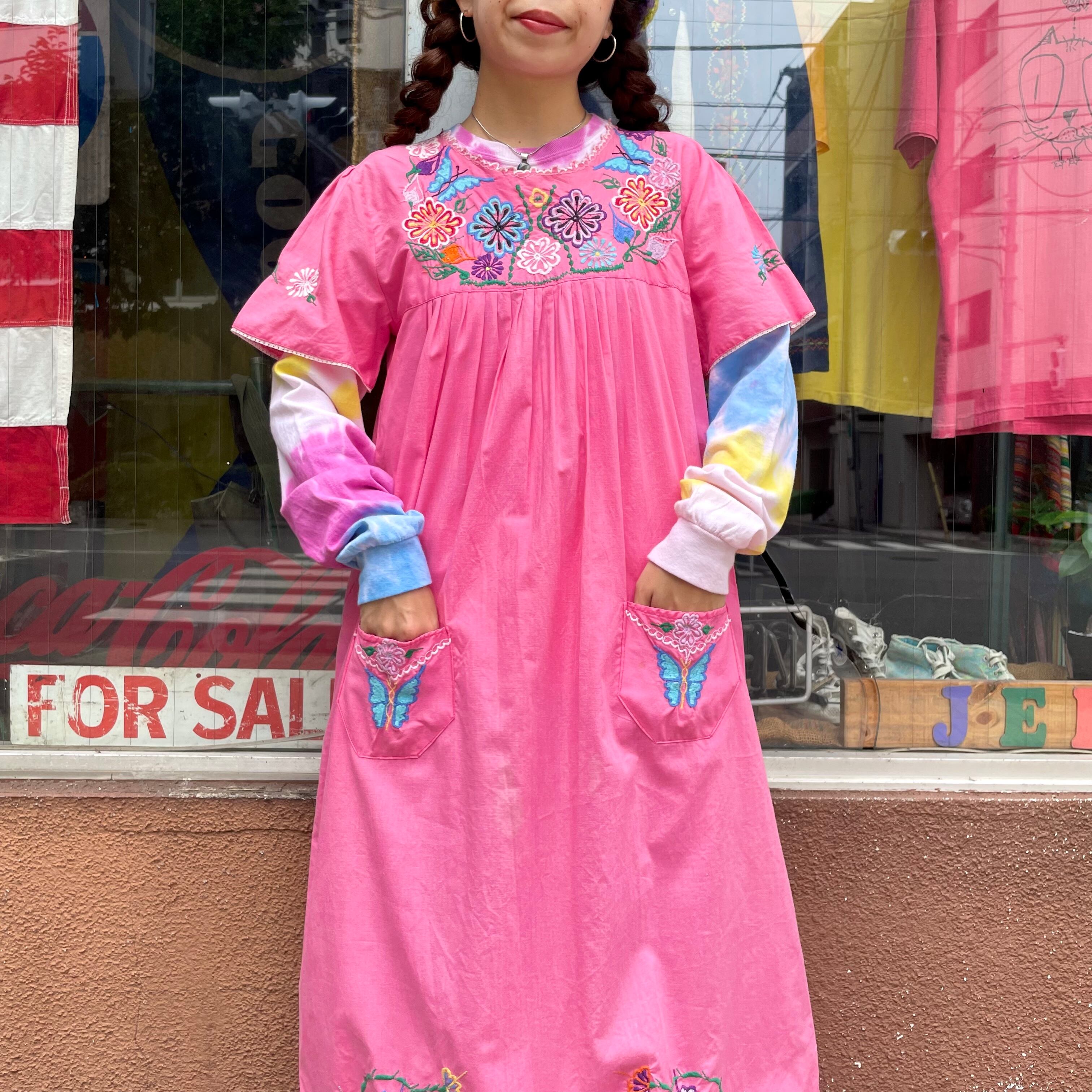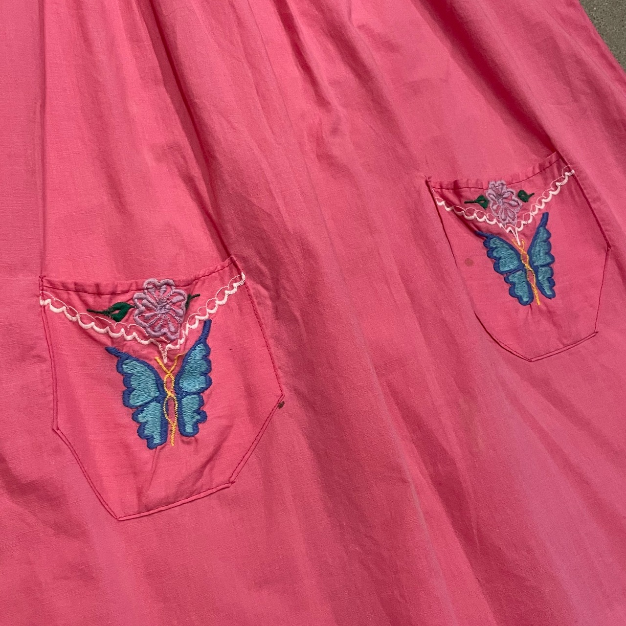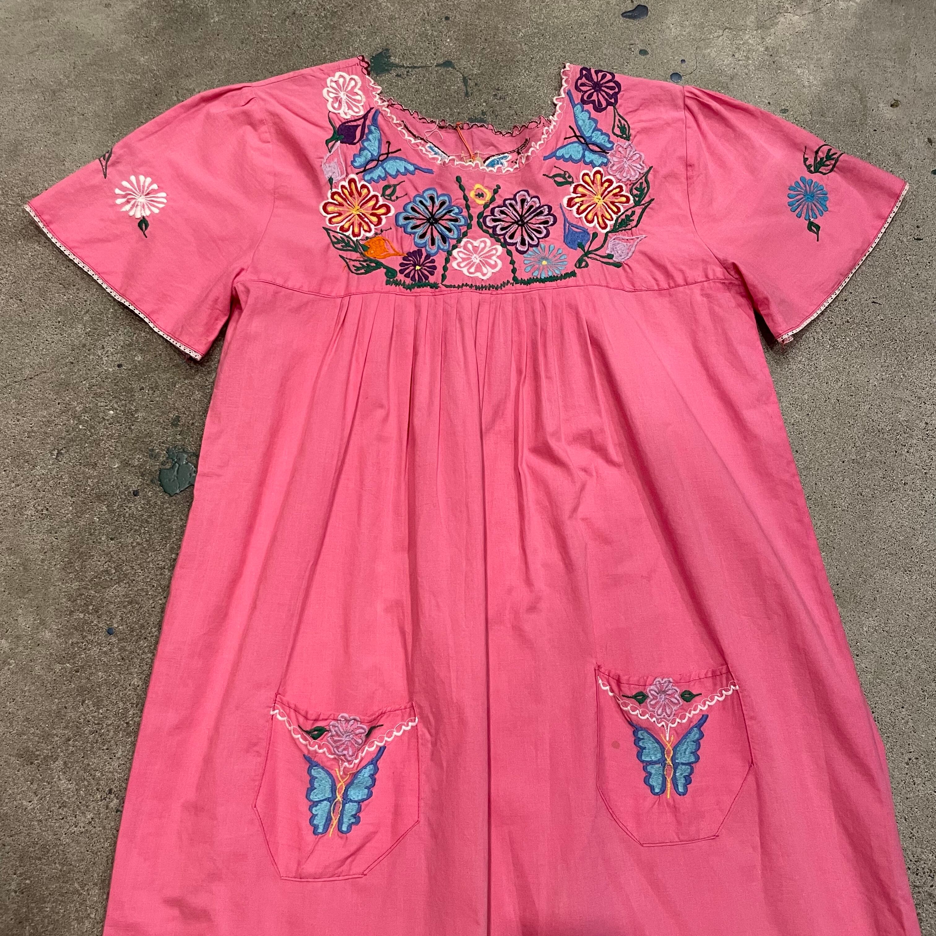 ピンク地にお花と蝶々の刺繍がハッピーでとてもかわいいワンピースです。