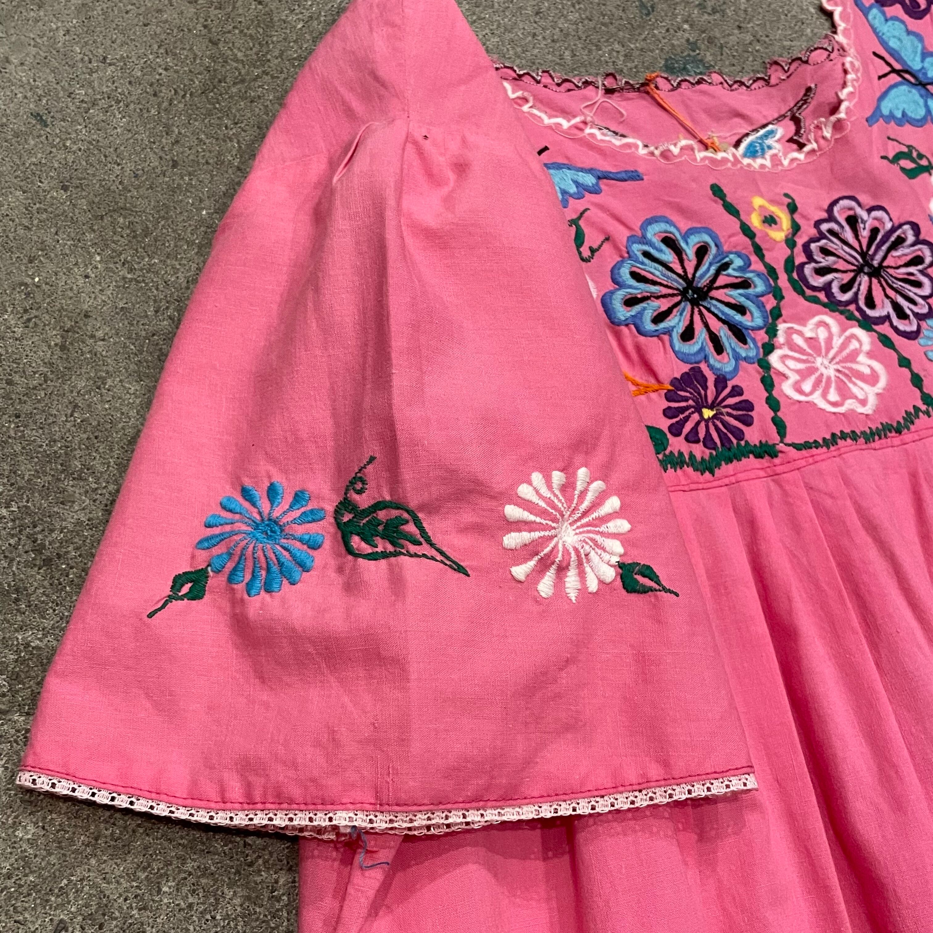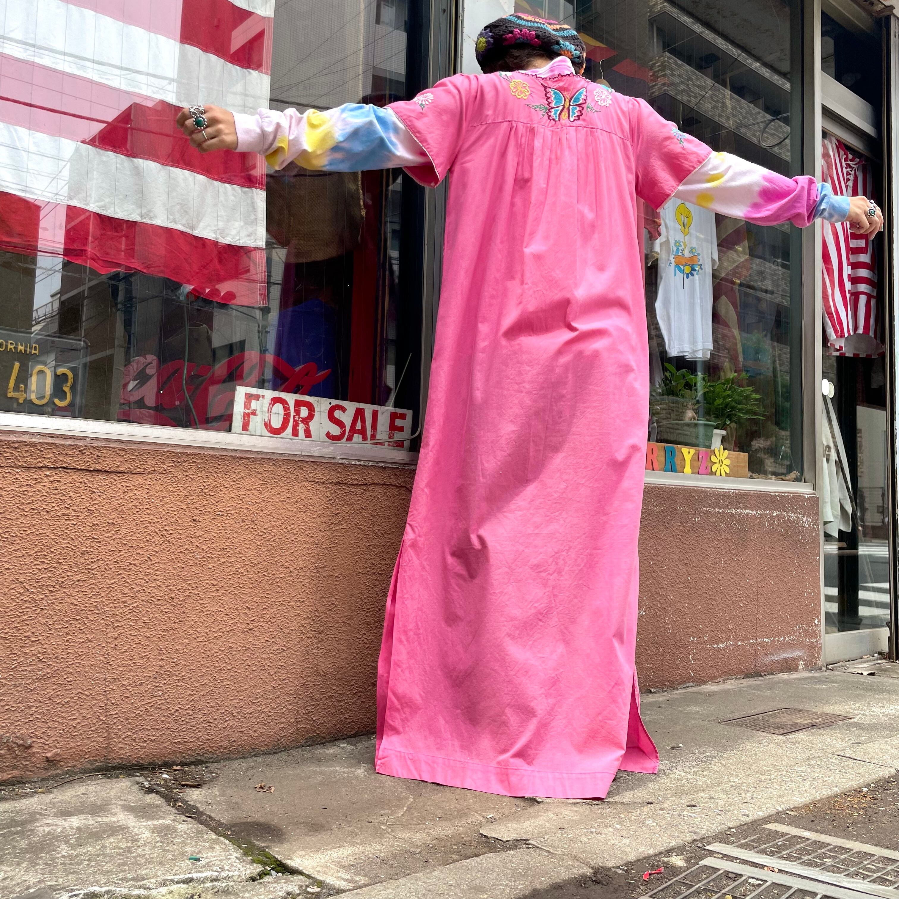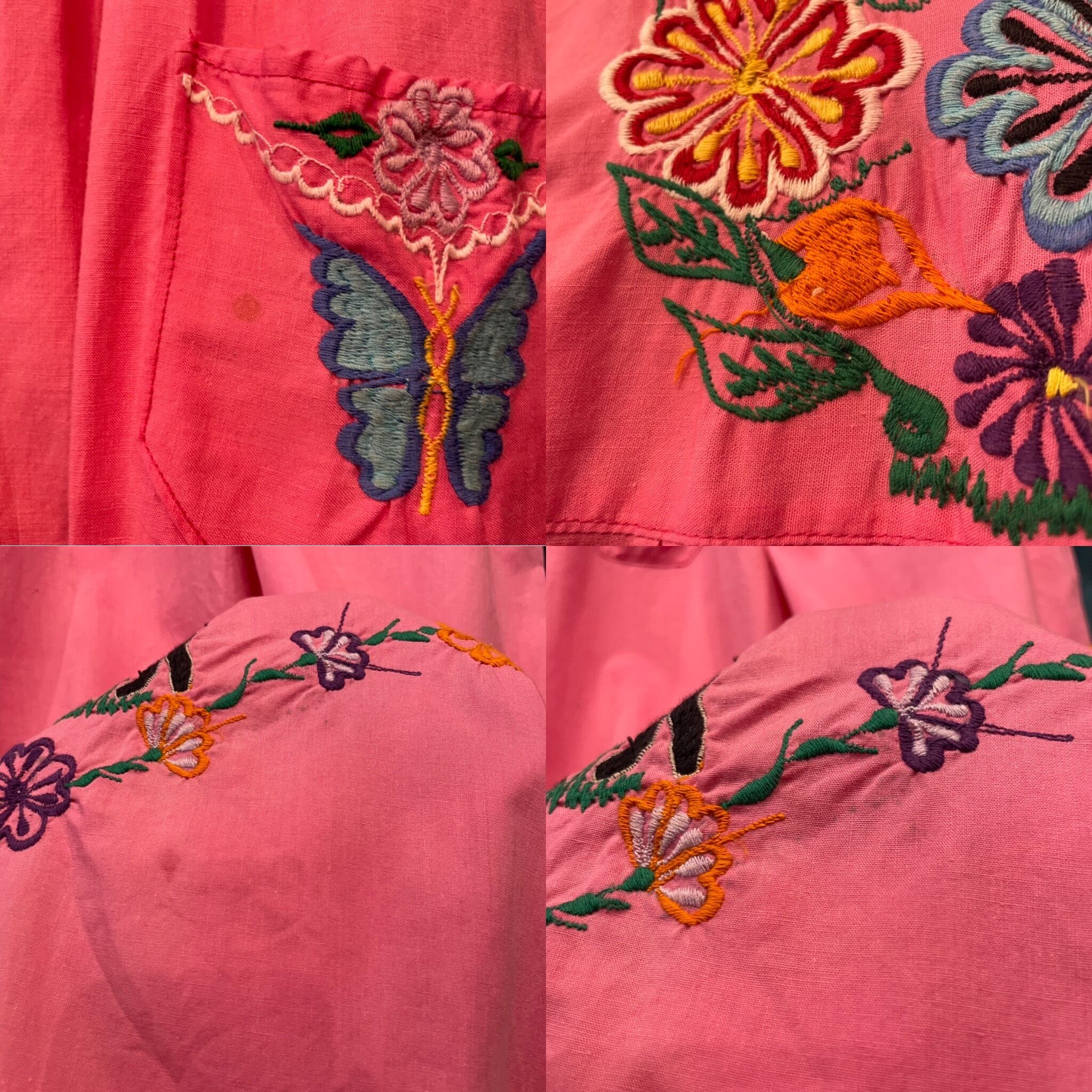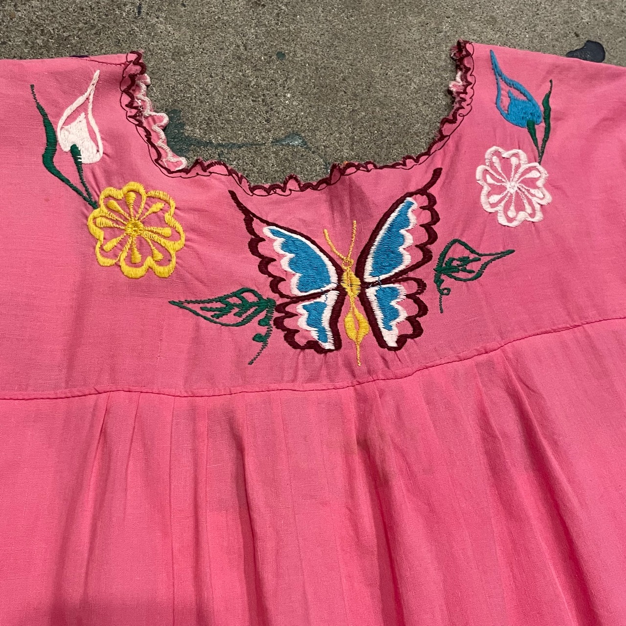 ピンク地にお花と蝶々の刺繍がハッピーでとてもかわいいワンピースです。