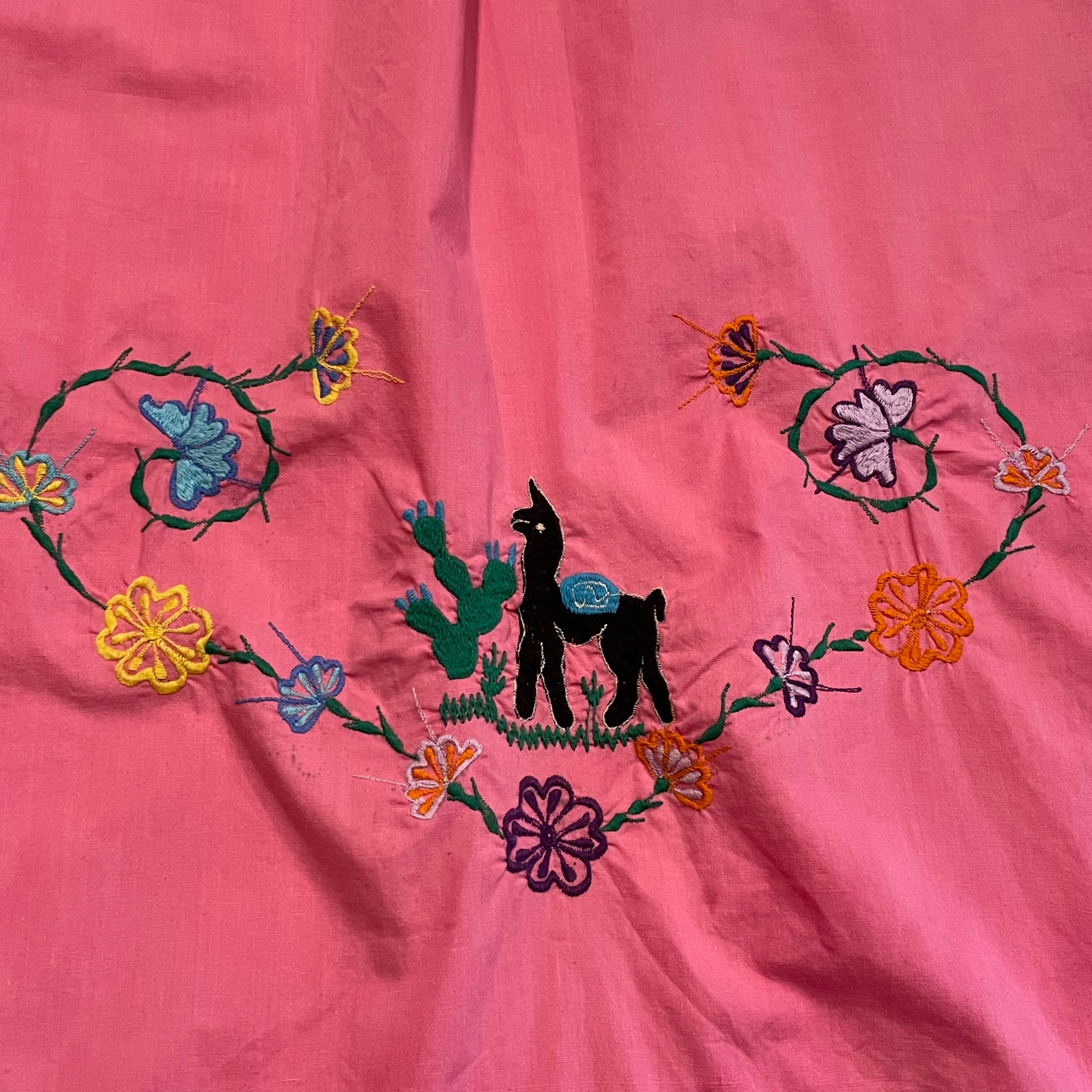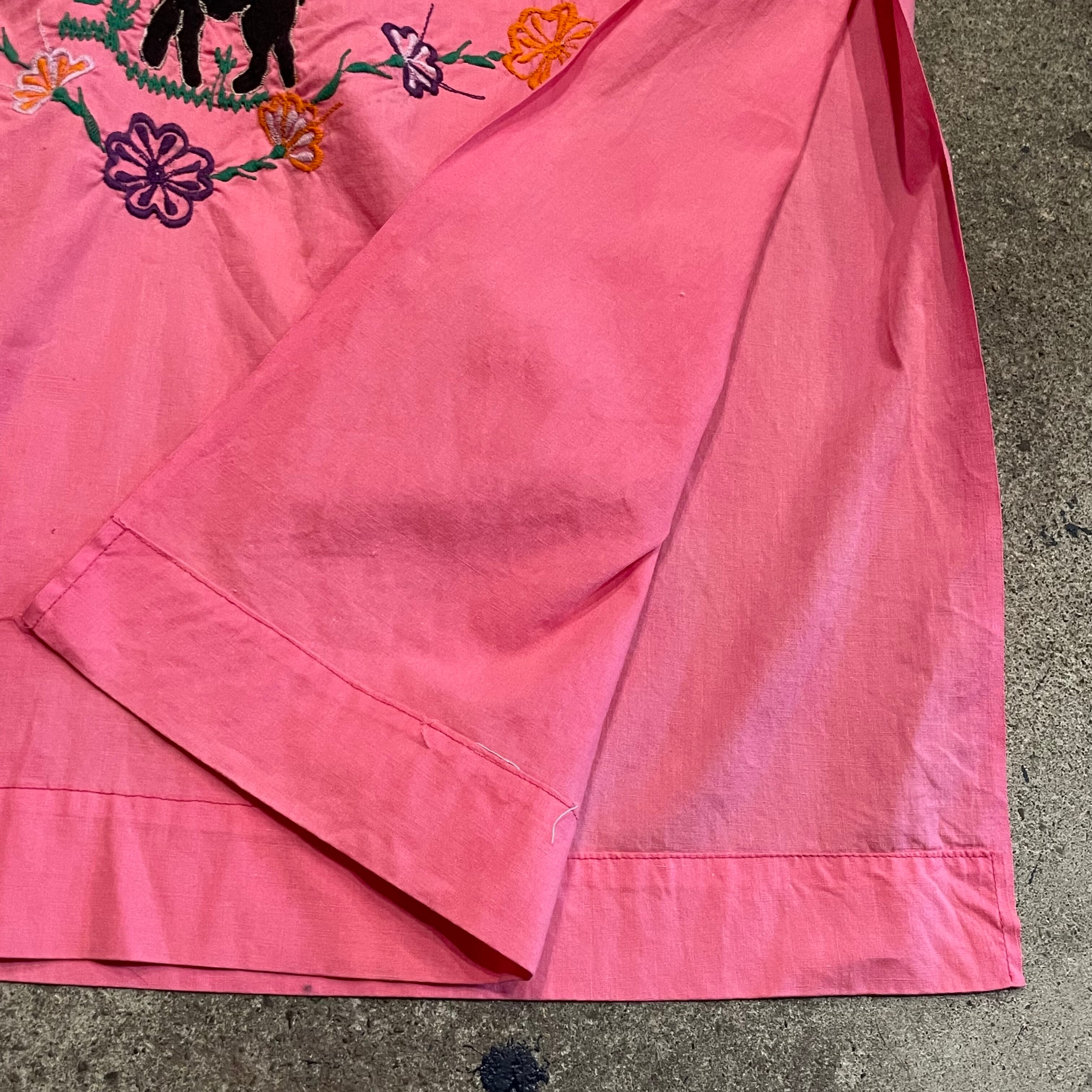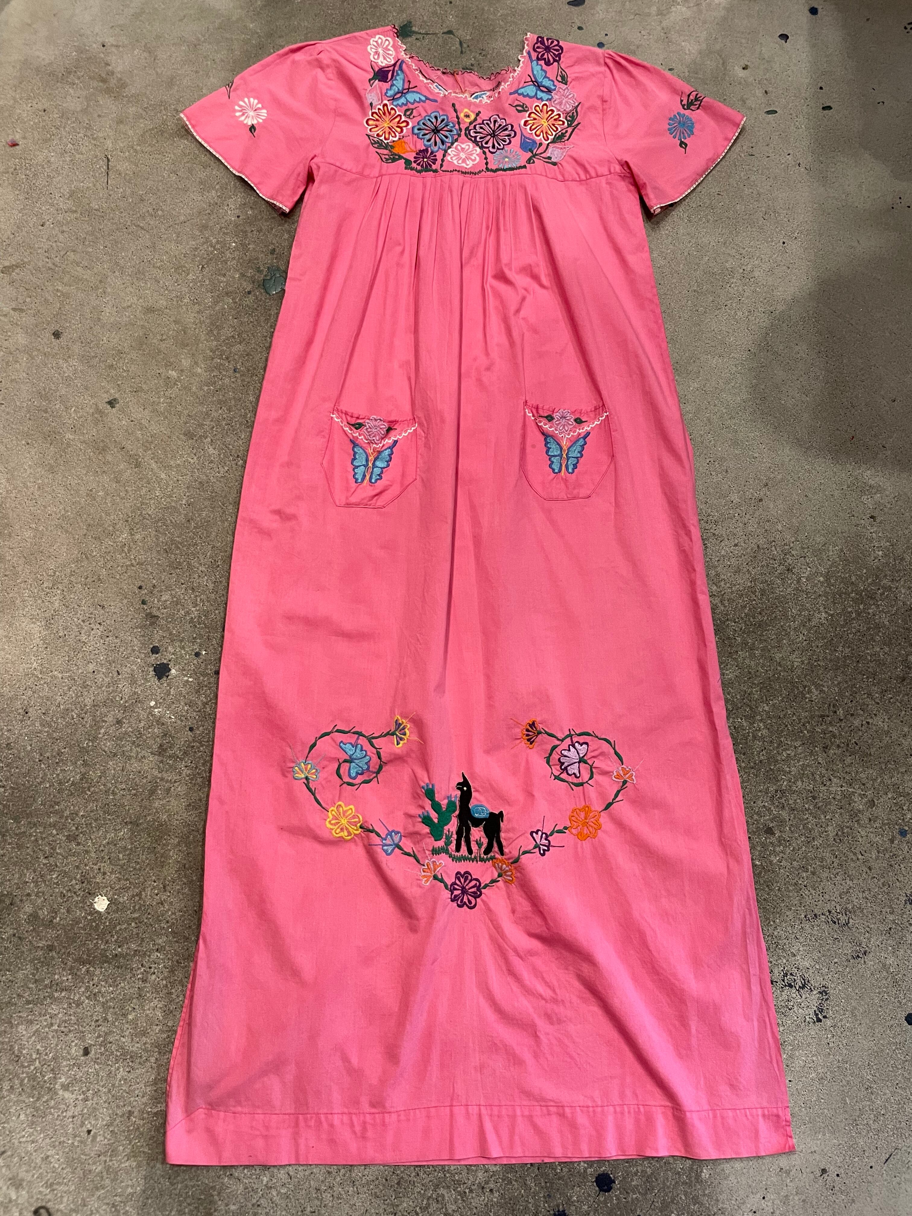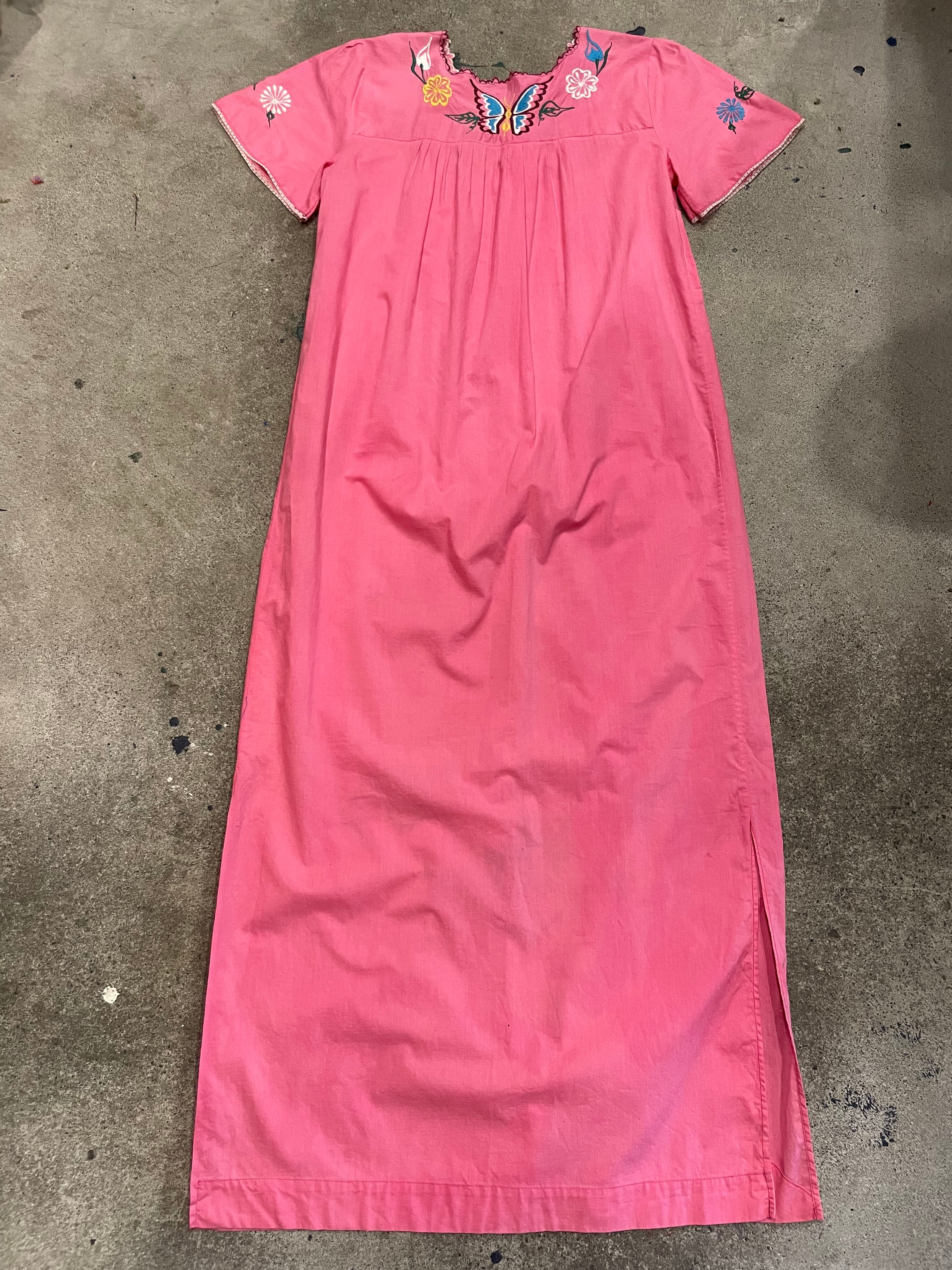 ピンク地にお花と蝶々の刺繍がハッピーでとてもかわいいワンピースです。