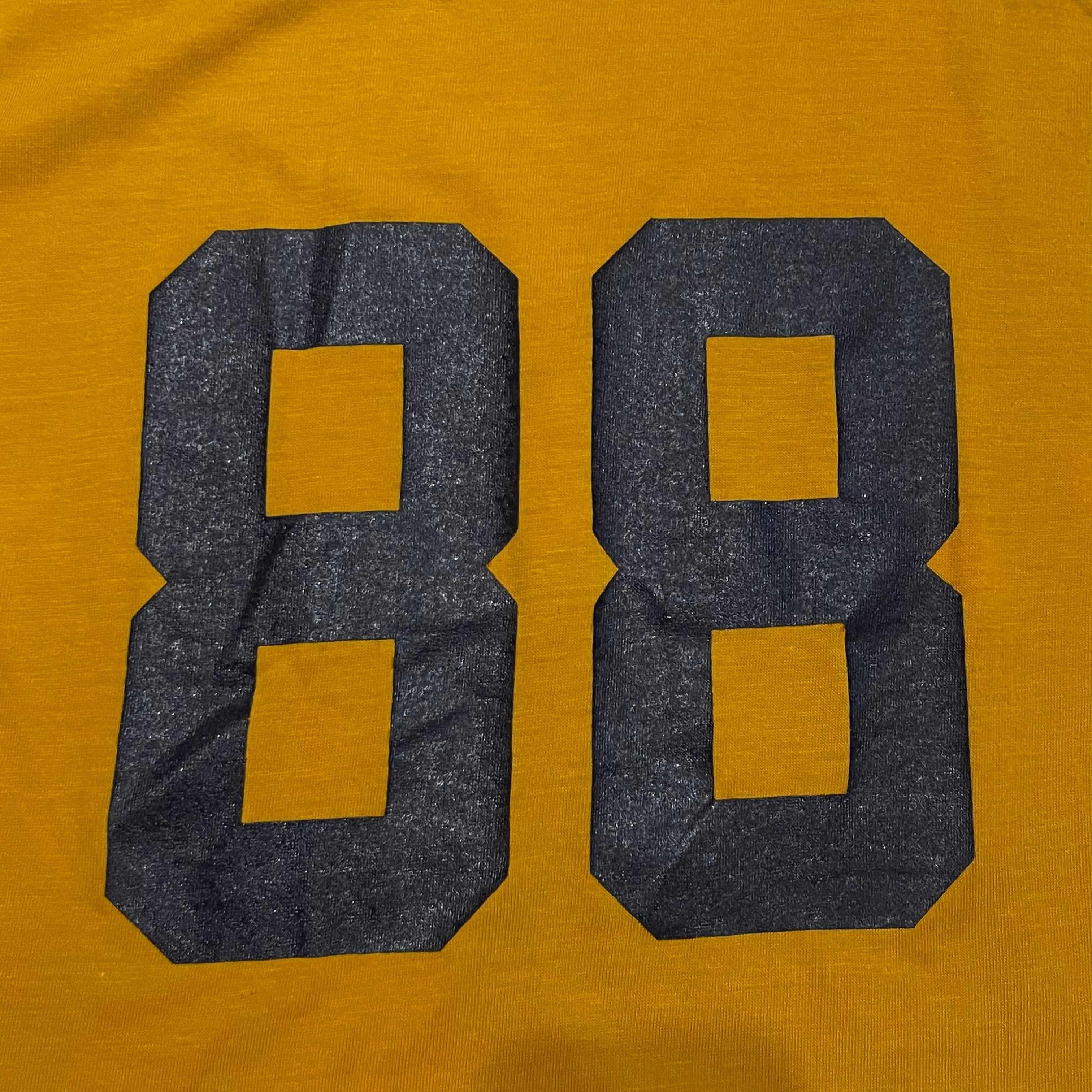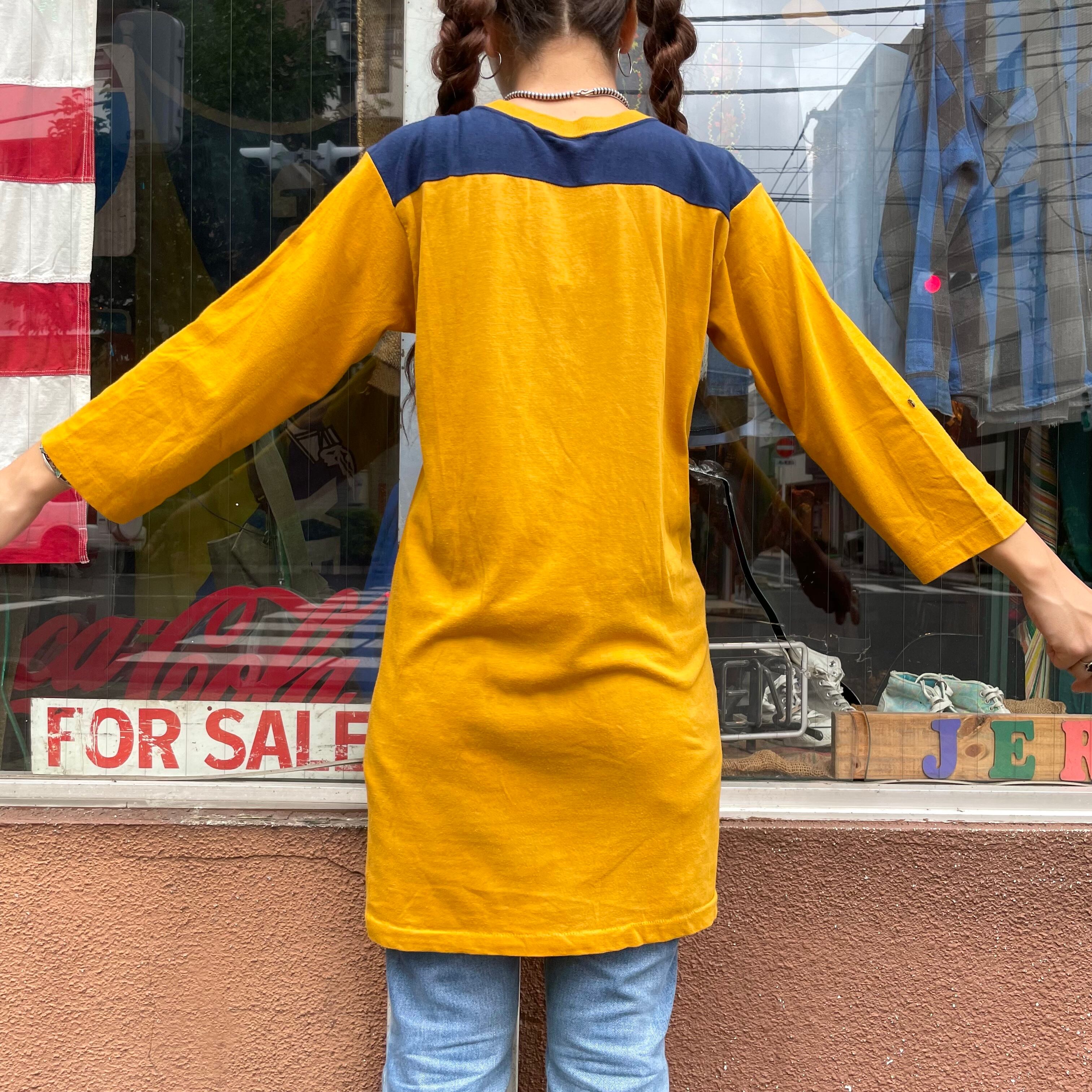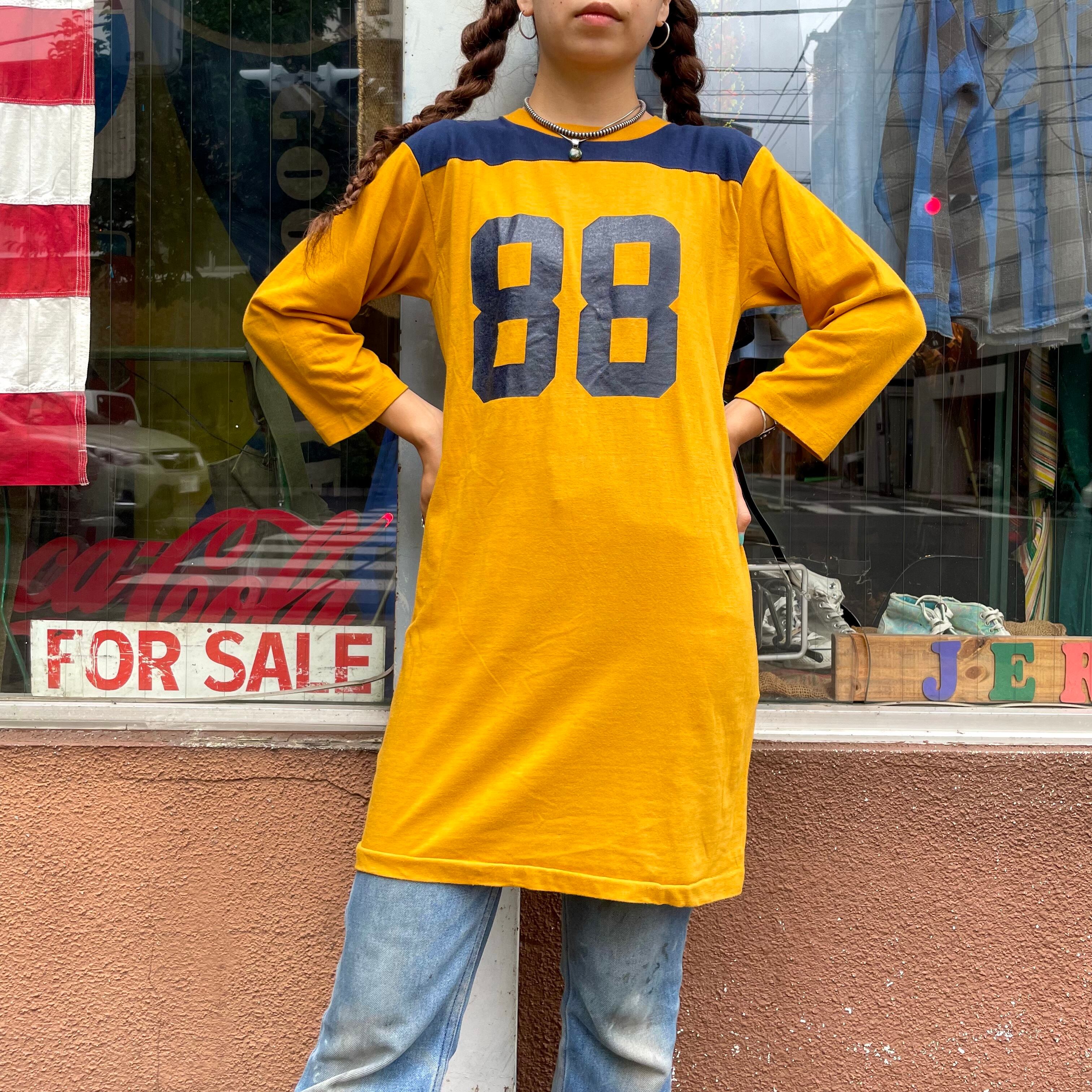 マスタードカラーにネイビーの88番が良い雰囲気ですし、細長いシルエットもかわいい一枚です。
