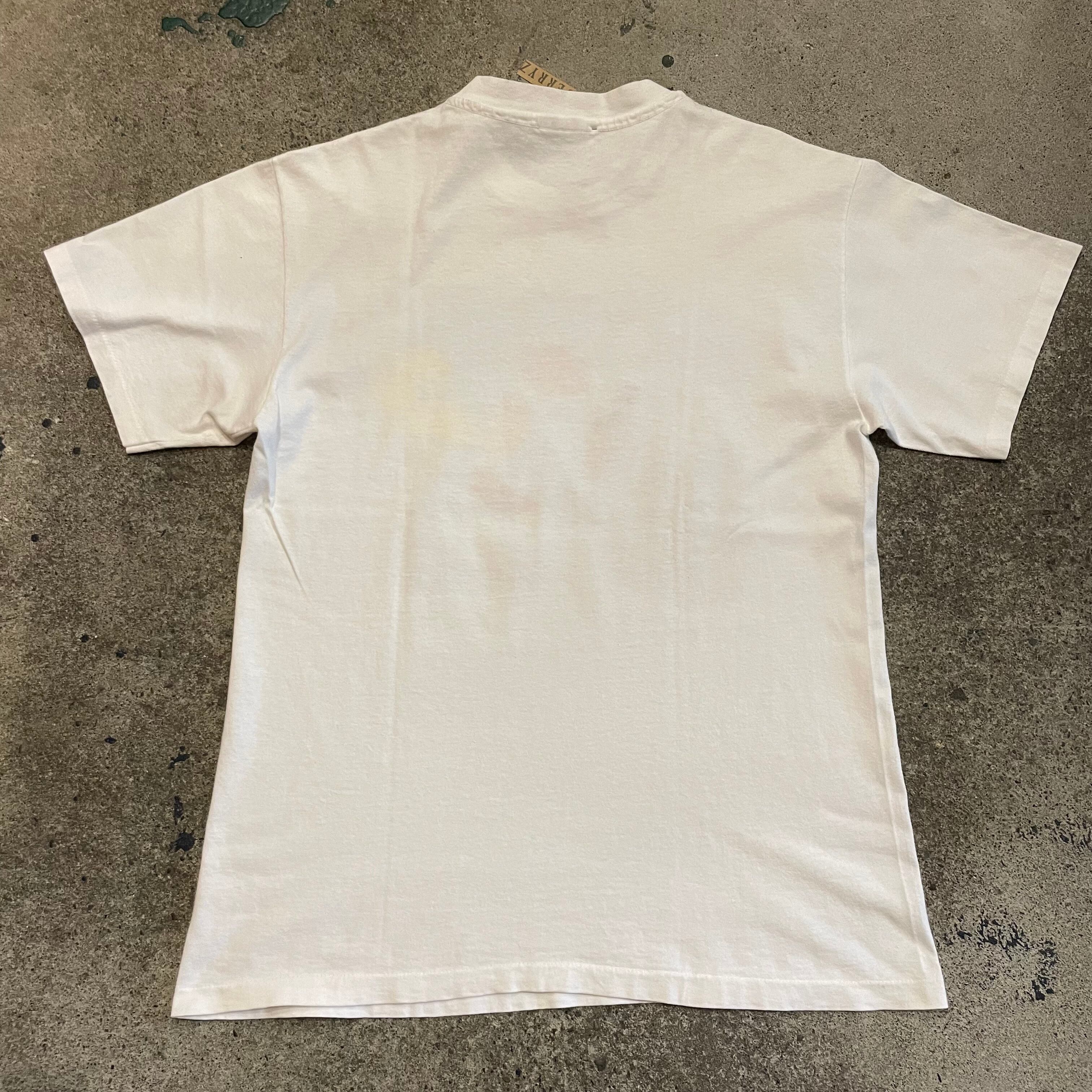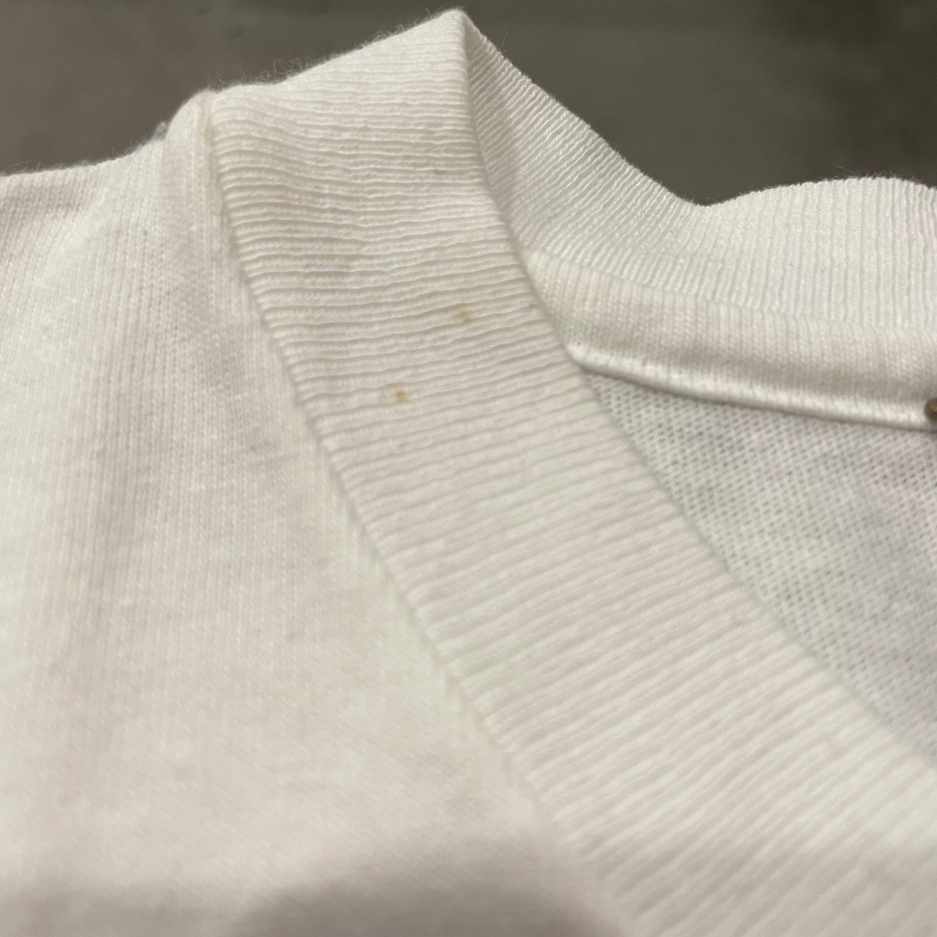 襟ぐりにシミ、プリントのひび割れ等、全体的に使用感のある商品ですので古着にご理解のある方のご購入をお願い致します。