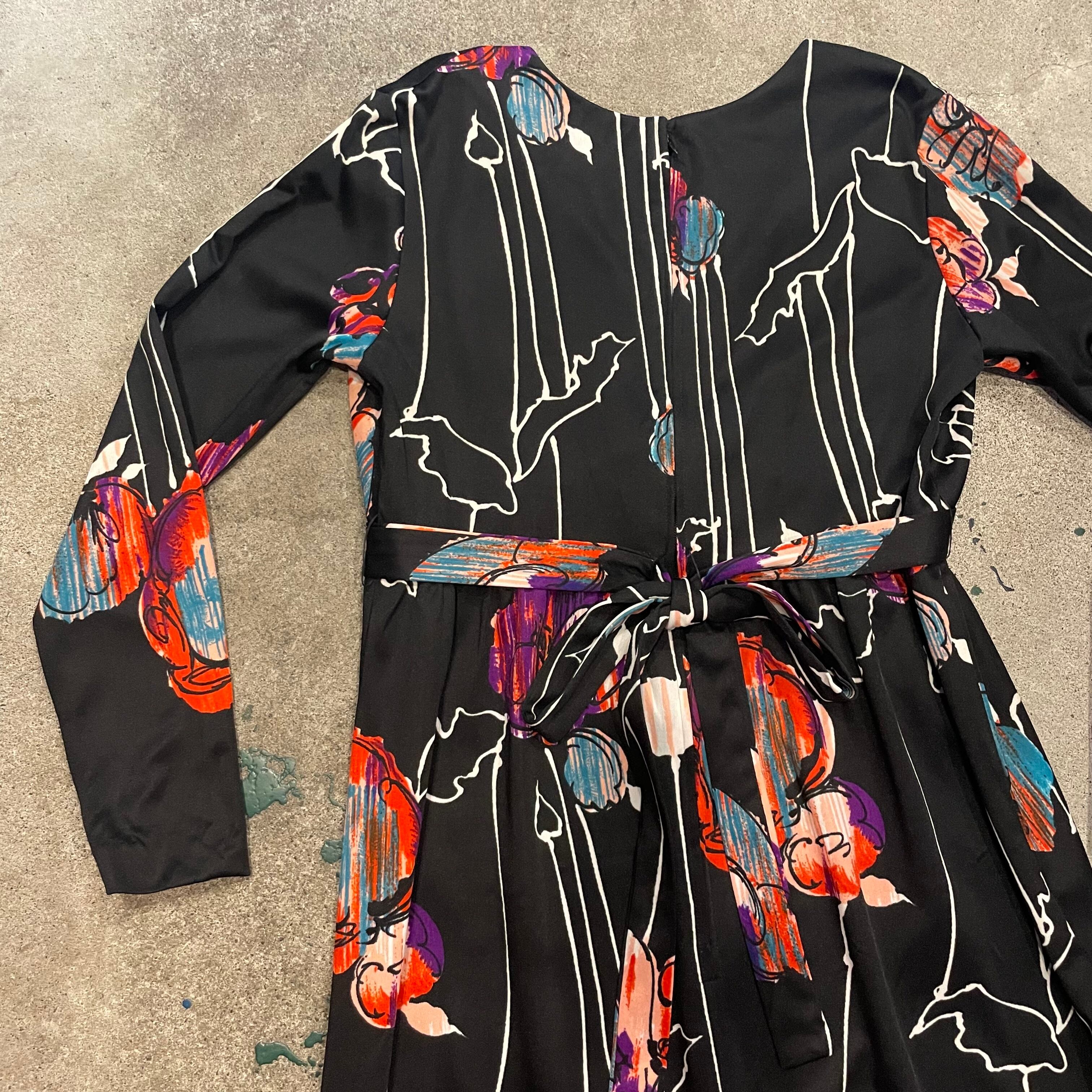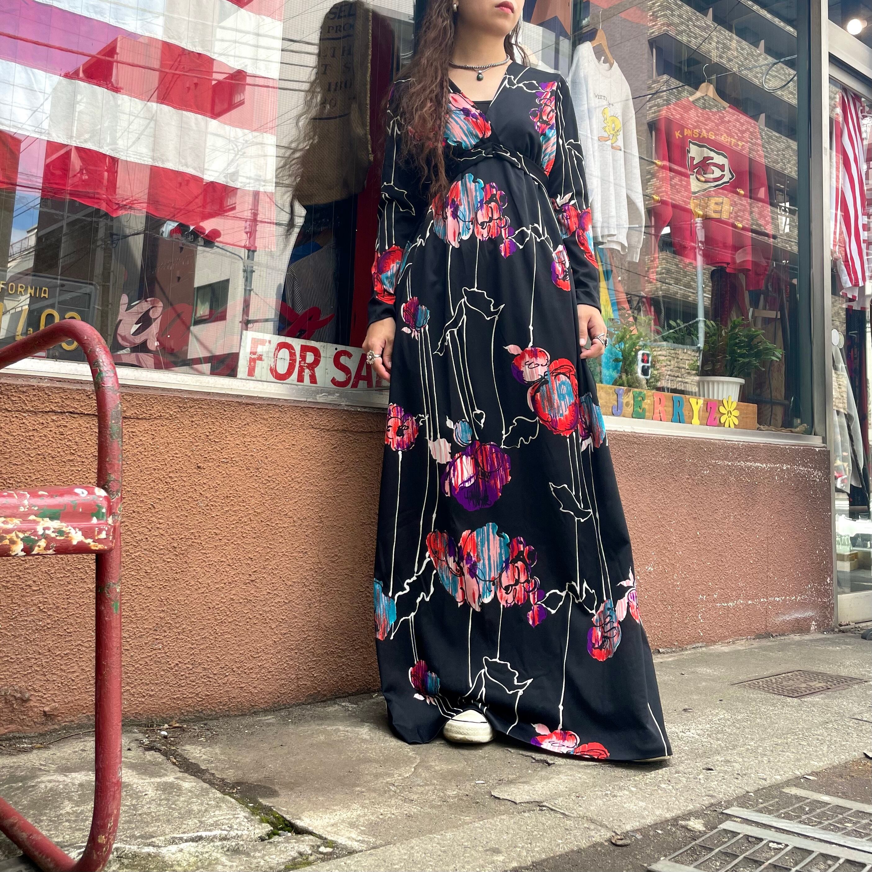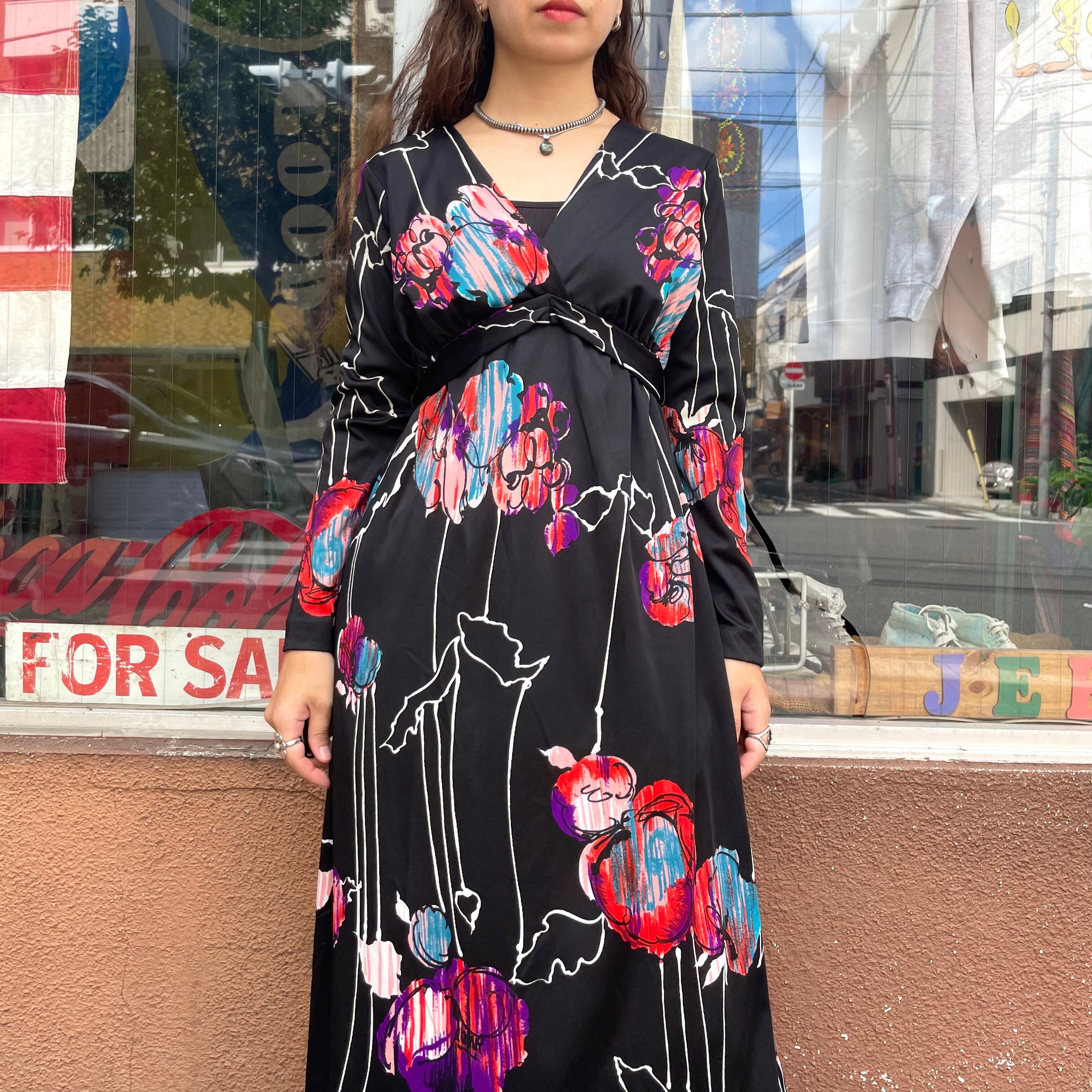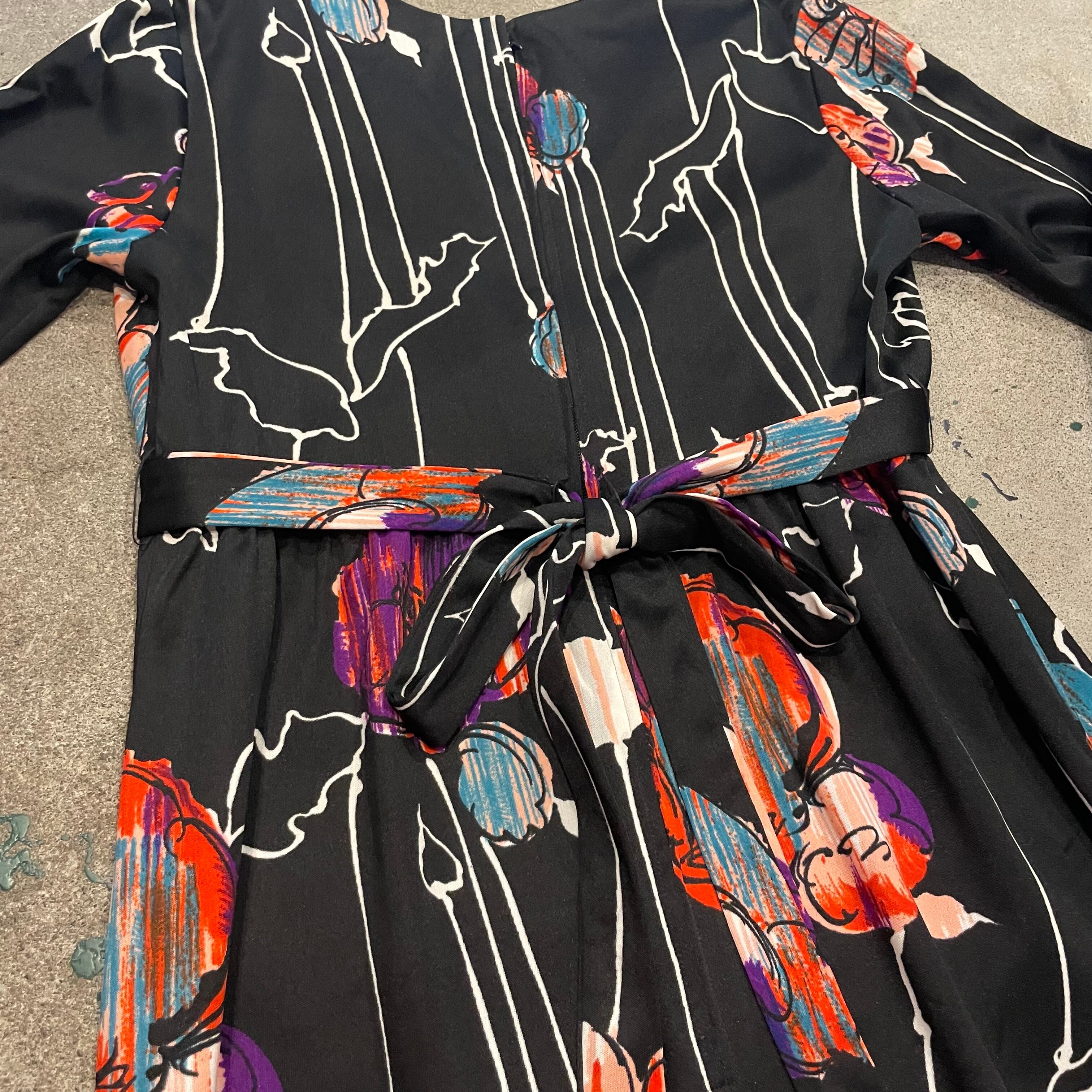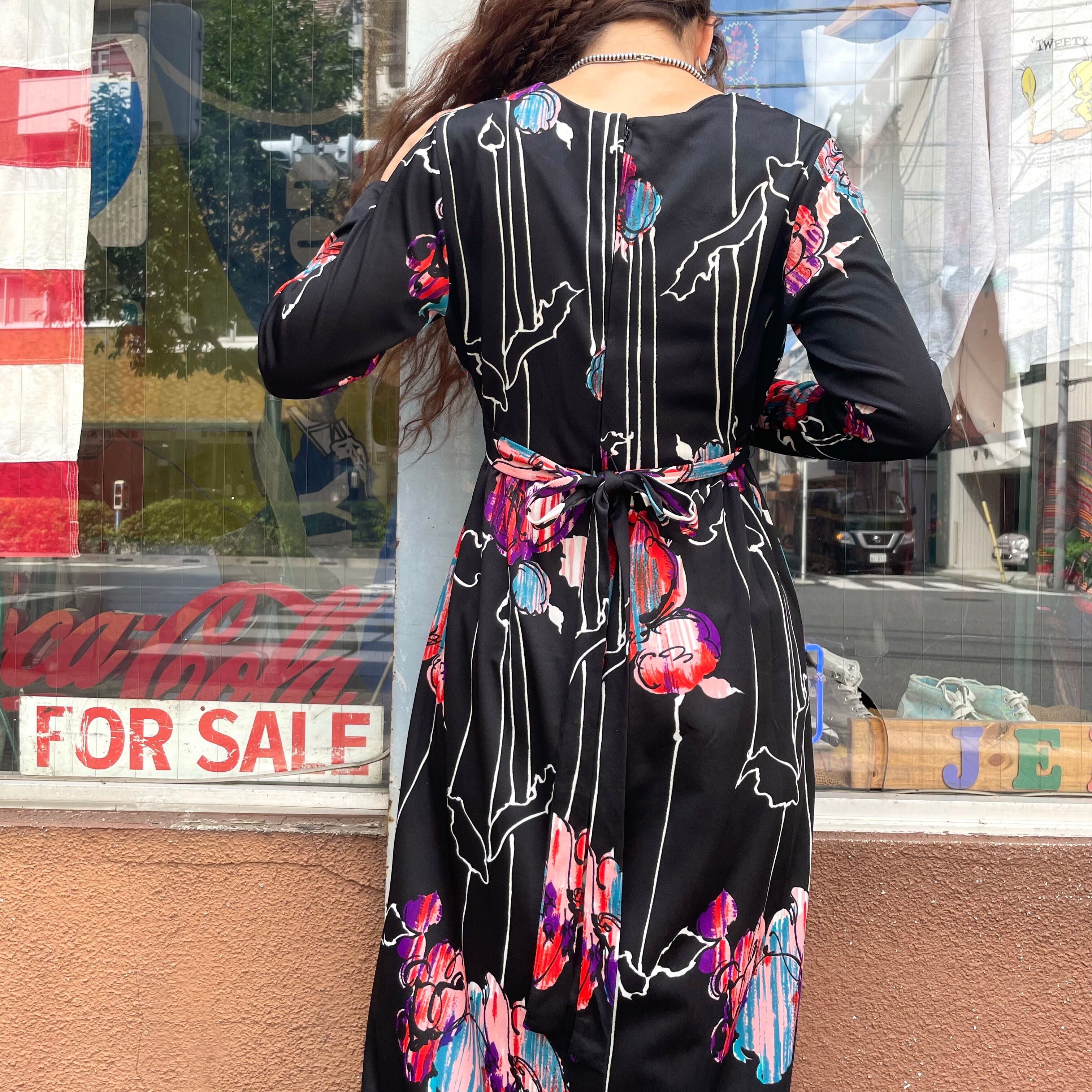 黒ベースにアートな色味のお花?柄がかっこいい70年代のワンピースです。