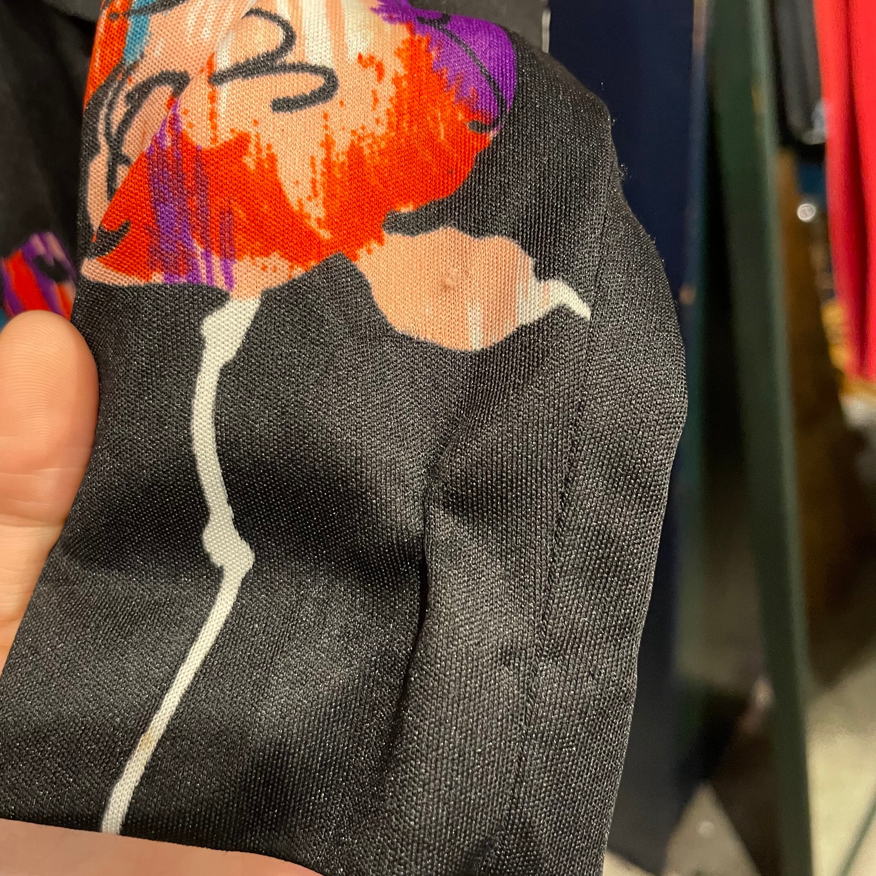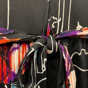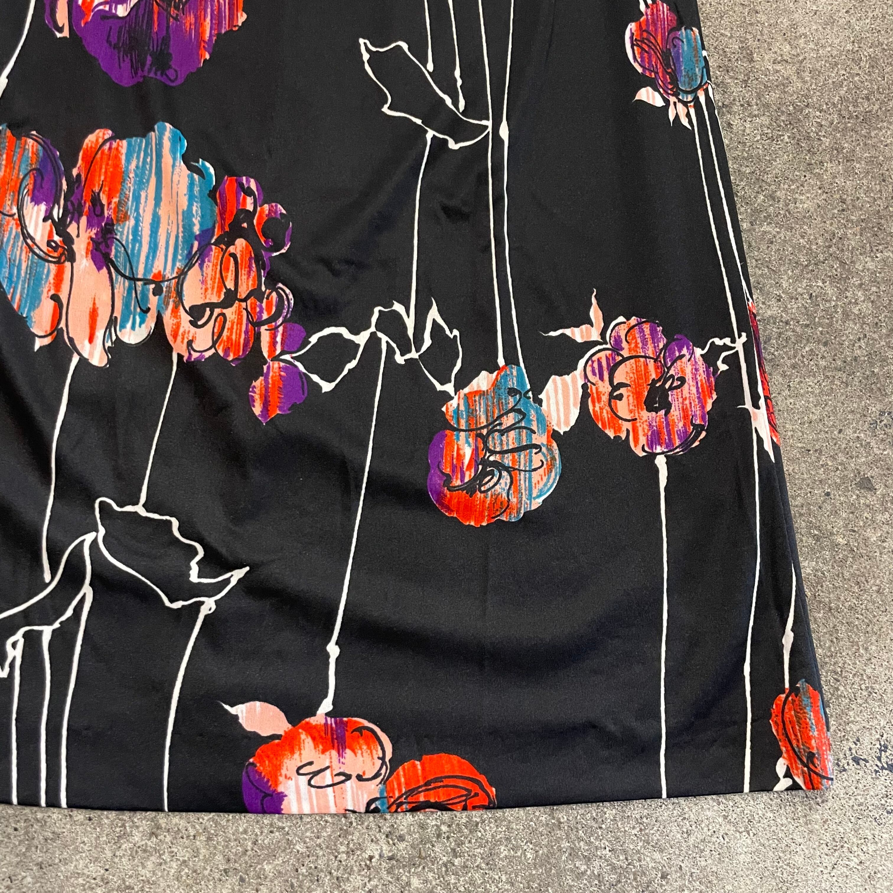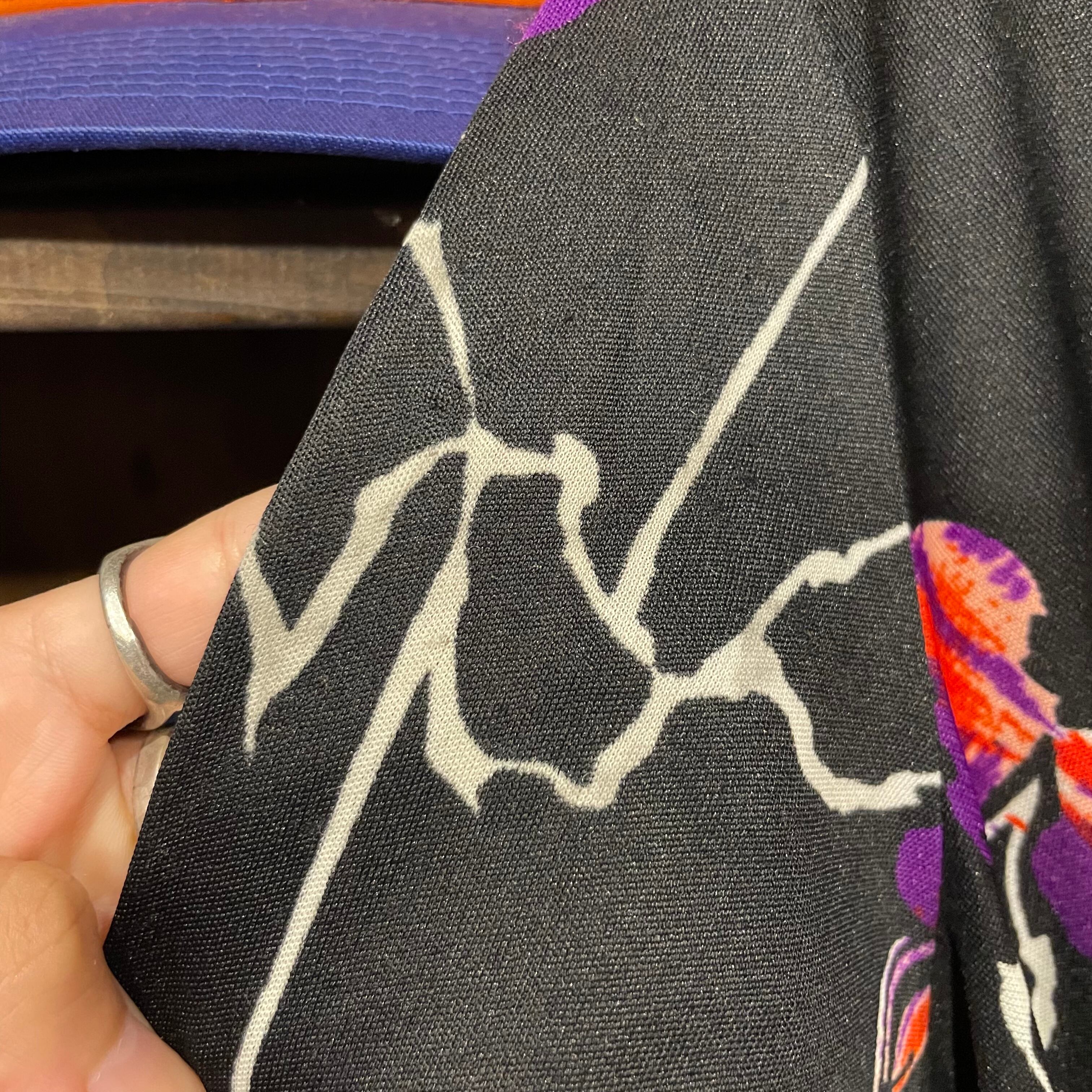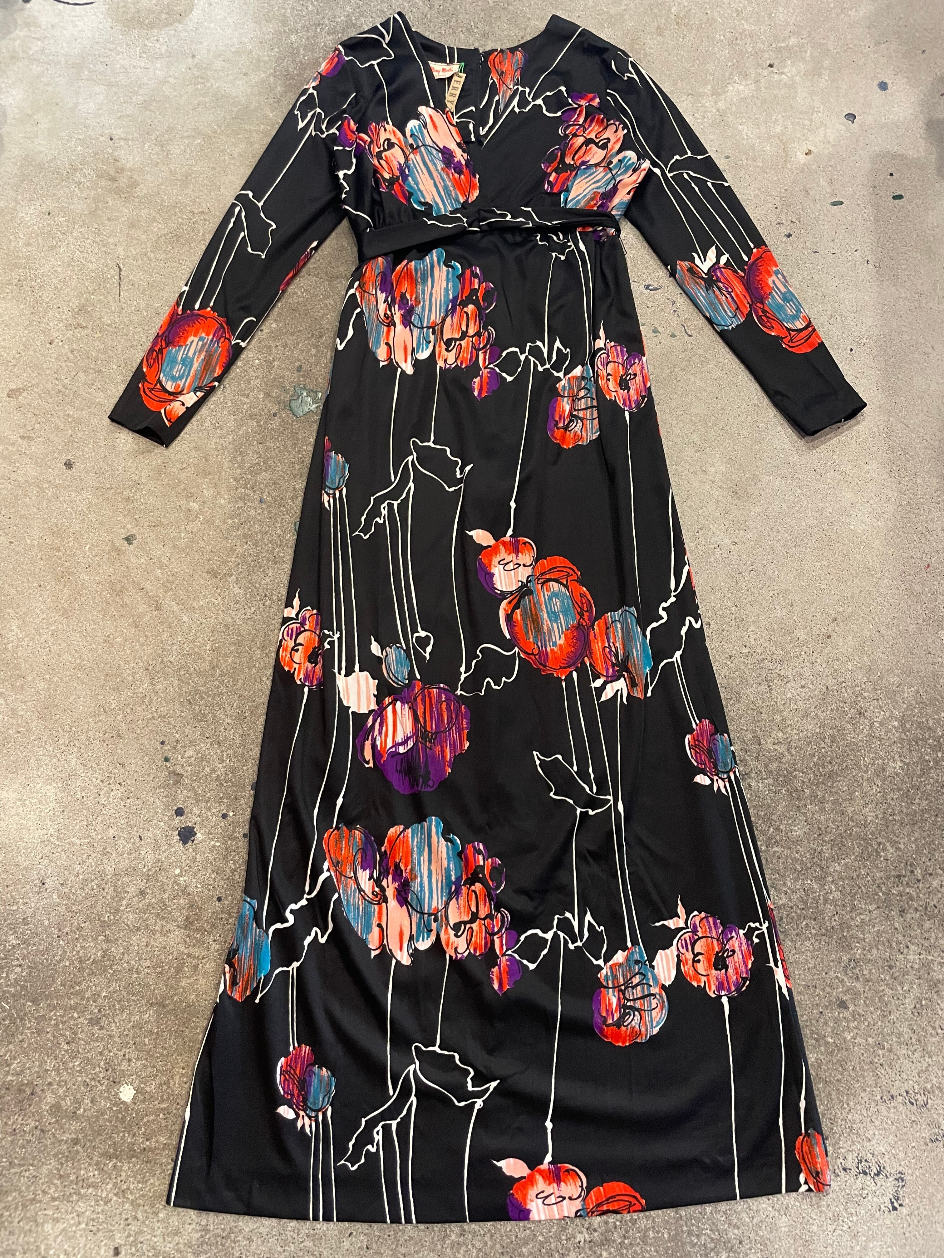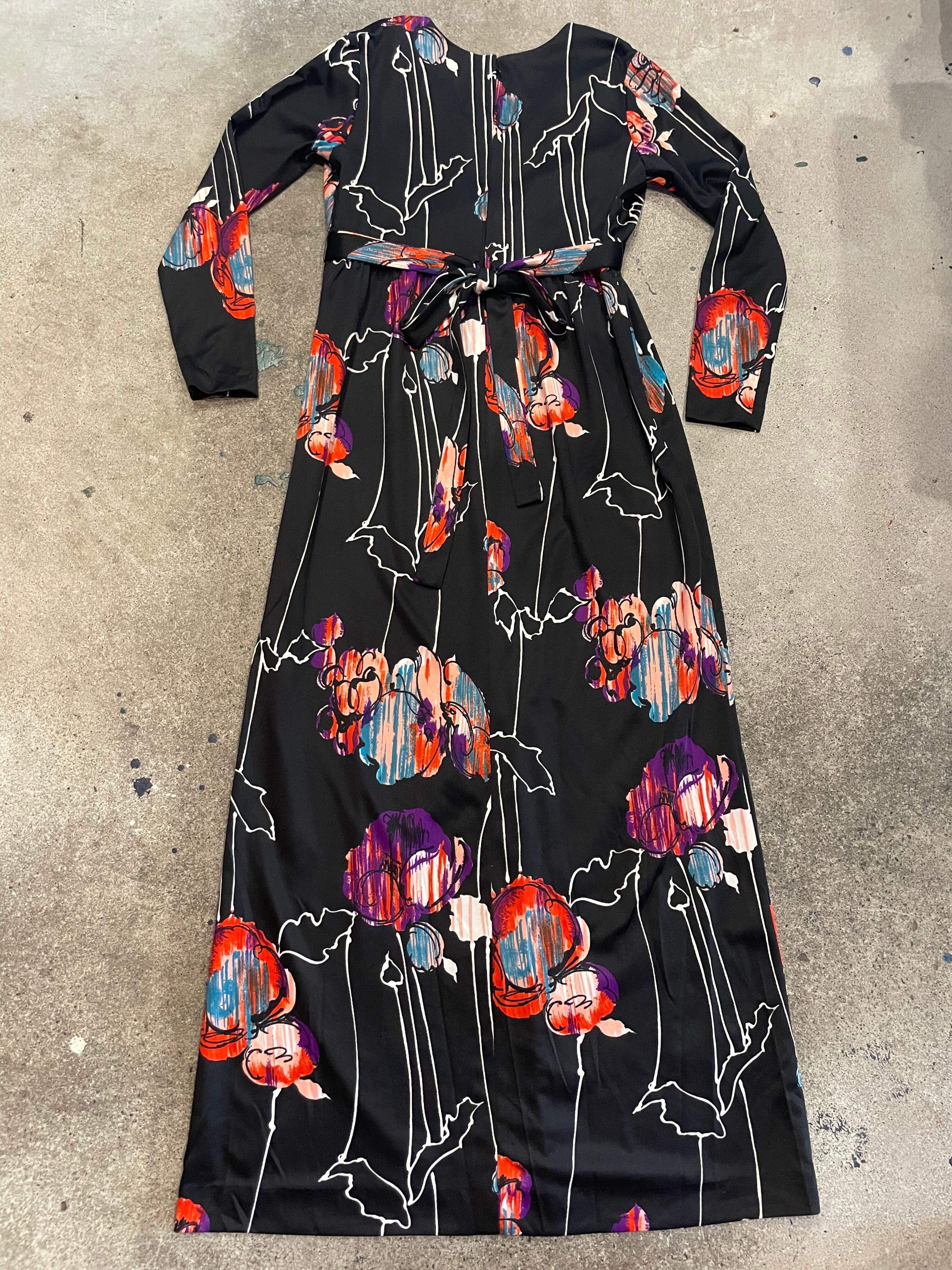 黒ベースにアートな色味のお花?柄がかっこいい70年代のワンピースです。