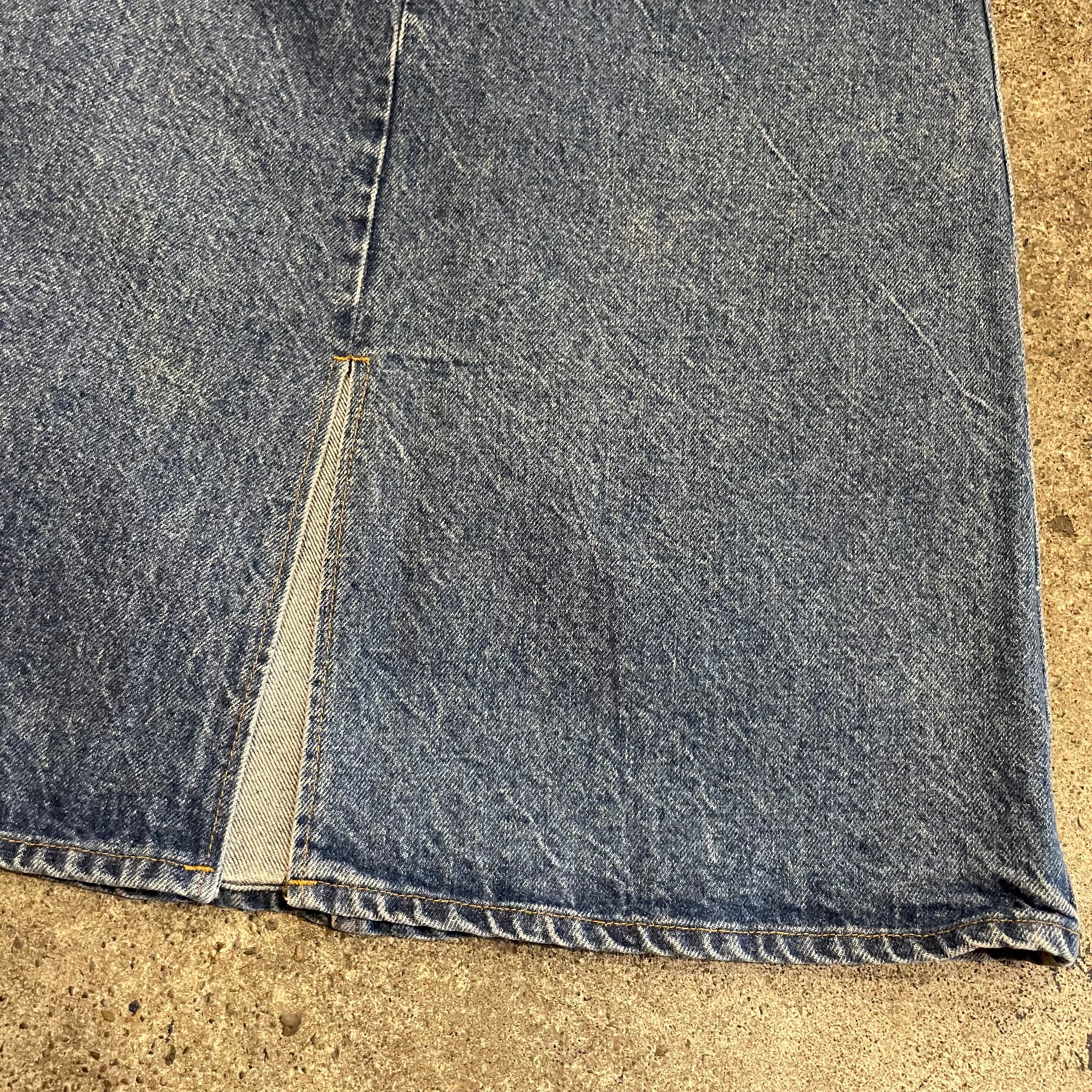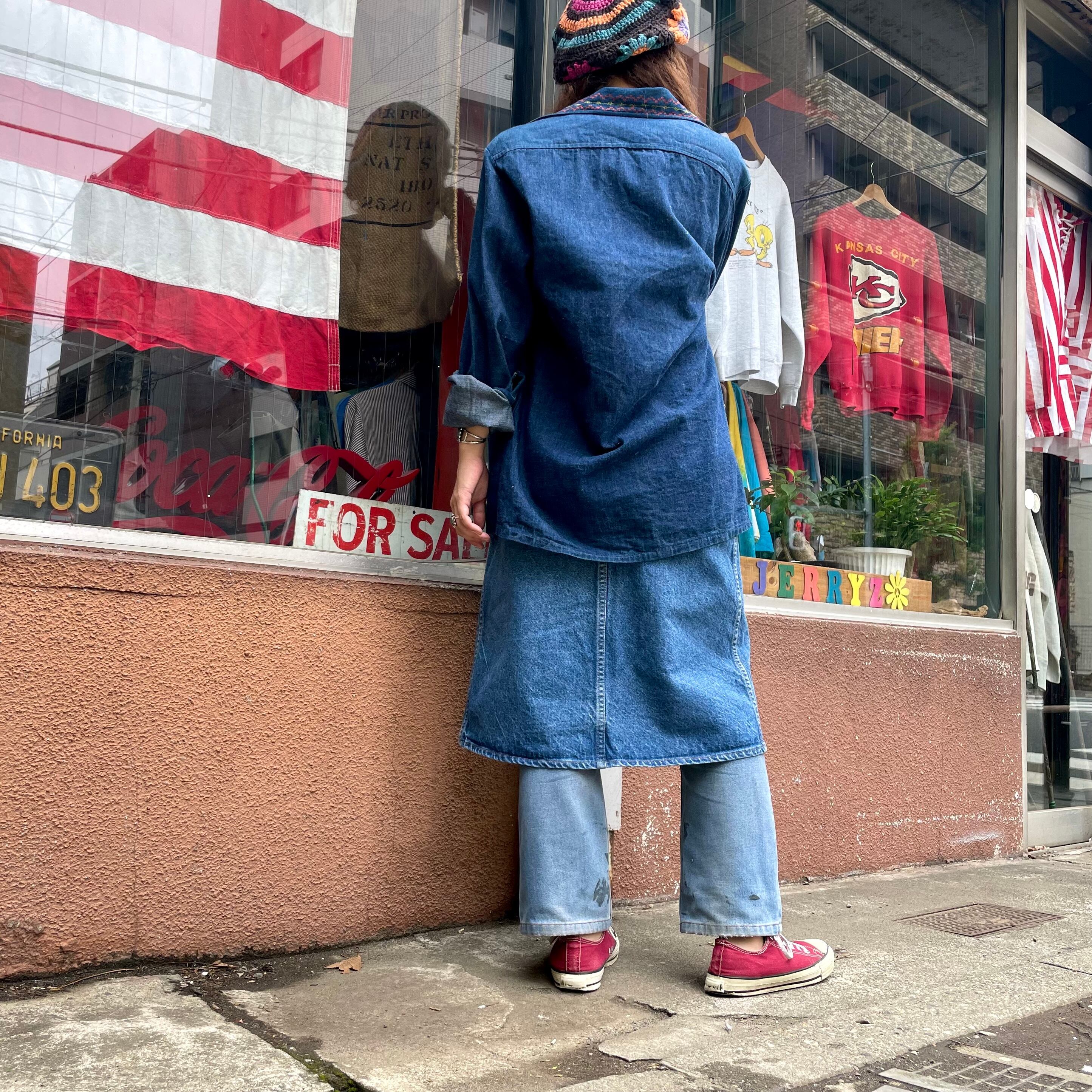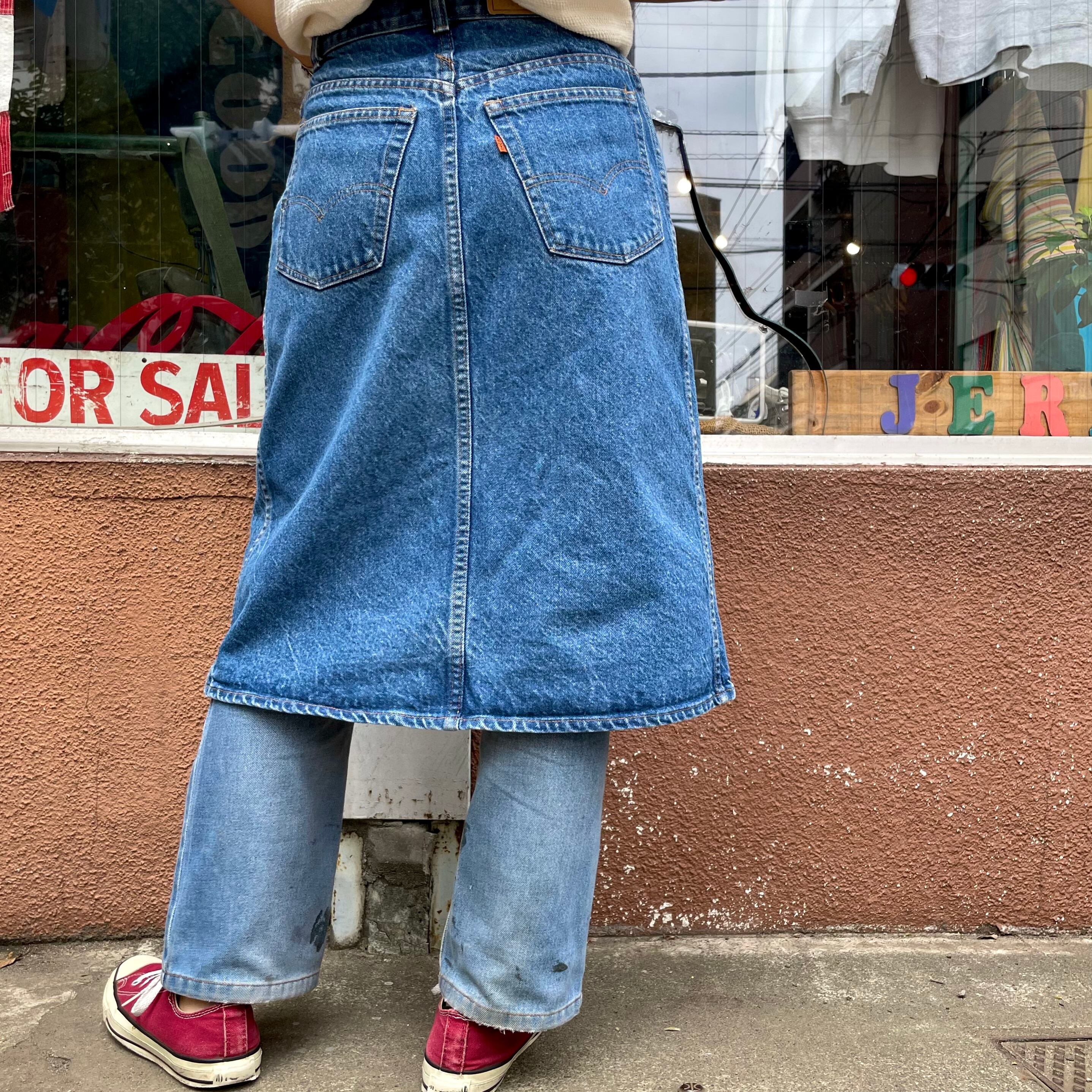 膝下丈の前中心にスリットがあるタイプで、程良い丈感と色落ちかと思います。