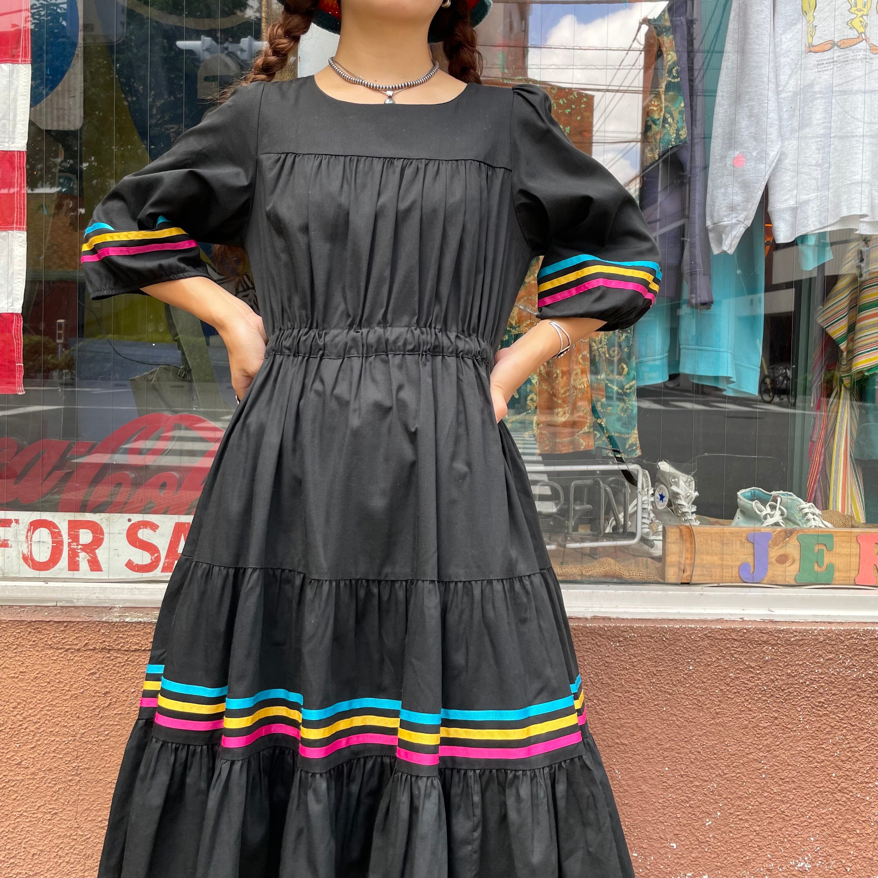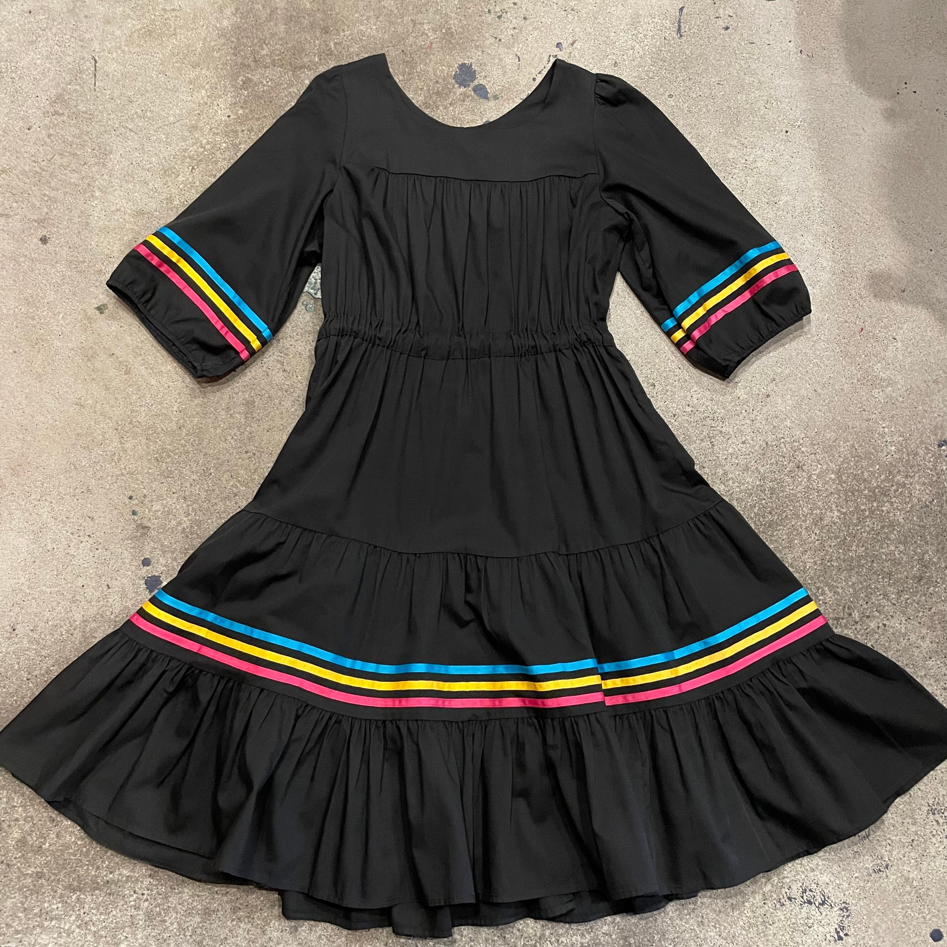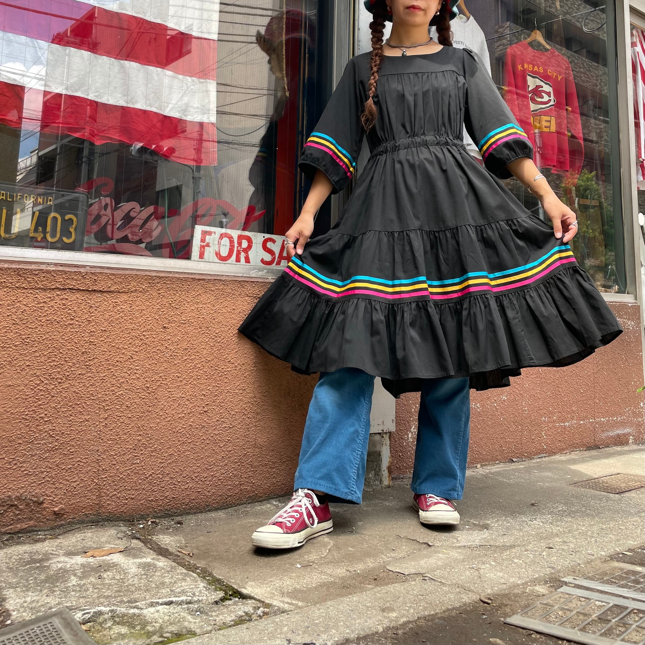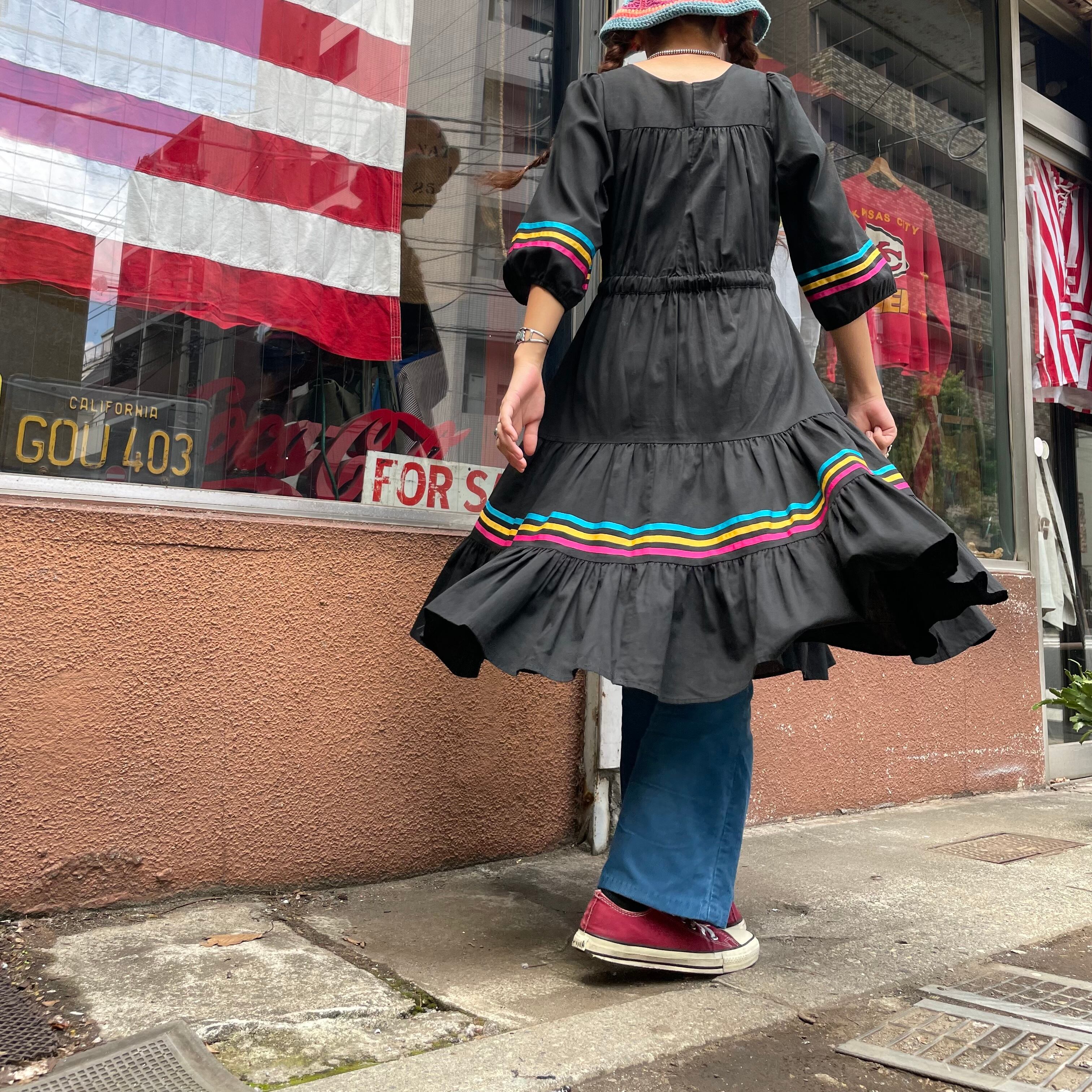 黒ベースに3色のテープがかわいいワンピースです。ボリュームのあるティアードのデザインで、スカートの広がりがばっちりです。