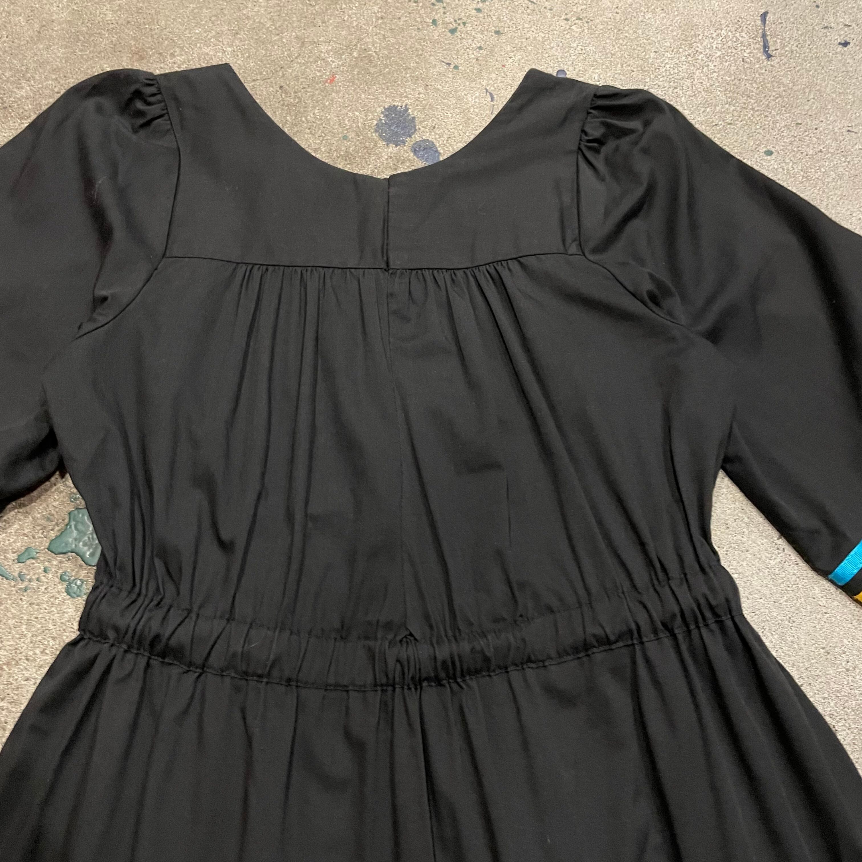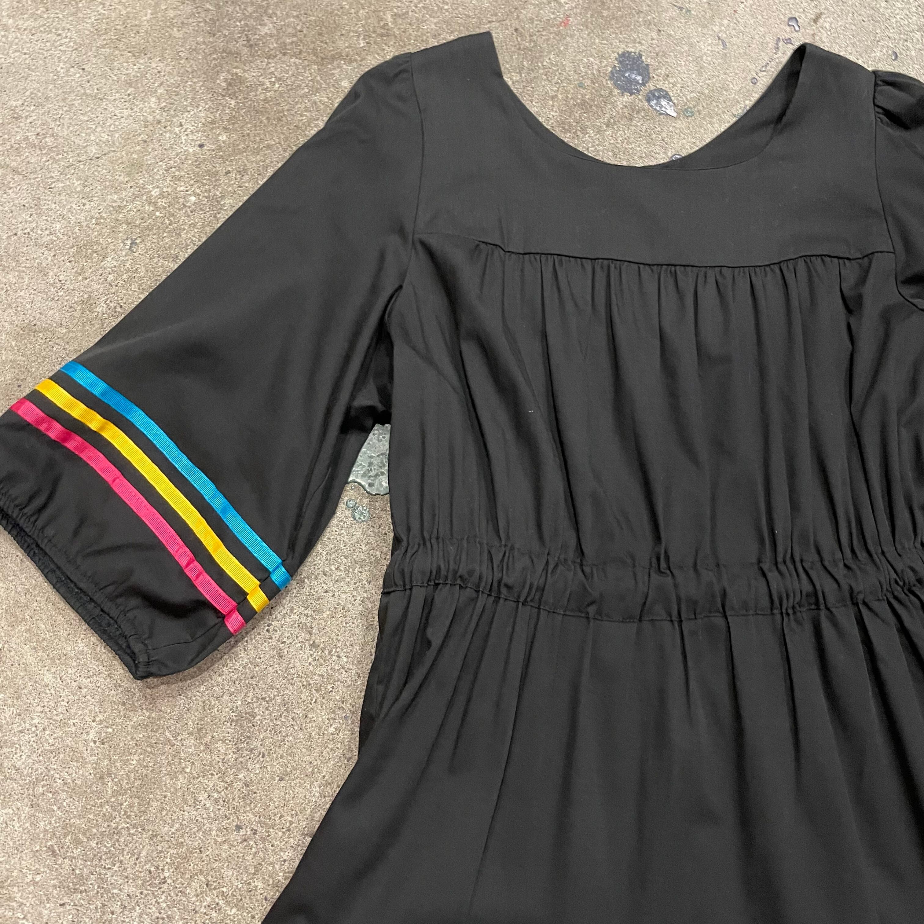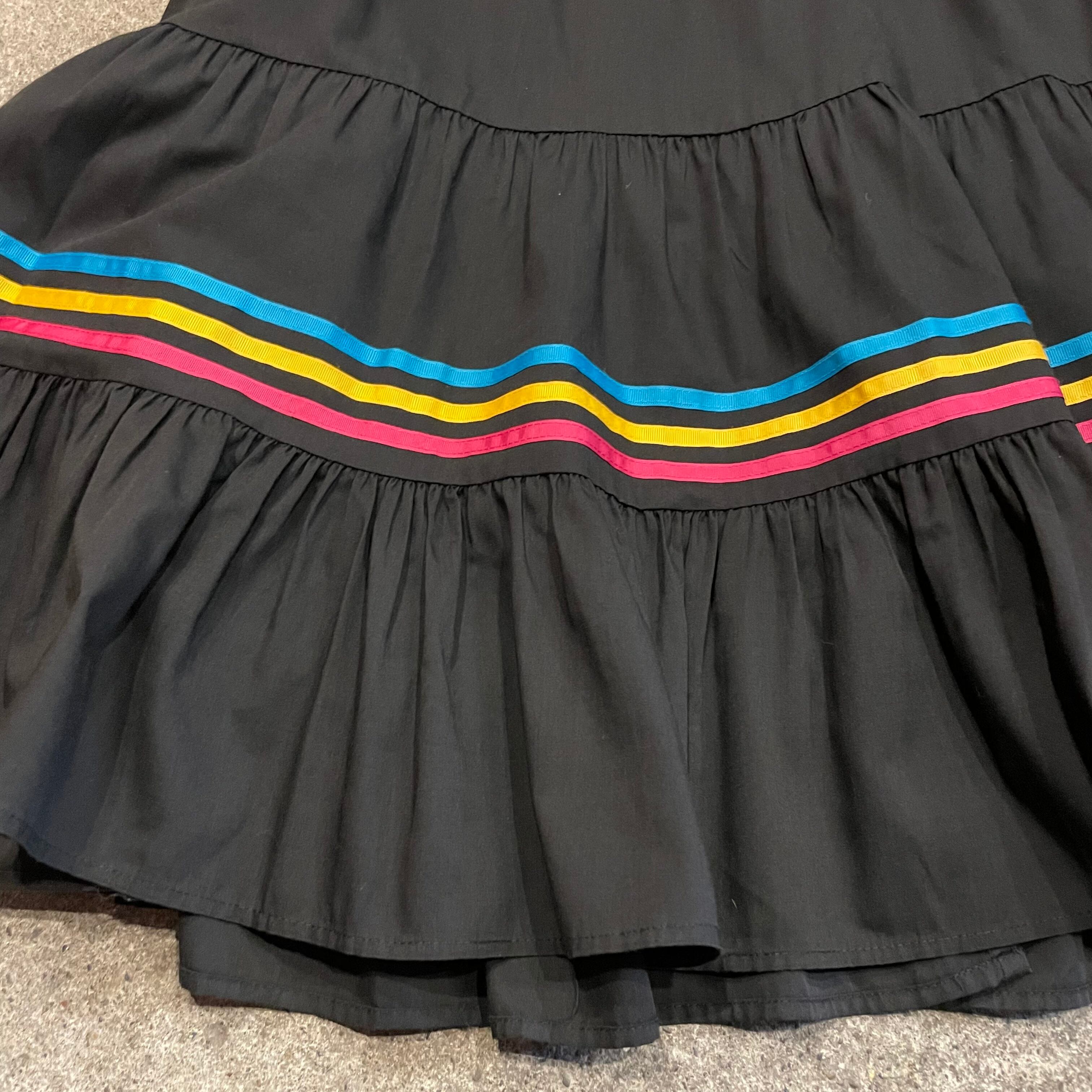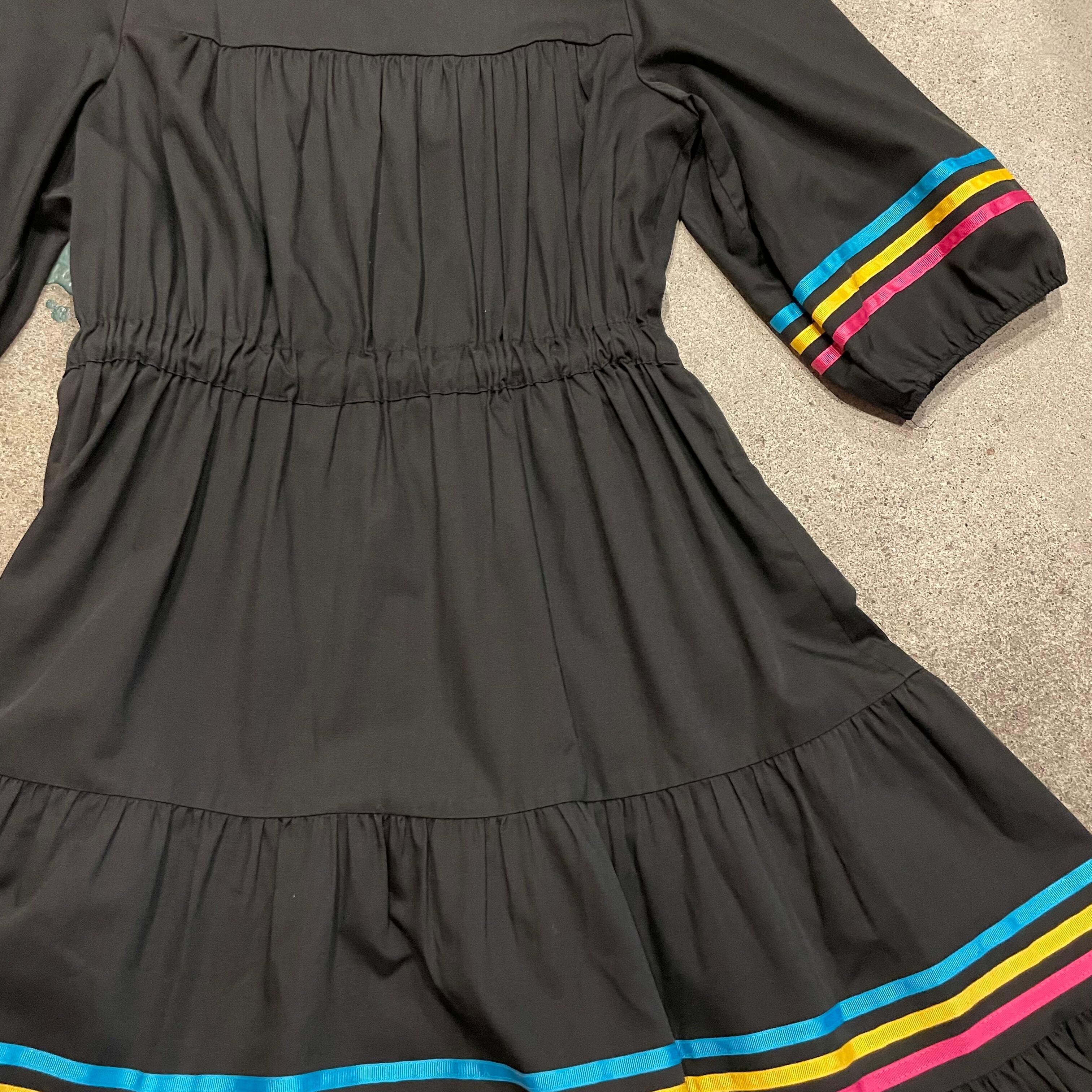 黒ベースに3色のテープがかわいいワンピースです。ボリュームのあるティアードのデザインで、スカートの広がりがばっちりです。