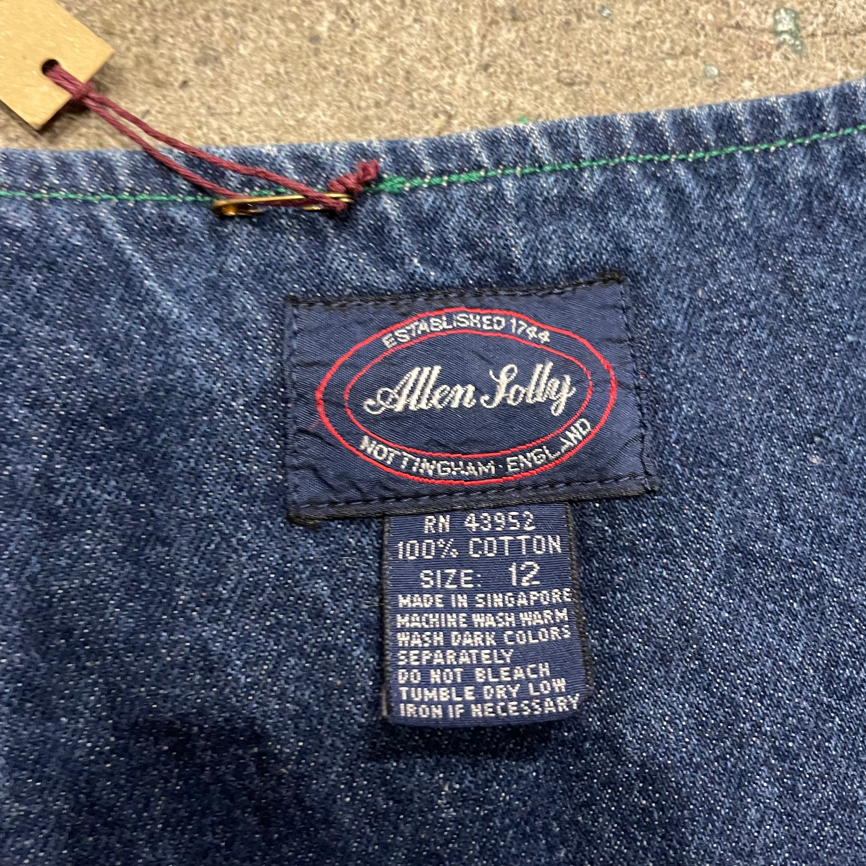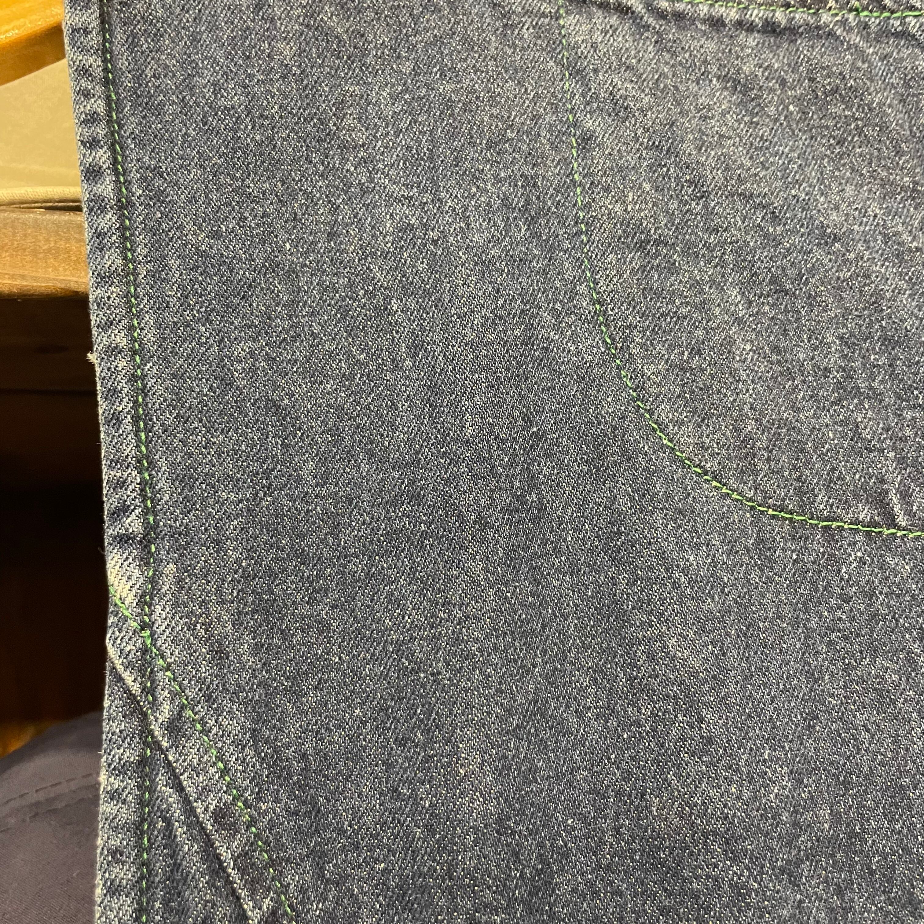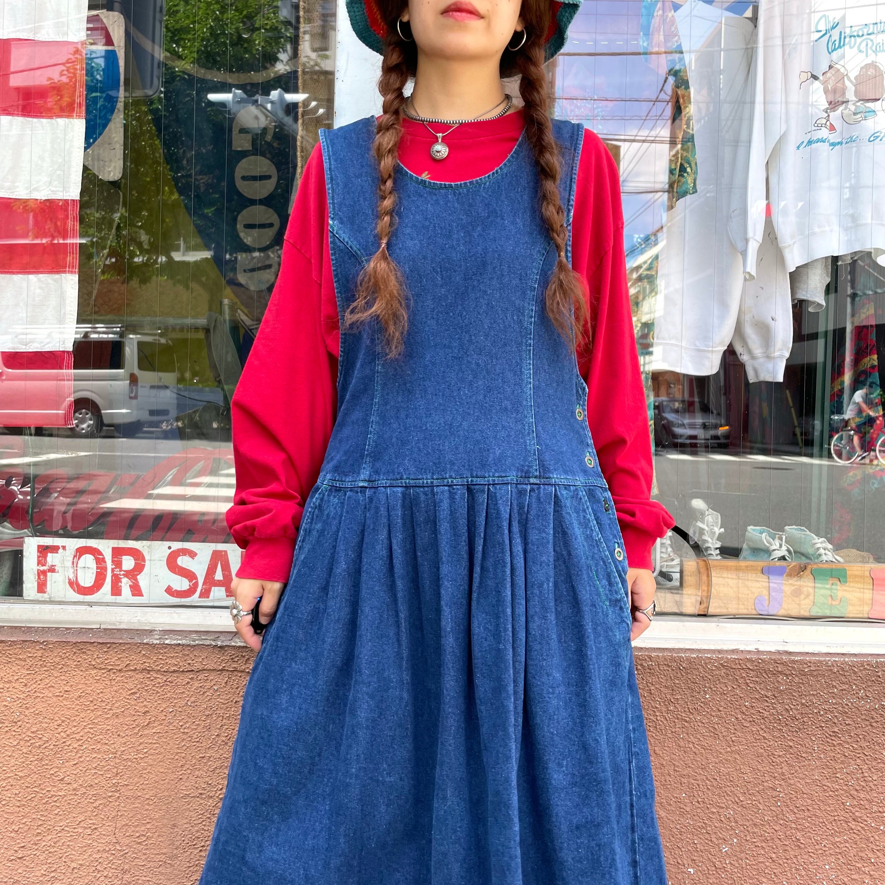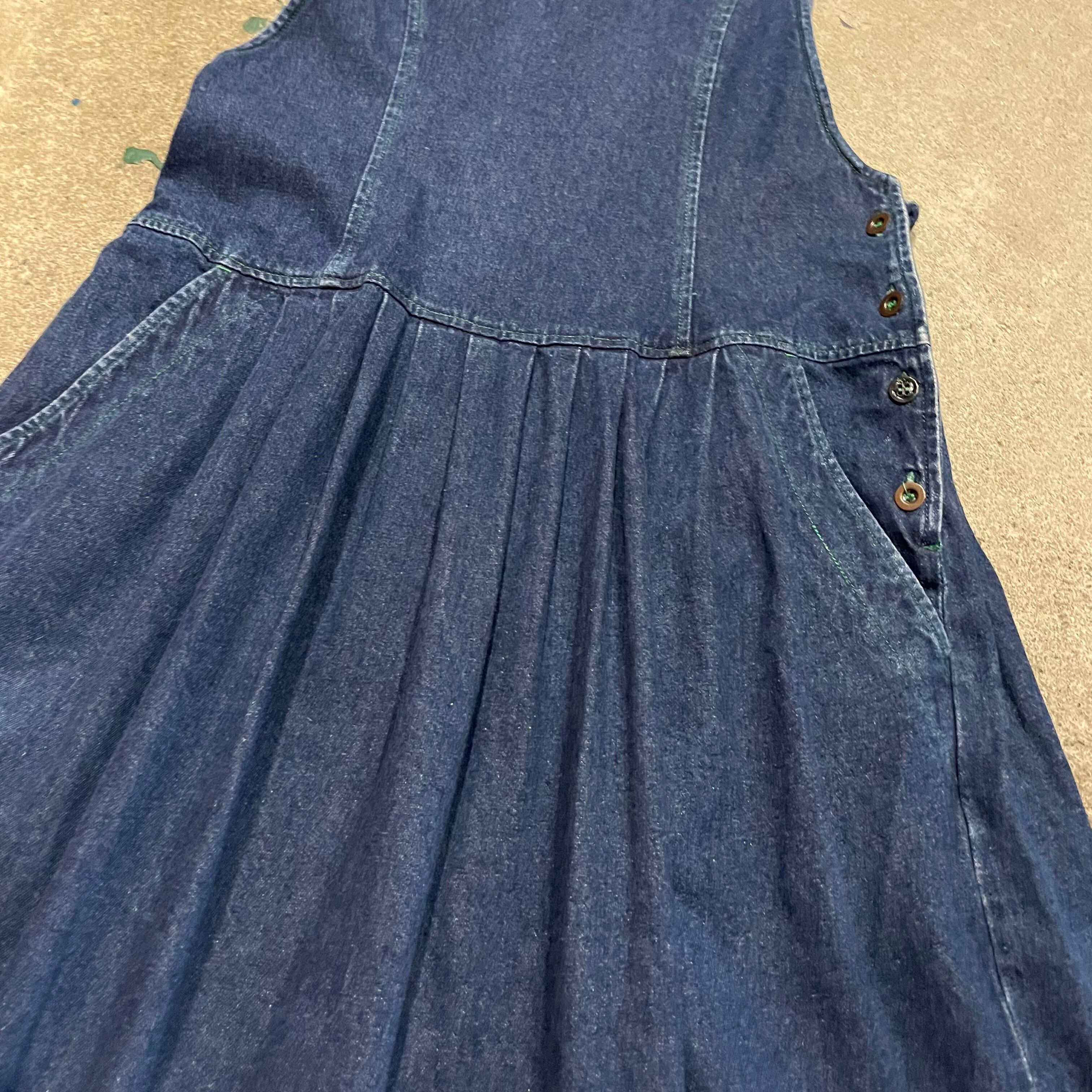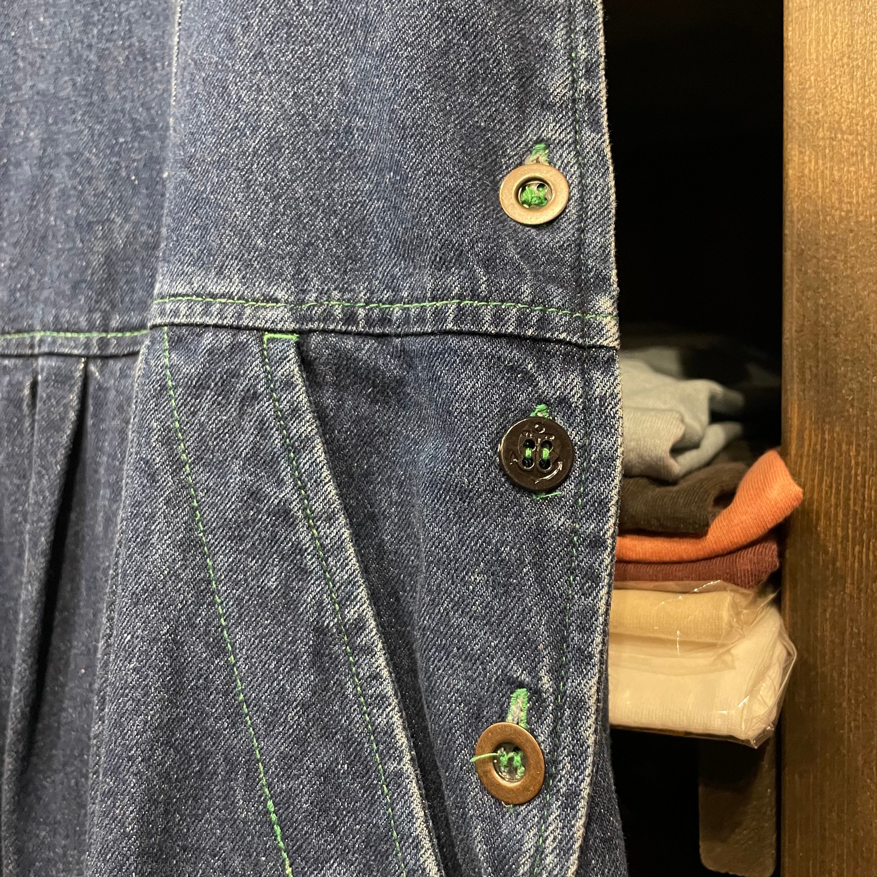 濃い色のデニムに緑のステッチがかわいいデニムワンピースです。