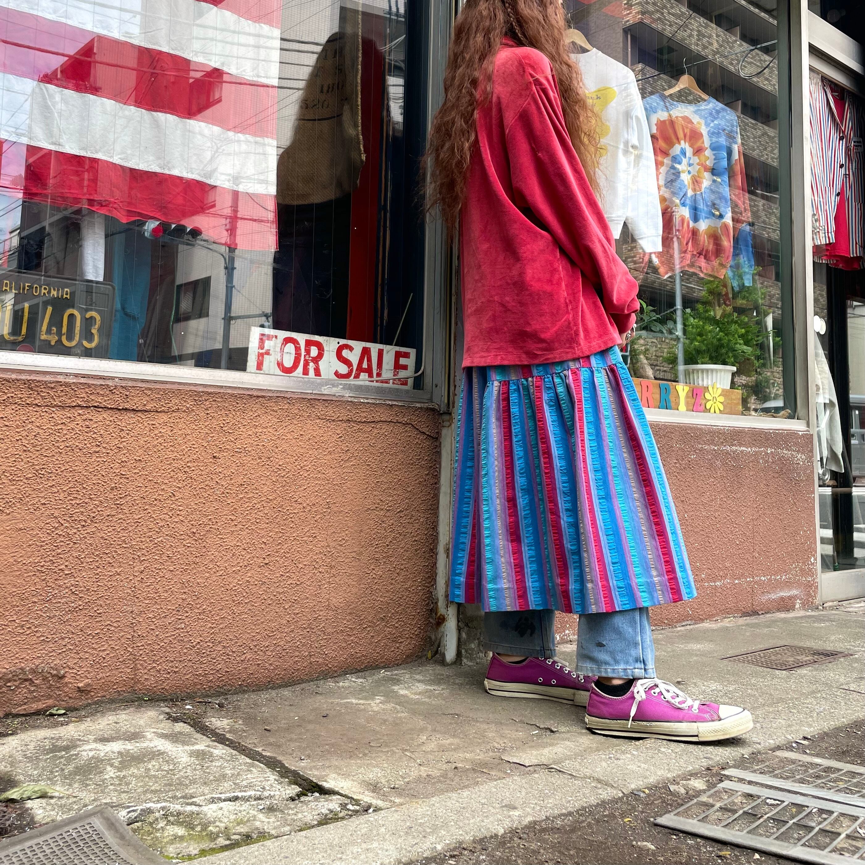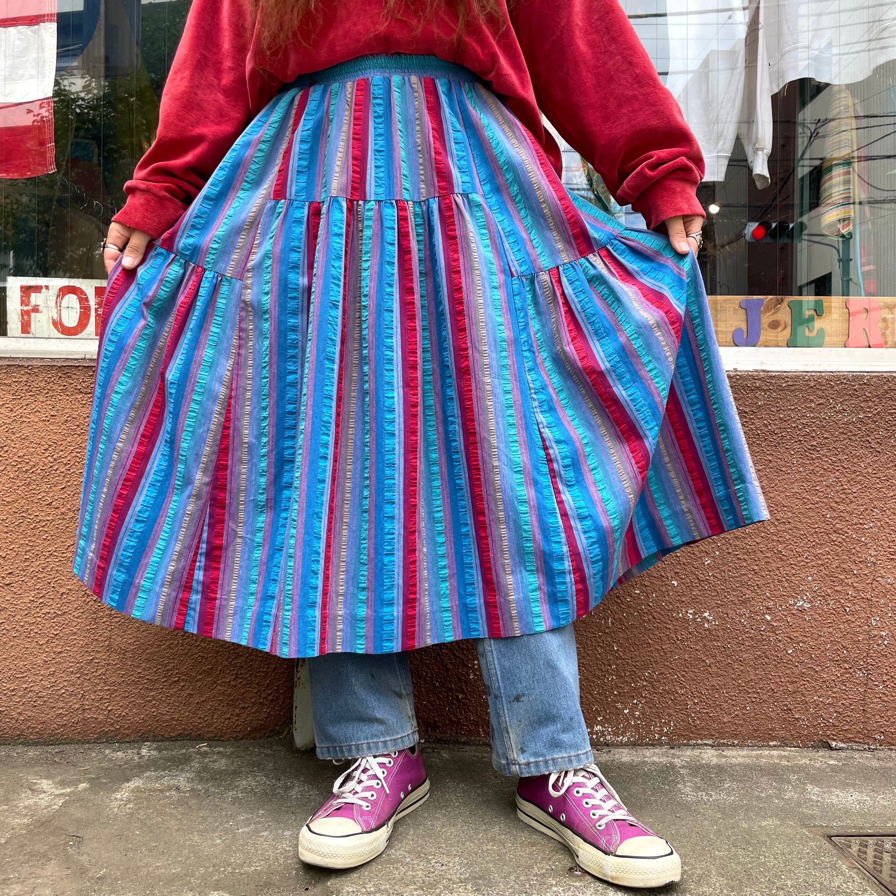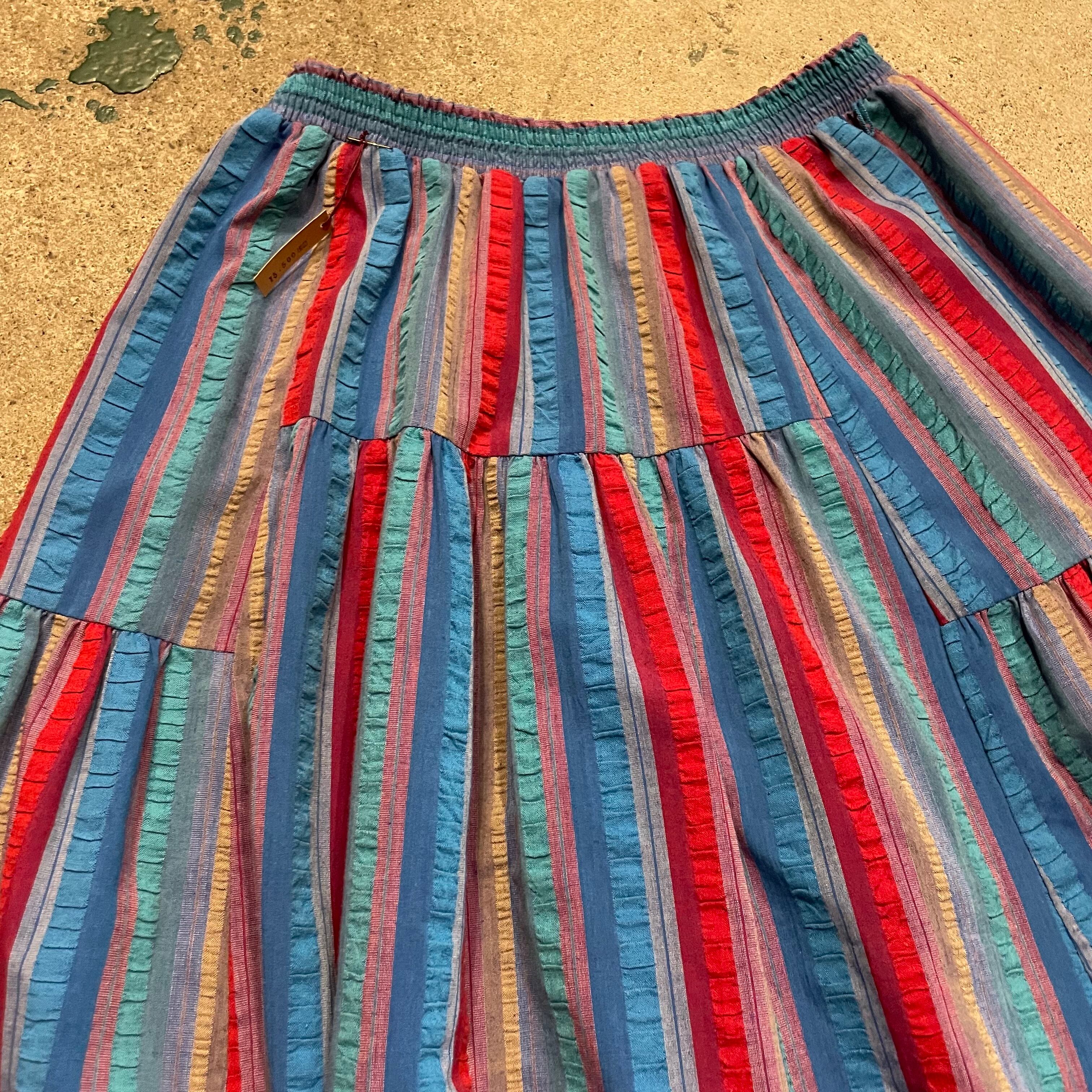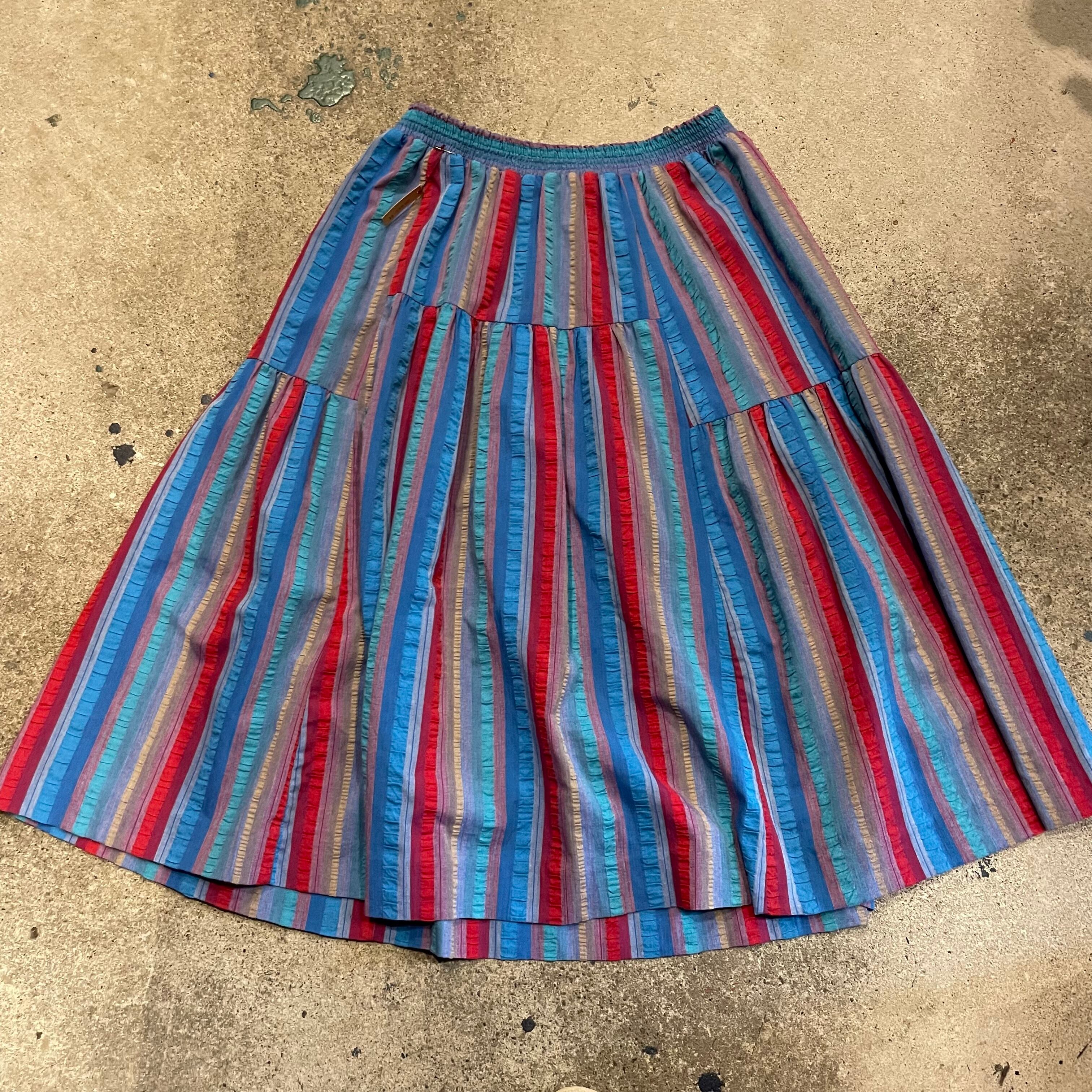 ストライプの色味と不思議な切り替えのティアードがかわいいスカートです。