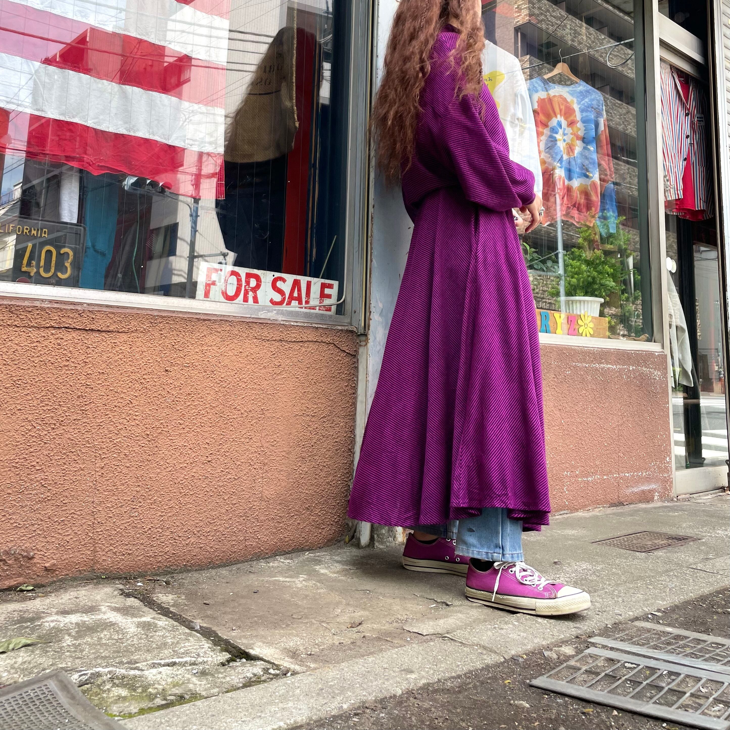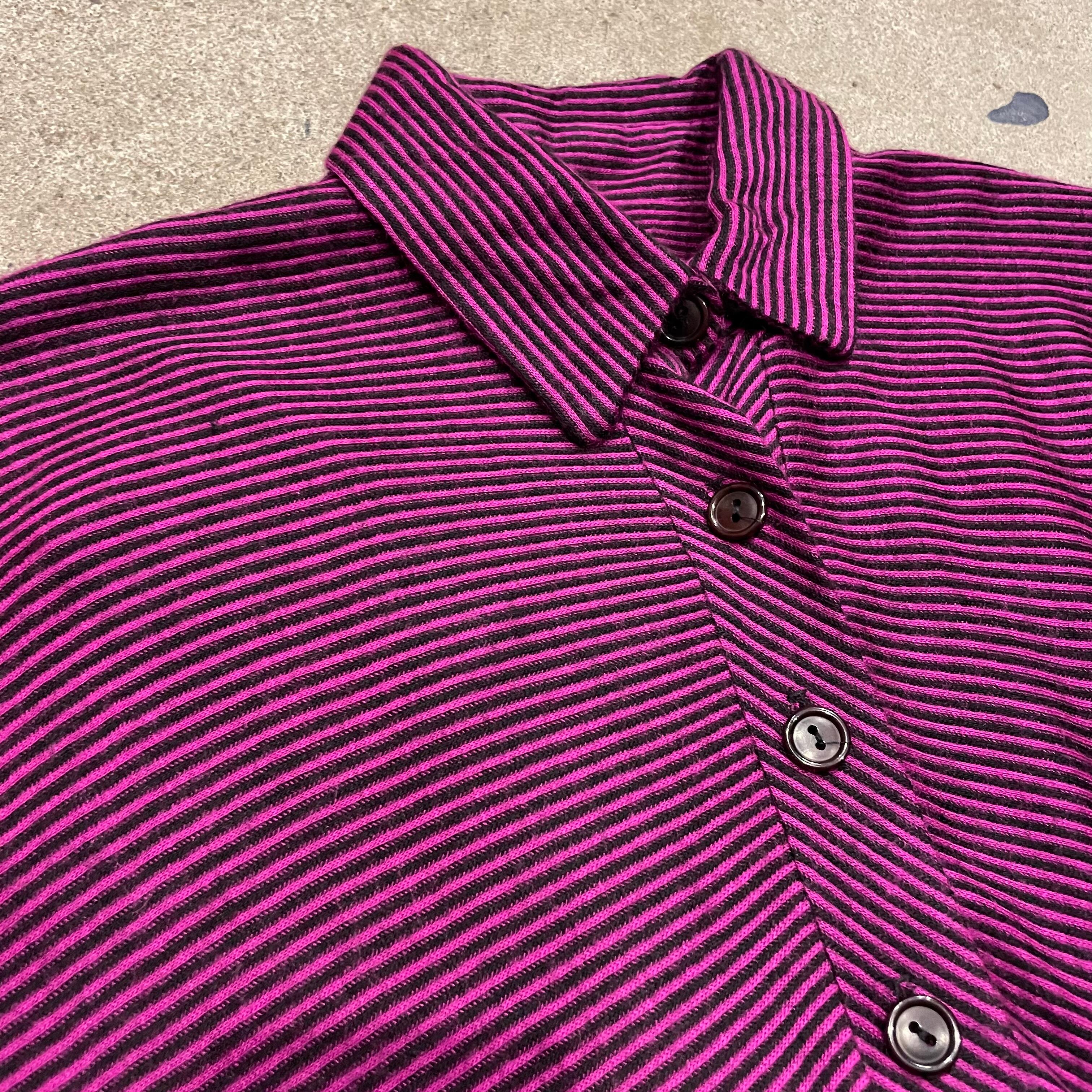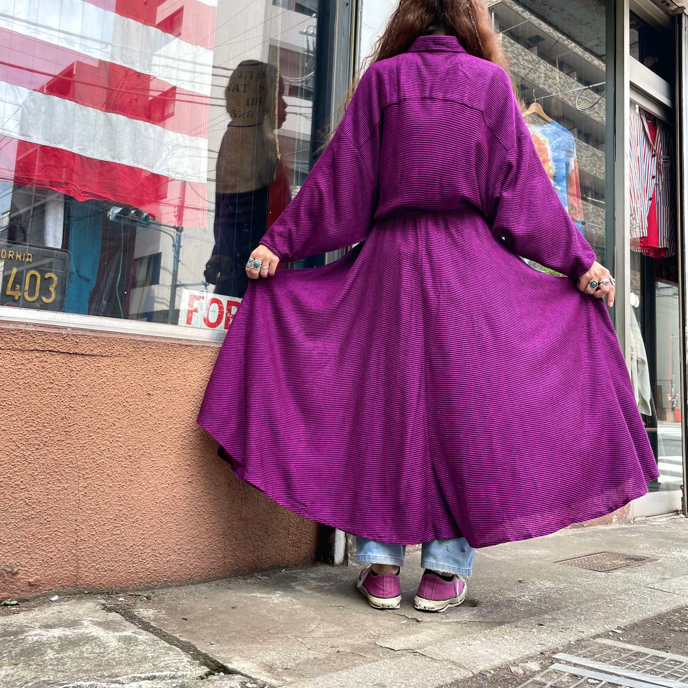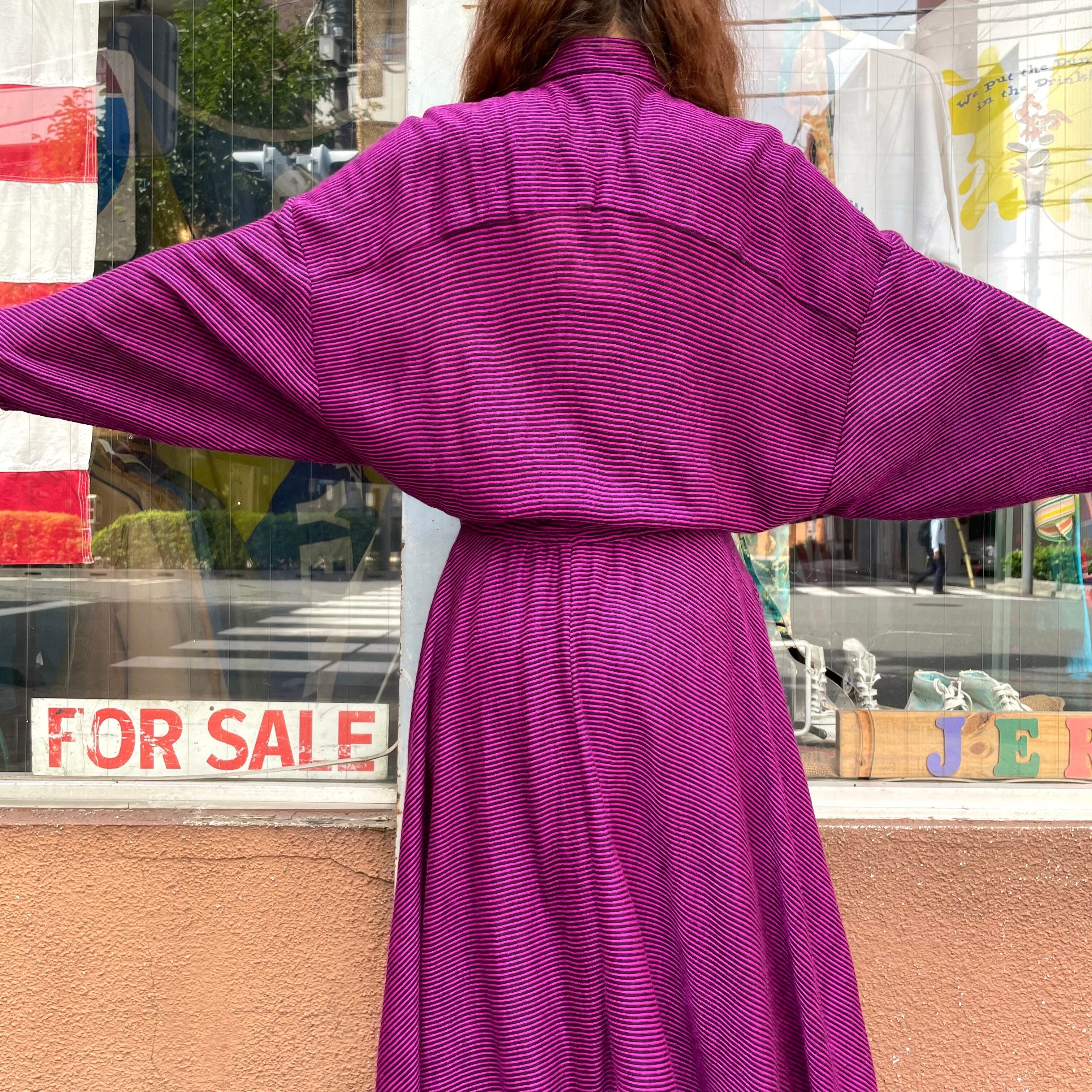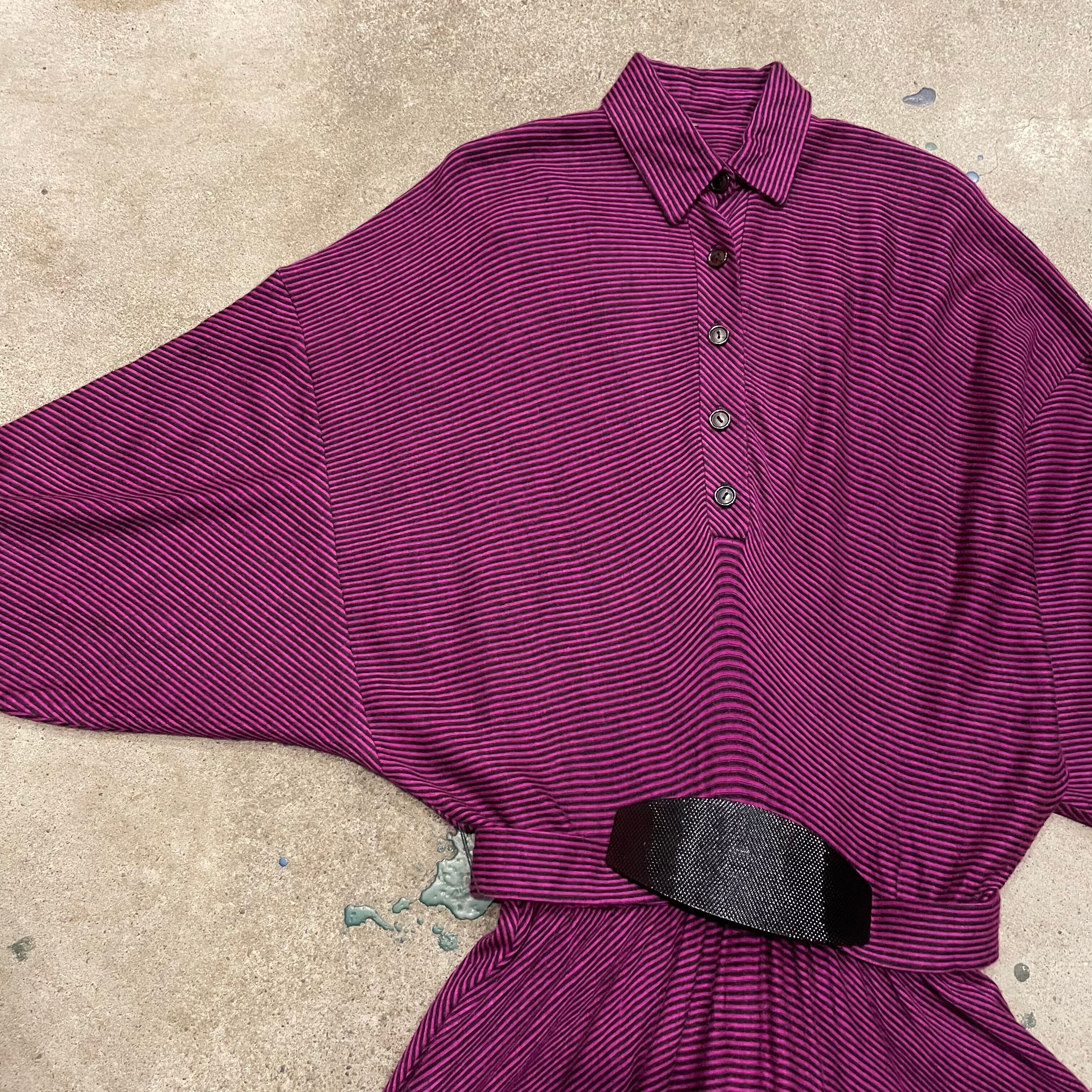 ピンクみのある紫色がかわいいシャツワンピースです。細かいボーダー柄、切り替えのあるドルマンスリーブのゆったり感、トロンとした素材感で雰囲気のある一枚です。