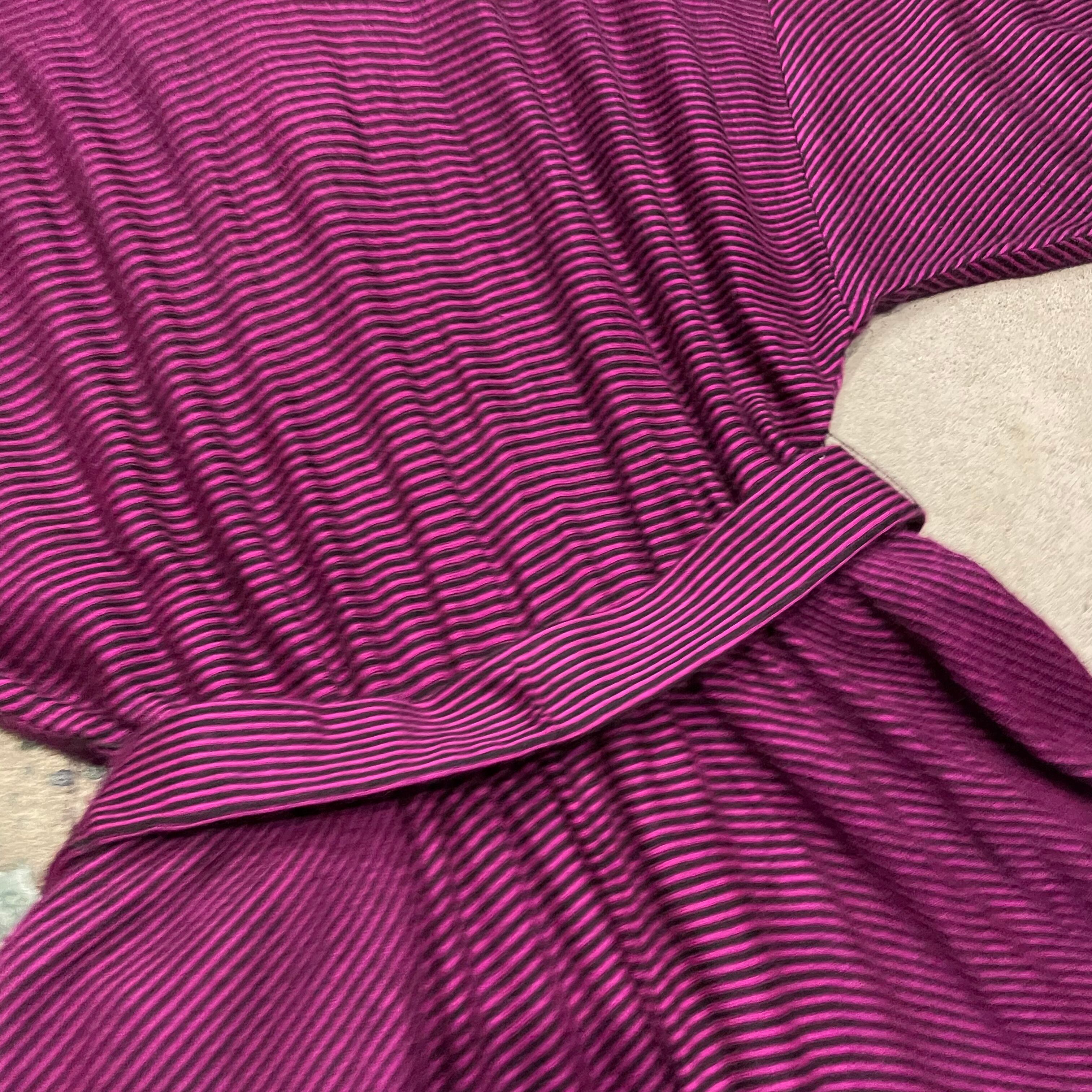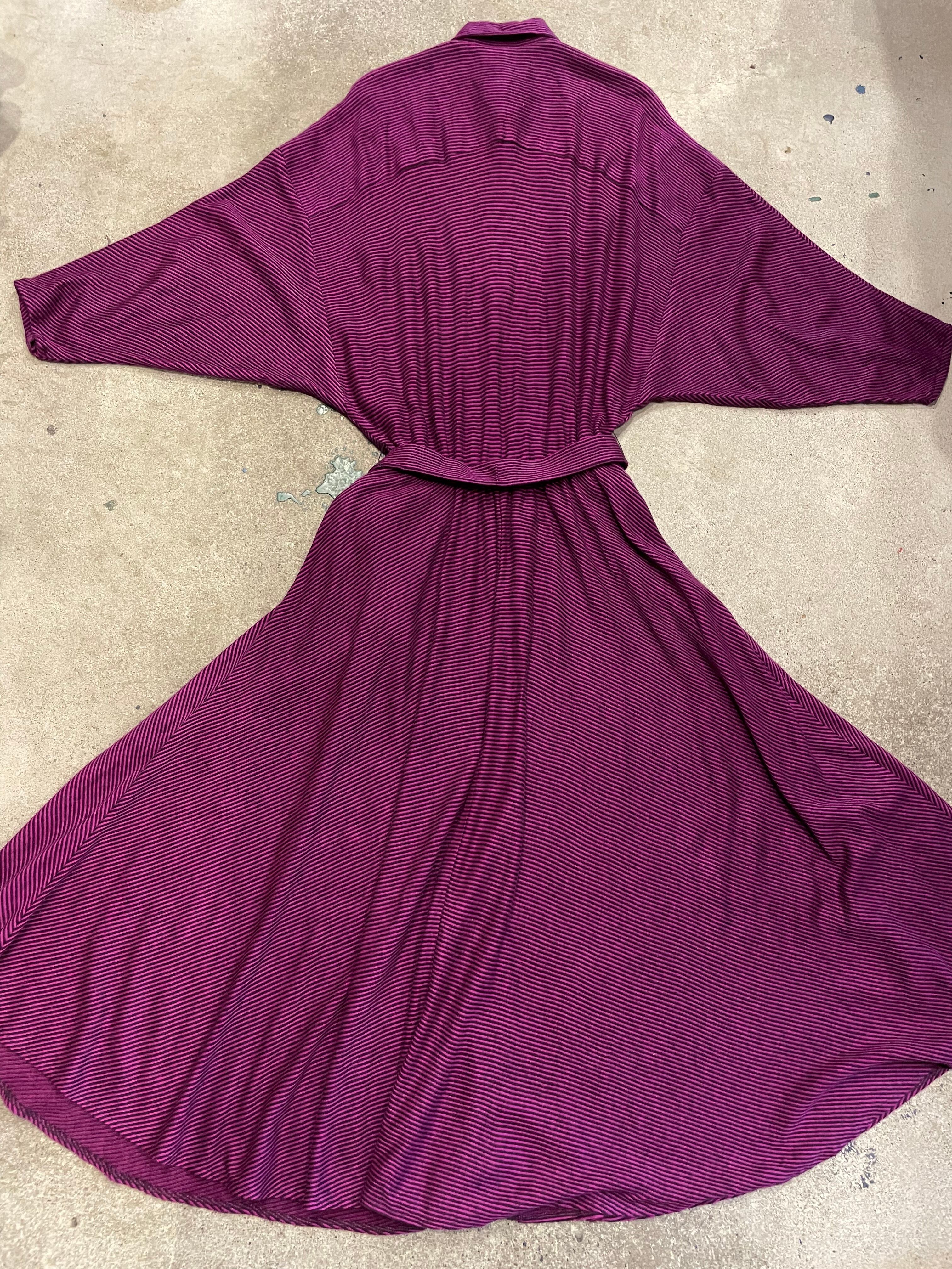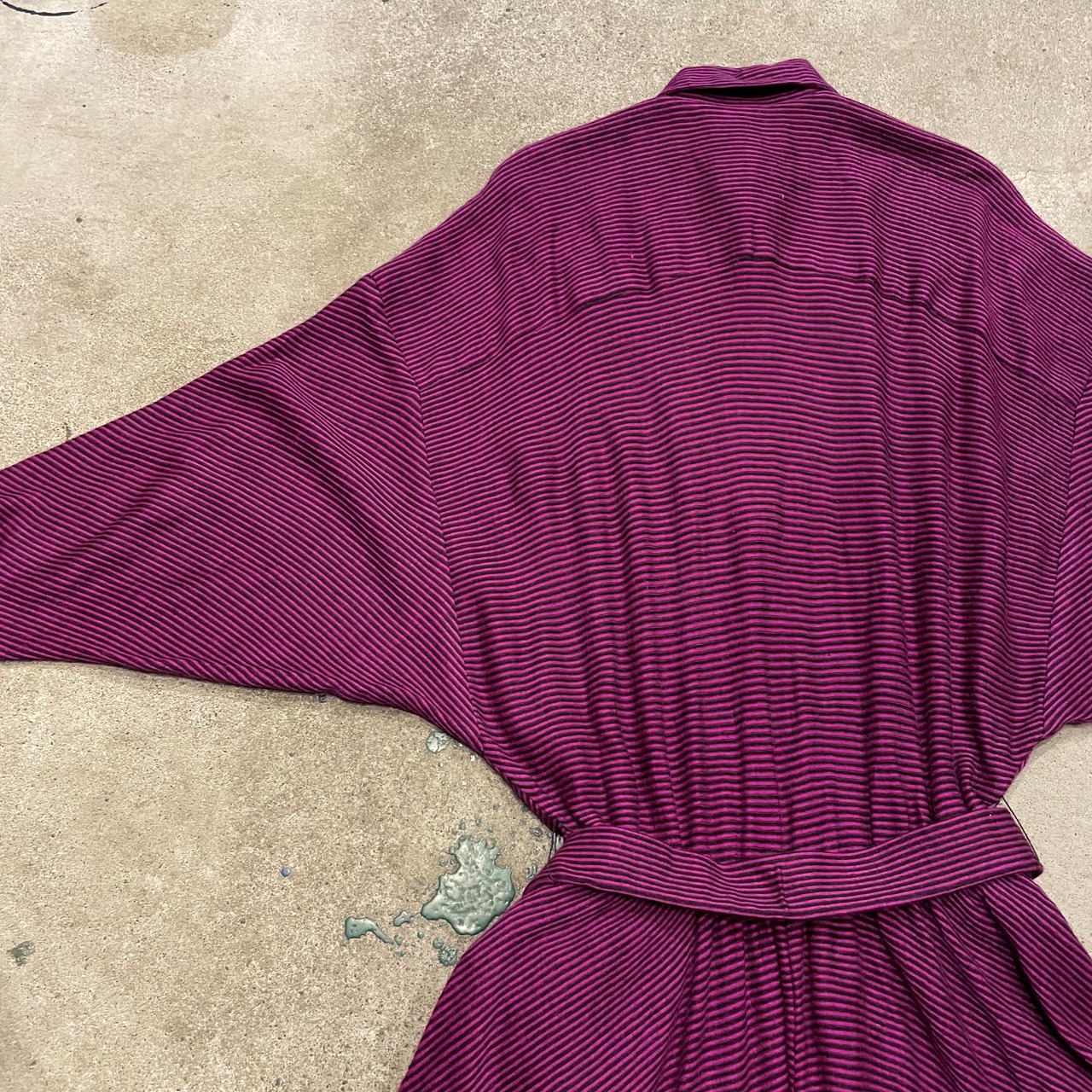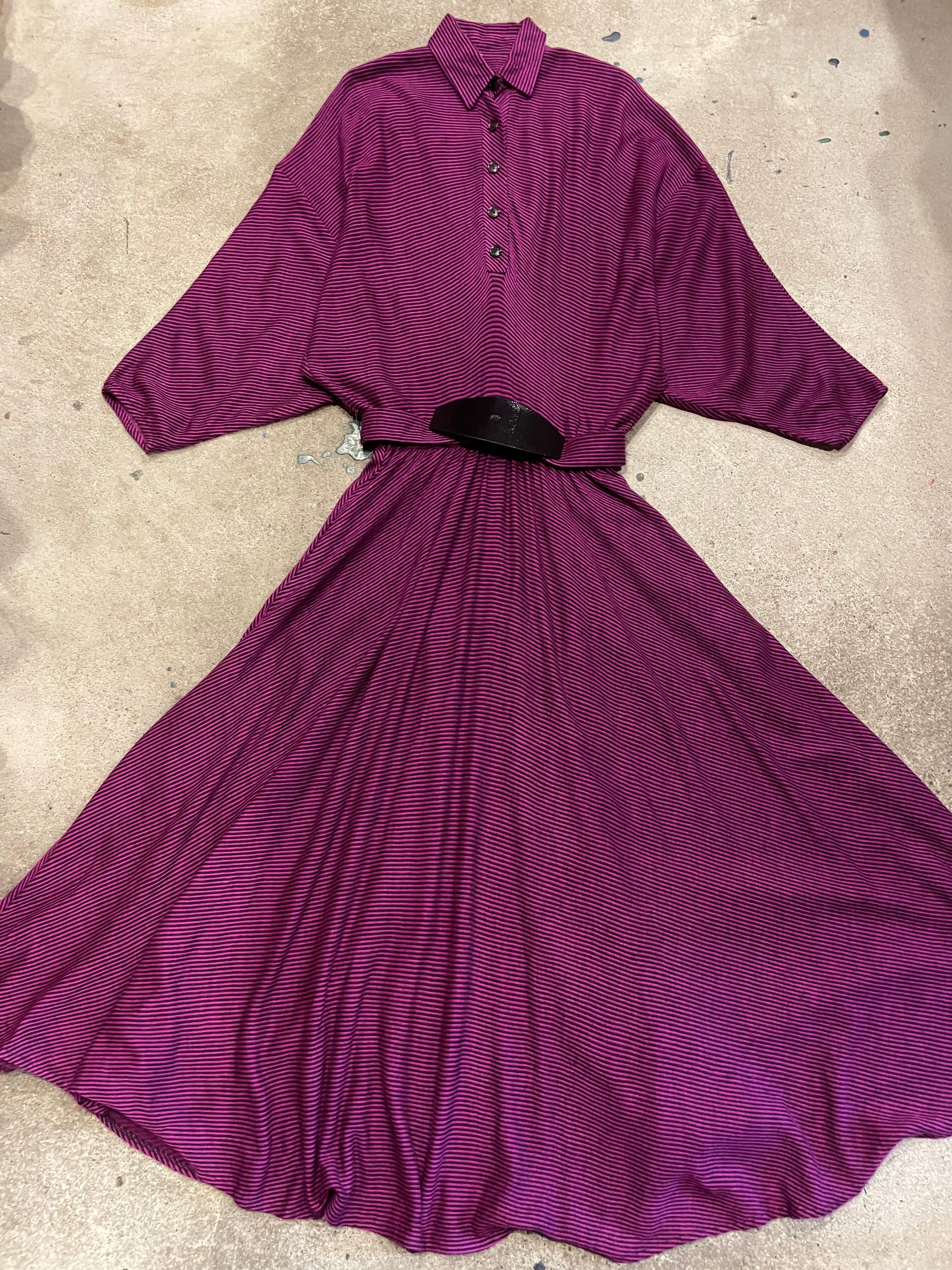 ピンクみのある紫色がかわいいシャツワンピースです。細かいボーダー柄、切り替えのあるドルマンスリーブのゆったり感、トロンとした素材感で雰囲気のある一枚です。