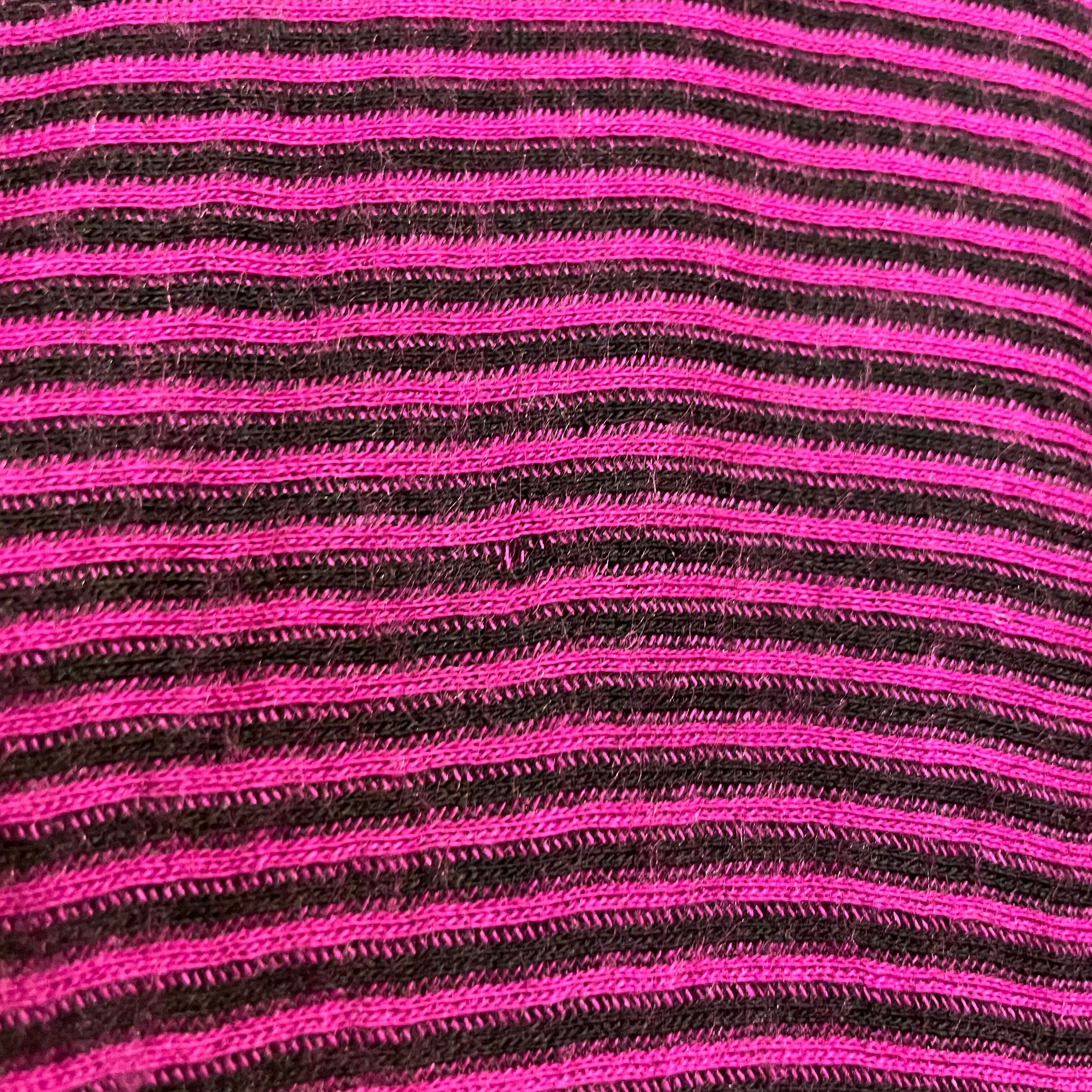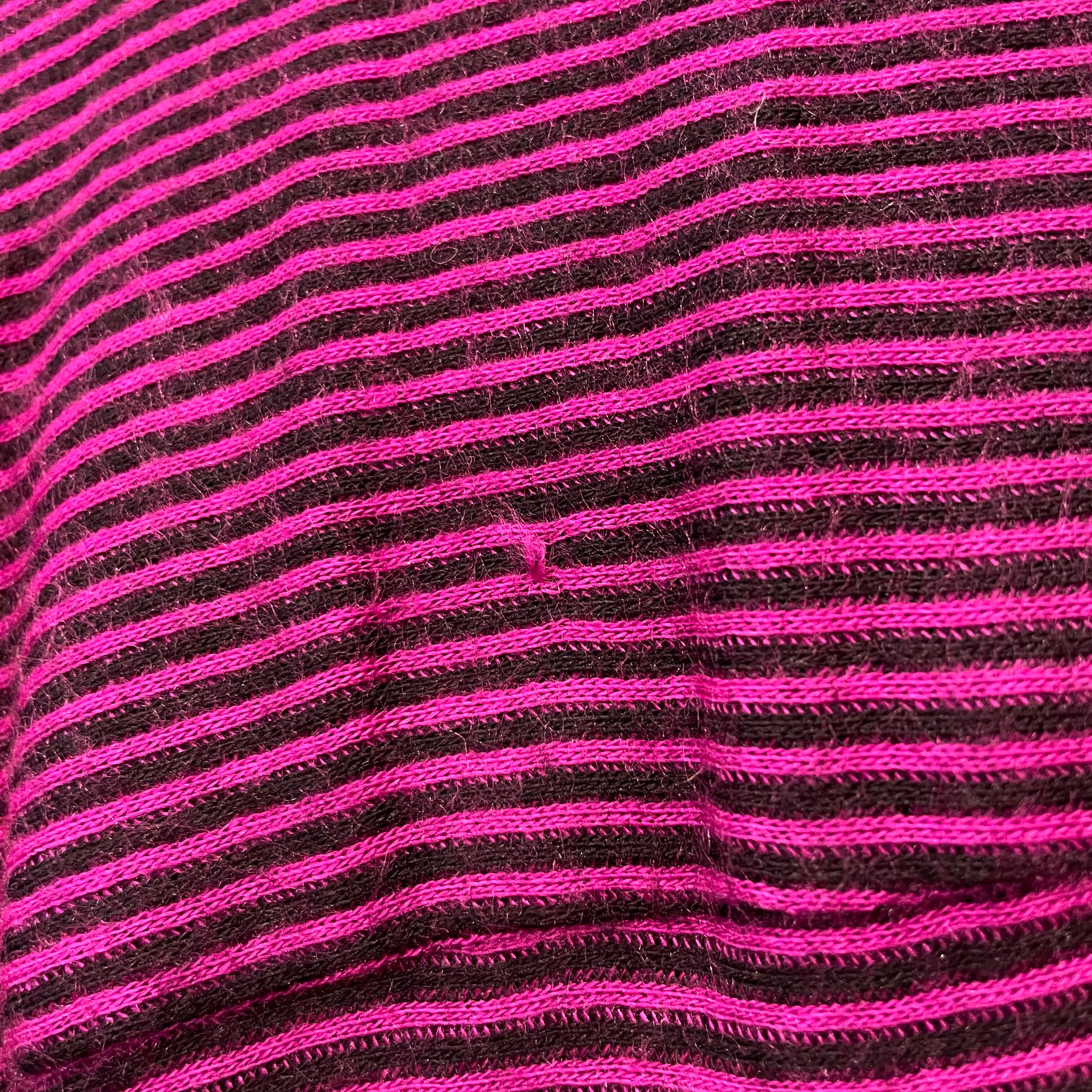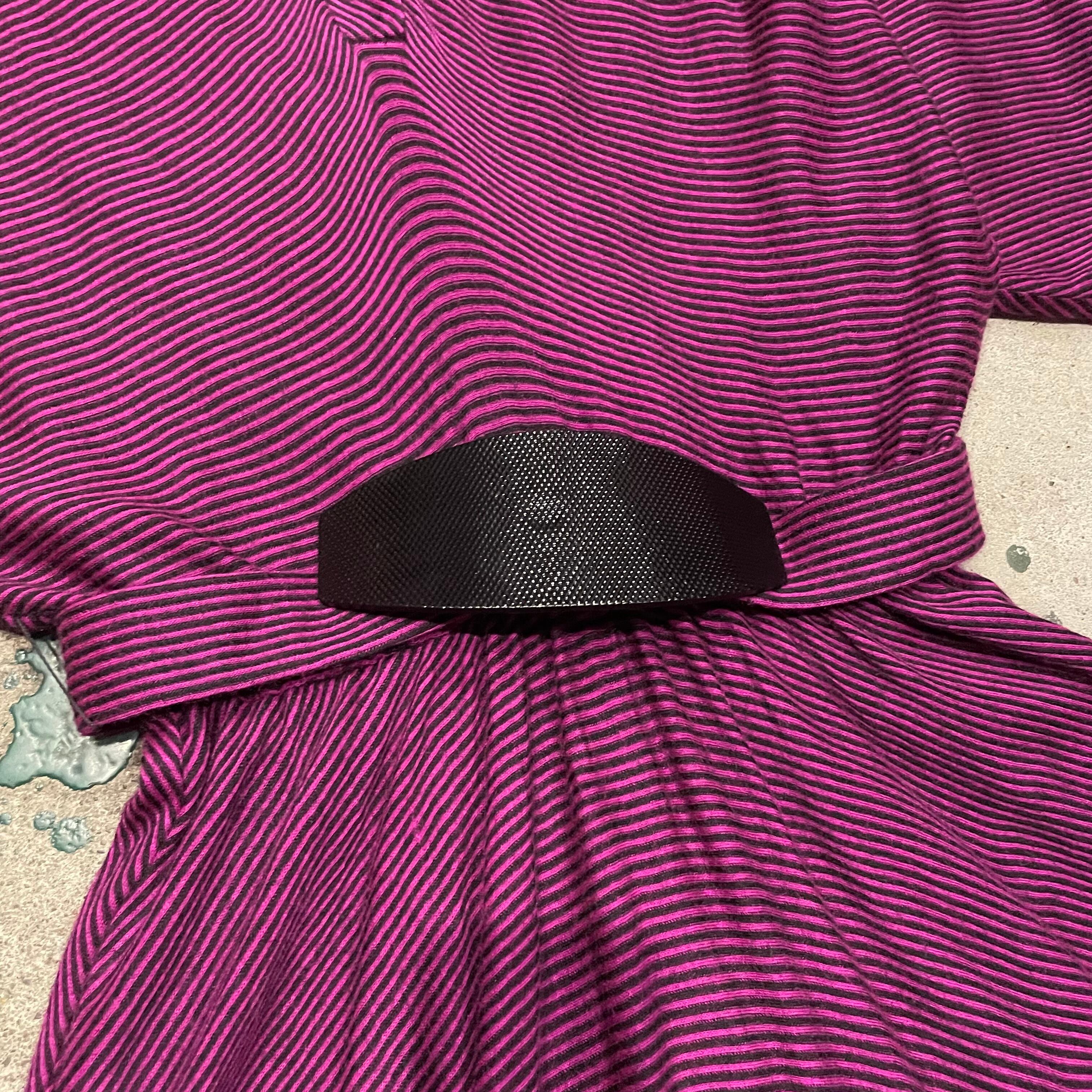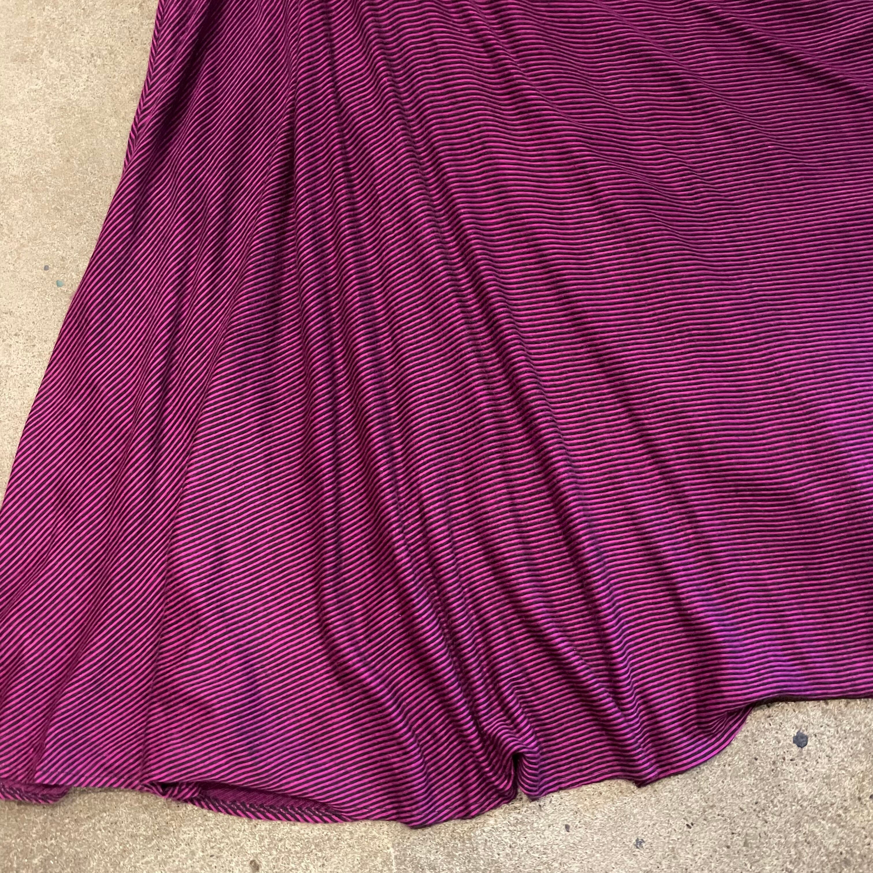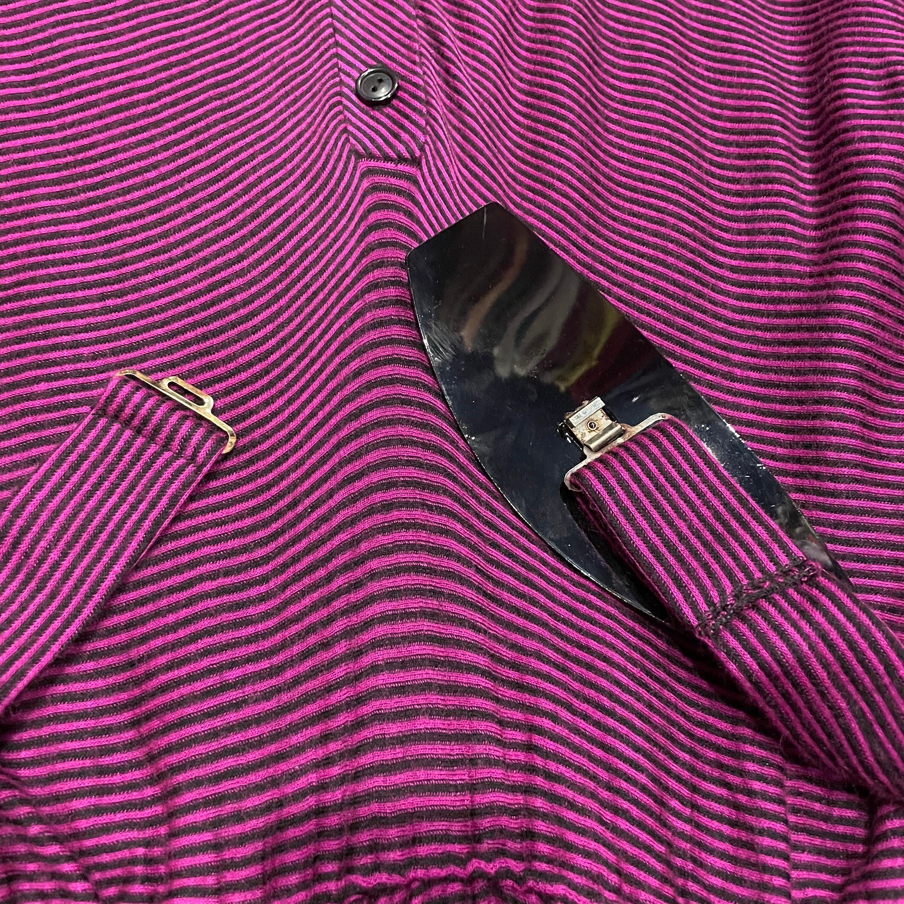 ピンクみのある紫色がかわいいシャツワンピースです。細かいボーダー柄、切り替えのあるドルマンスリーブのゆったり感、トロンとした素材感で雰囲気のある一枚です。
