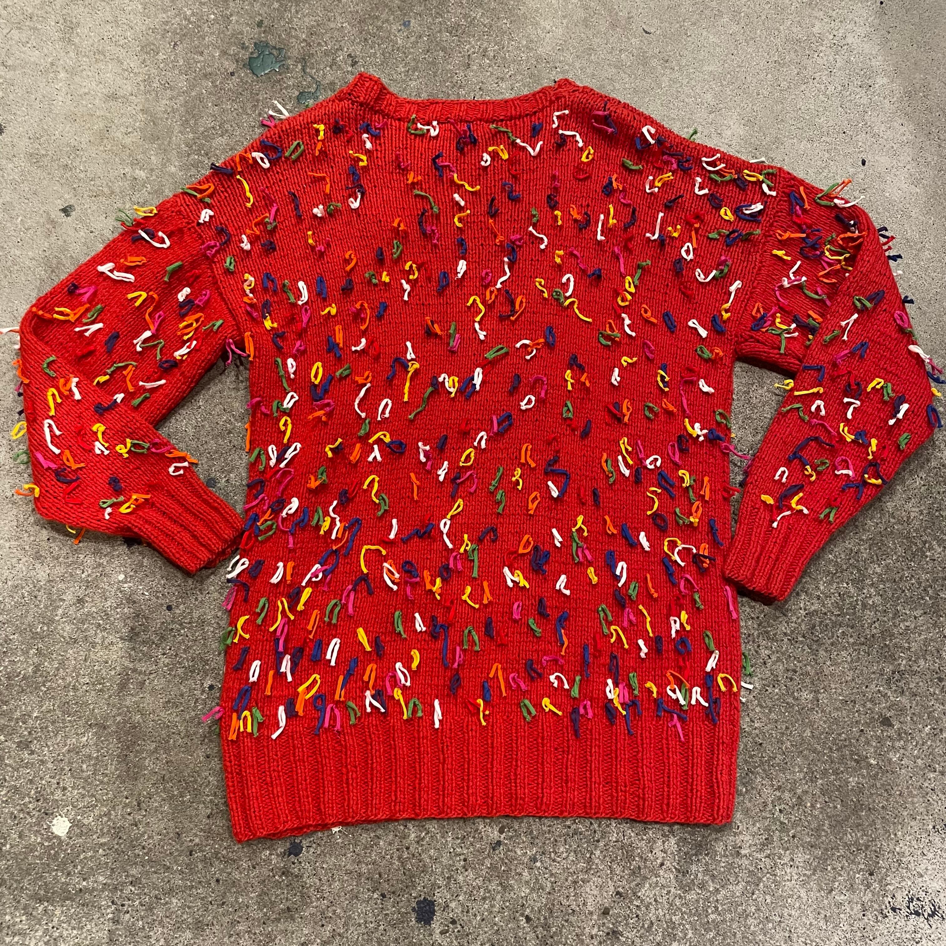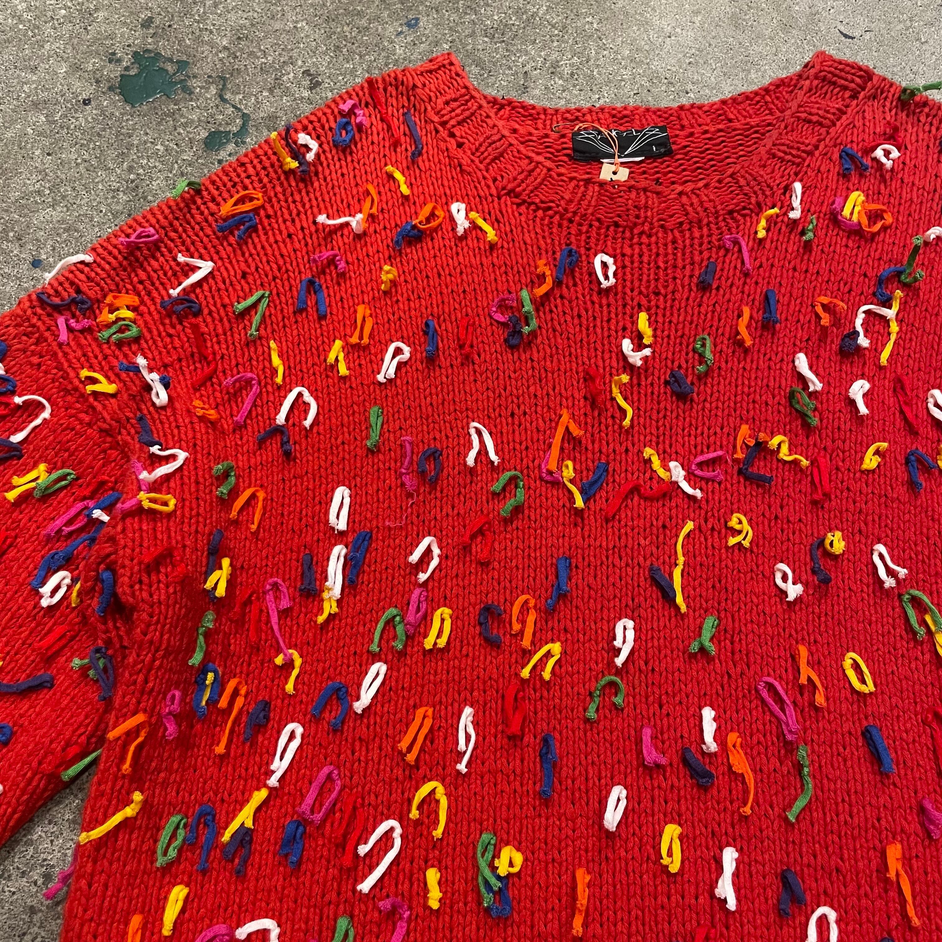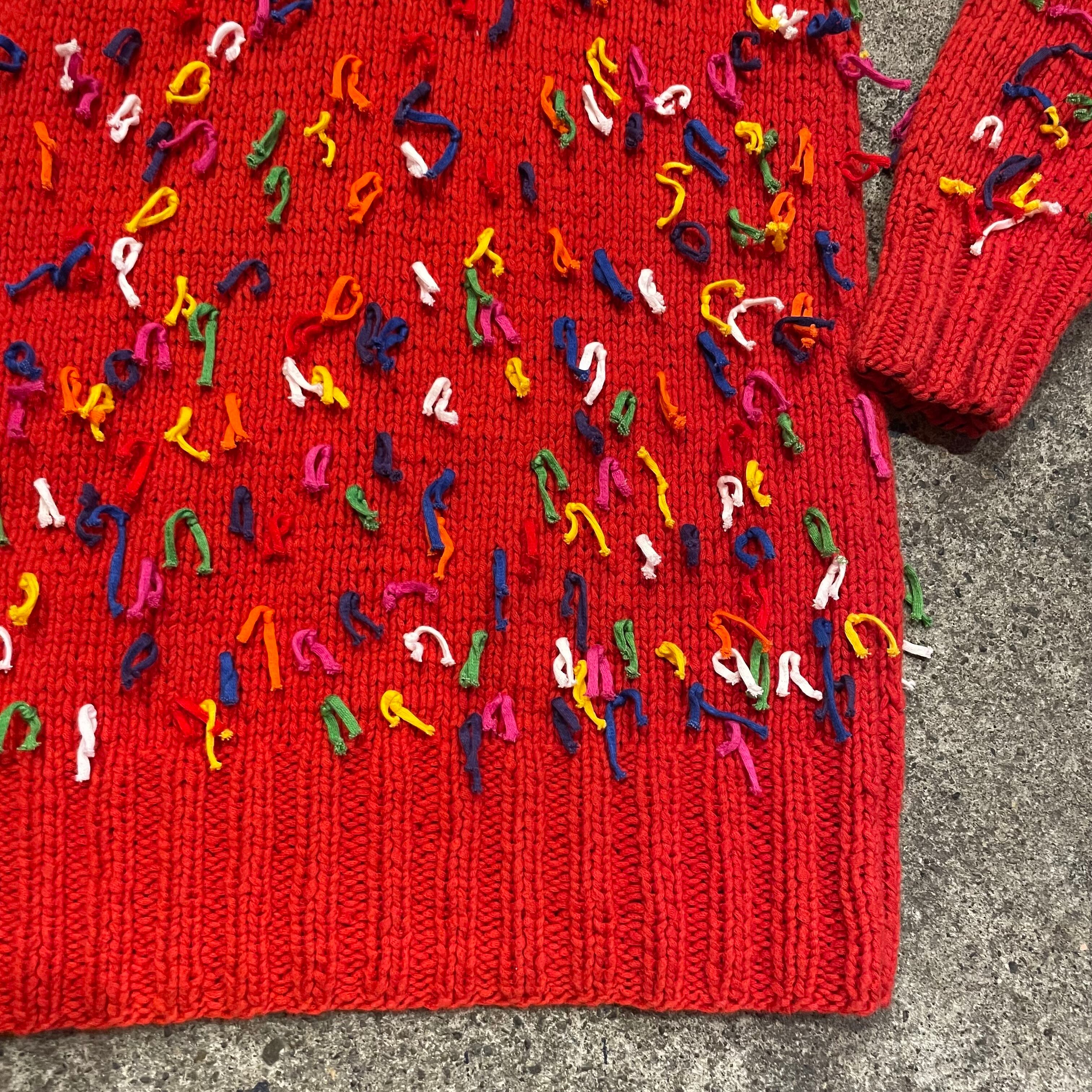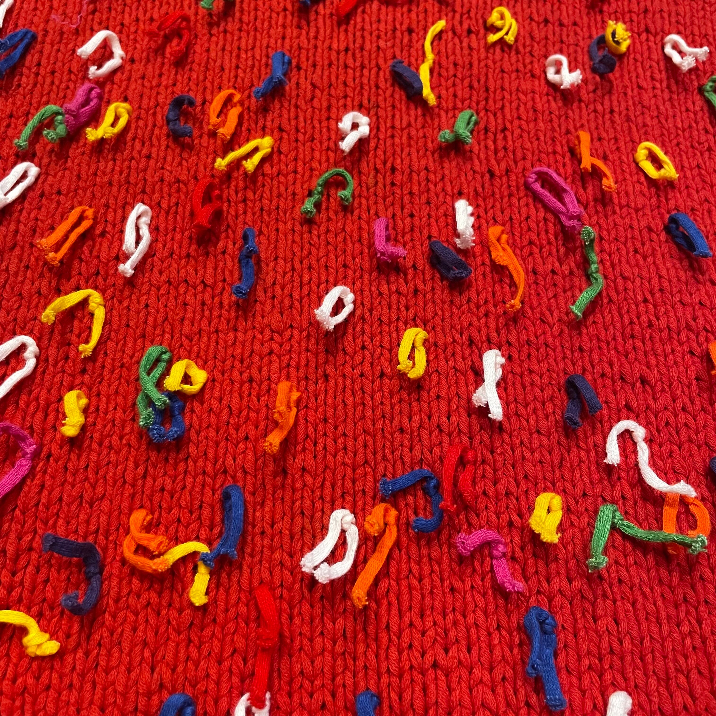 ぴょこぴょこ立体感のあるカラフルな紐がたくさん結んであって、とてもかわいいニットです。