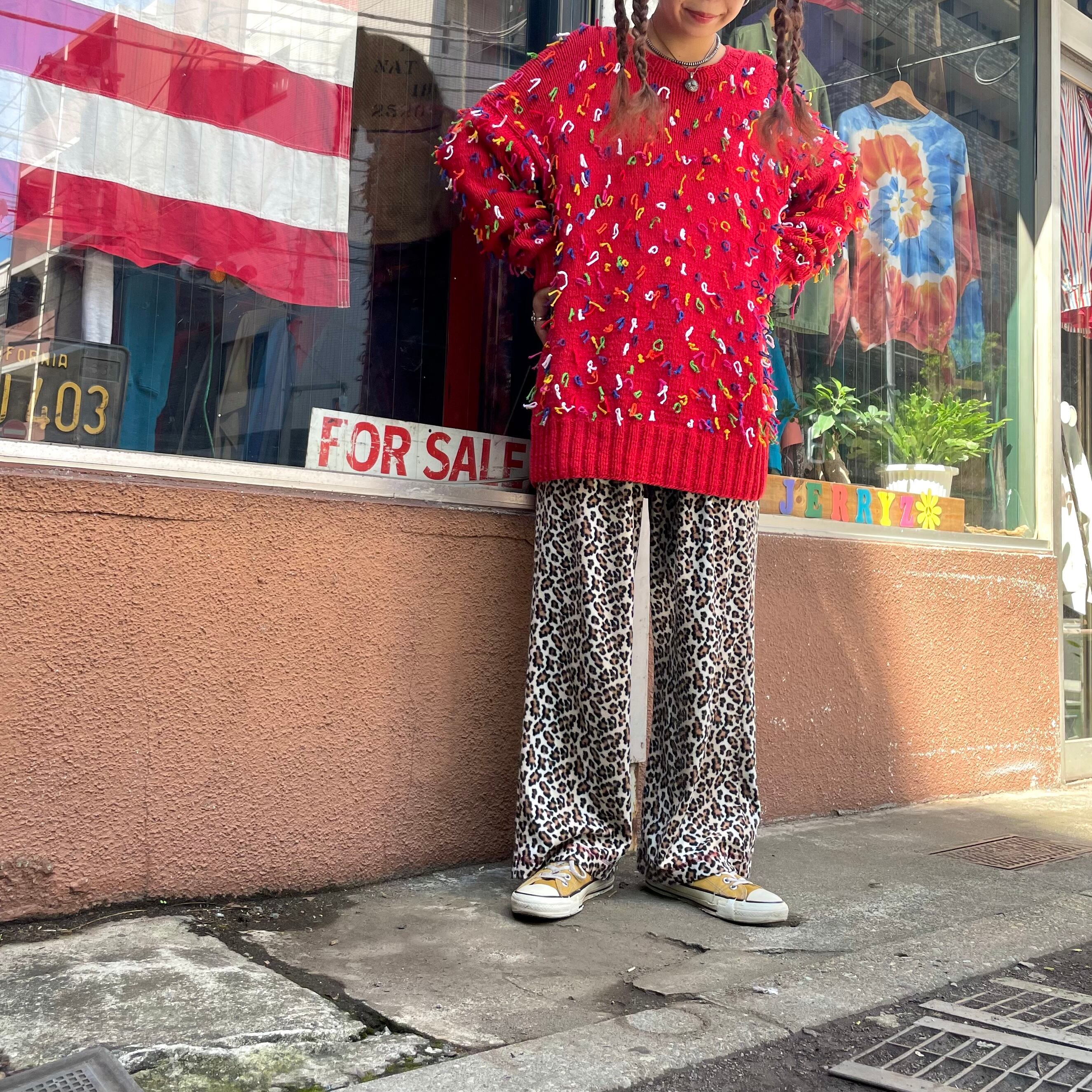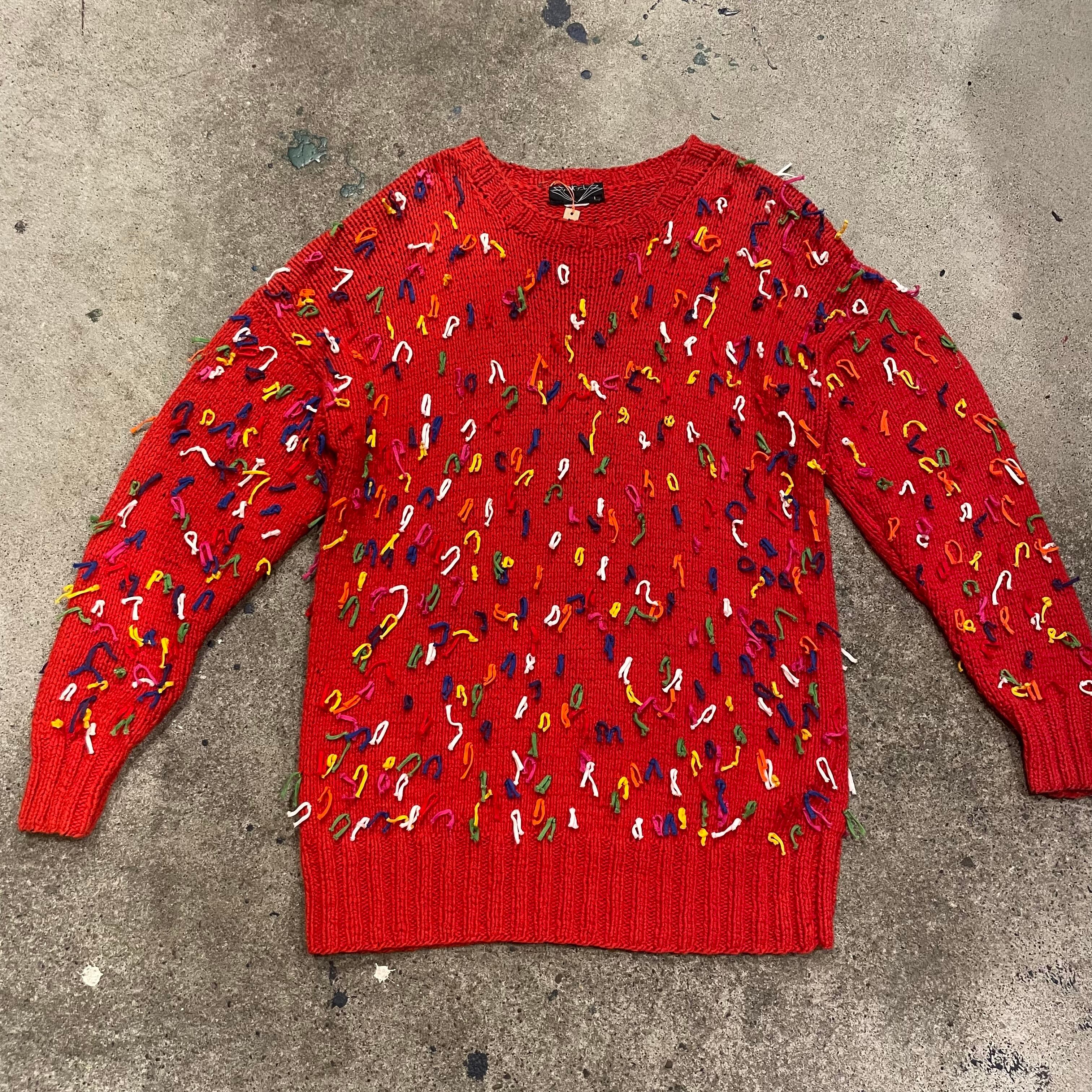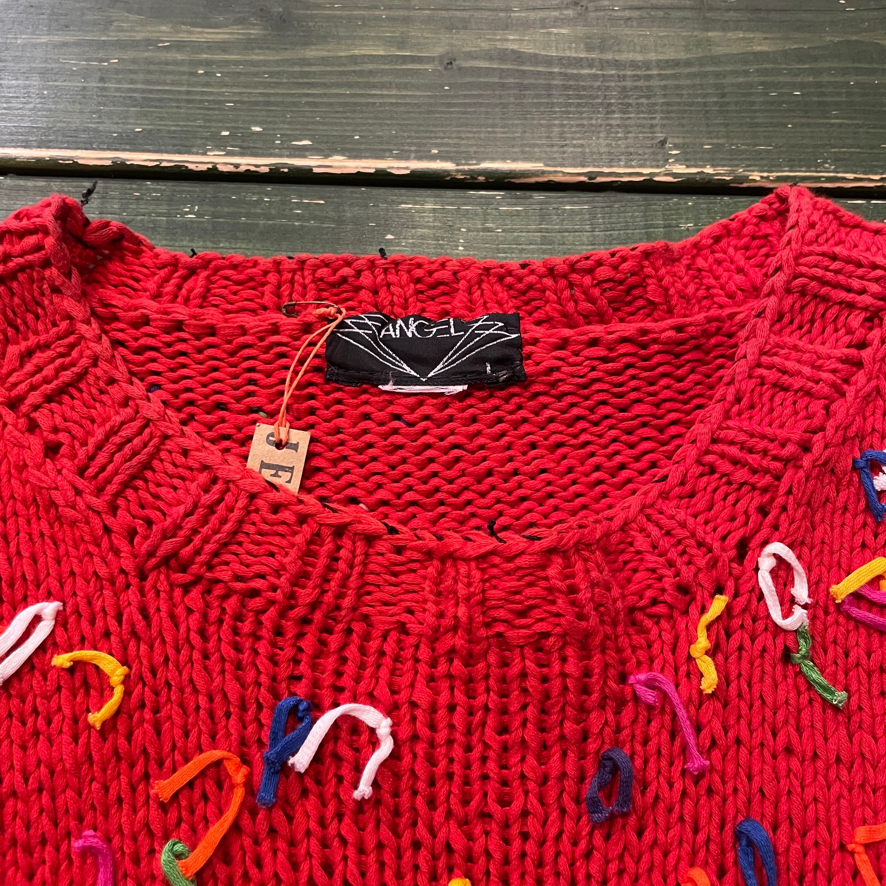 ぴょこぴょこ立体感のあるカラフルな紐がたくさん結んであって、とてもかわいいニットです。