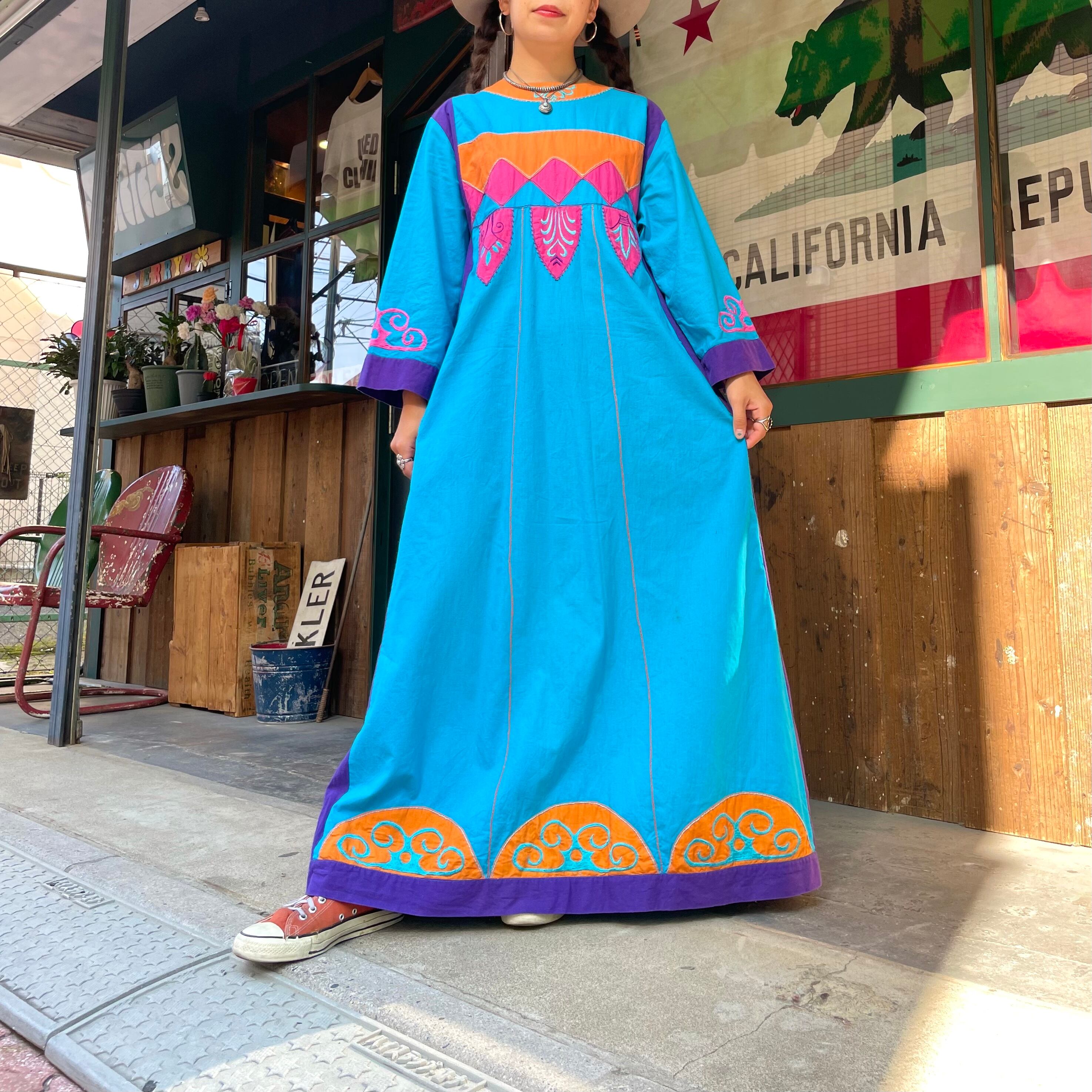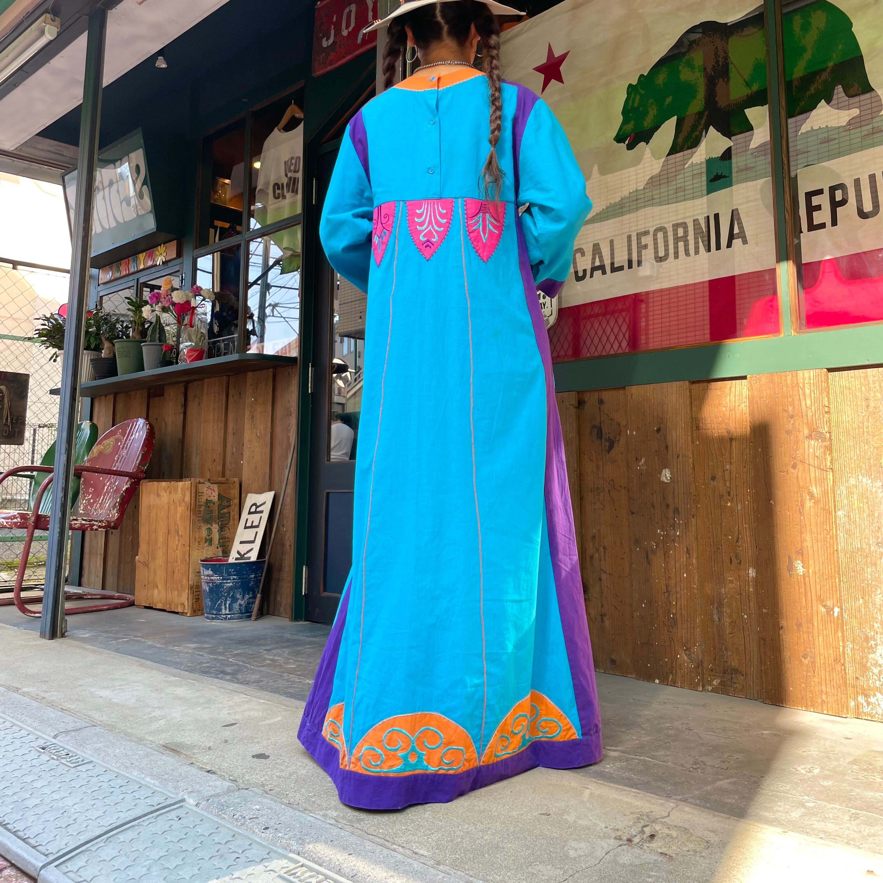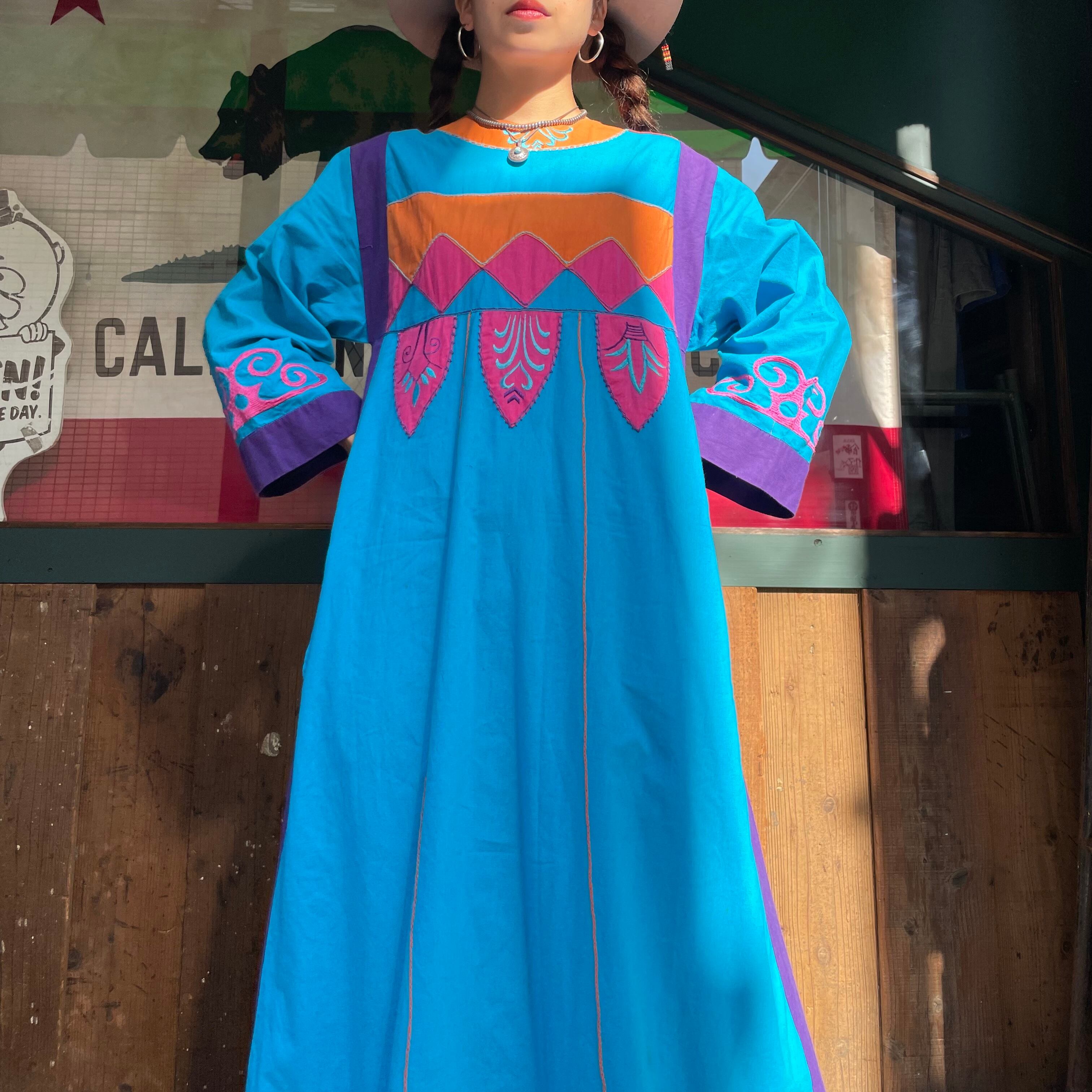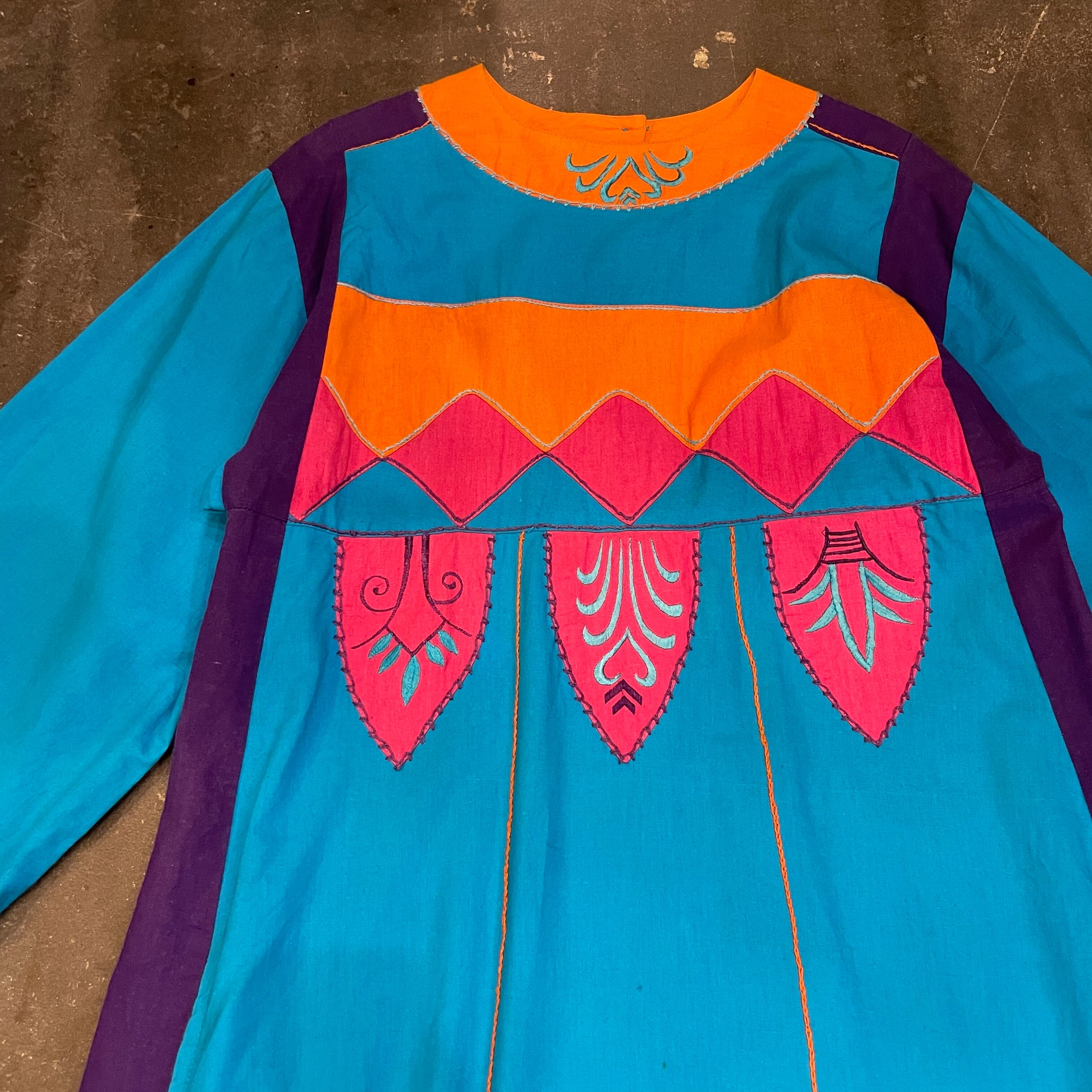色の組み合わせやパッチワーク、手刺繍や機械刺繍のディテールがとてもかわいい70年代頃インド製のワンピースです。