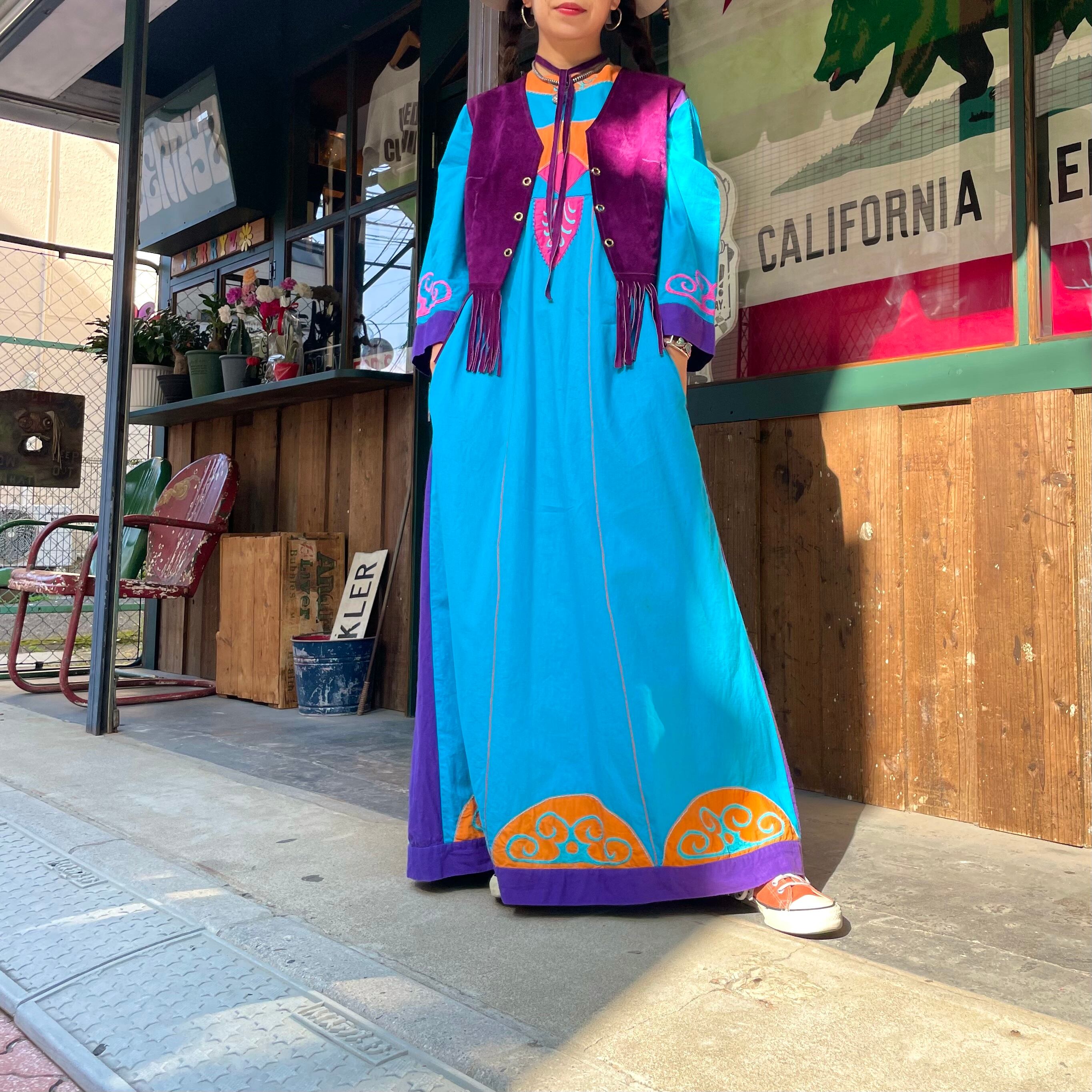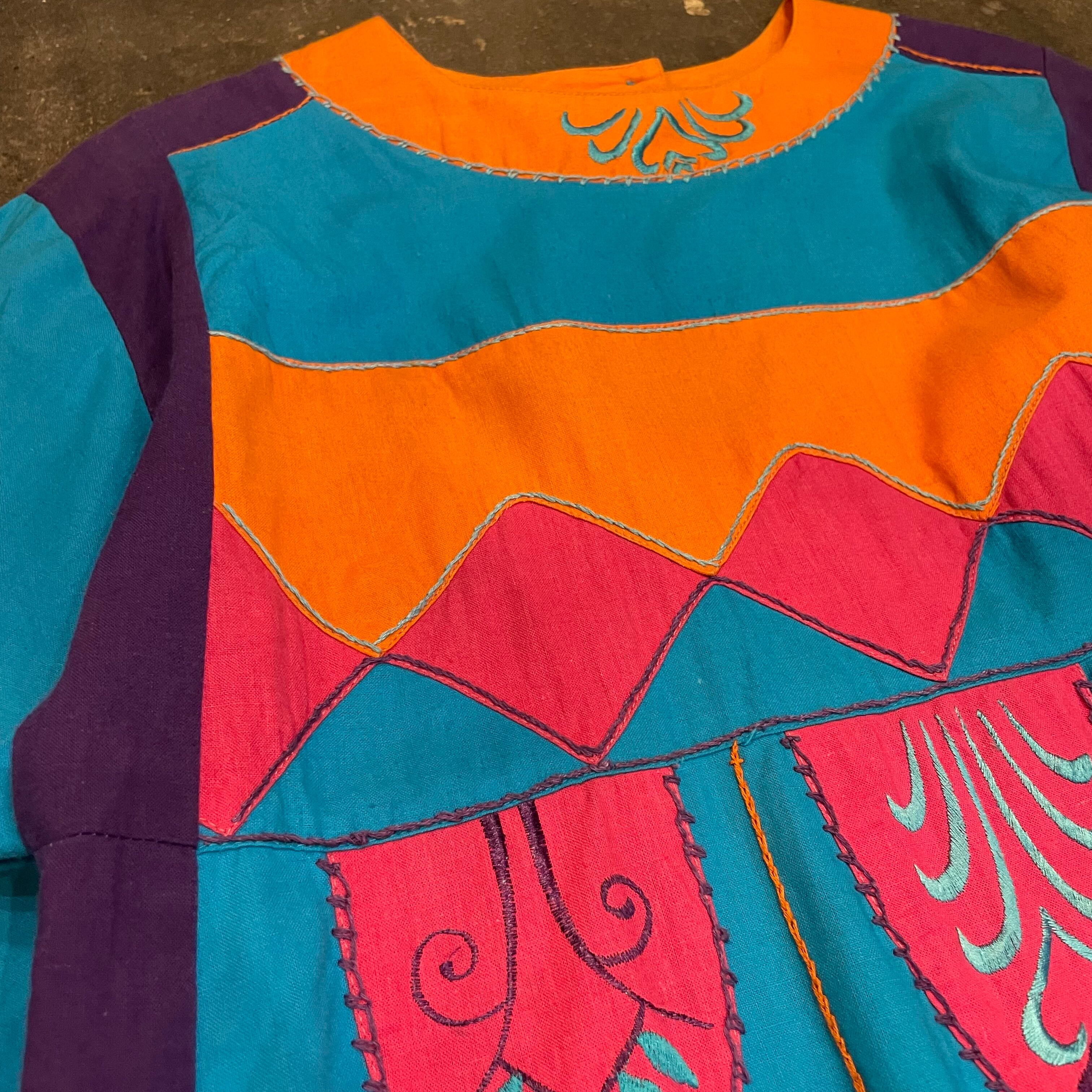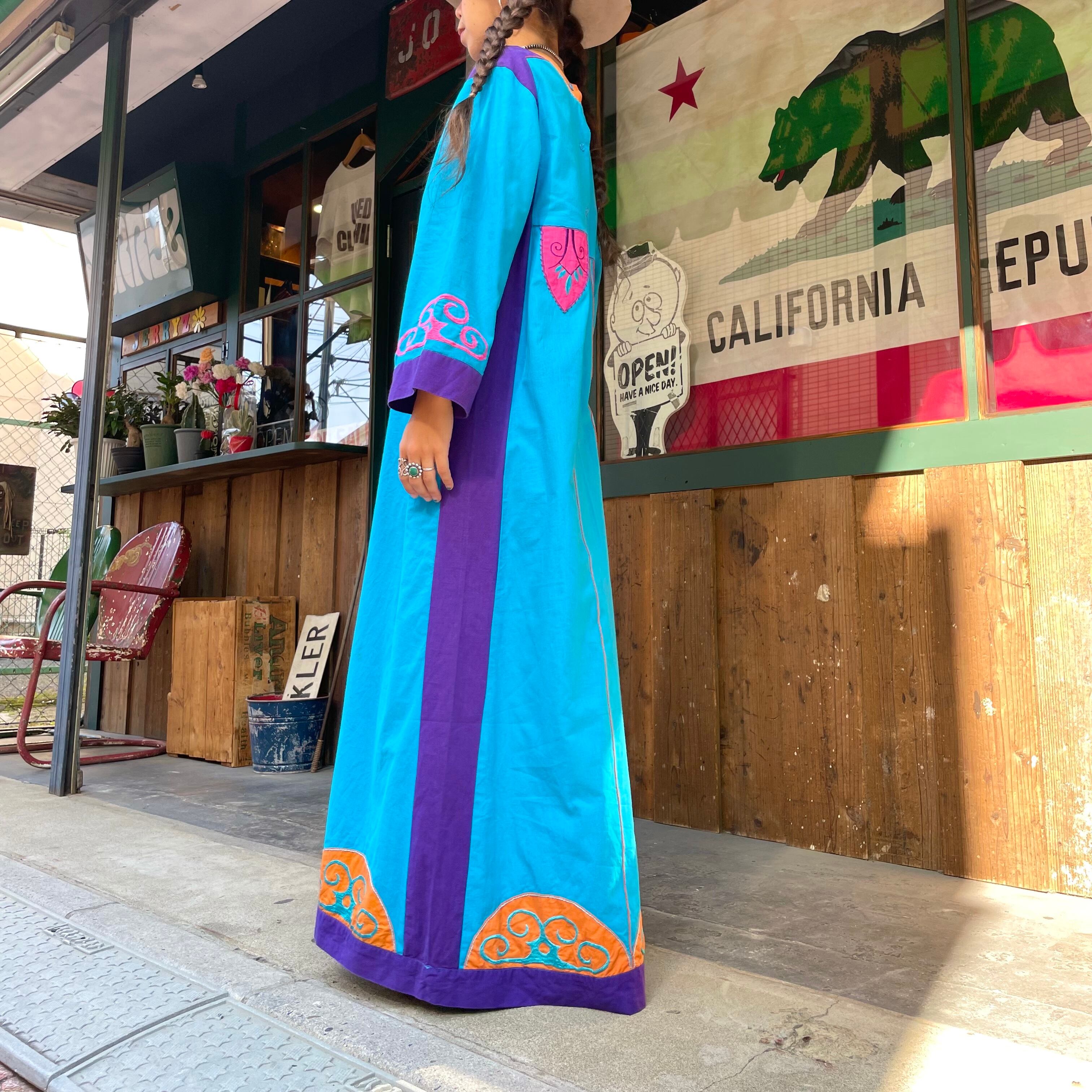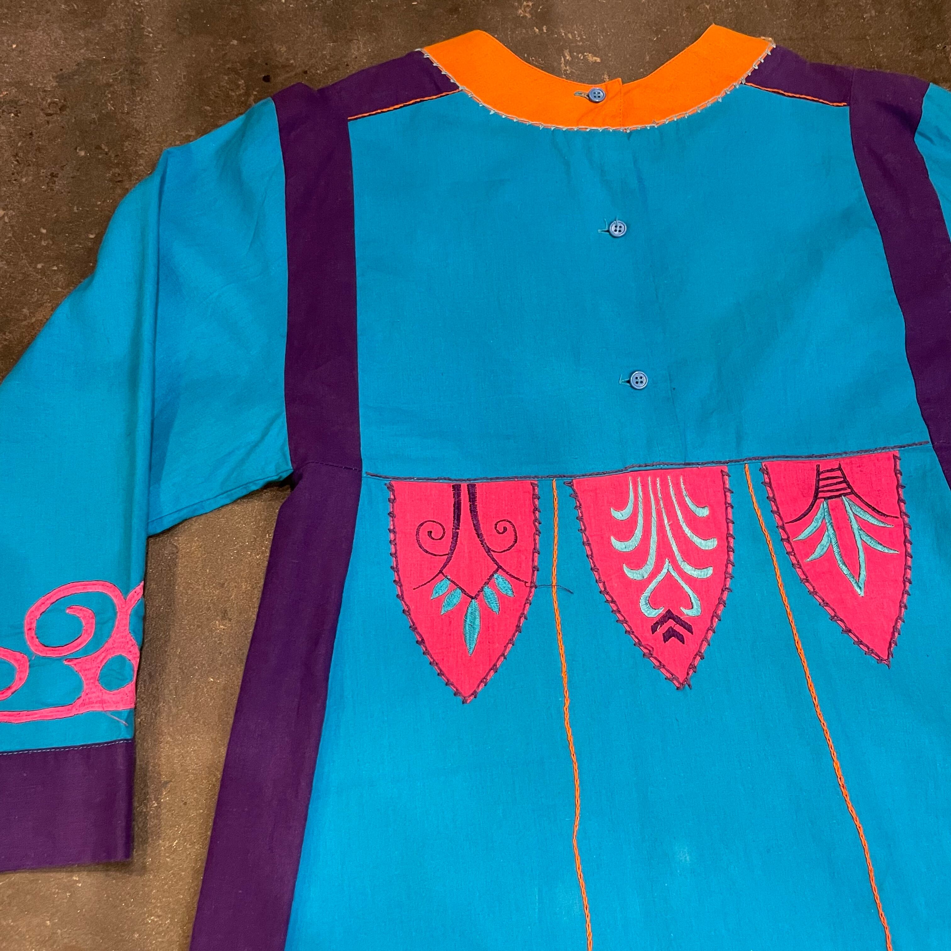 色の組み合わせやパッチワーク、手刺繍や機械刺繍のディテールがとてもかわいい70年代頃インド製のワンピースです。