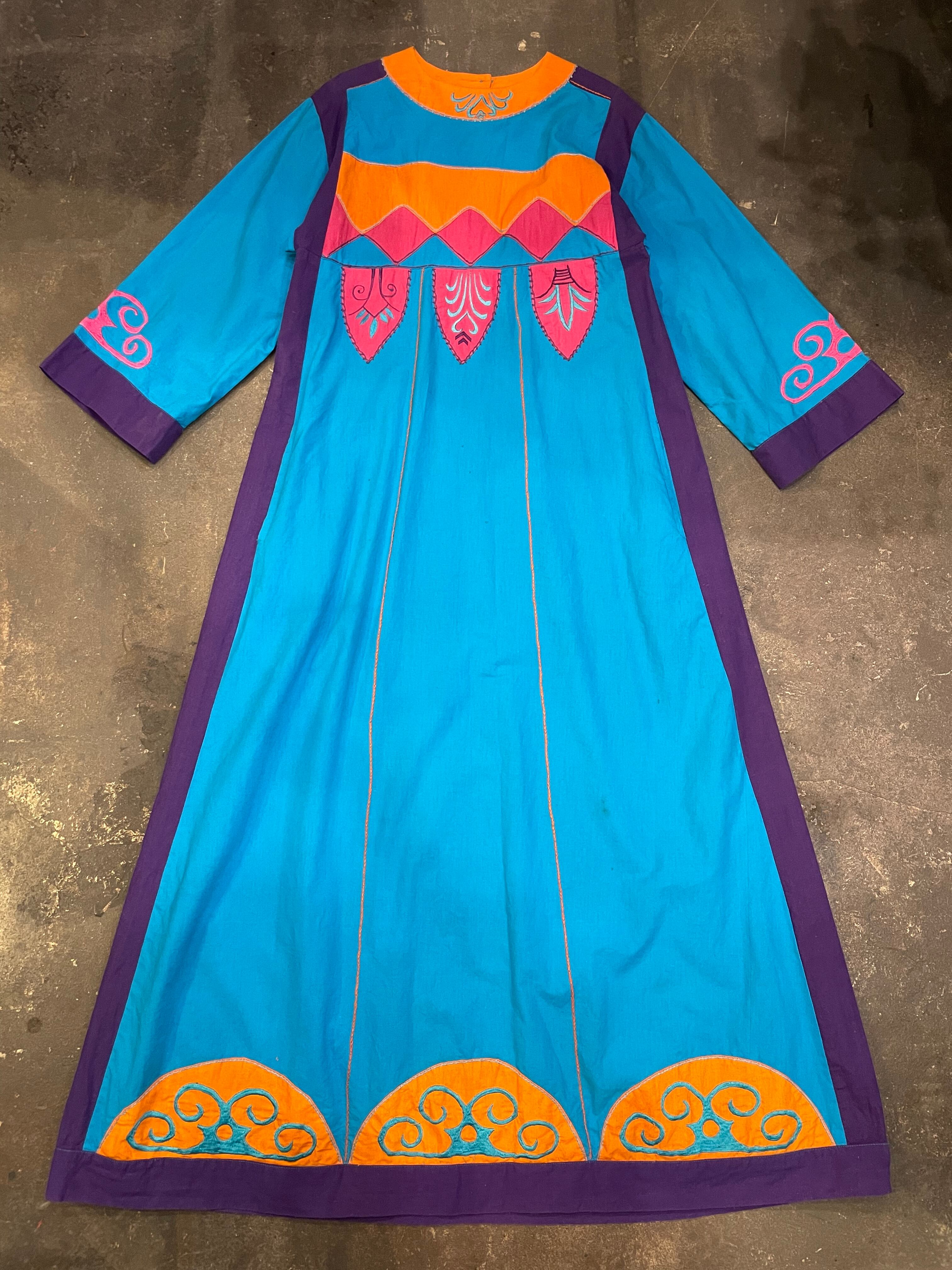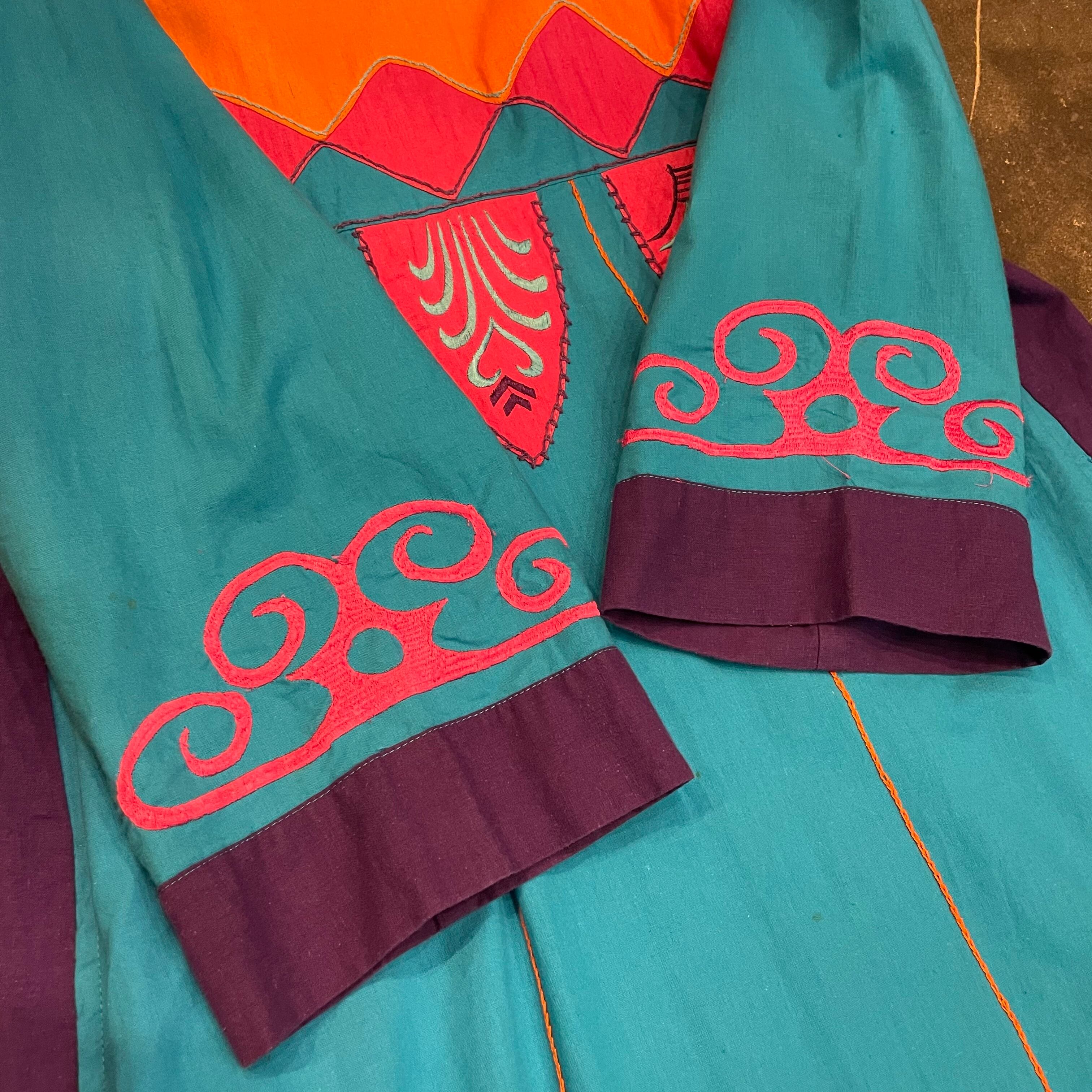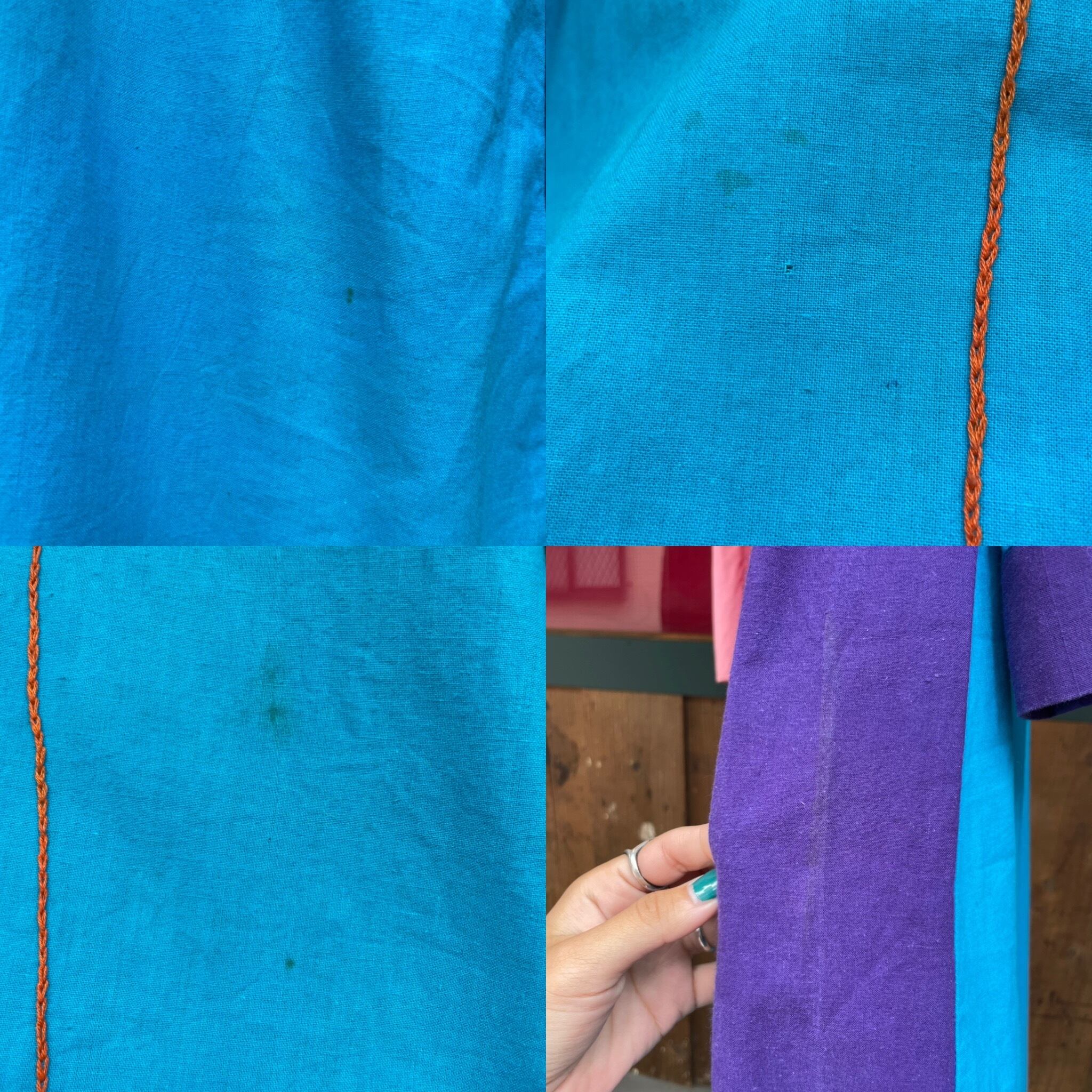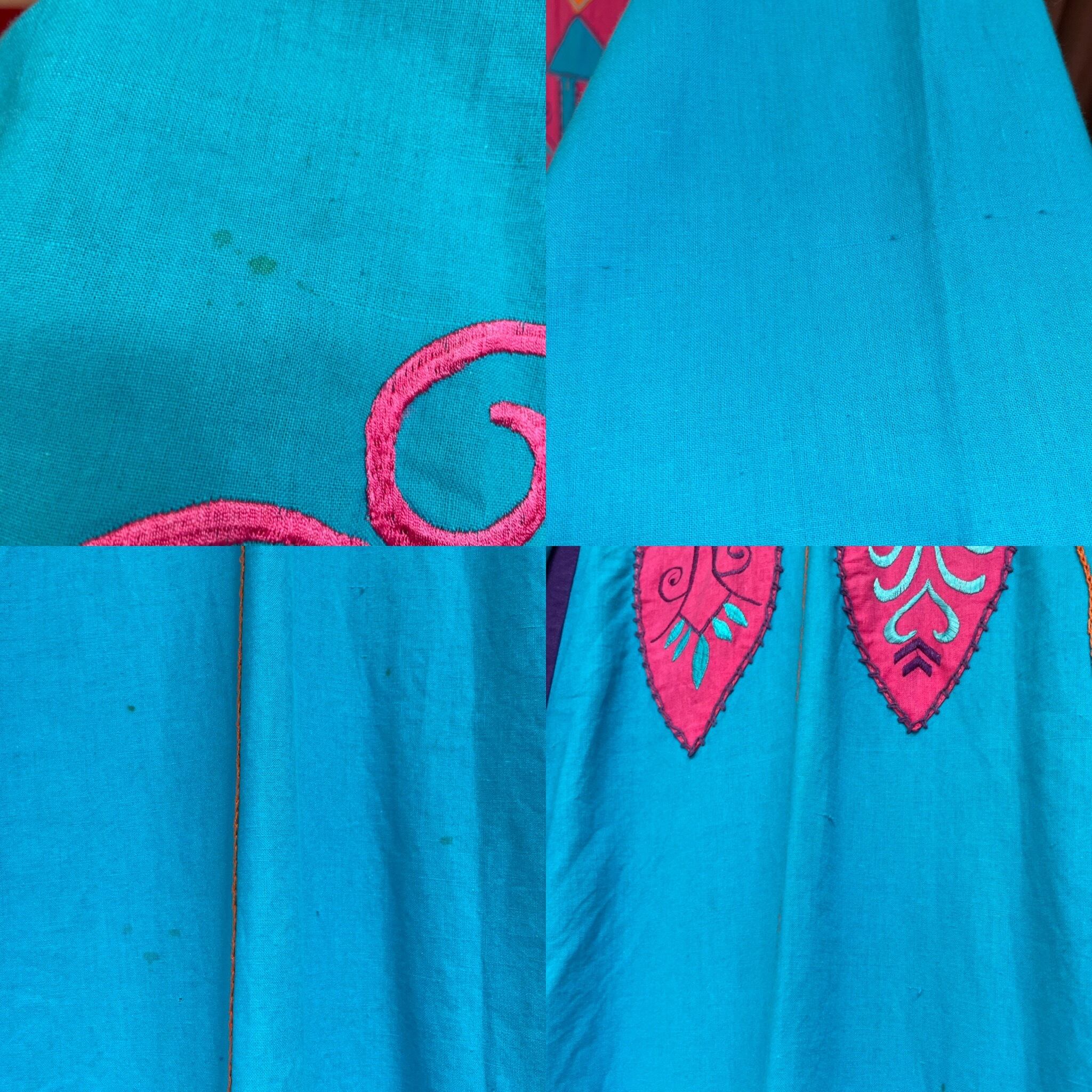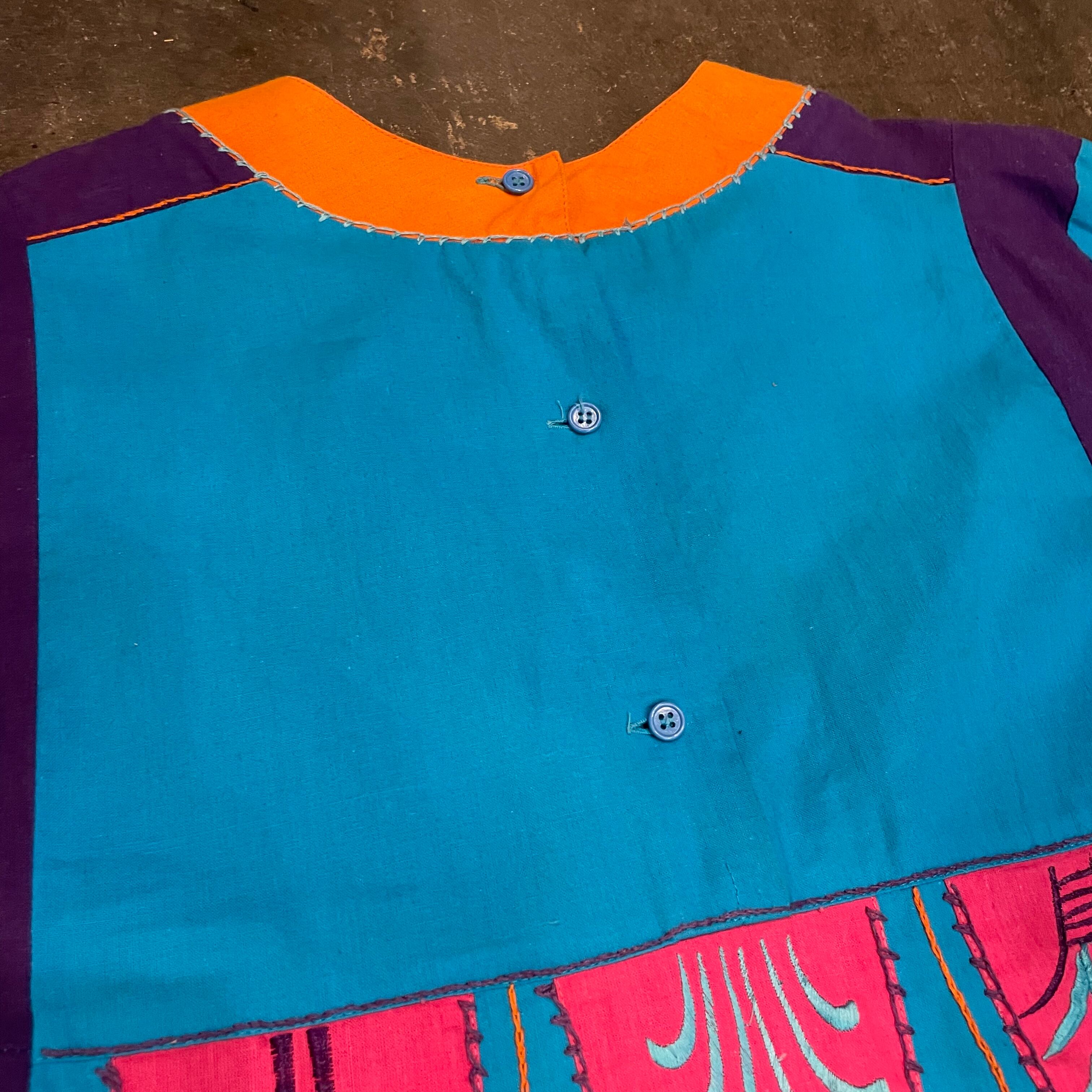 色の組み合わせやパッチワーク、手刺繍や機械刺繍のディテールがとてもかわいい70年代頃インド製のワンピースです。