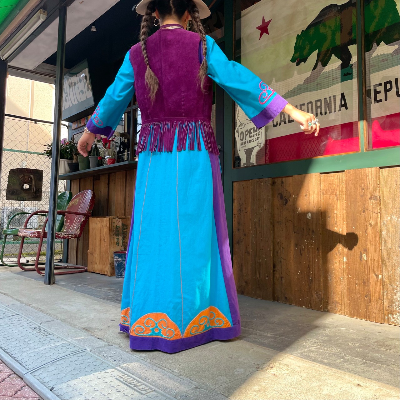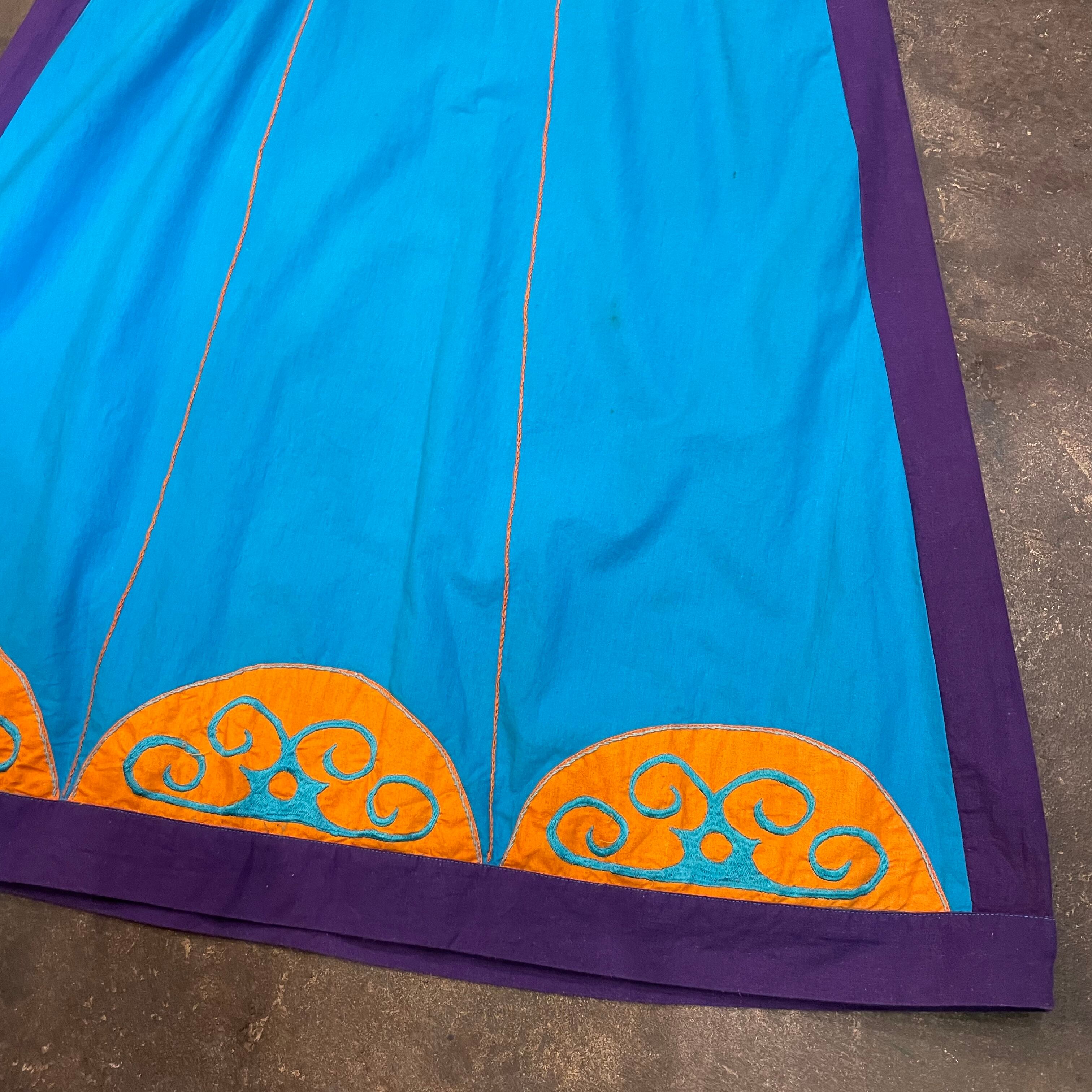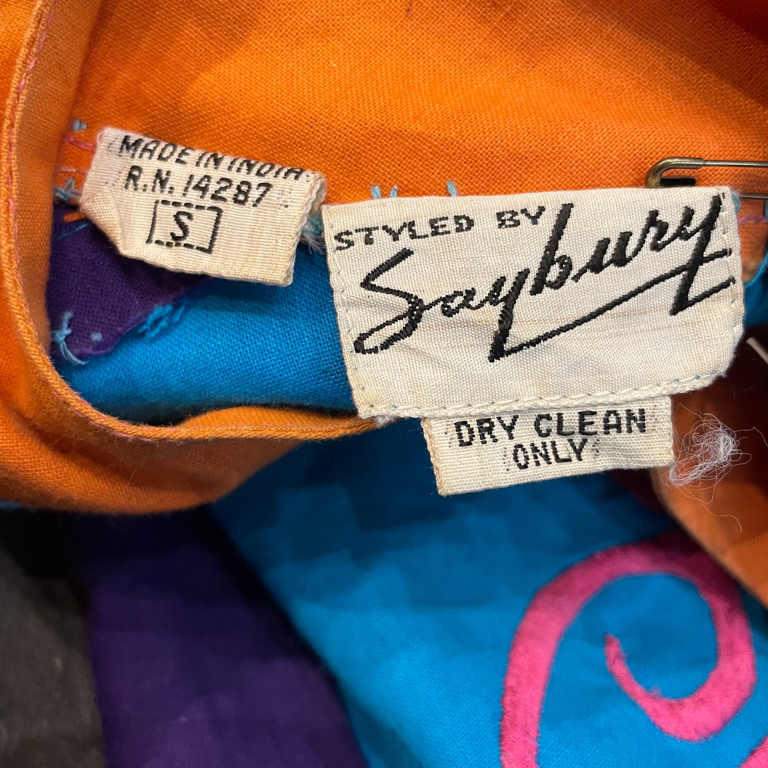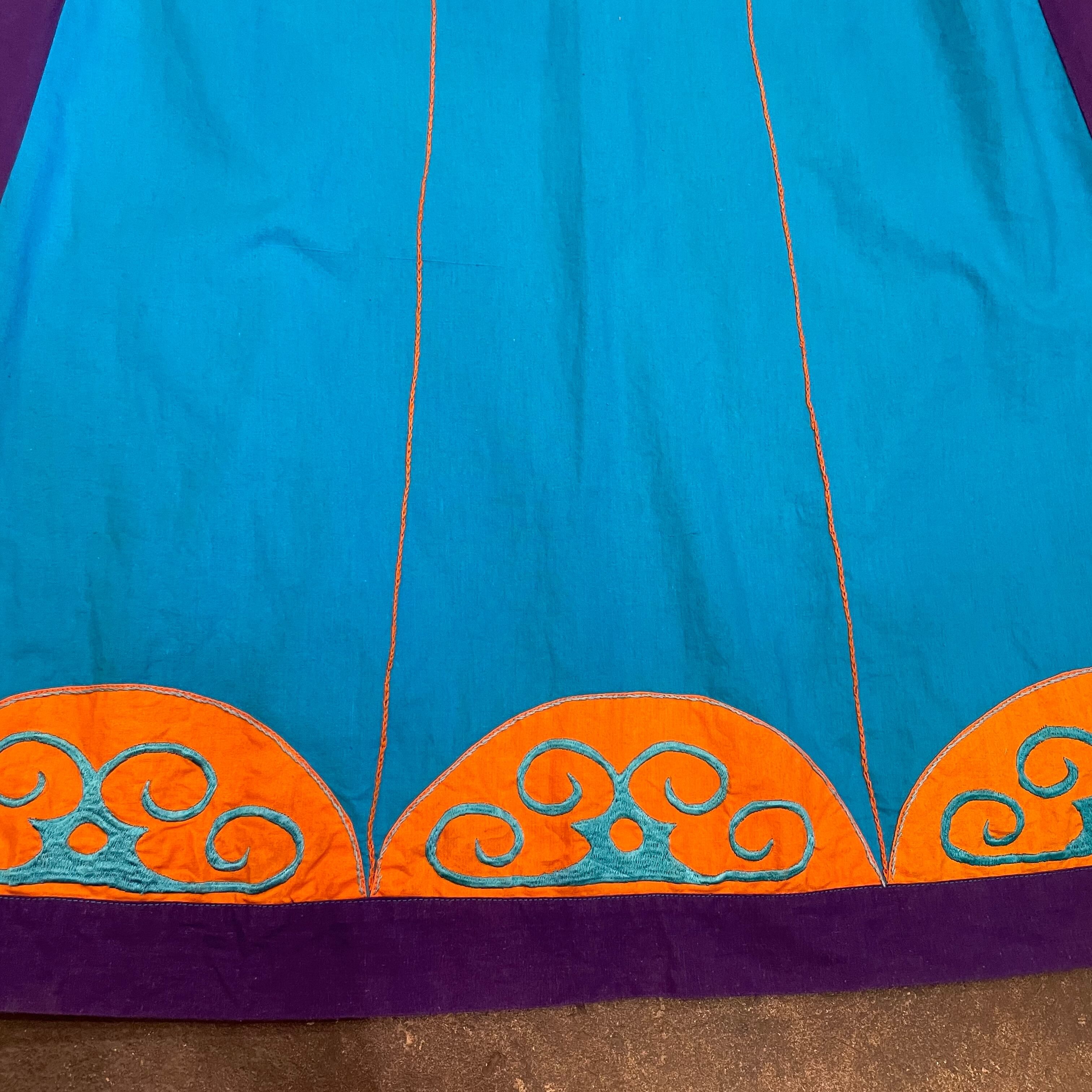 色の組み合わせやパッチワーク、手刺繍や機械刺繍のディテールがとてもかわいい70年代頃インド製のワンピースです。