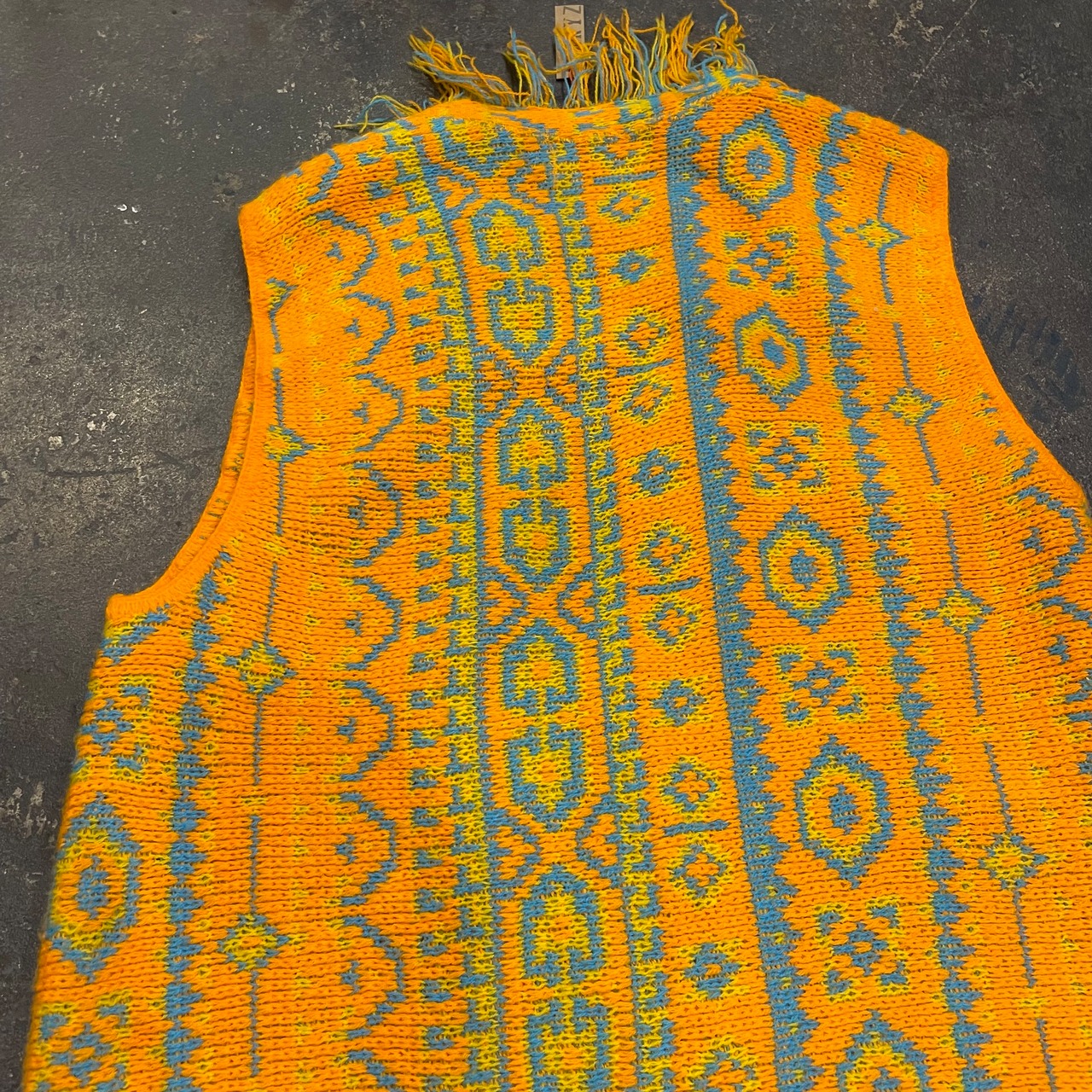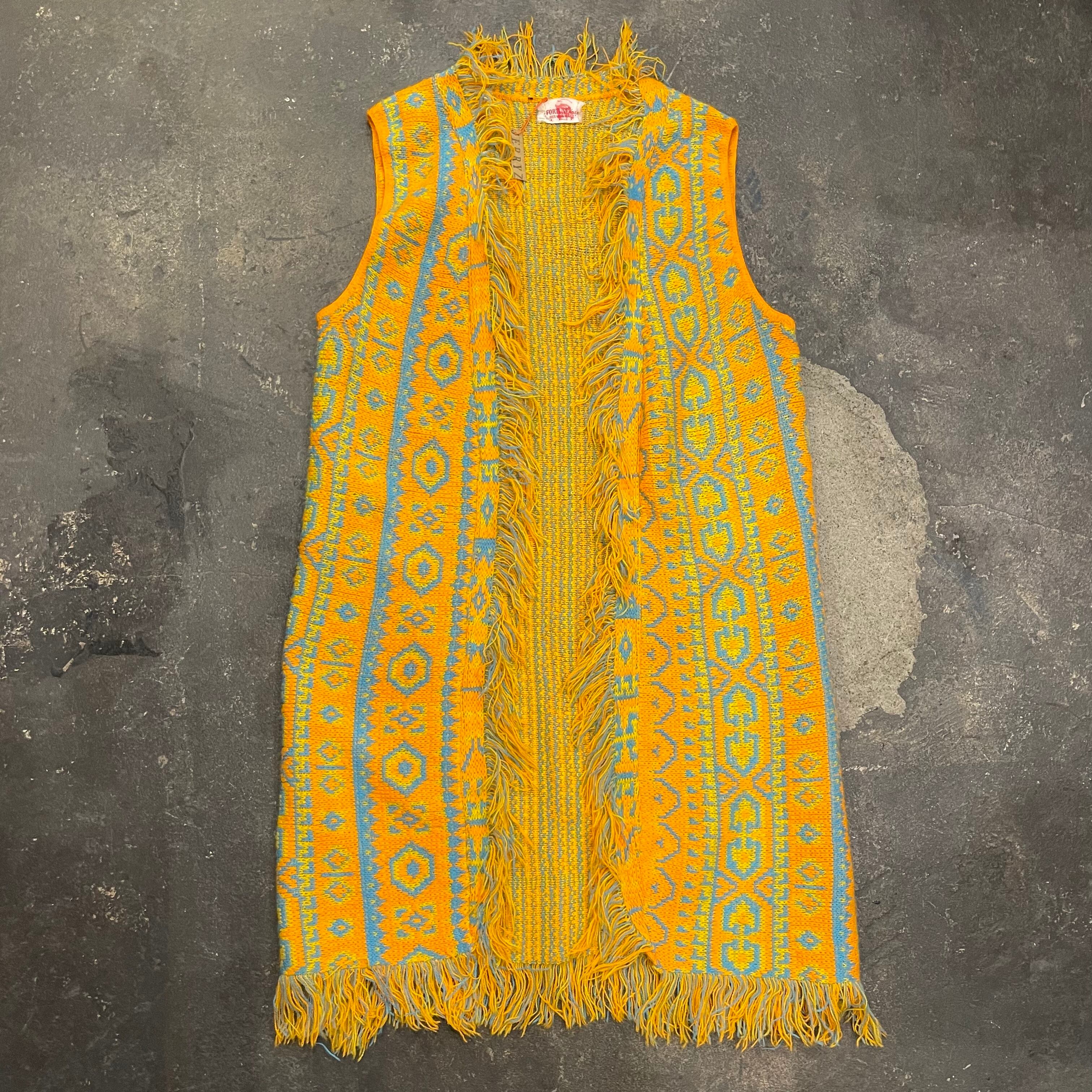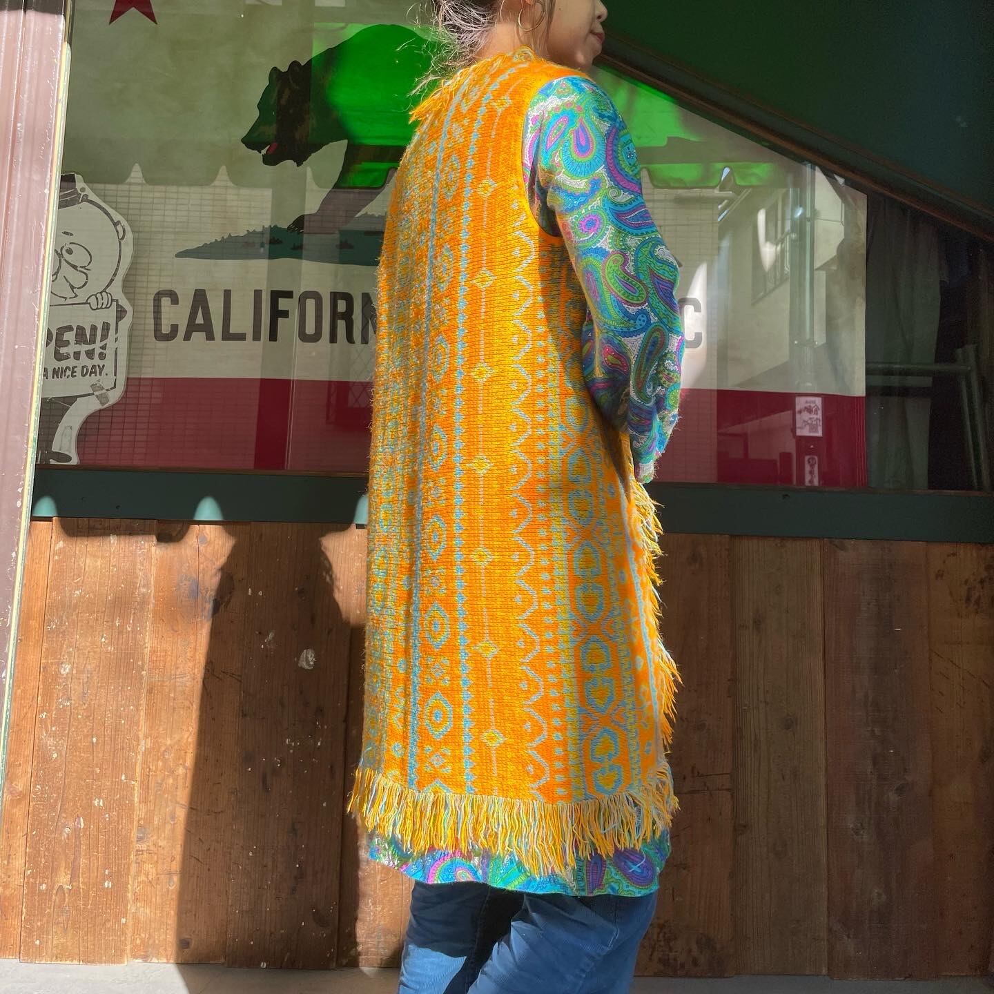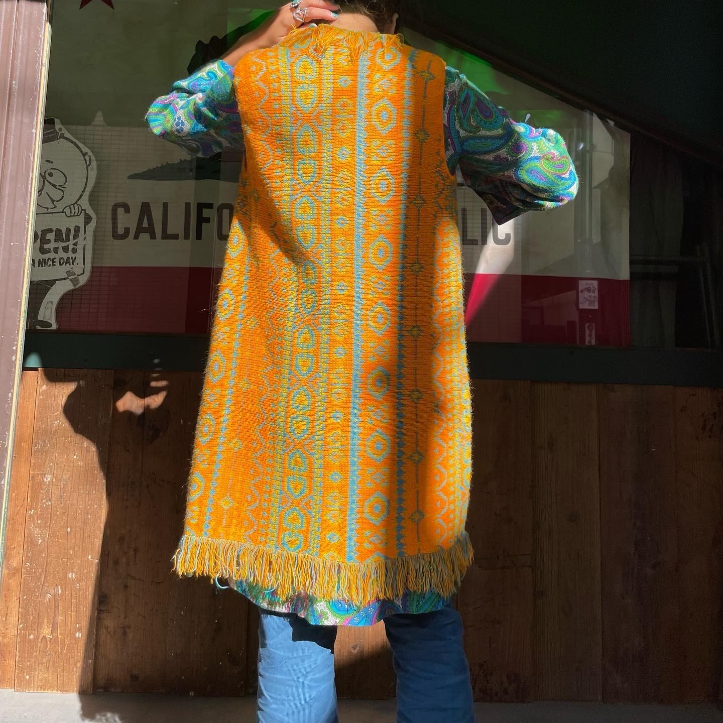 ハッピーな色味の幾何学模様がとてもかわいいアクリルニットのロングベストです。