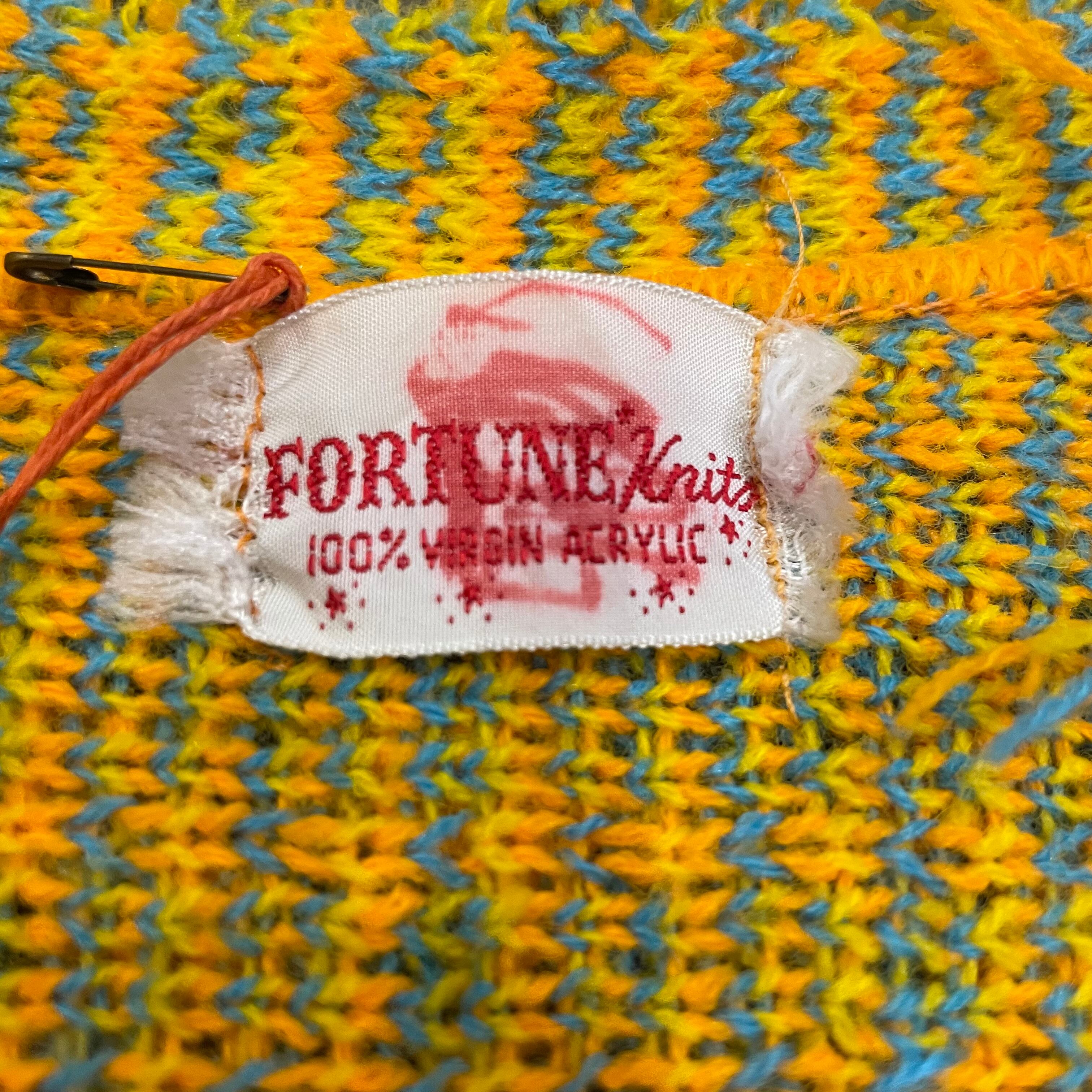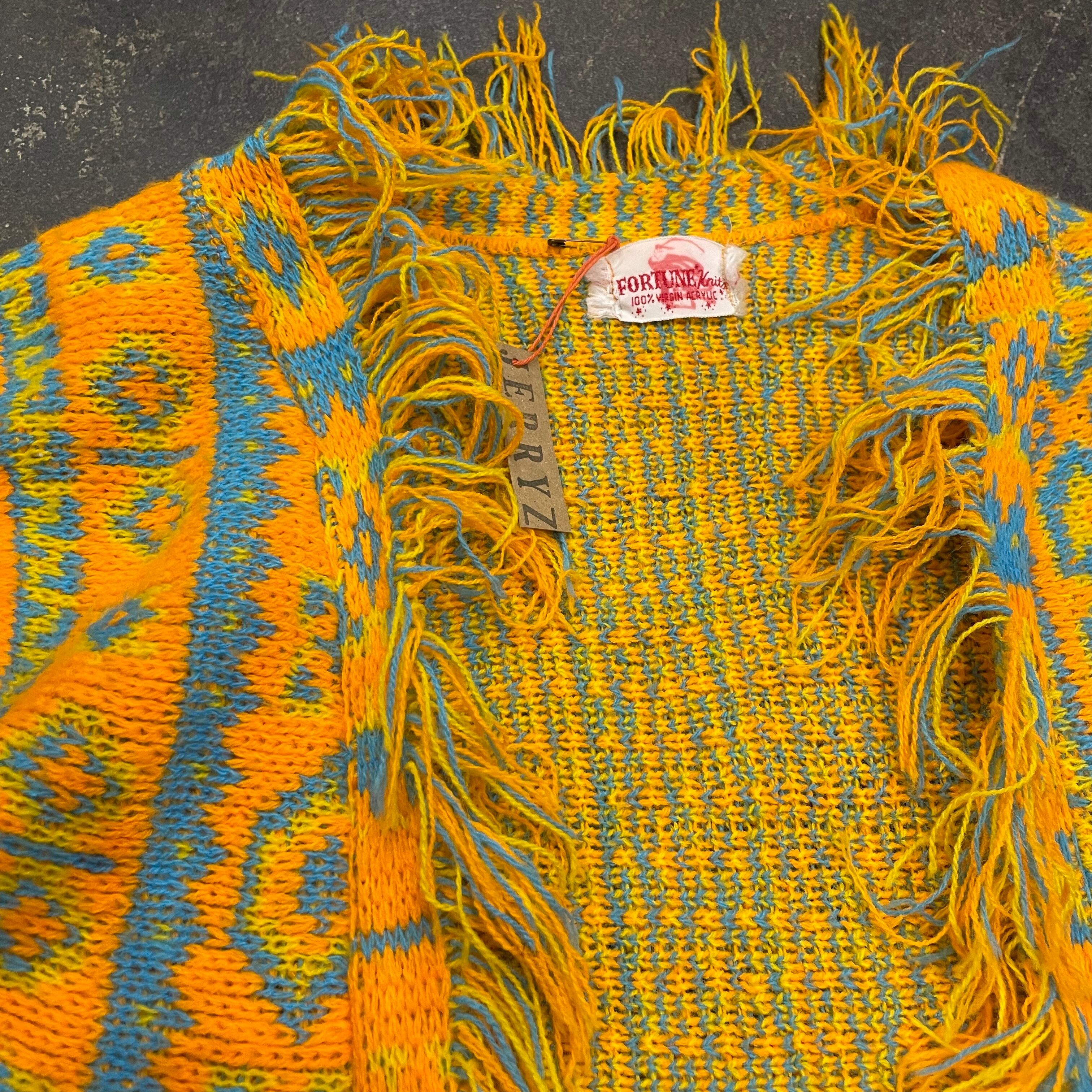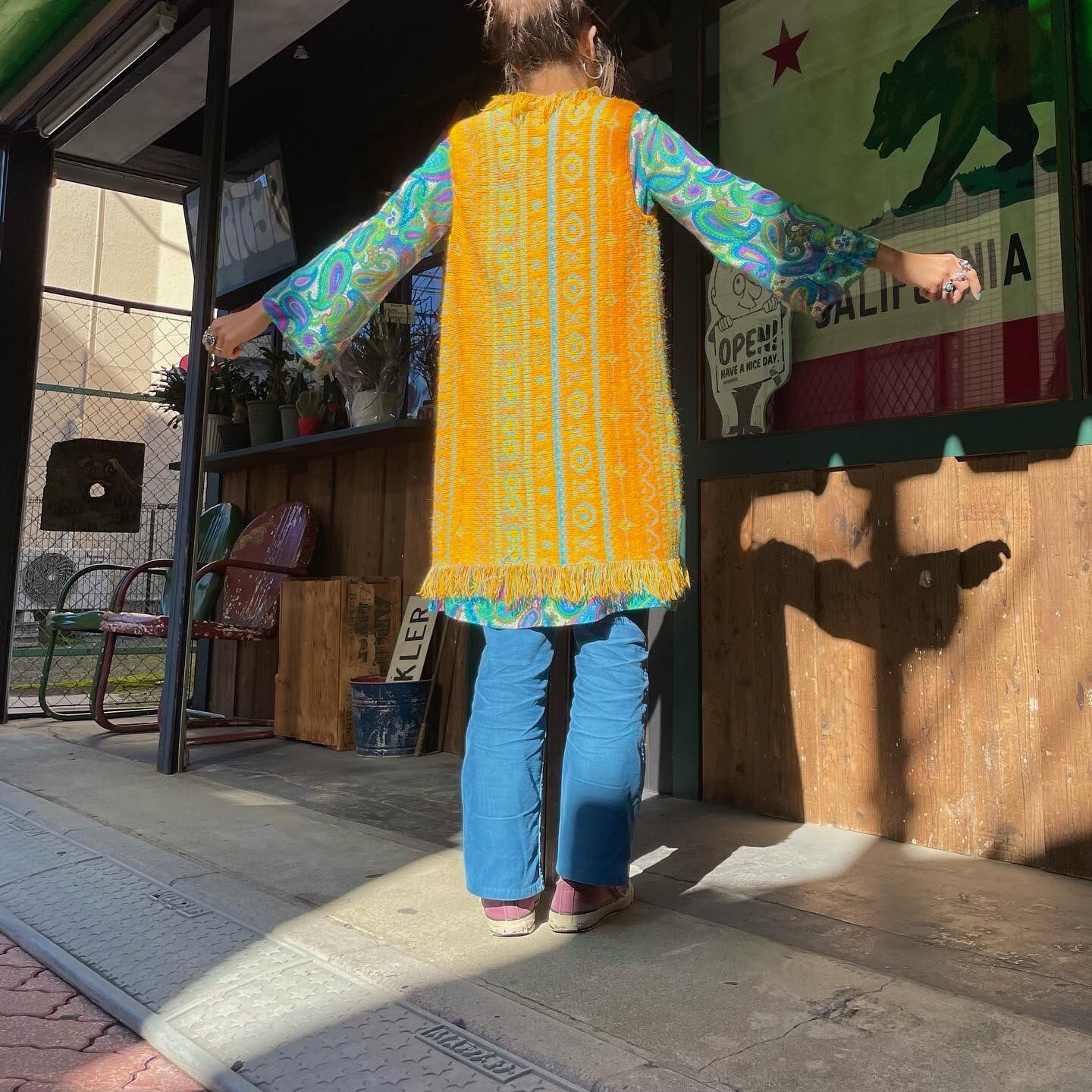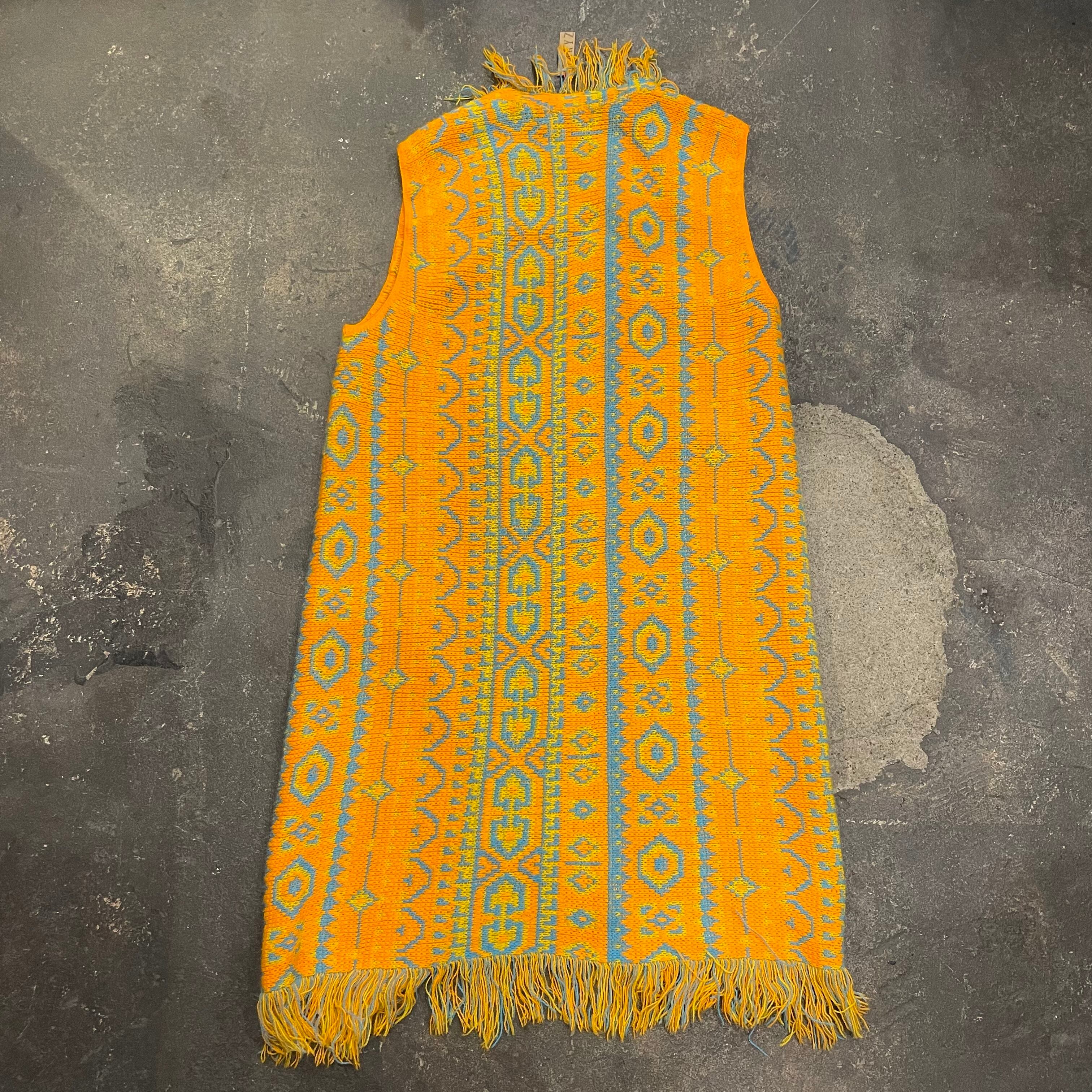 ハッピーな色味の幾何学模様がとてもかわいいアクリルニットのロングベストです。