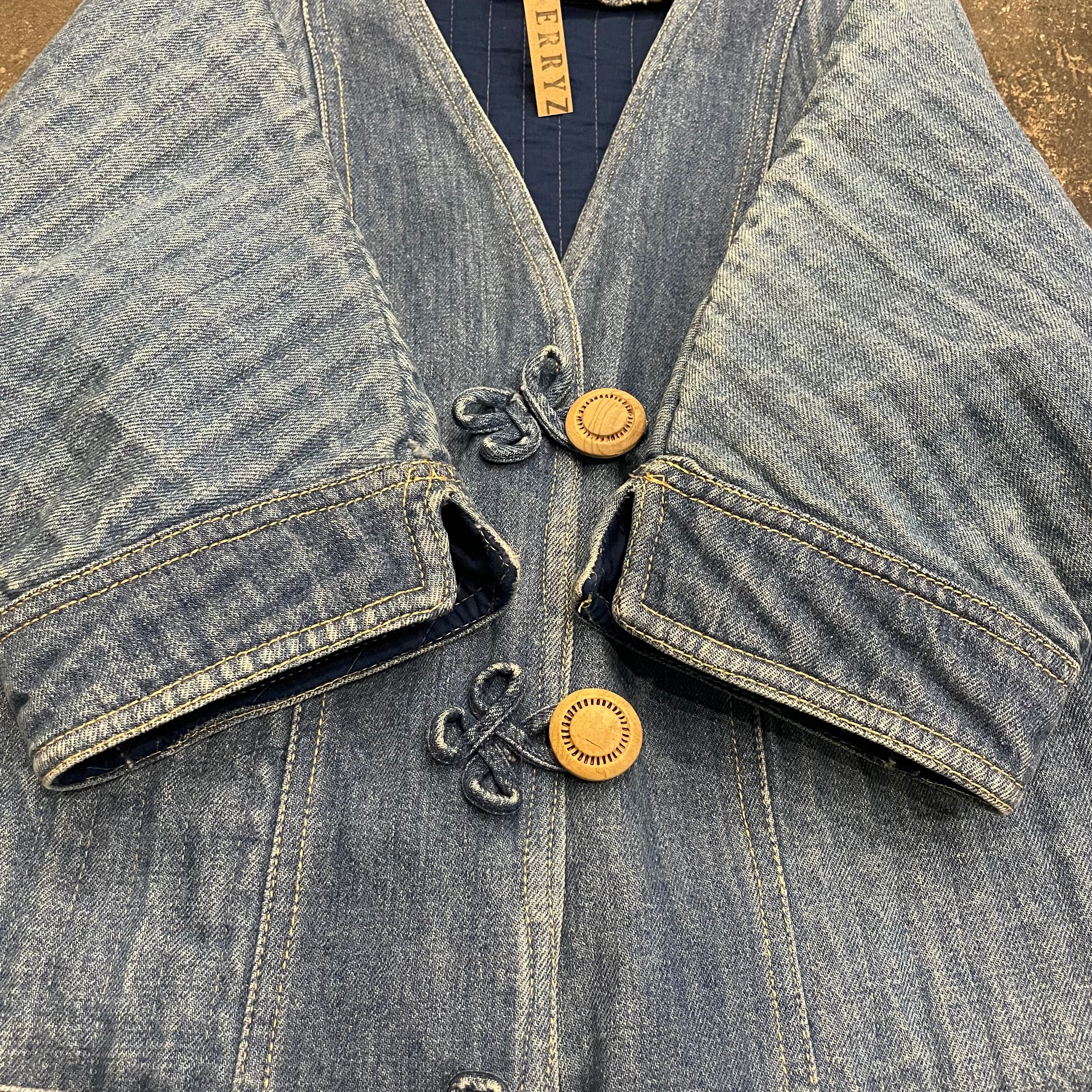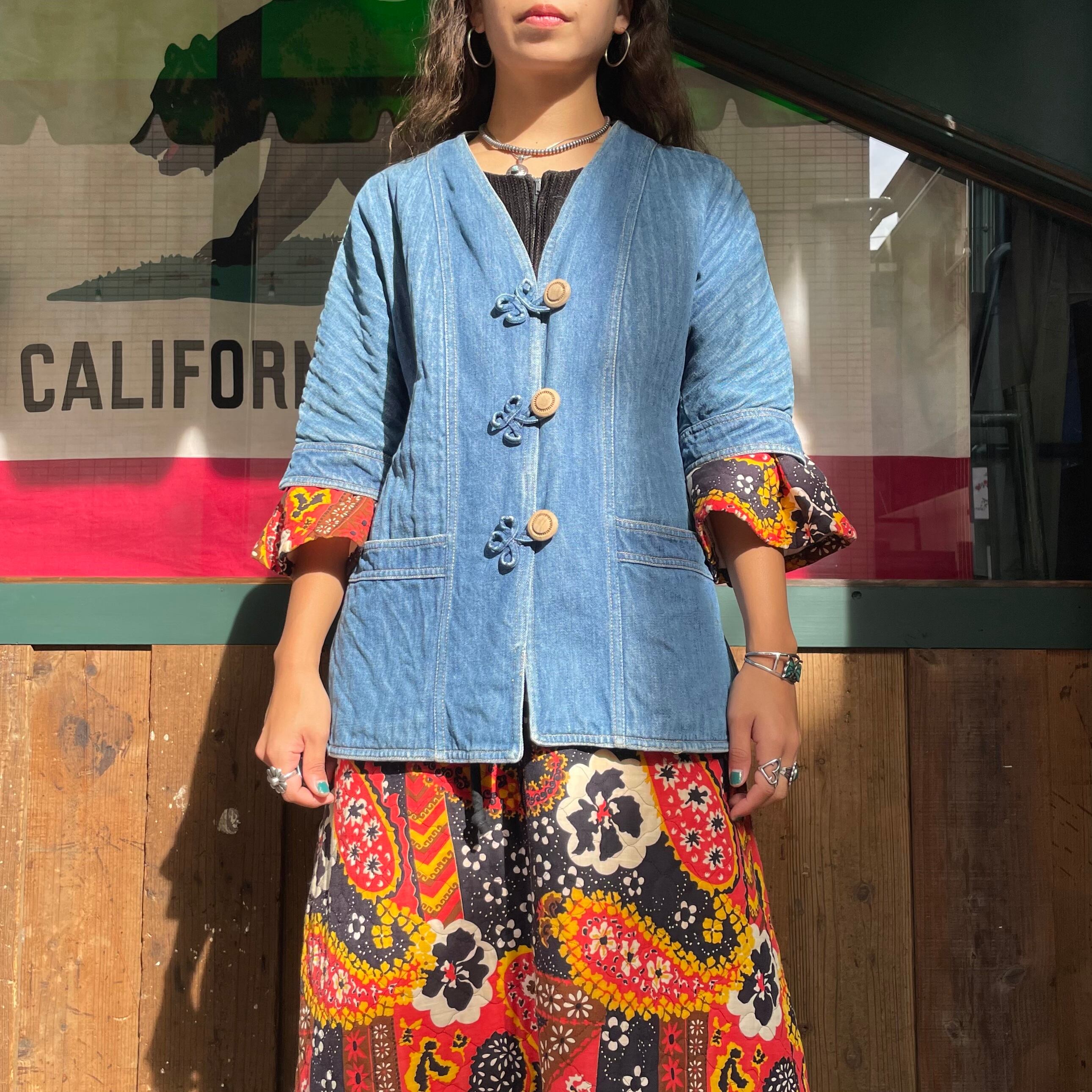 薄いキルティングになっていて若干凹凸のある生地感も、五分丈の袖も、チャイナボタンのようなデザインも全部が不思議な雰囲気でとてもかわいい一枚です。