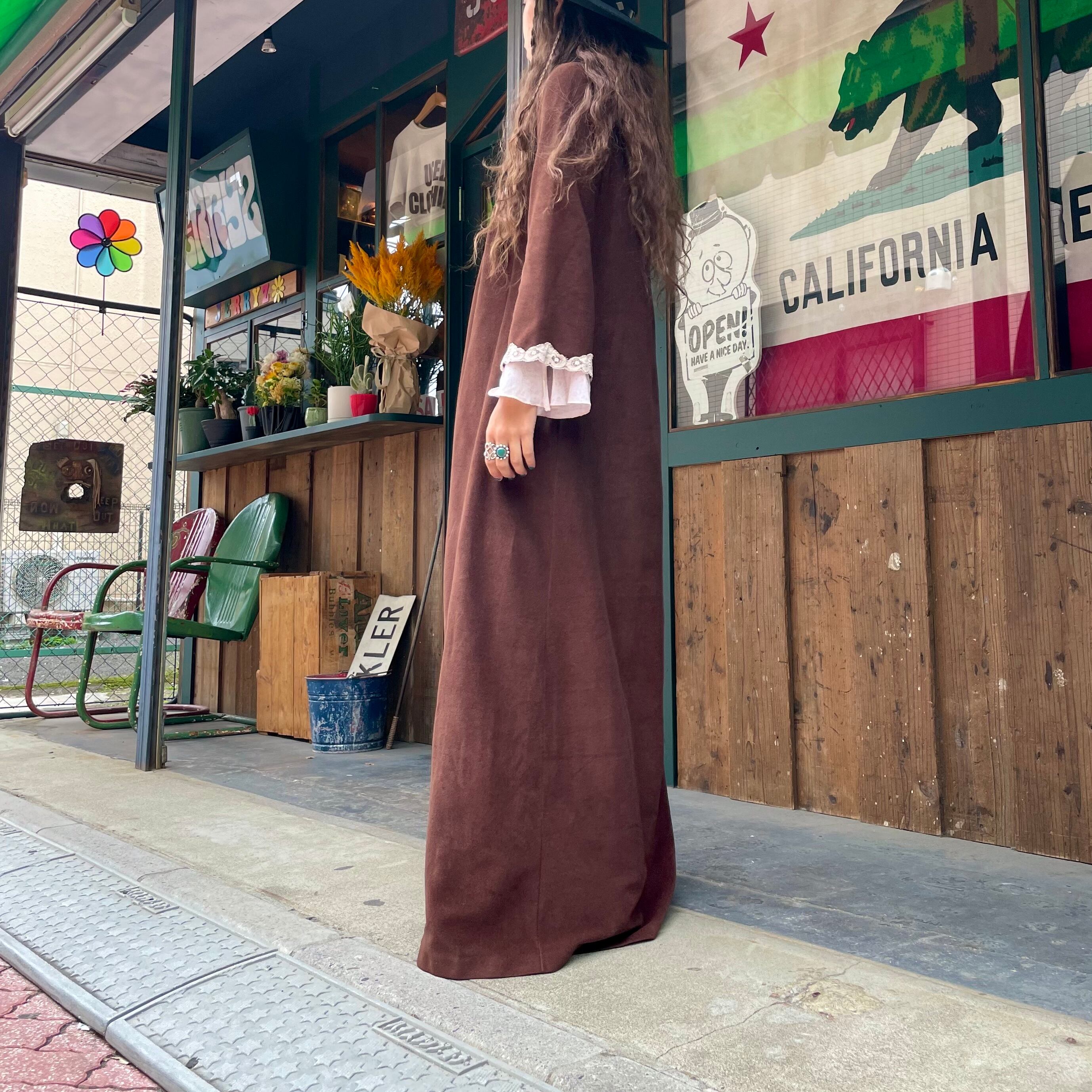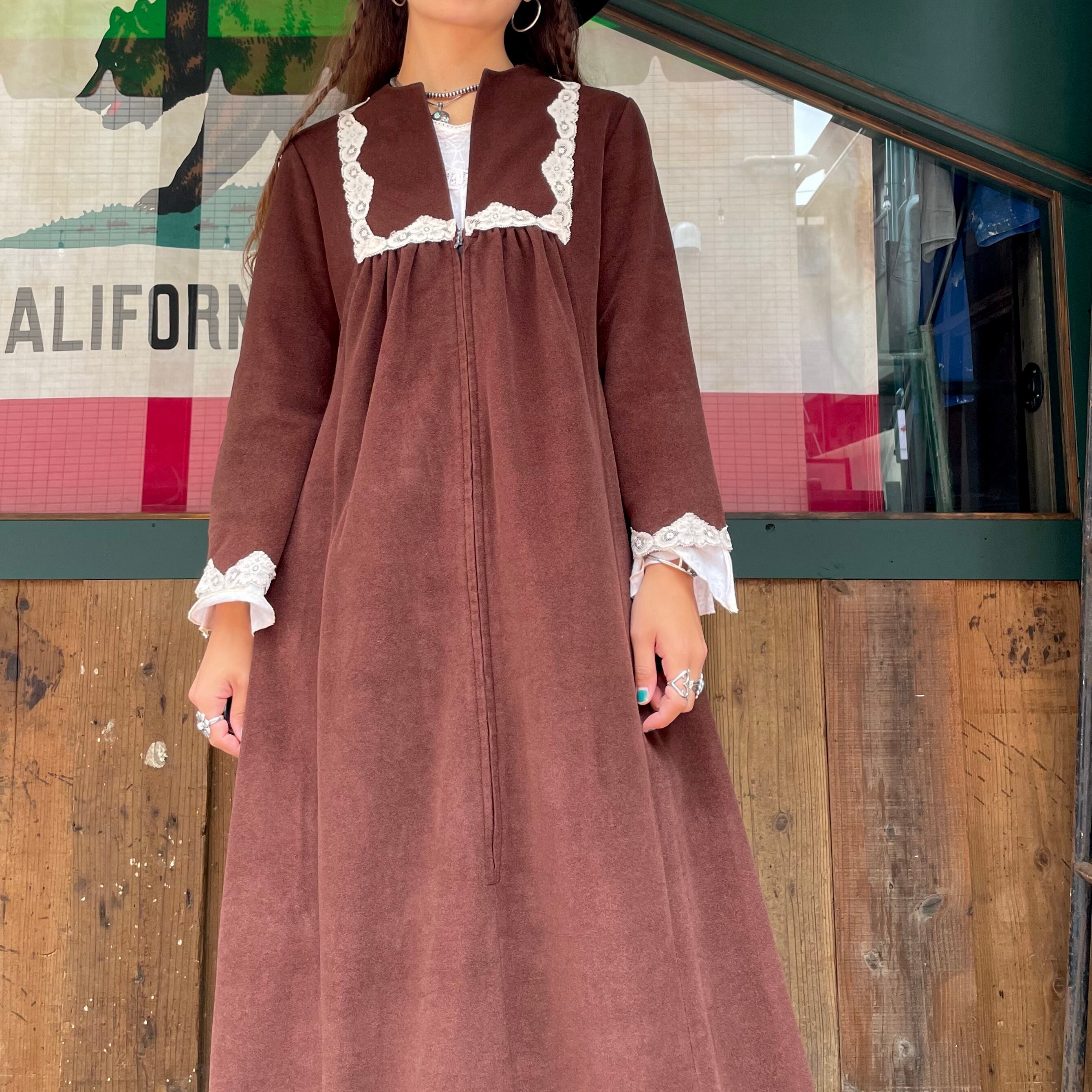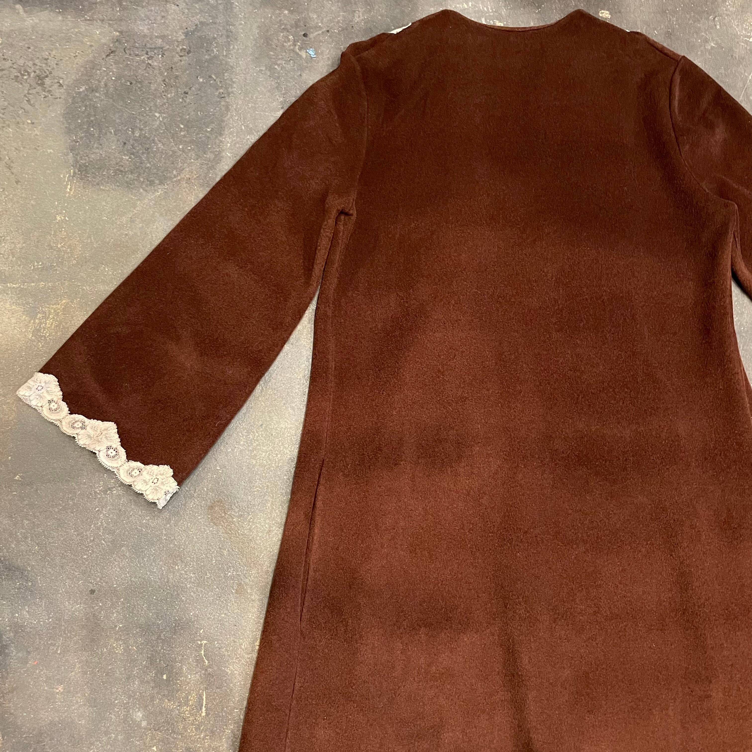 茶色の薄いフリースのような生地感にレースの装飾がかわいいワンピースです。