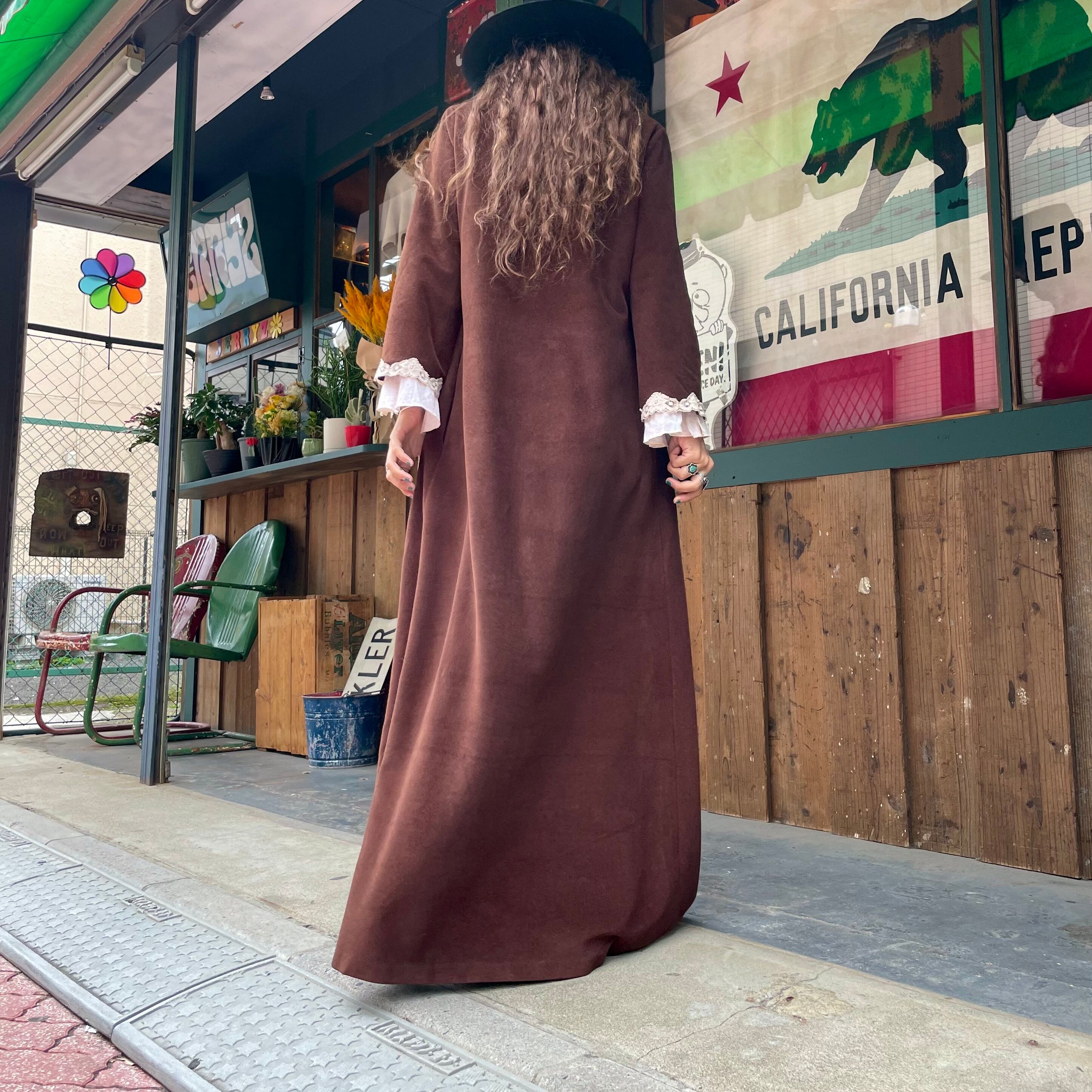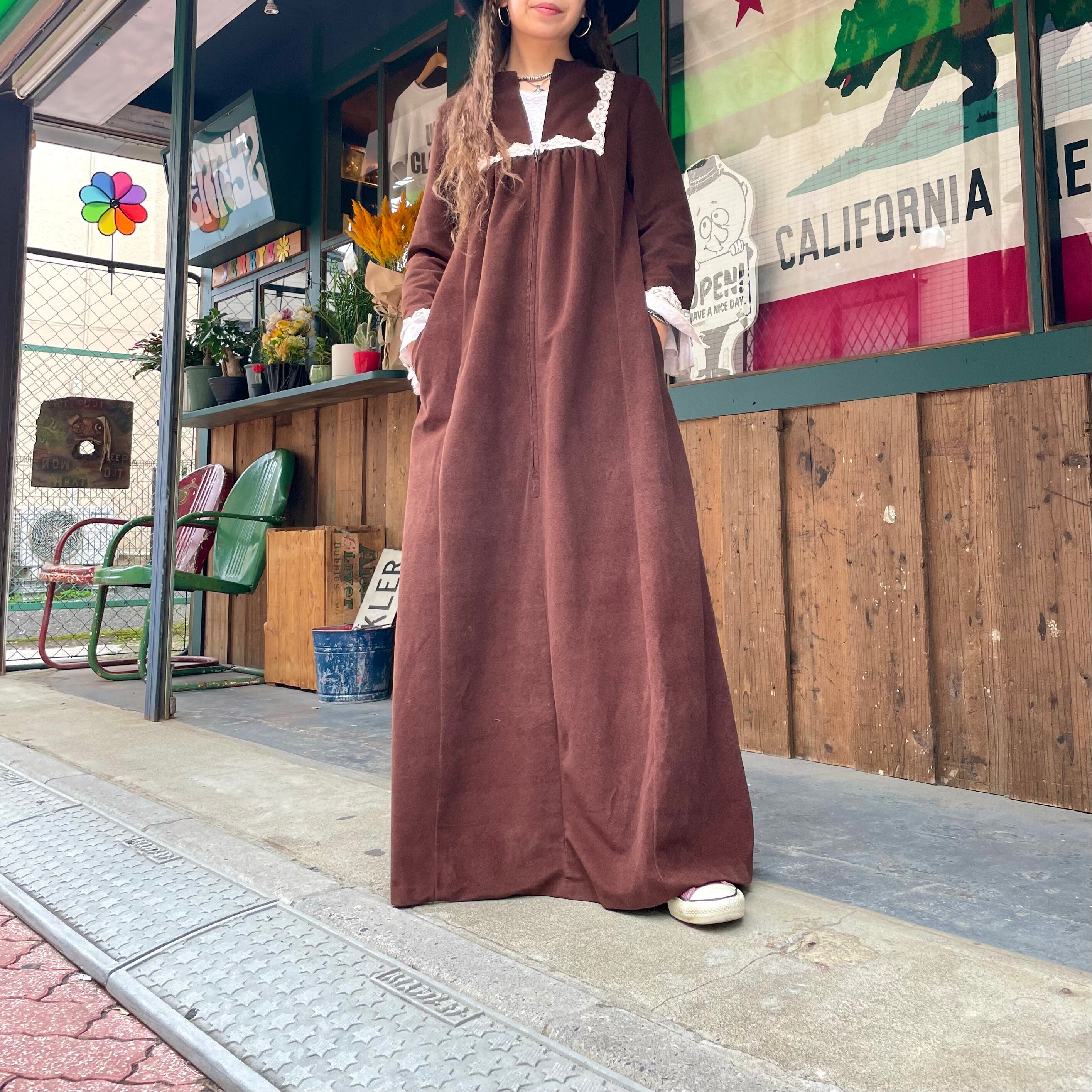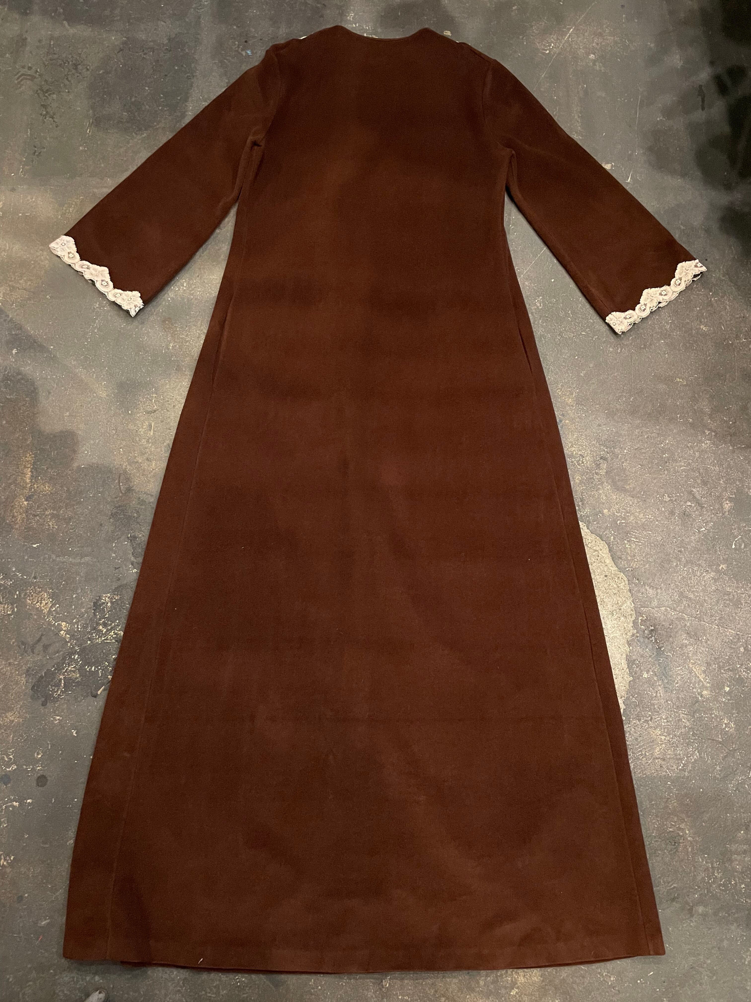 茶色の薄いフリースのような生地感にレースの装飾がかわいいワンピースです。