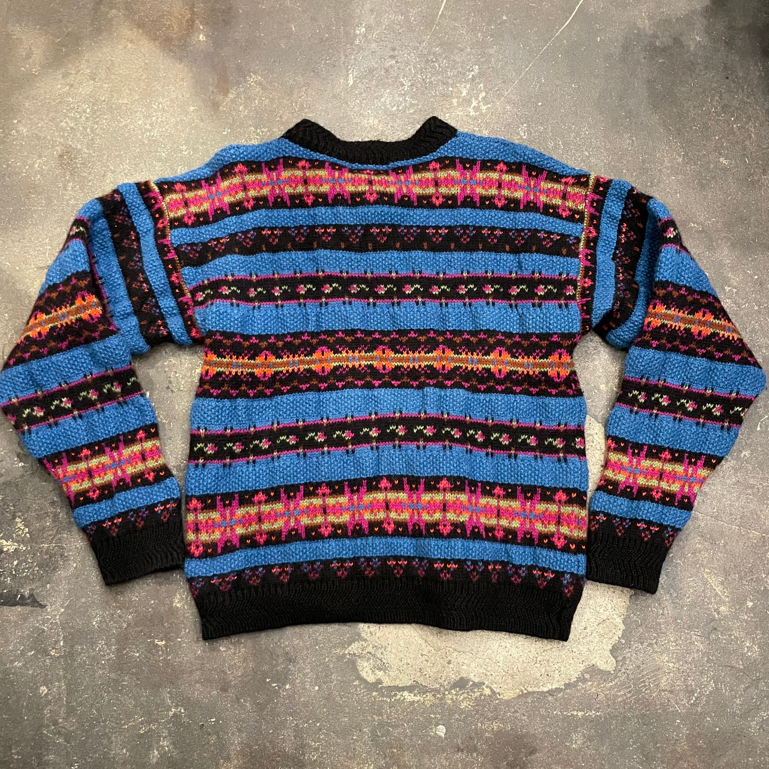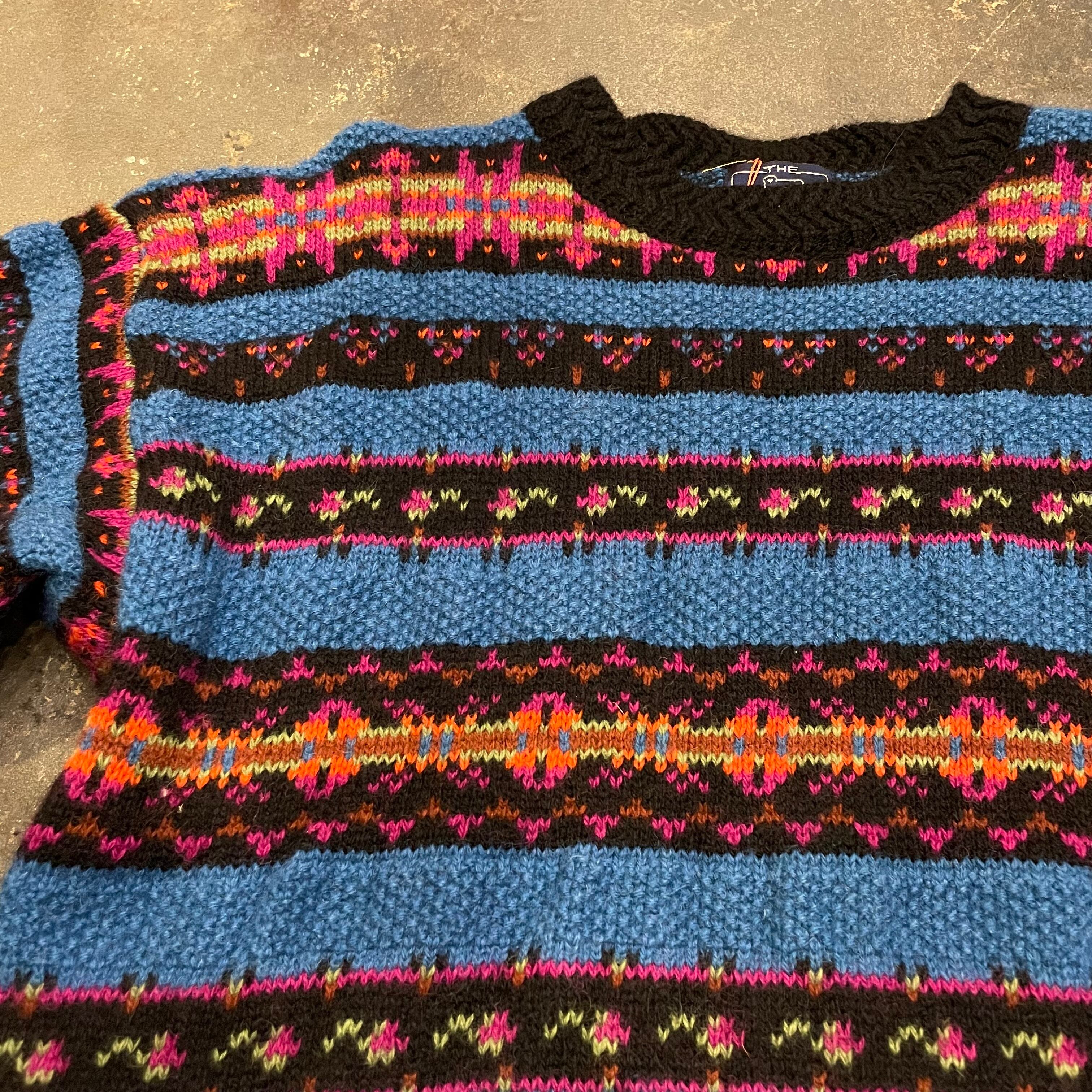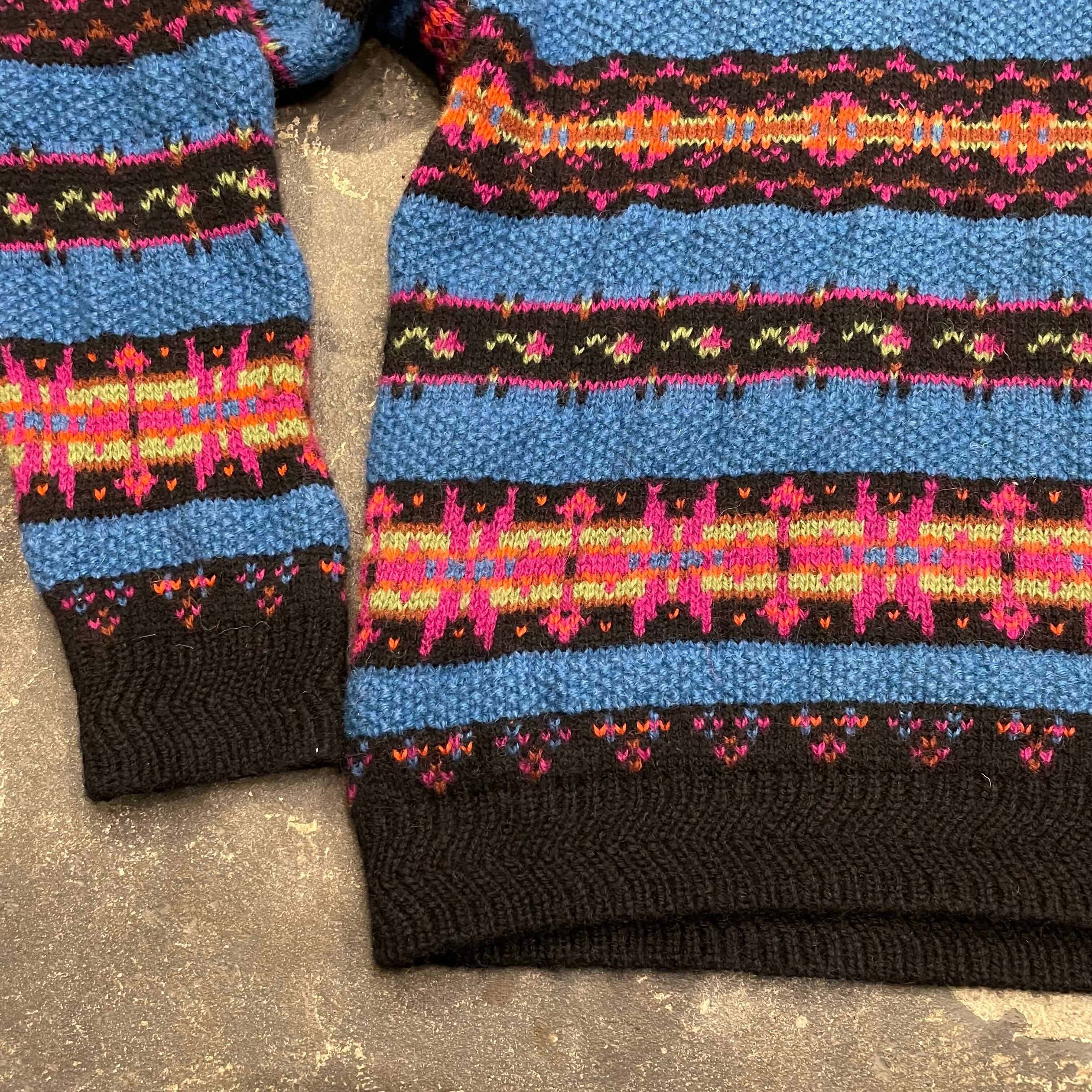 カラフルな模様と青のボーダーがかわいいウールリッチのセーターです。