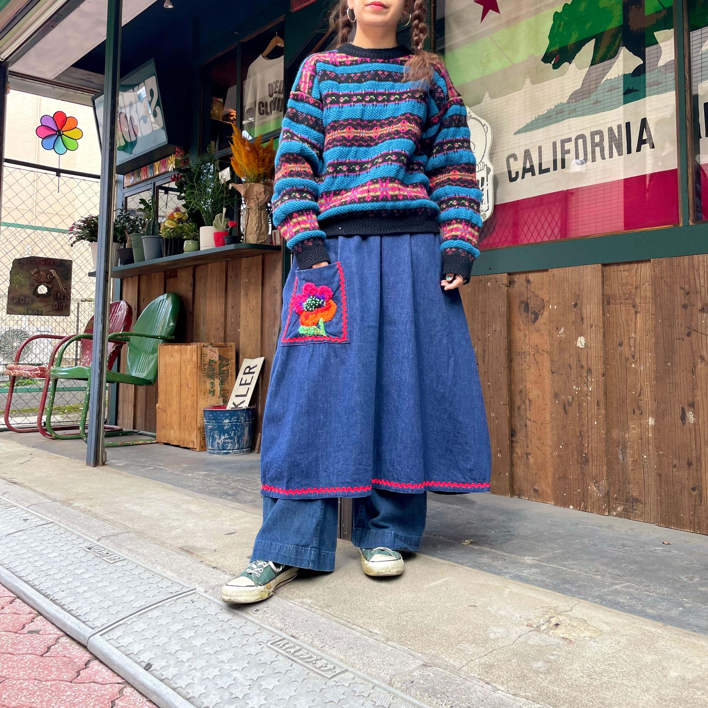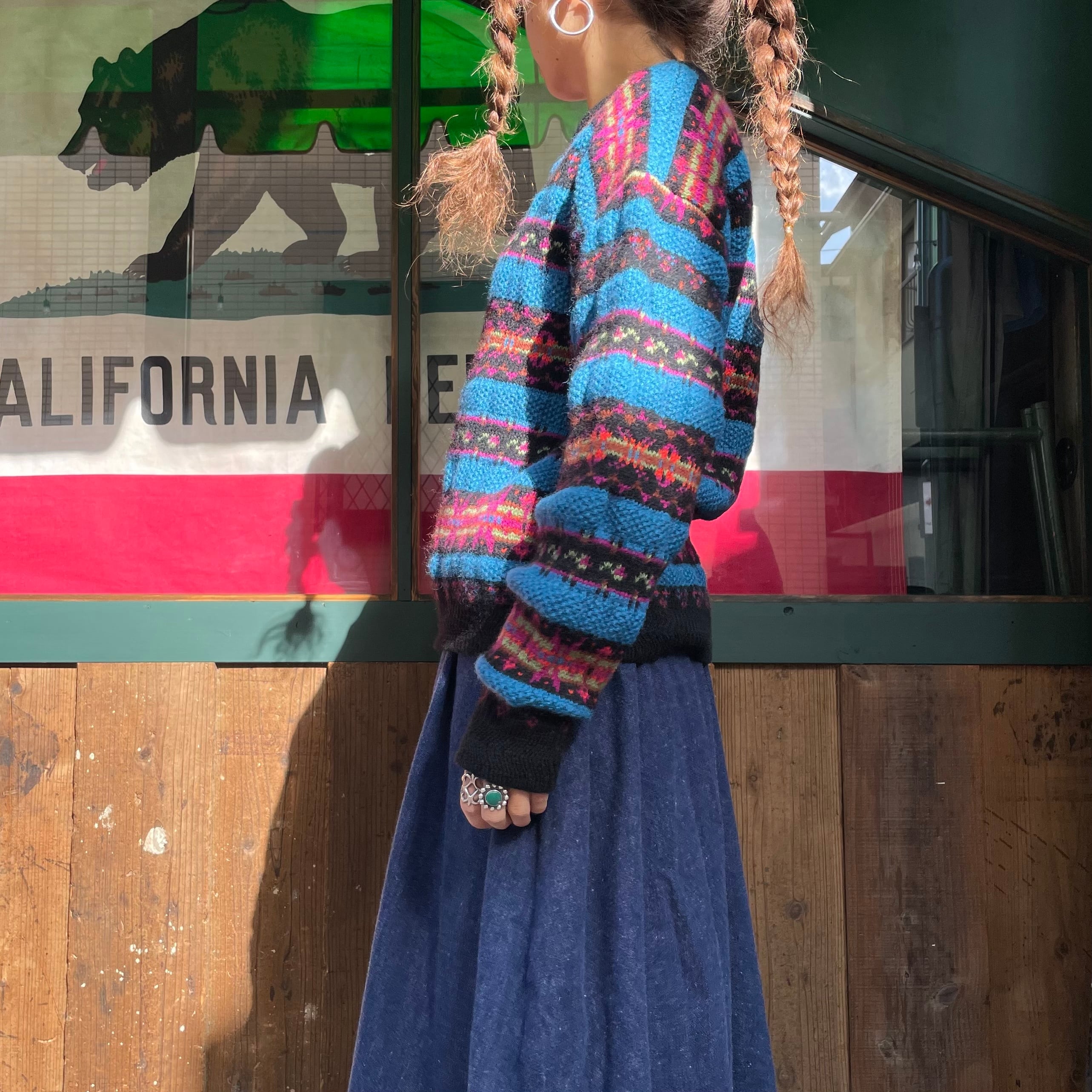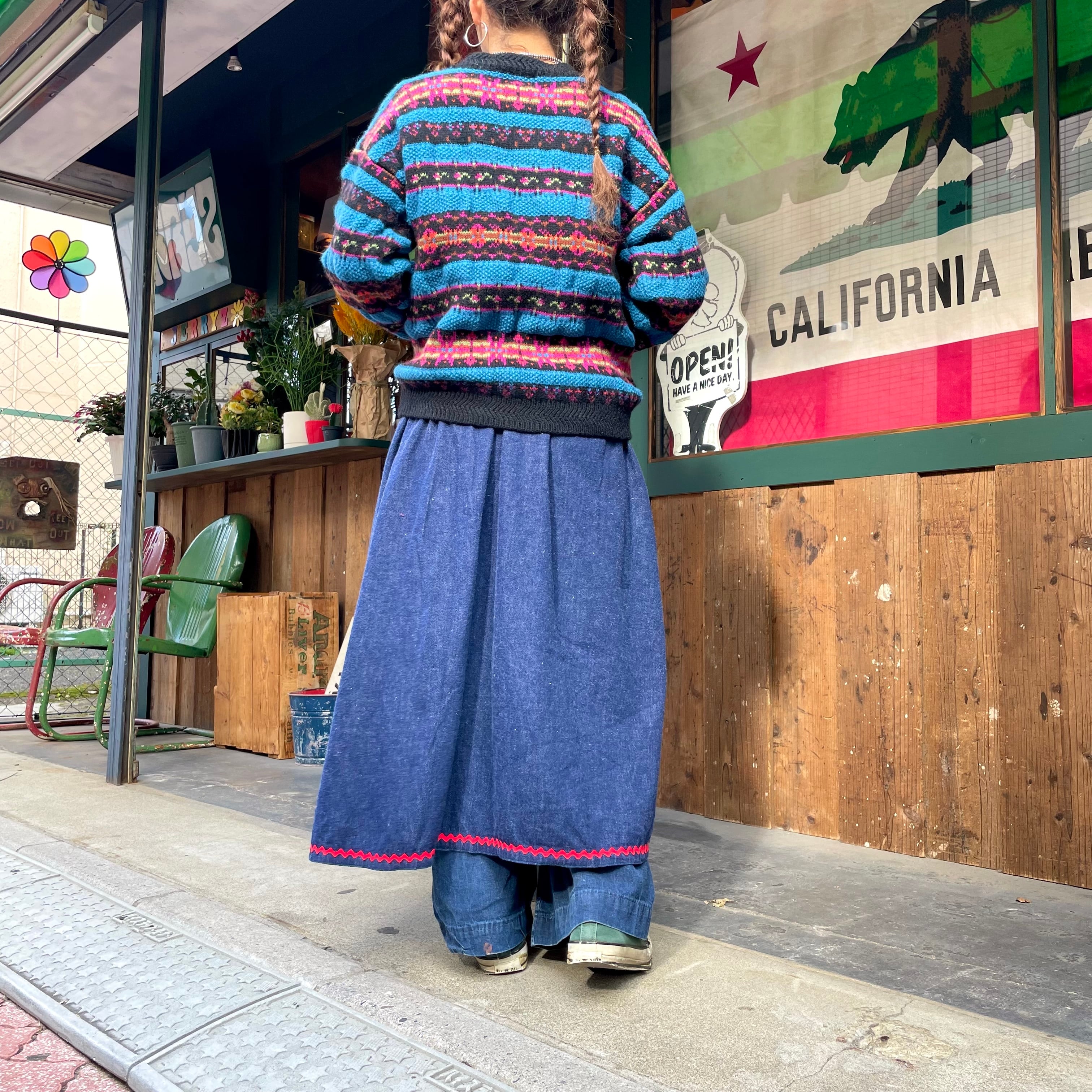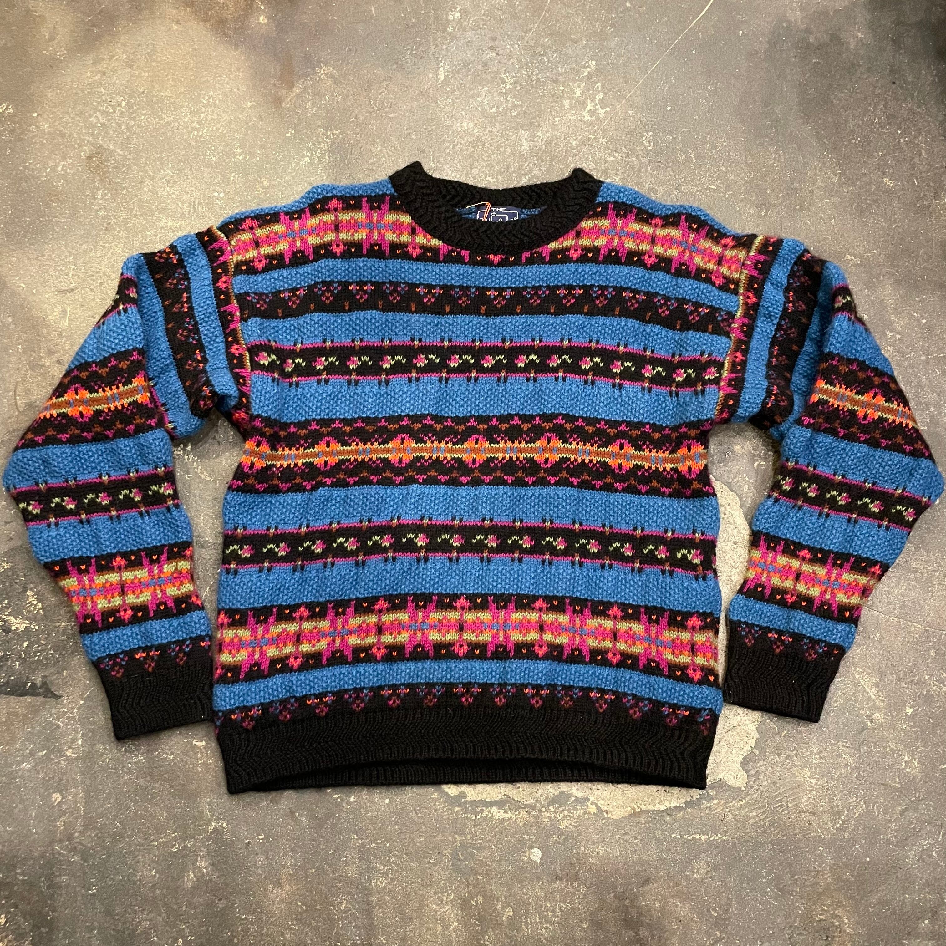 カラフルな模様と青のボーダーがかわいいウールリッチのセーターです。