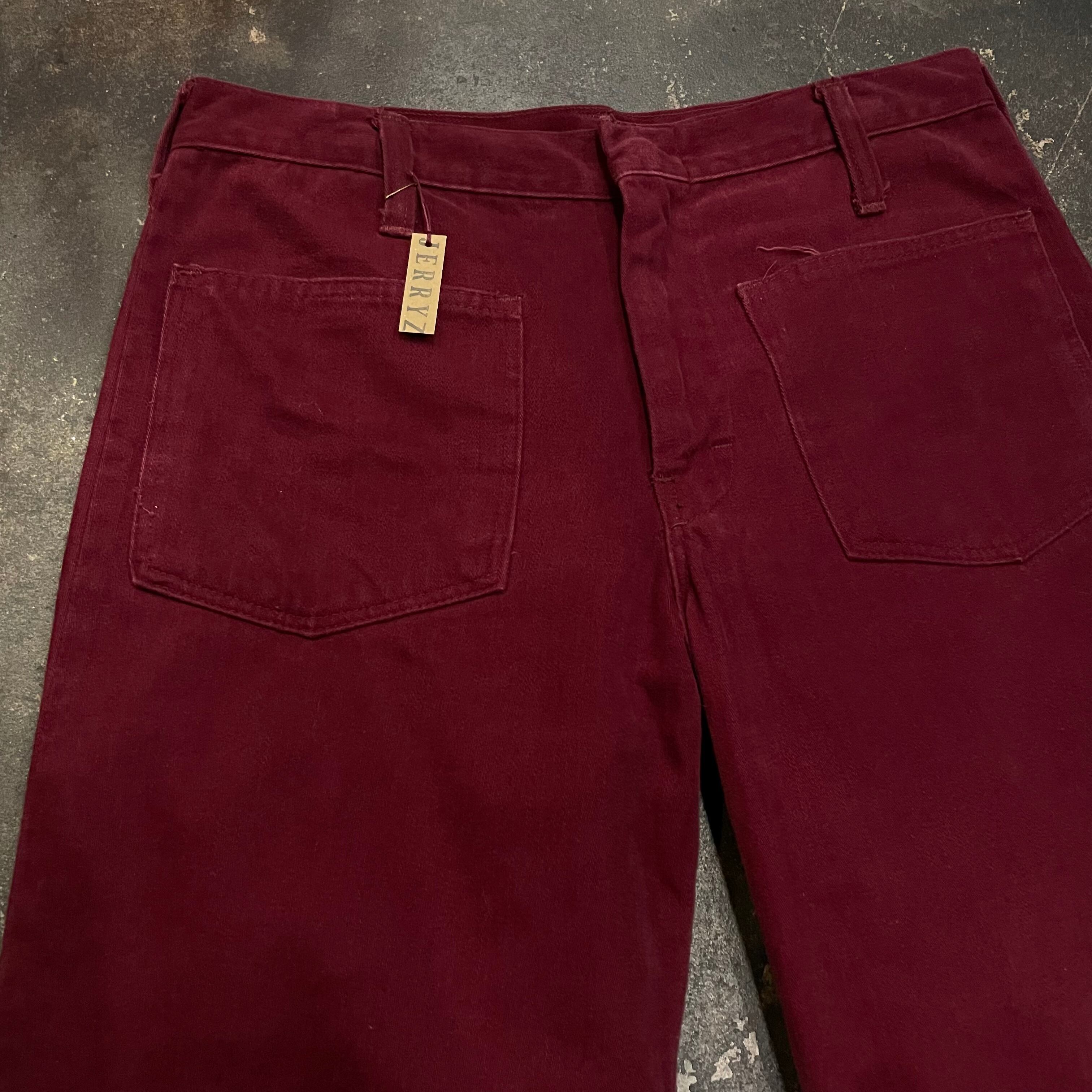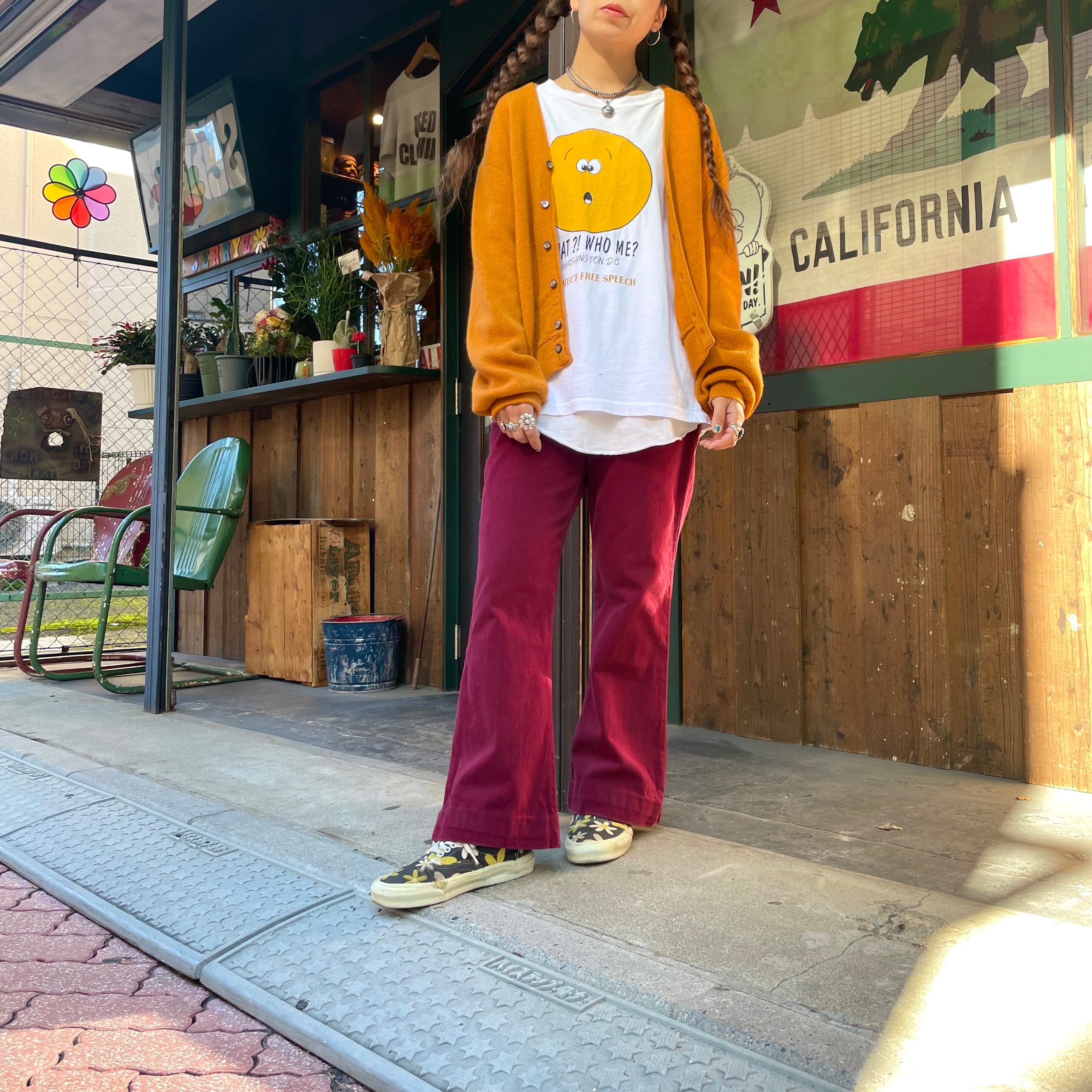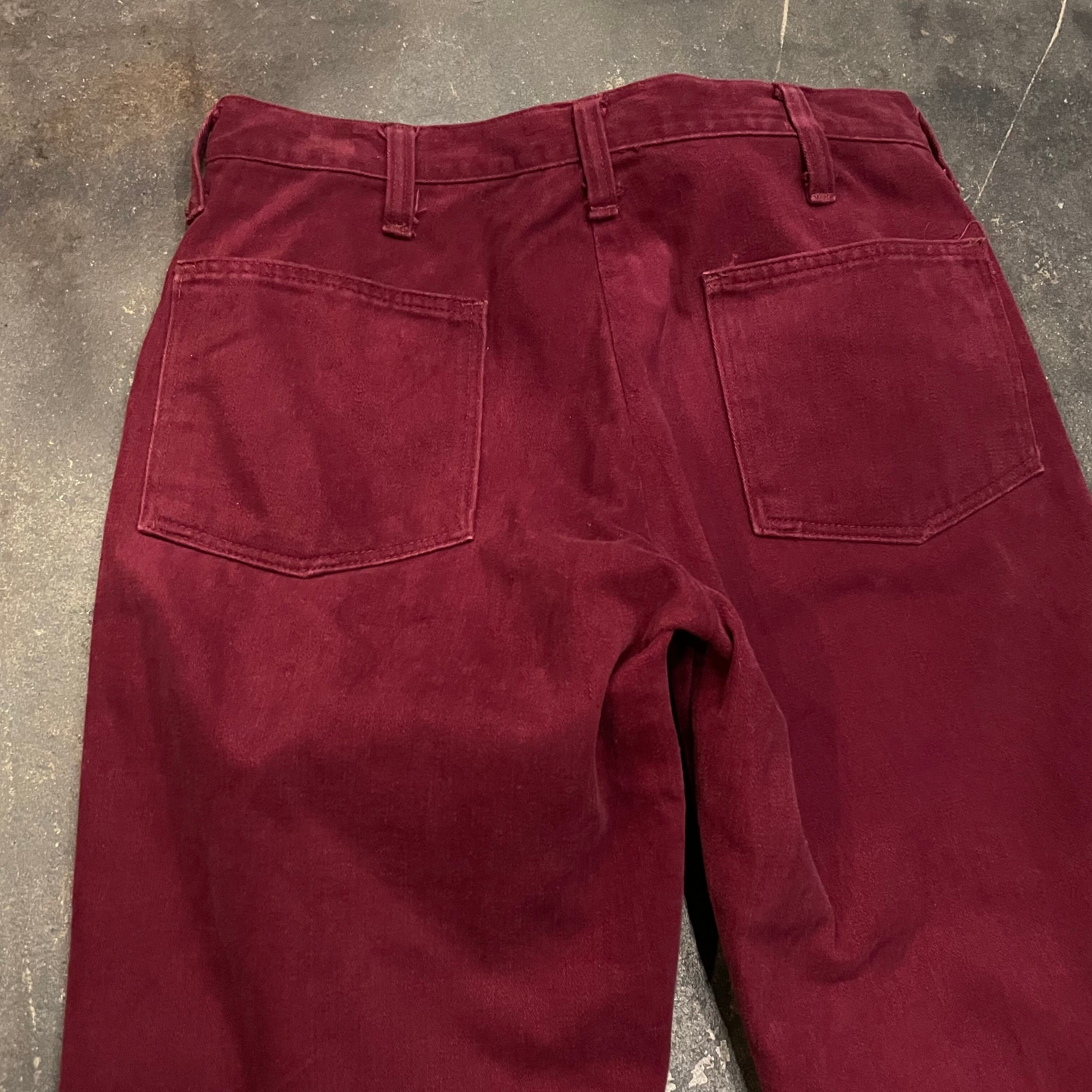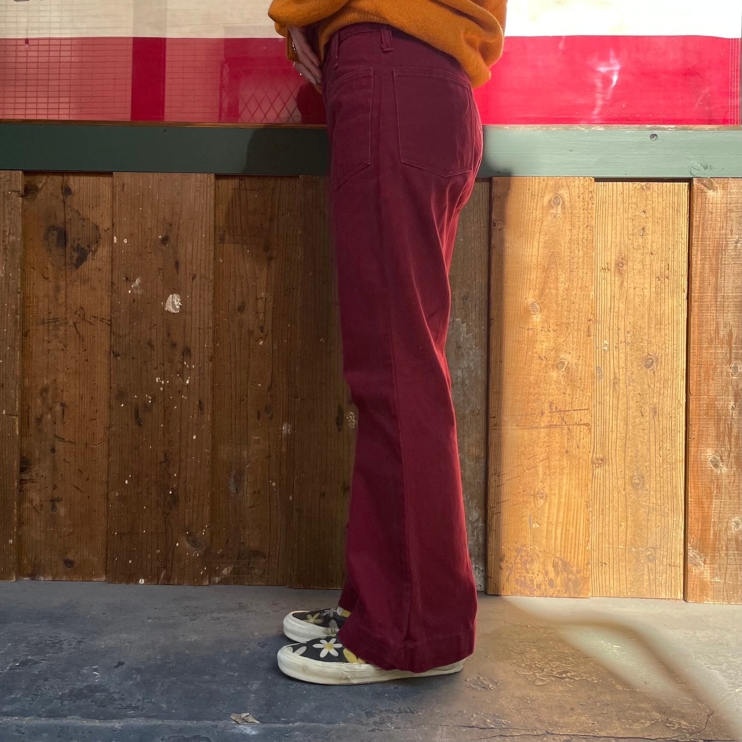 えんじのようなチェリーレッドのような、絶妙な色味がかわいいフレアパンツです。