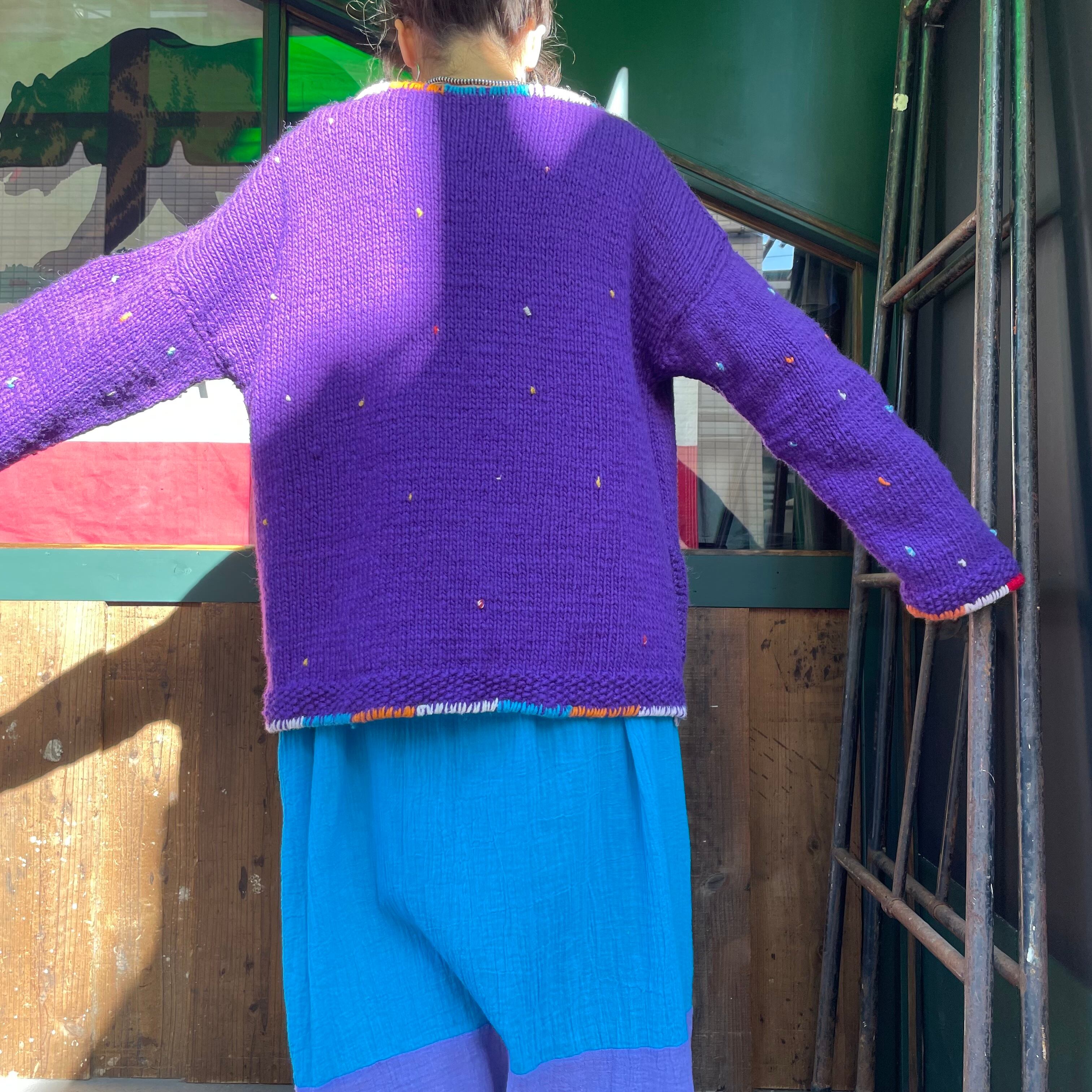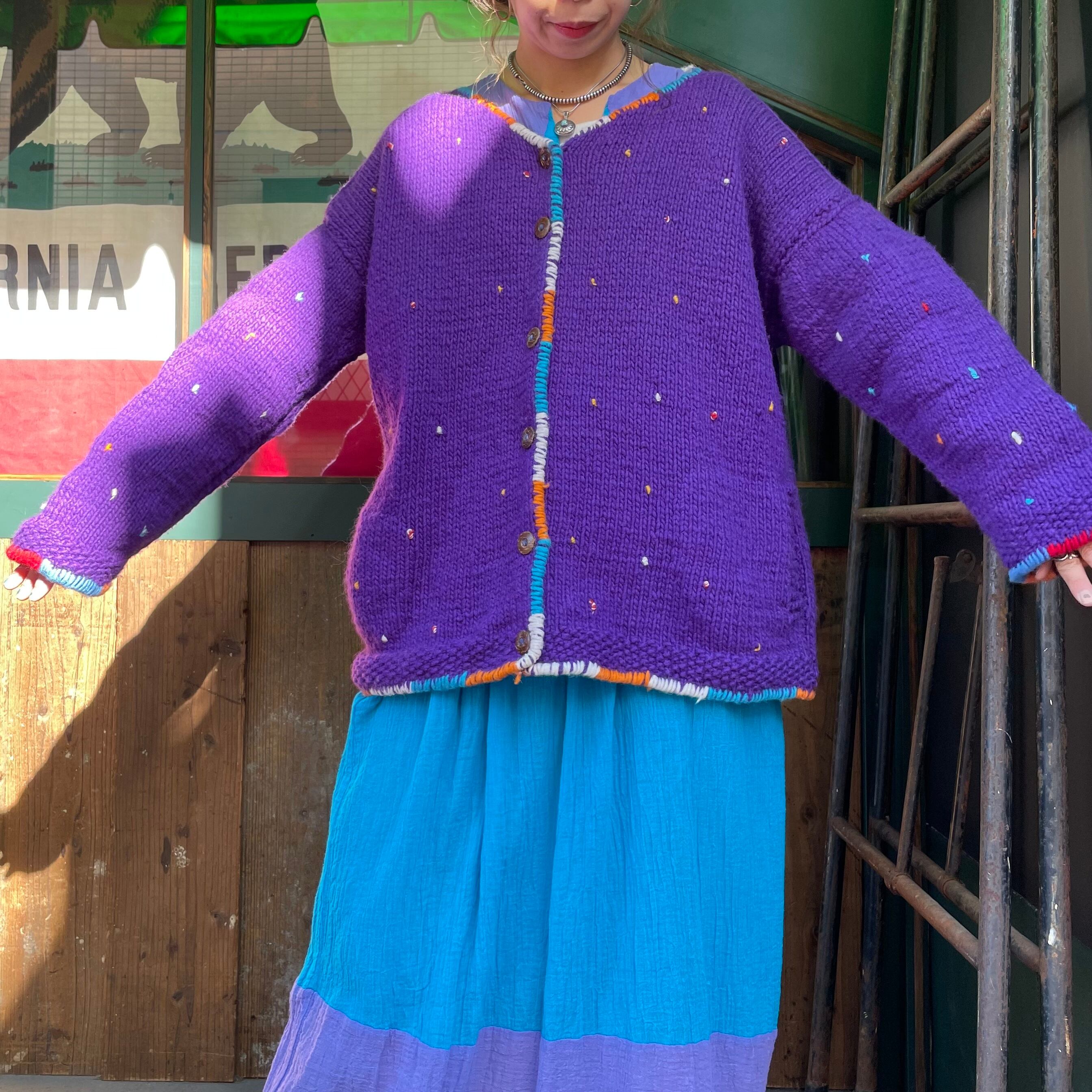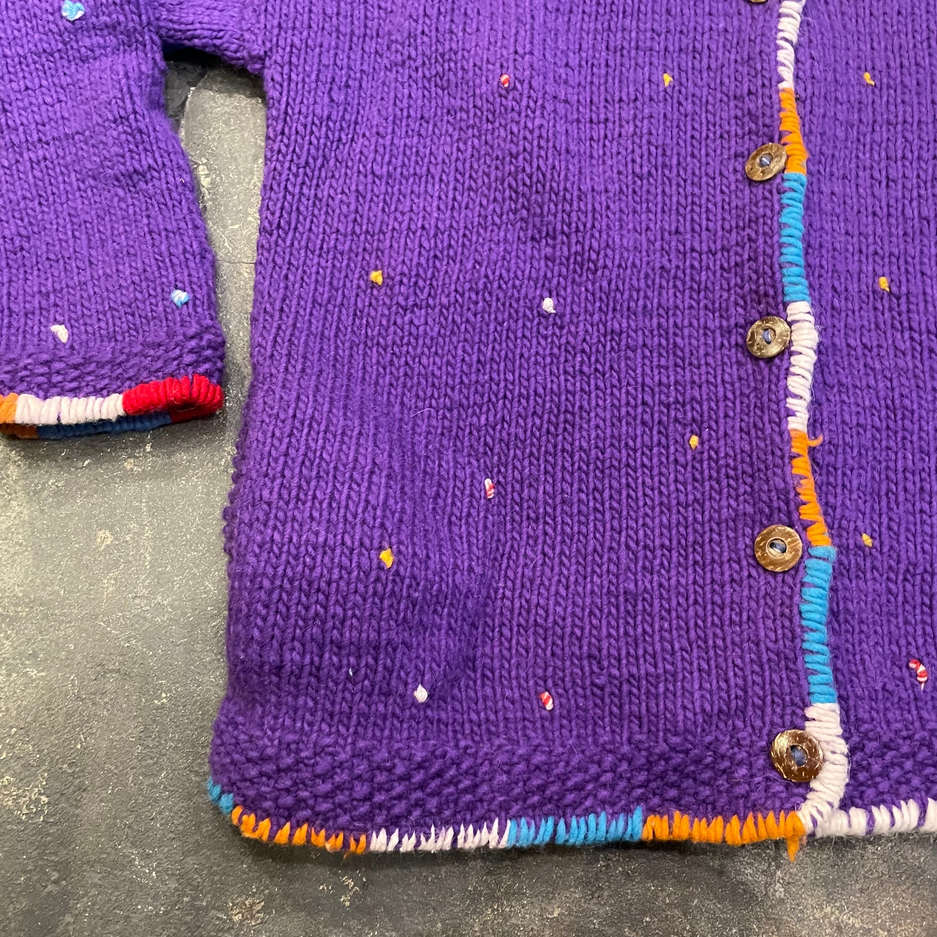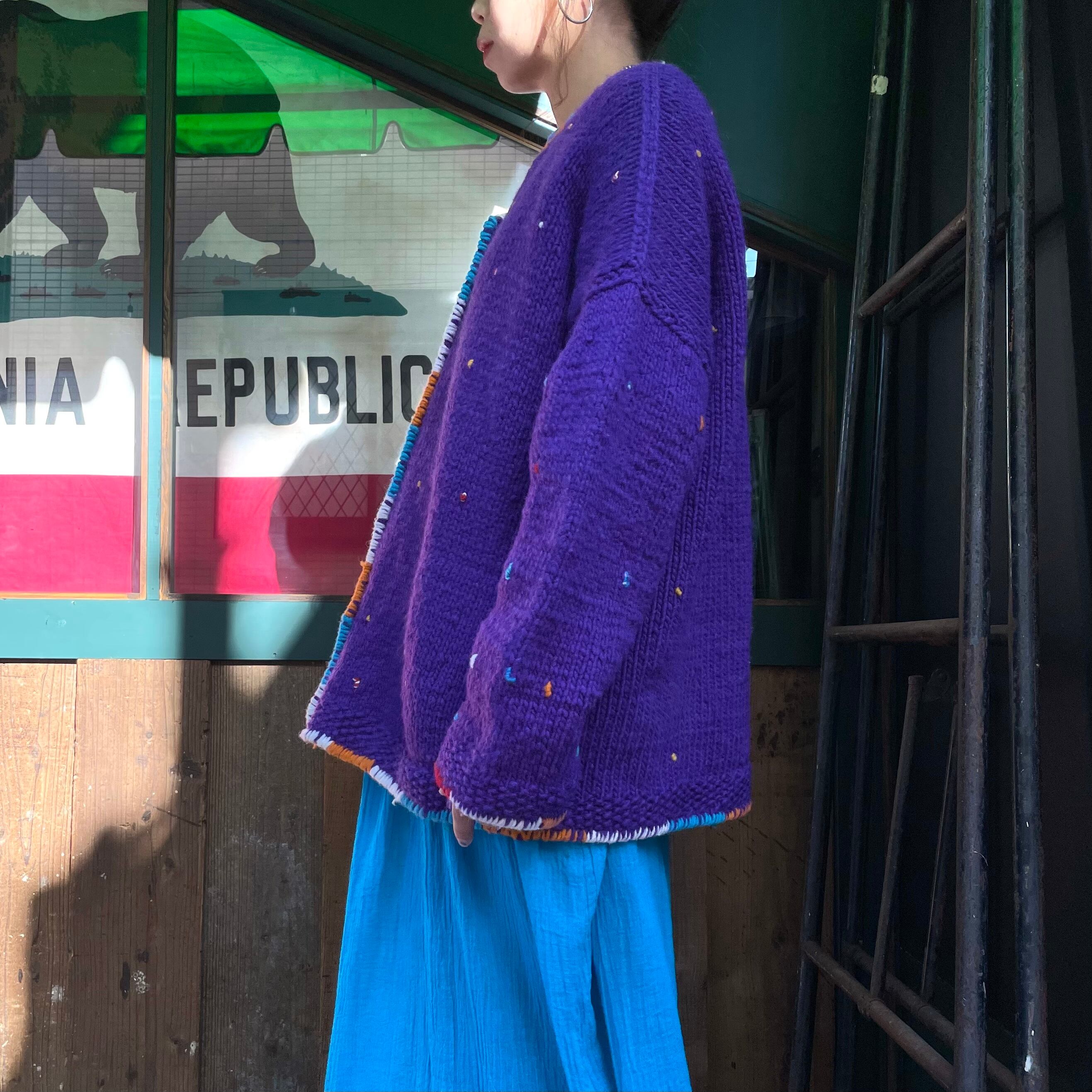 鮮やかな紫色がかわいい手編みのウールカーディガンです。