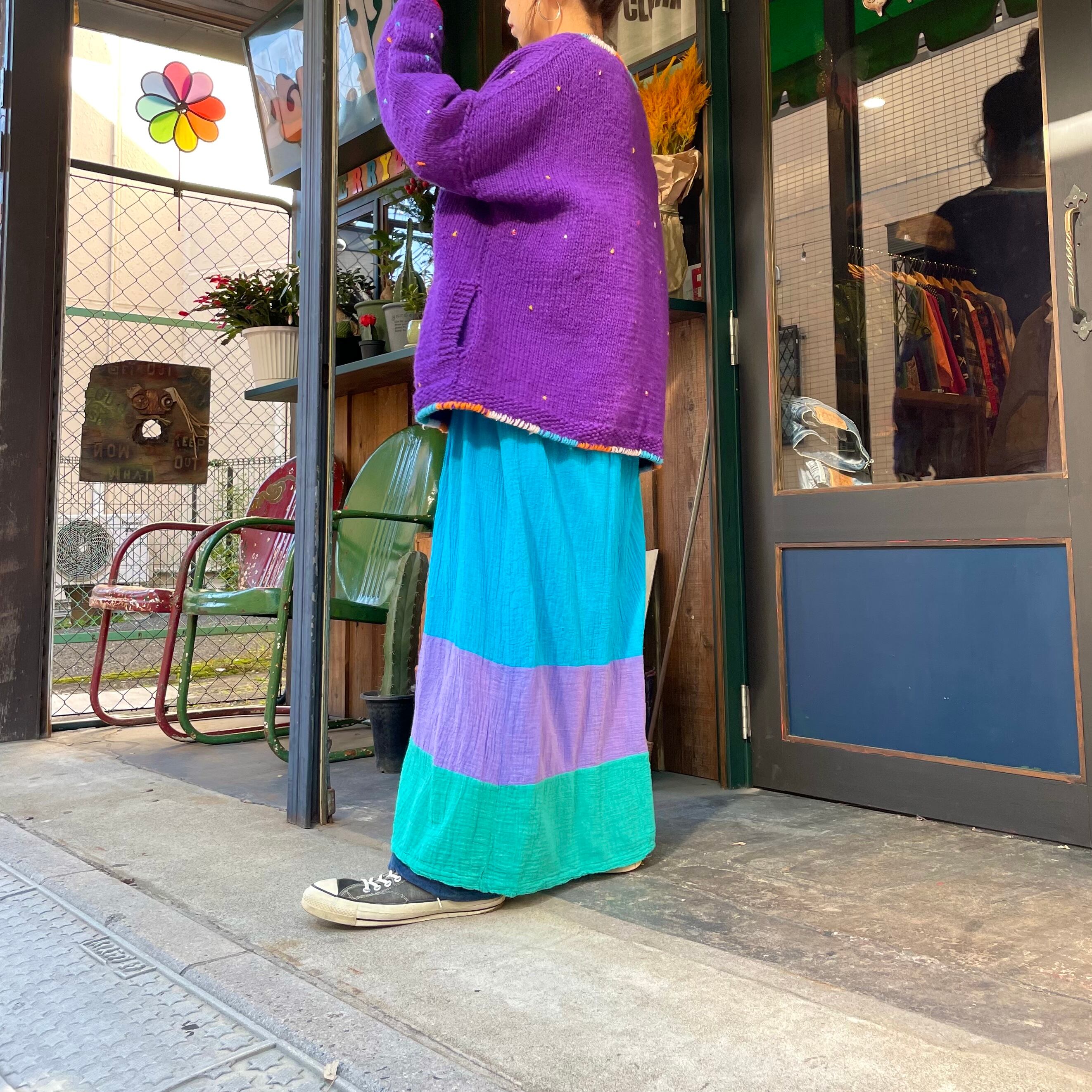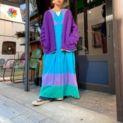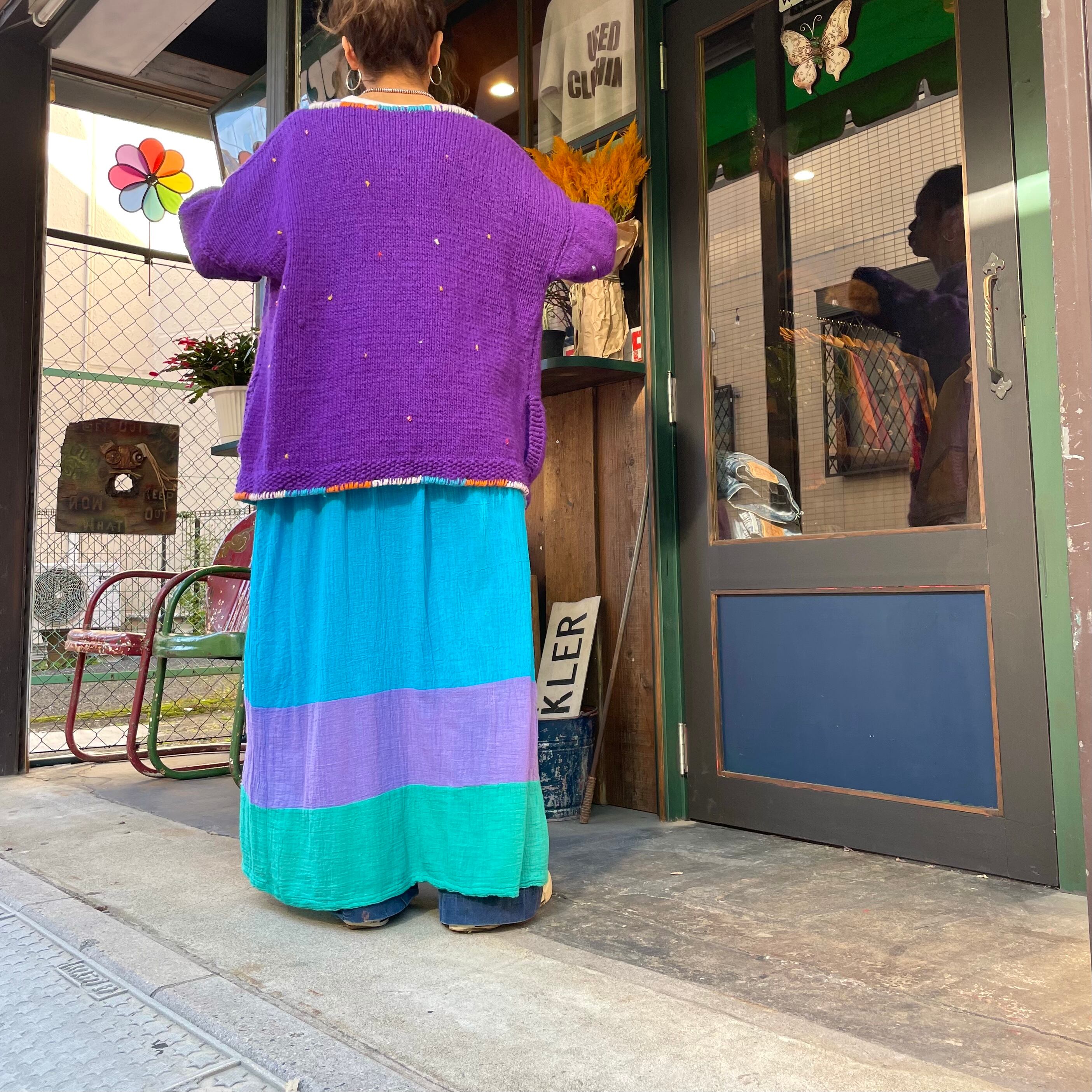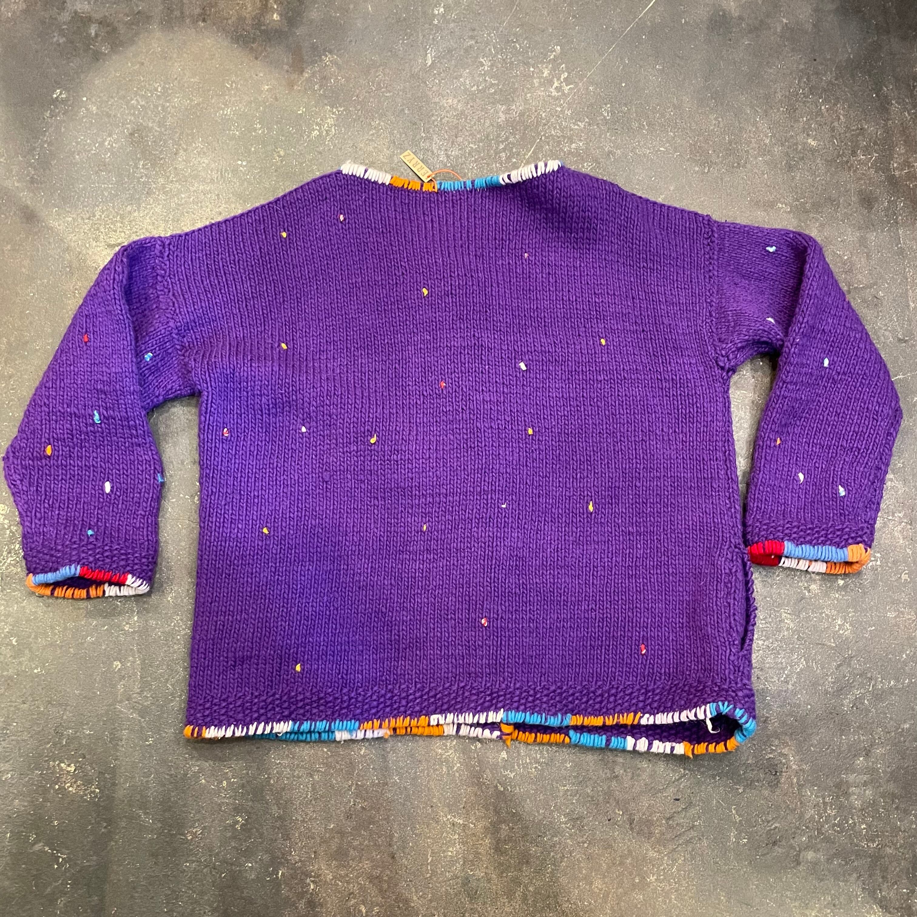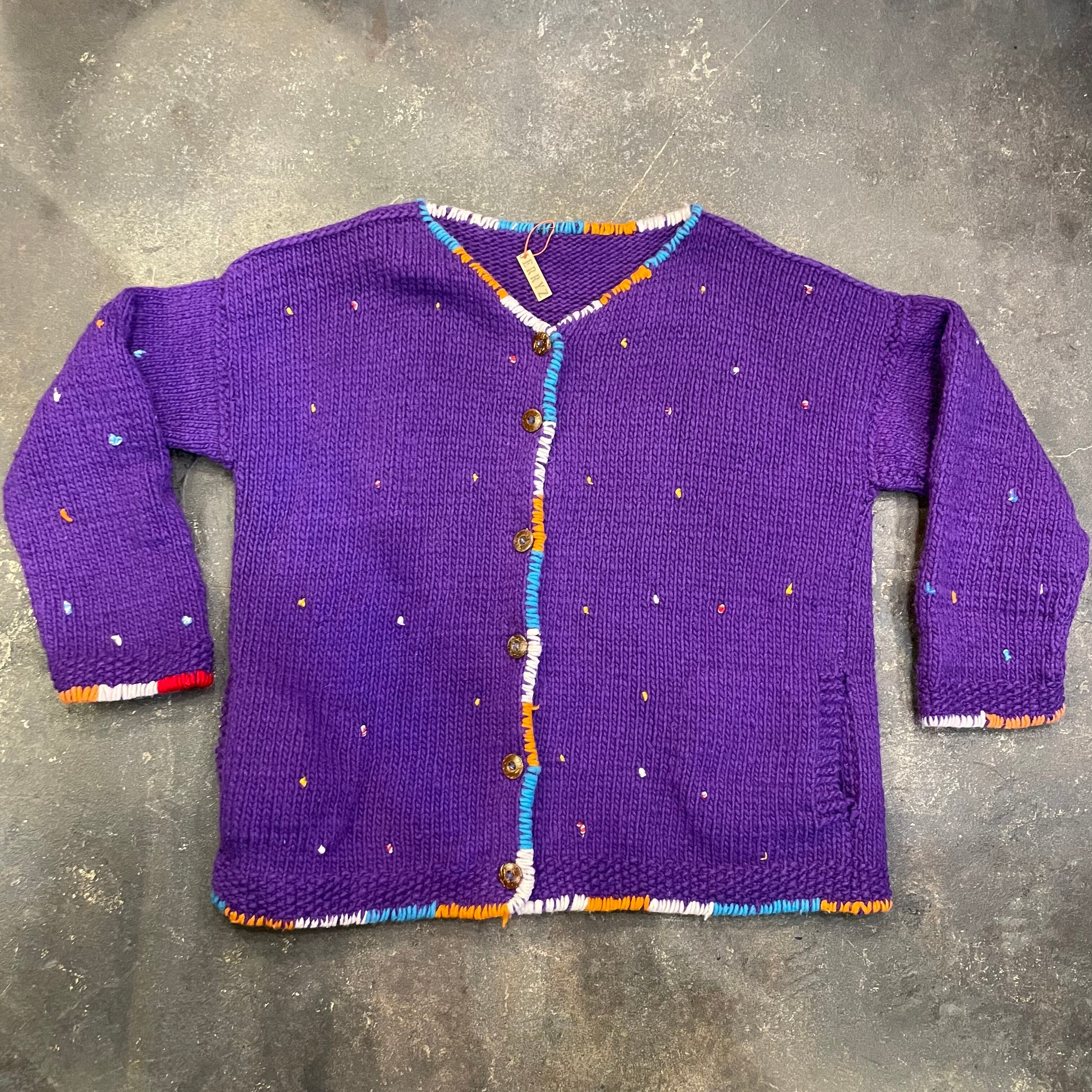 鮮やかな紫色がかわいい手編みのウールカーディガンです。
