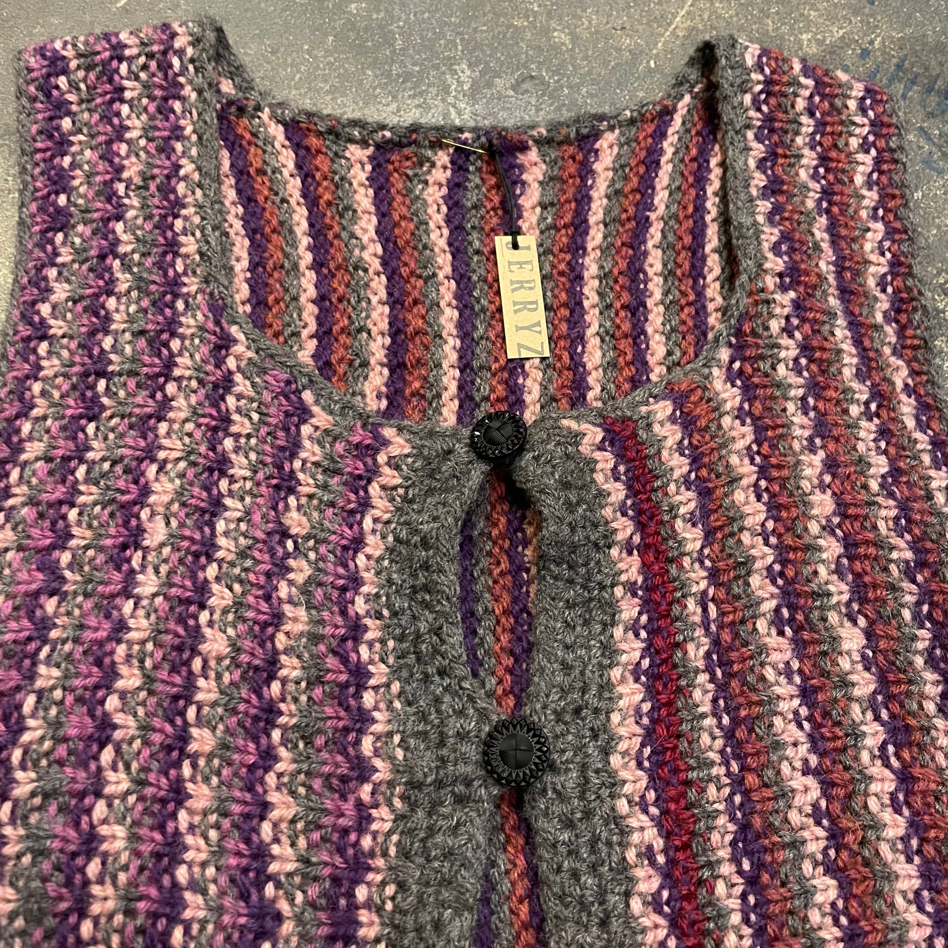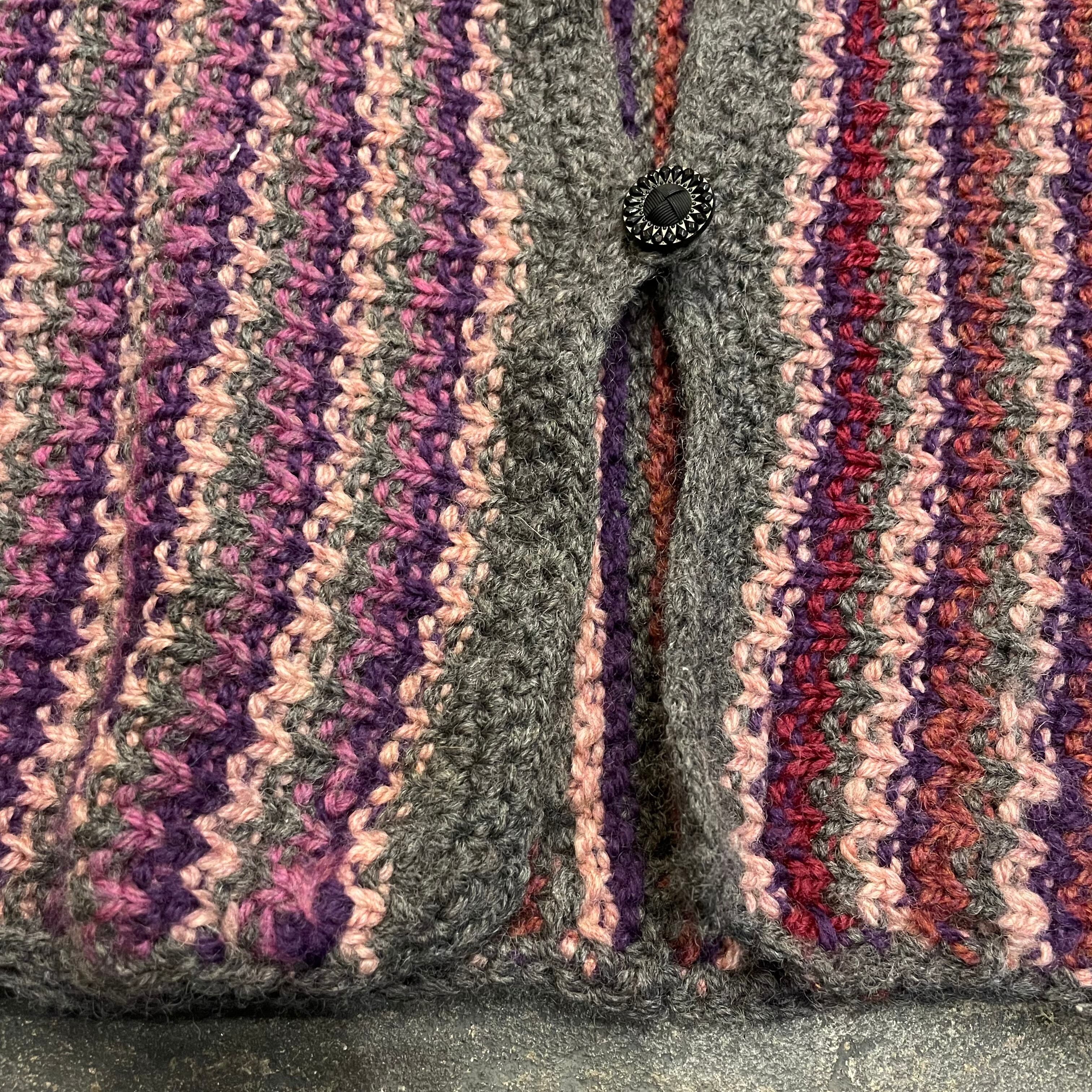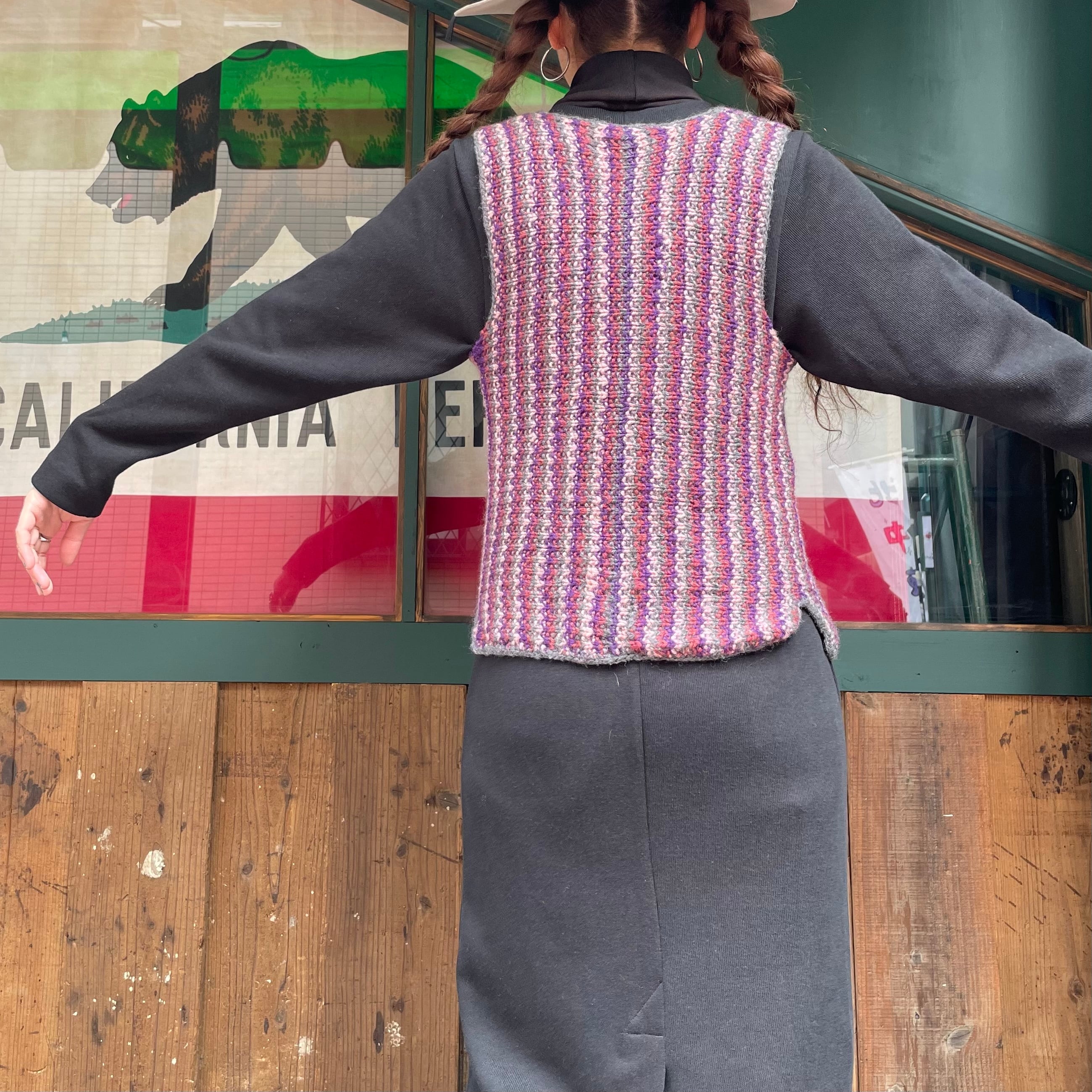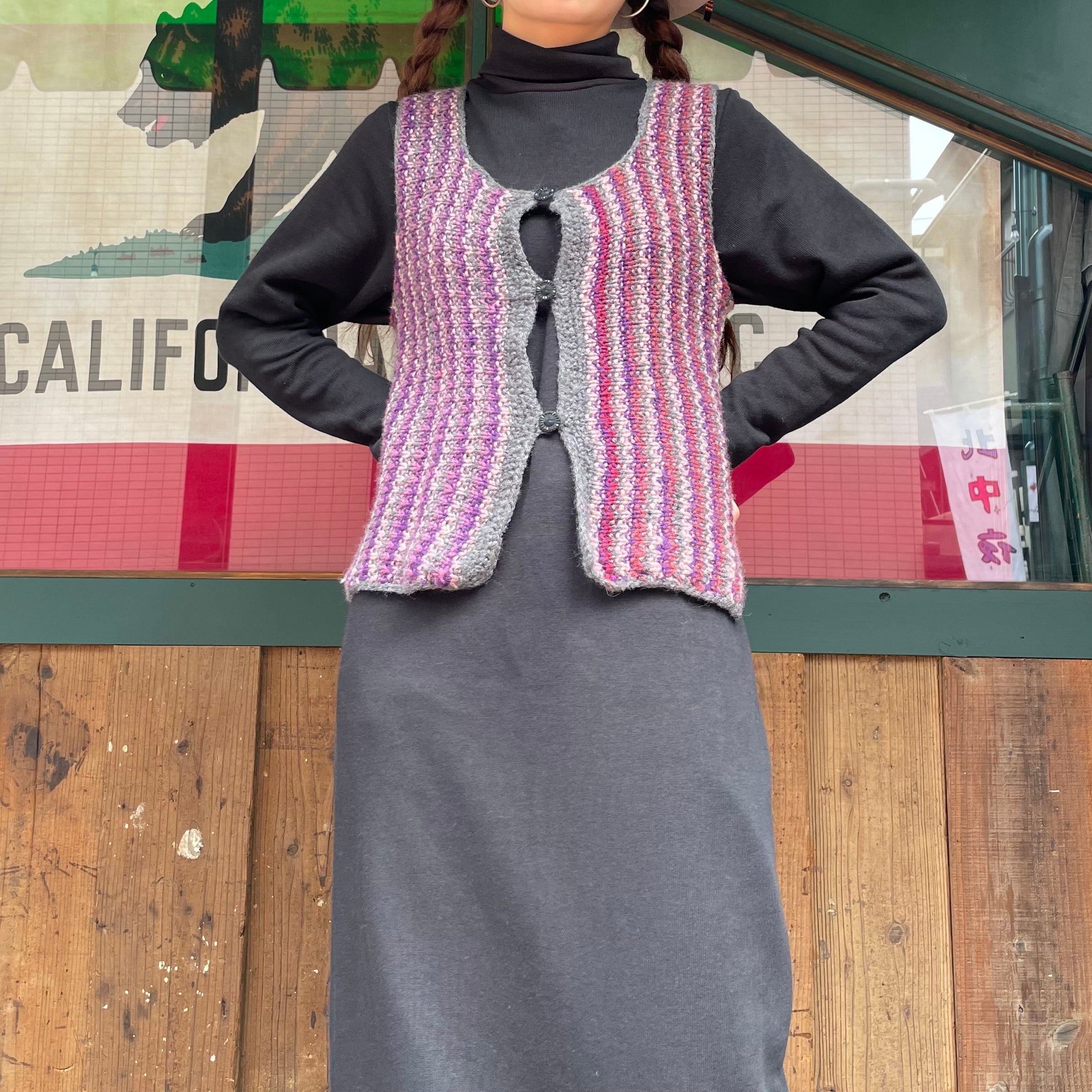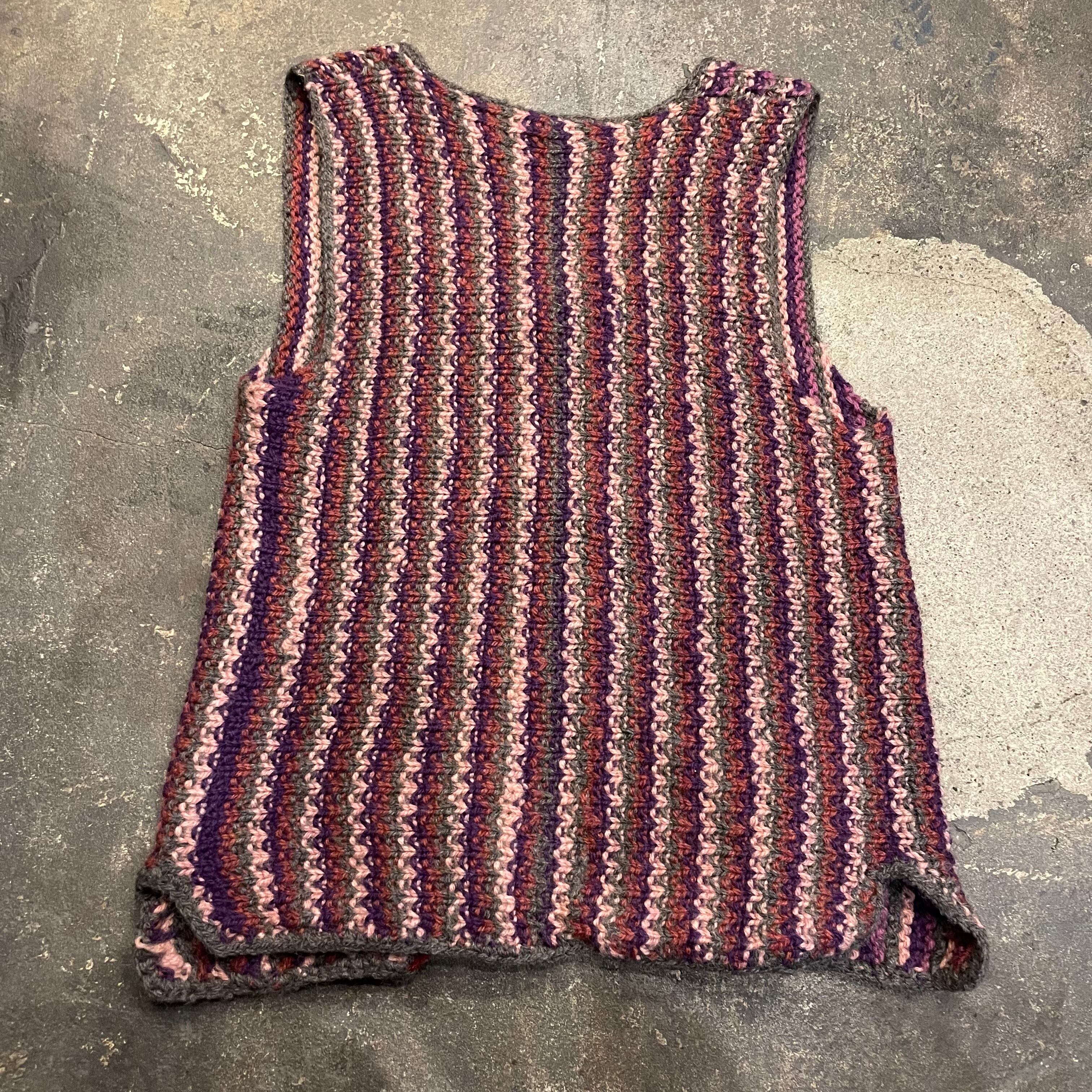 紫系のストライプ模様がかわいい手編みのニットベストです。